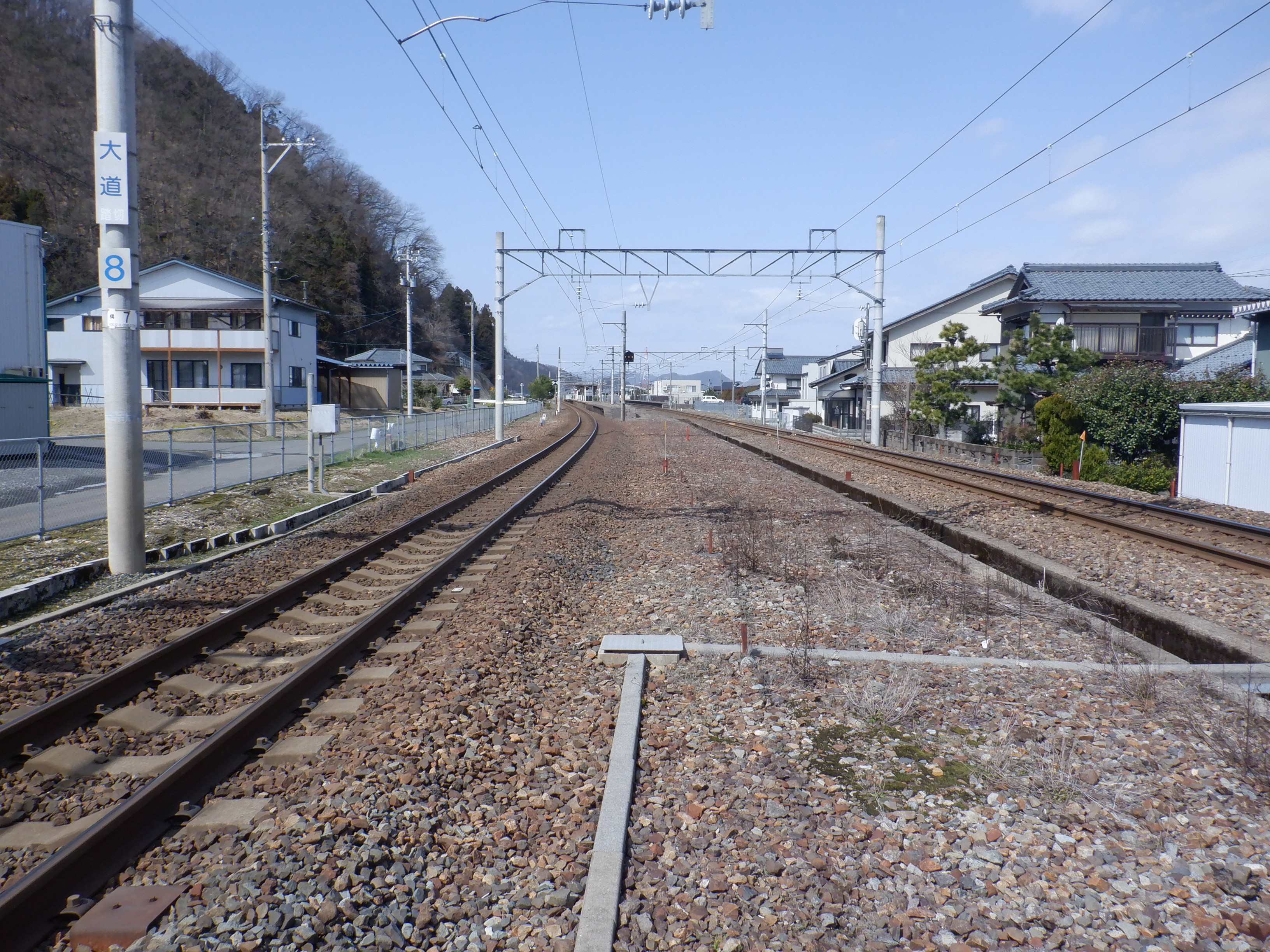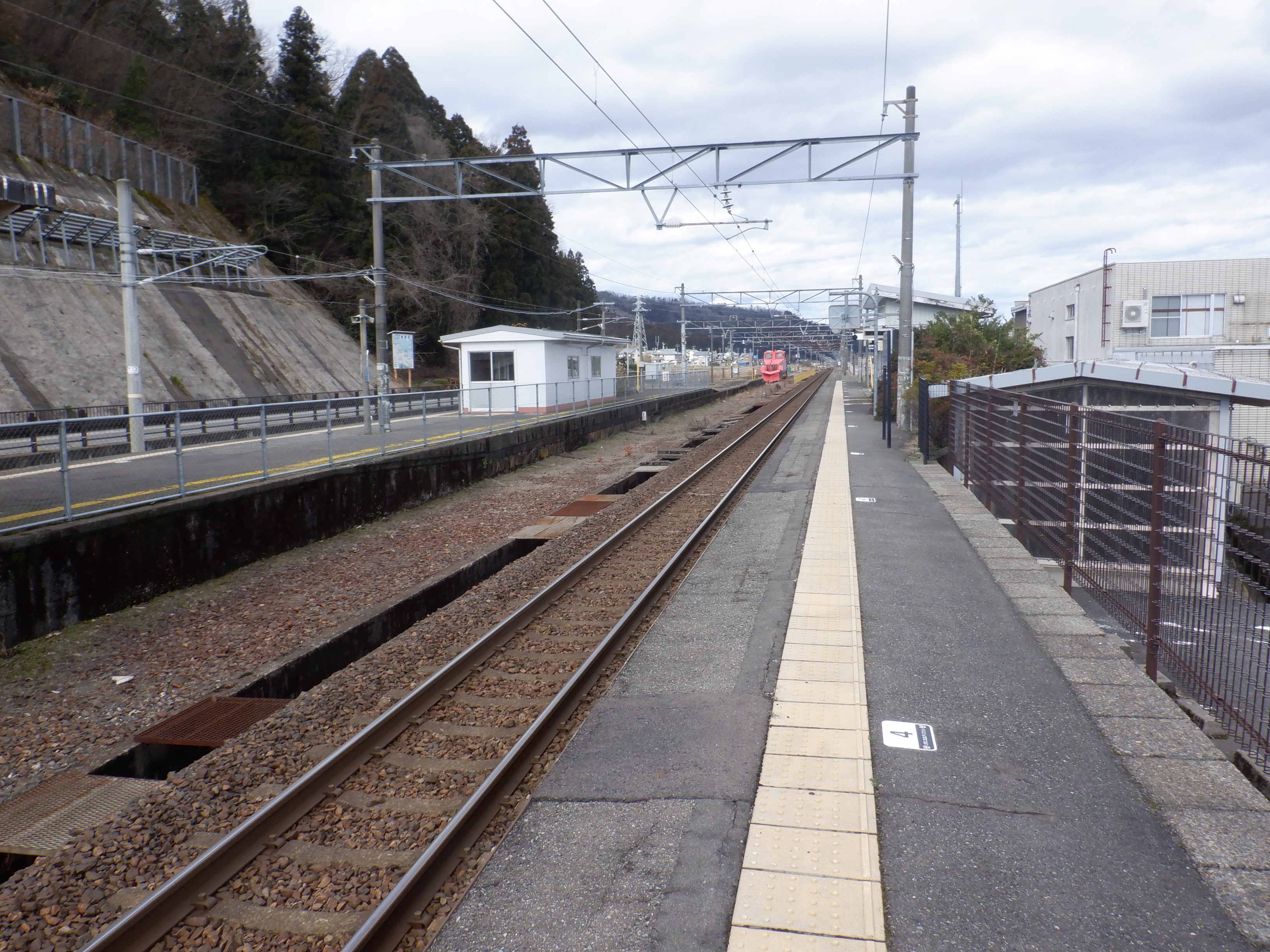 湯尾駅側の踏切。こちらはハピラインふくいのものになっています。