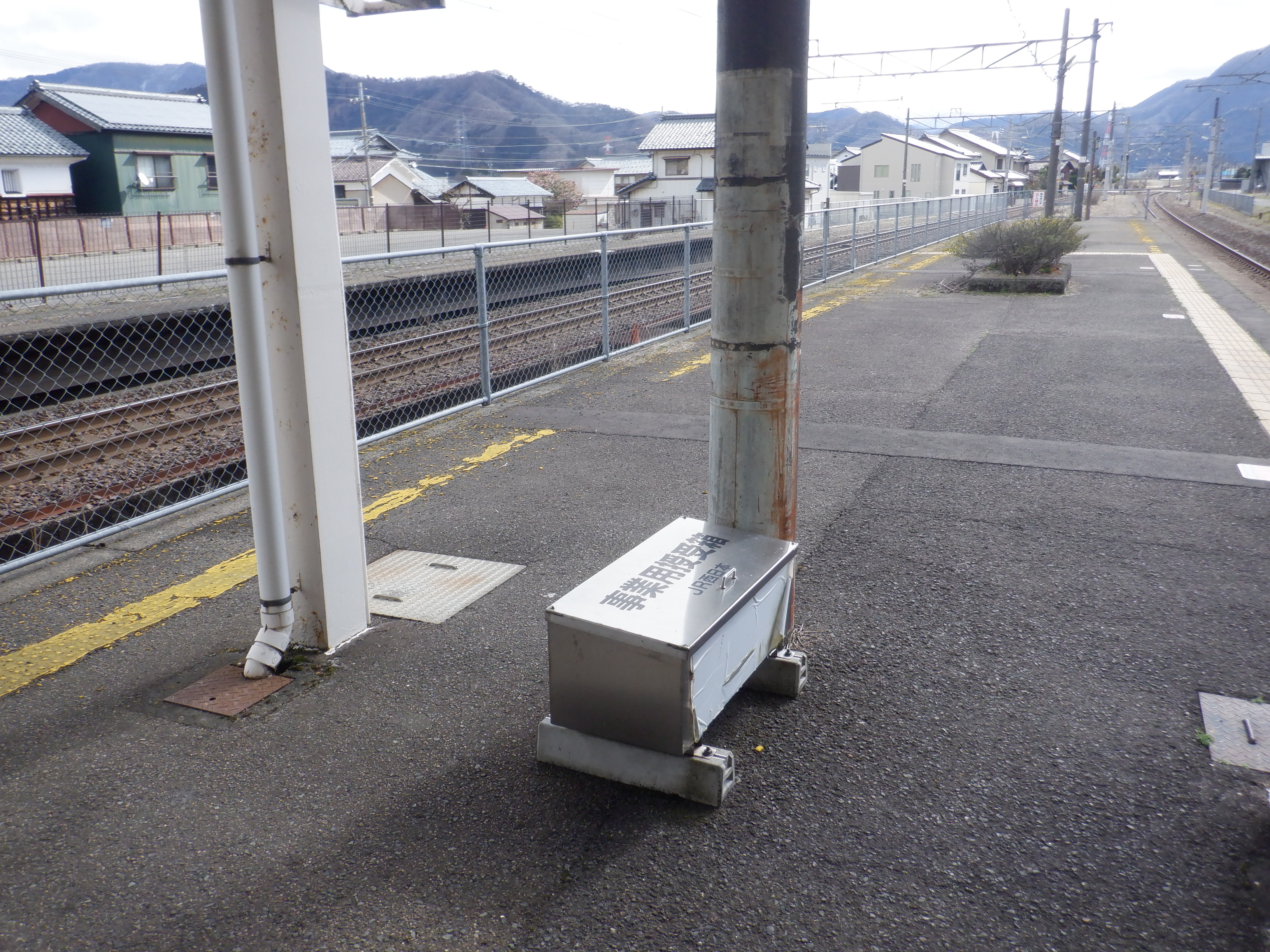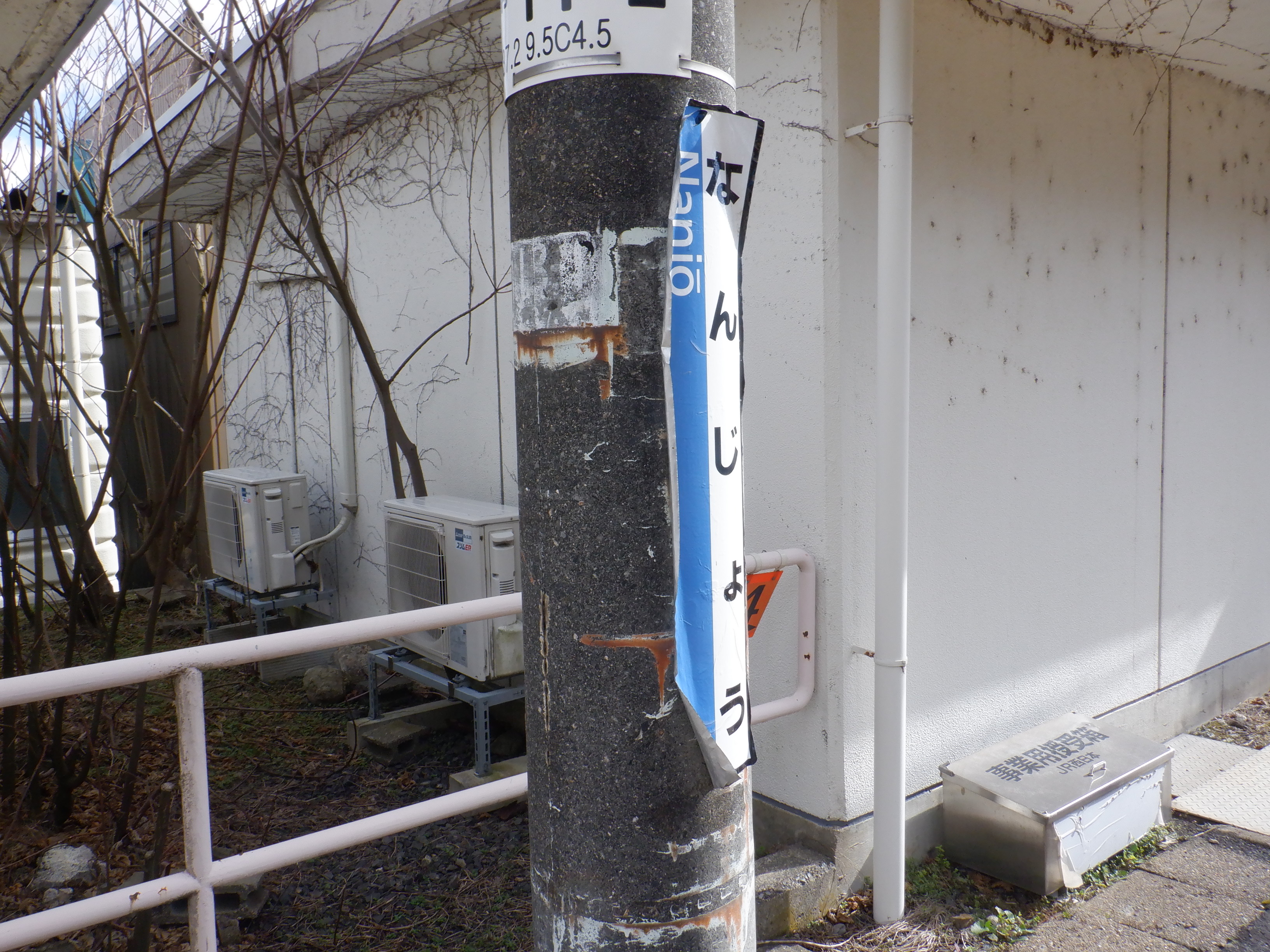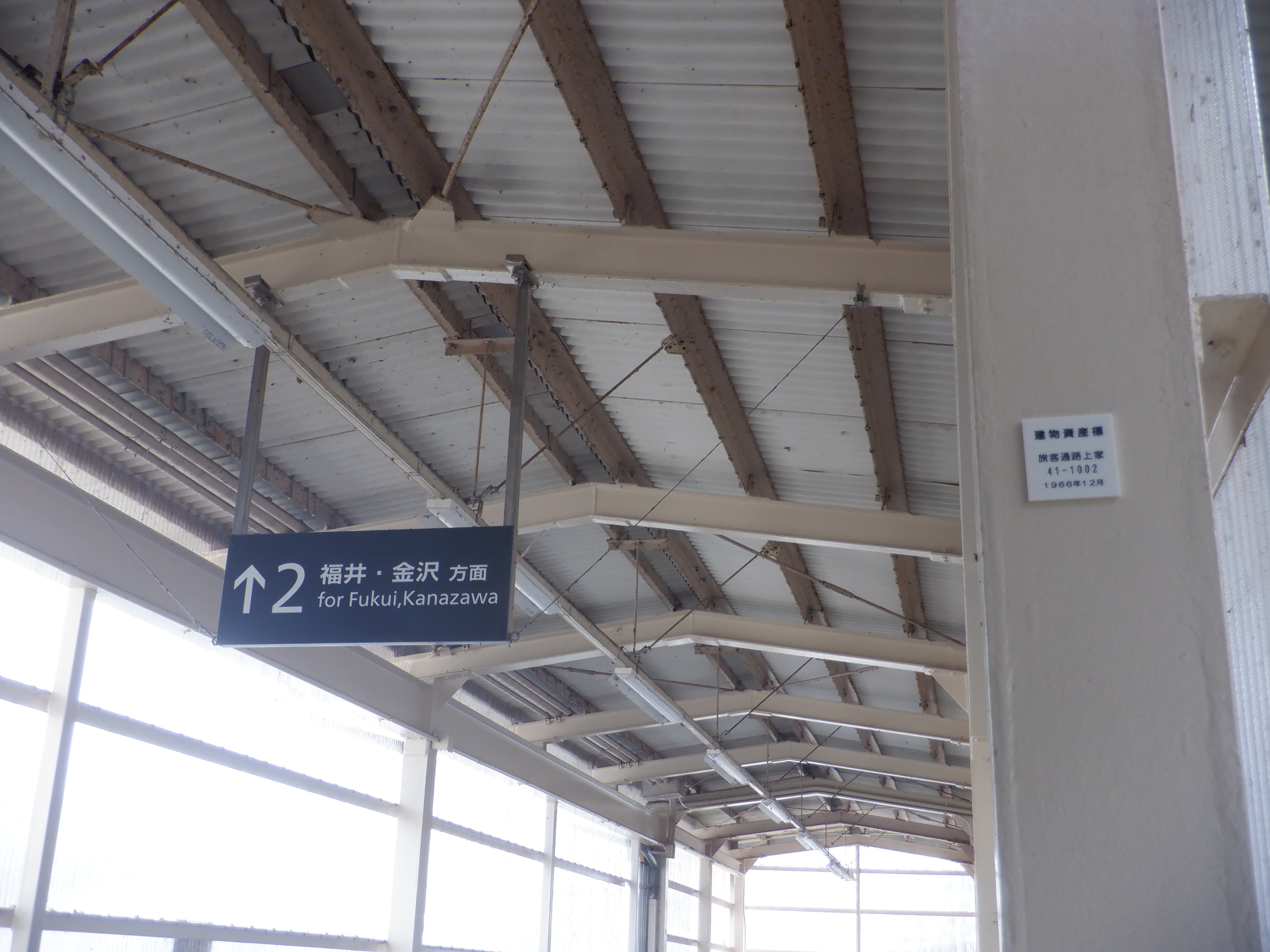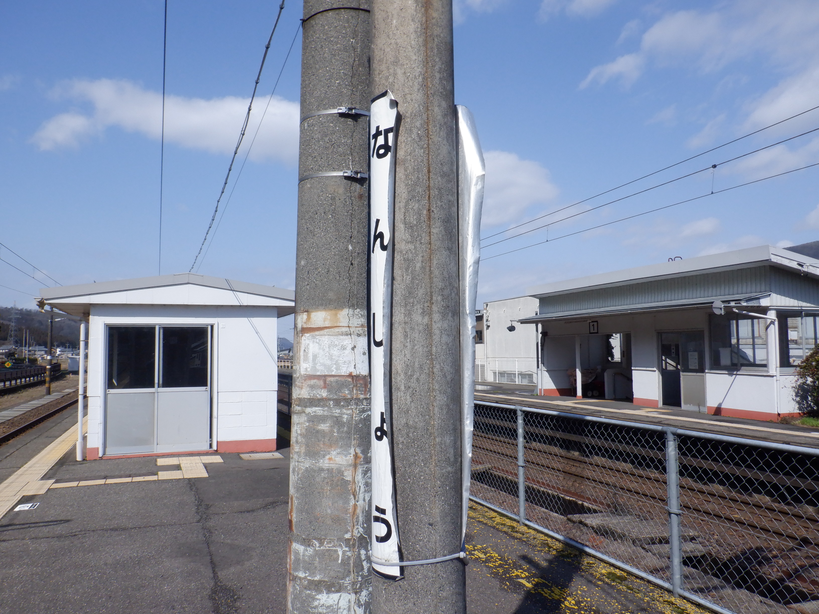 ハピラインふくいの駅名標の上に仮のJR駅名標が貼られた状態となりました。