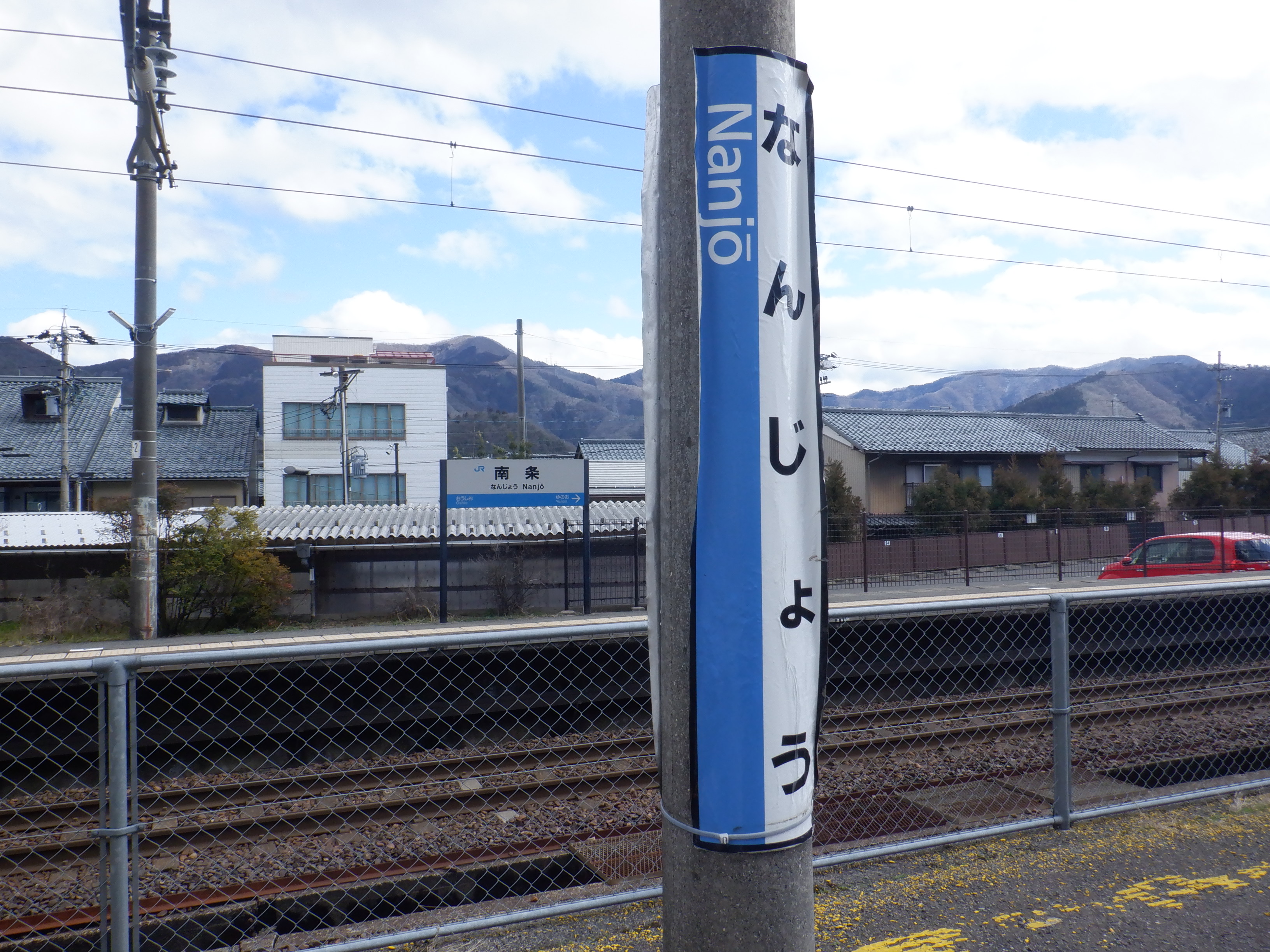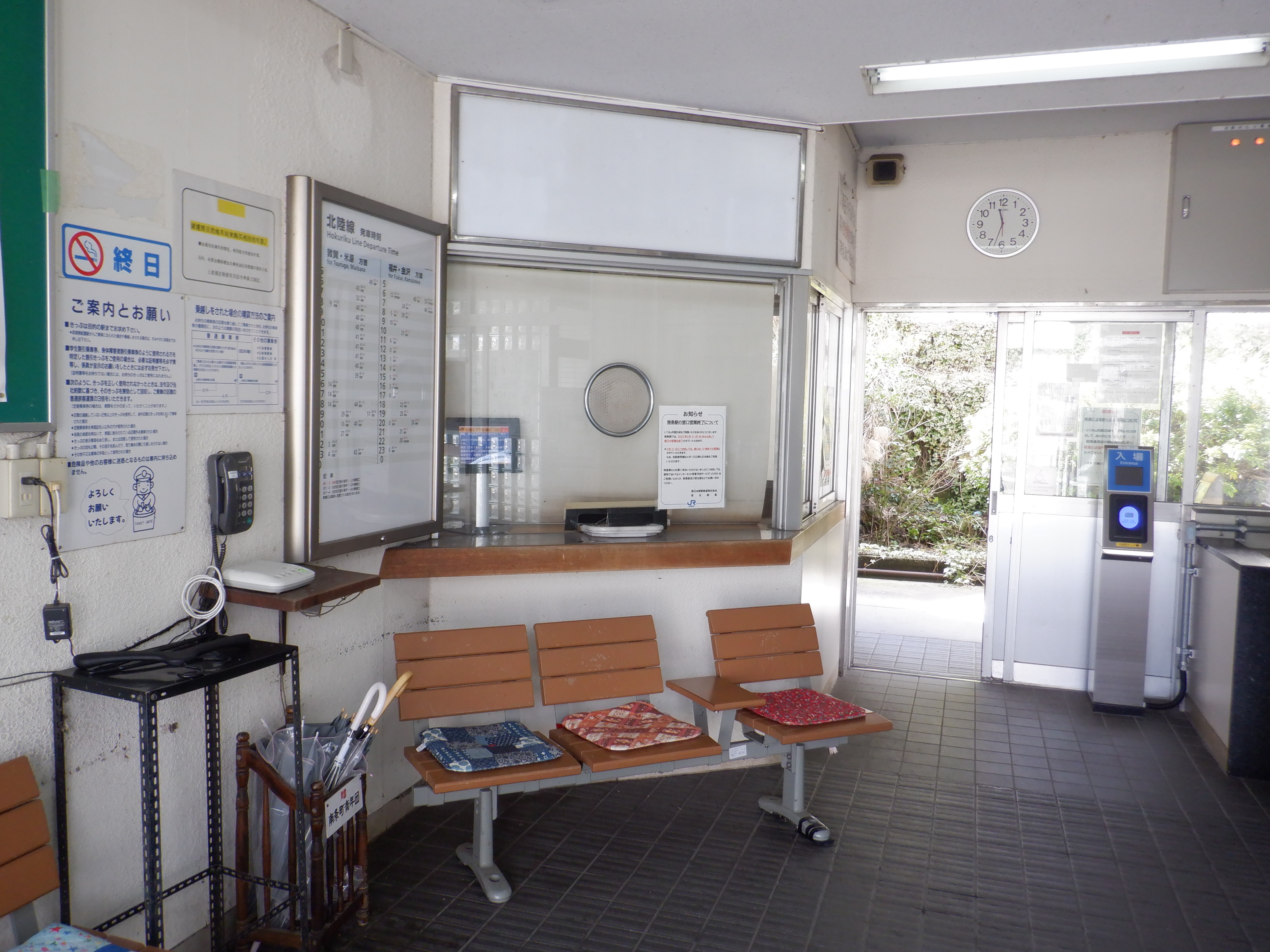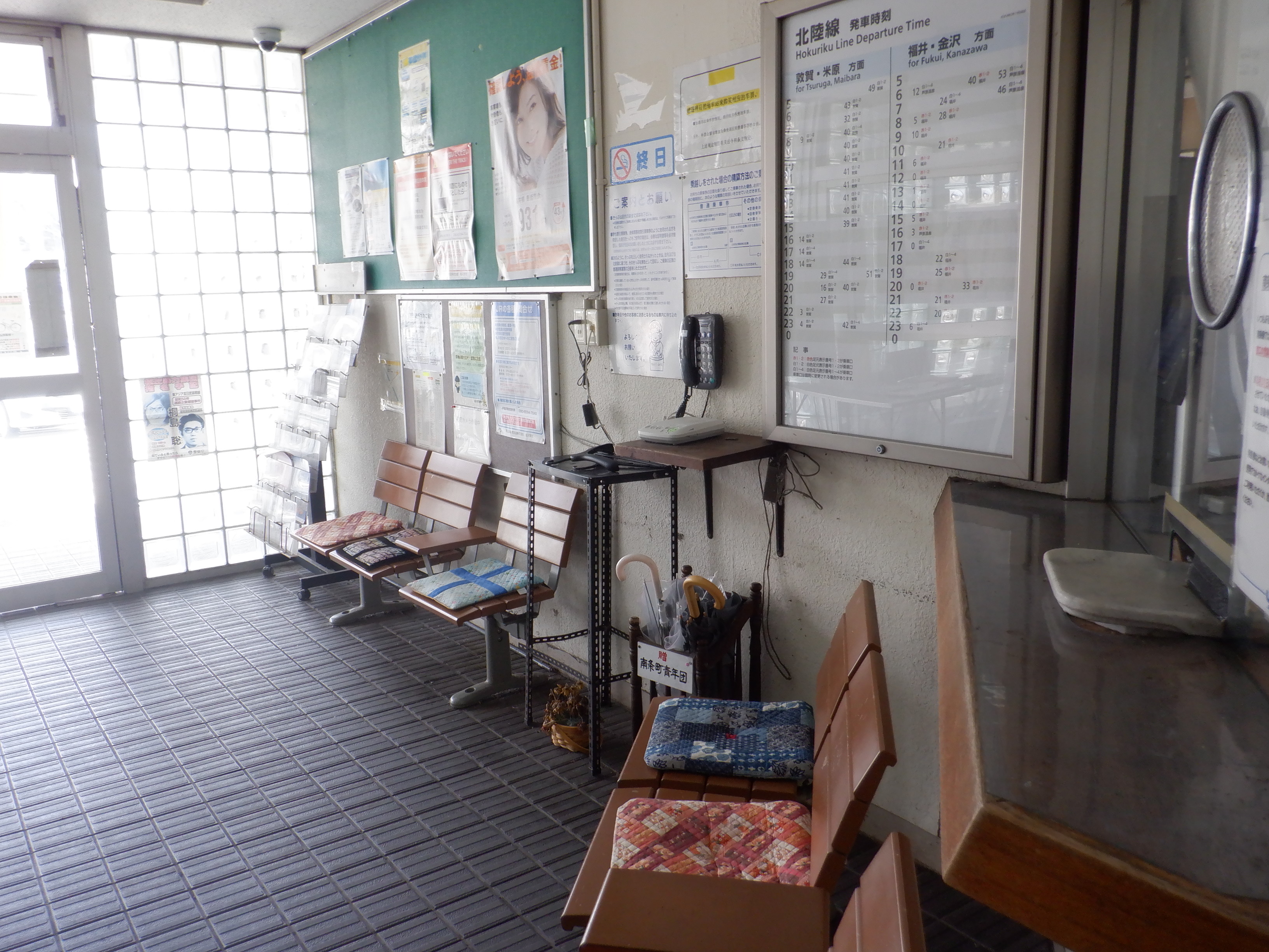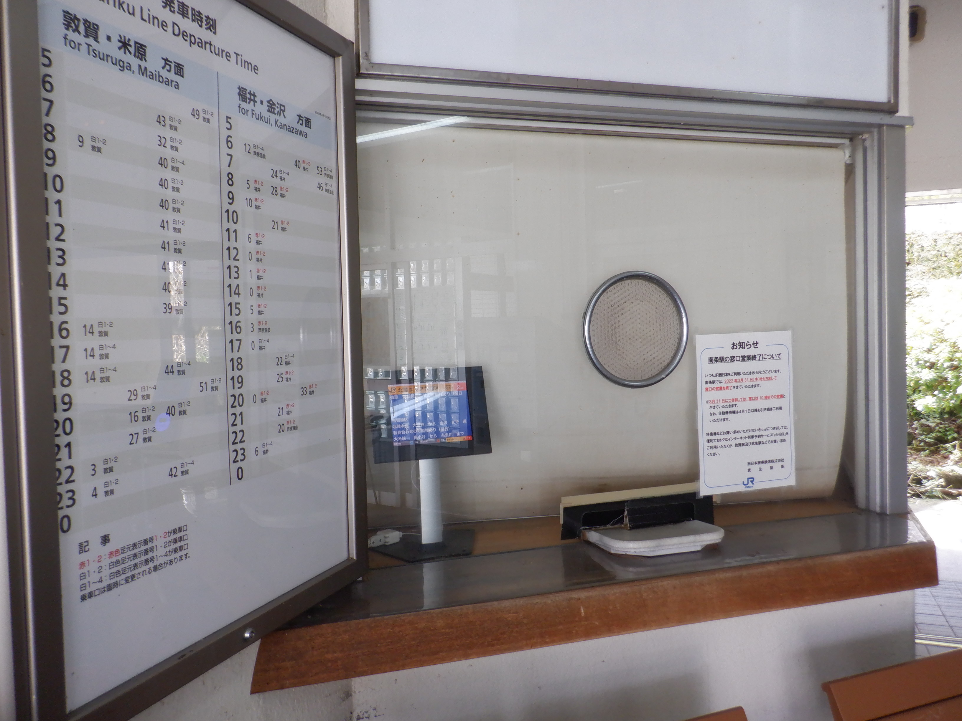 南条駅の2024年移管前2回分の様子です。移管後に使用される券売機が設置され、また、ハピラインふくいの駅名標の上に仮のJR駅名標が貼られた状態となりました。