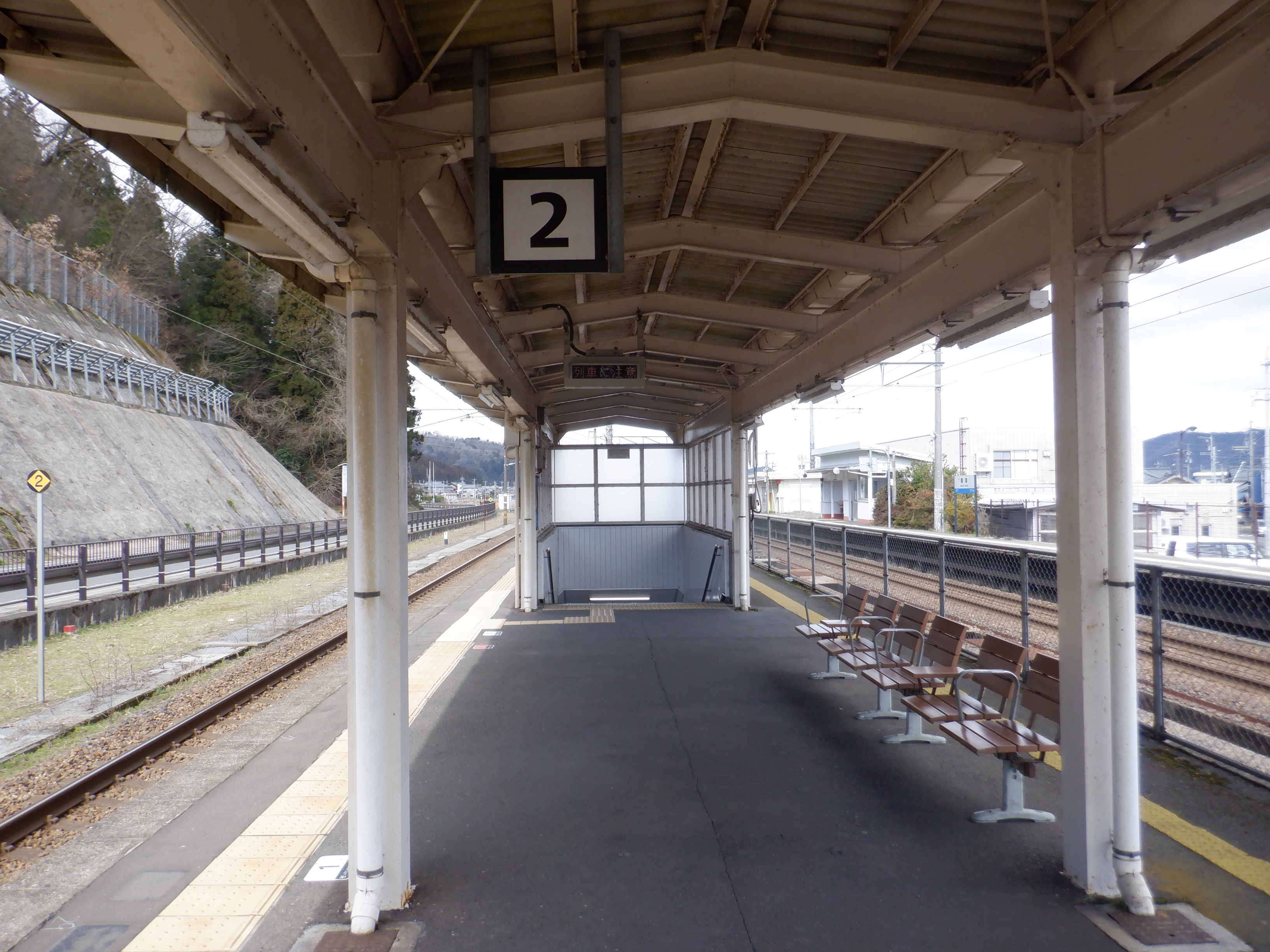 2番のりばの駅名標。ハピラインふくいの駅名標の上に仮のJR駅名標が貼られています。