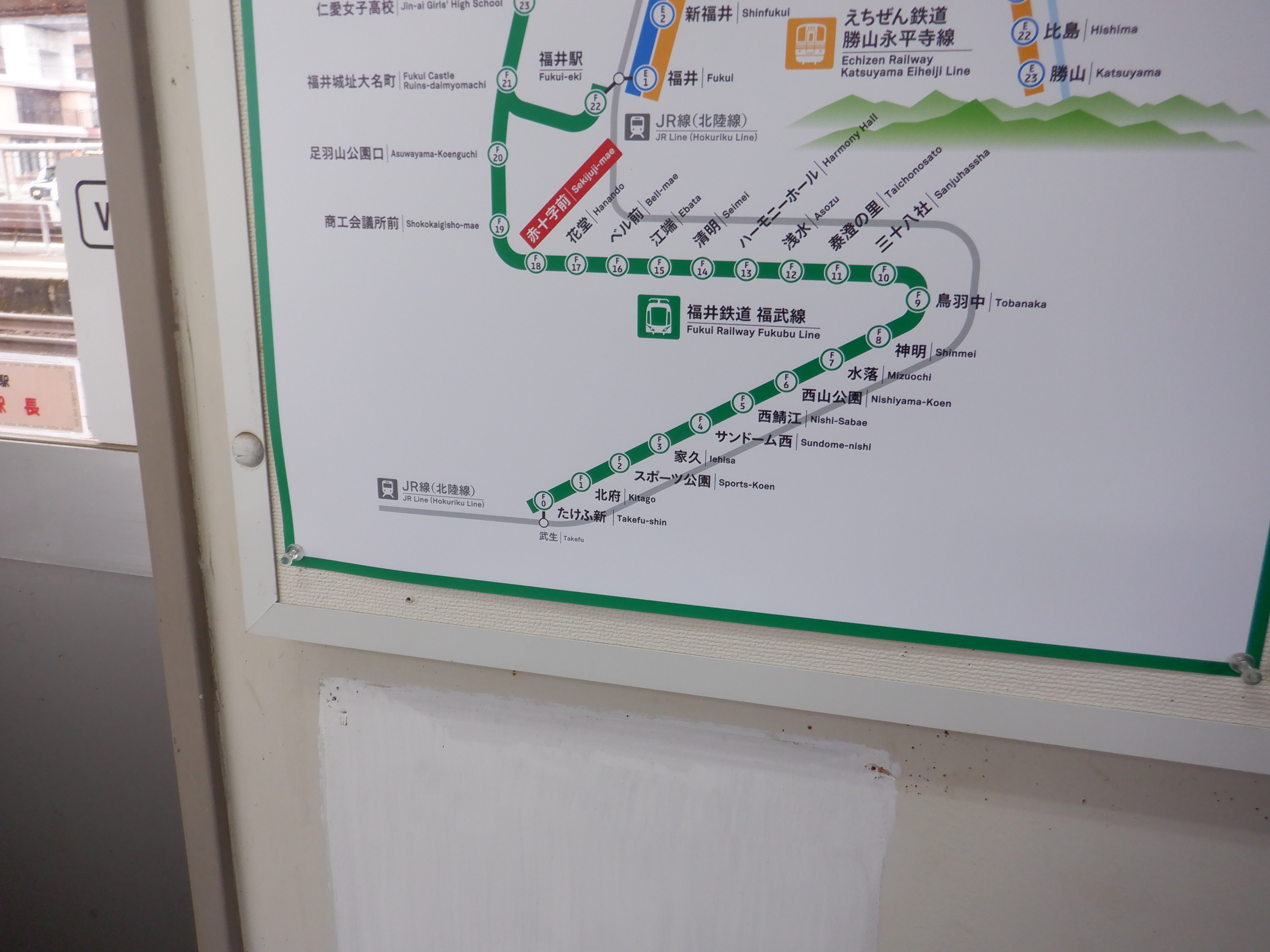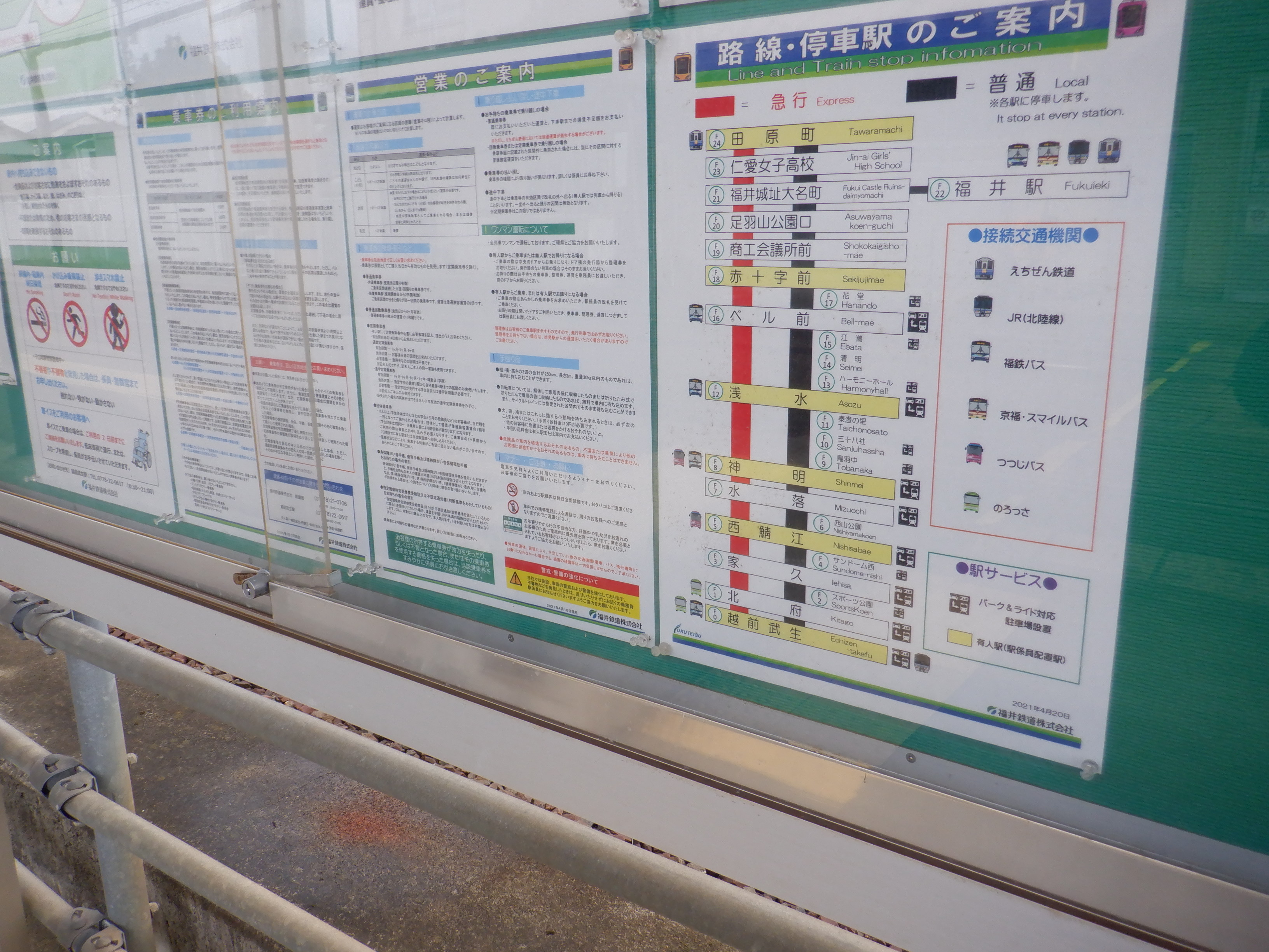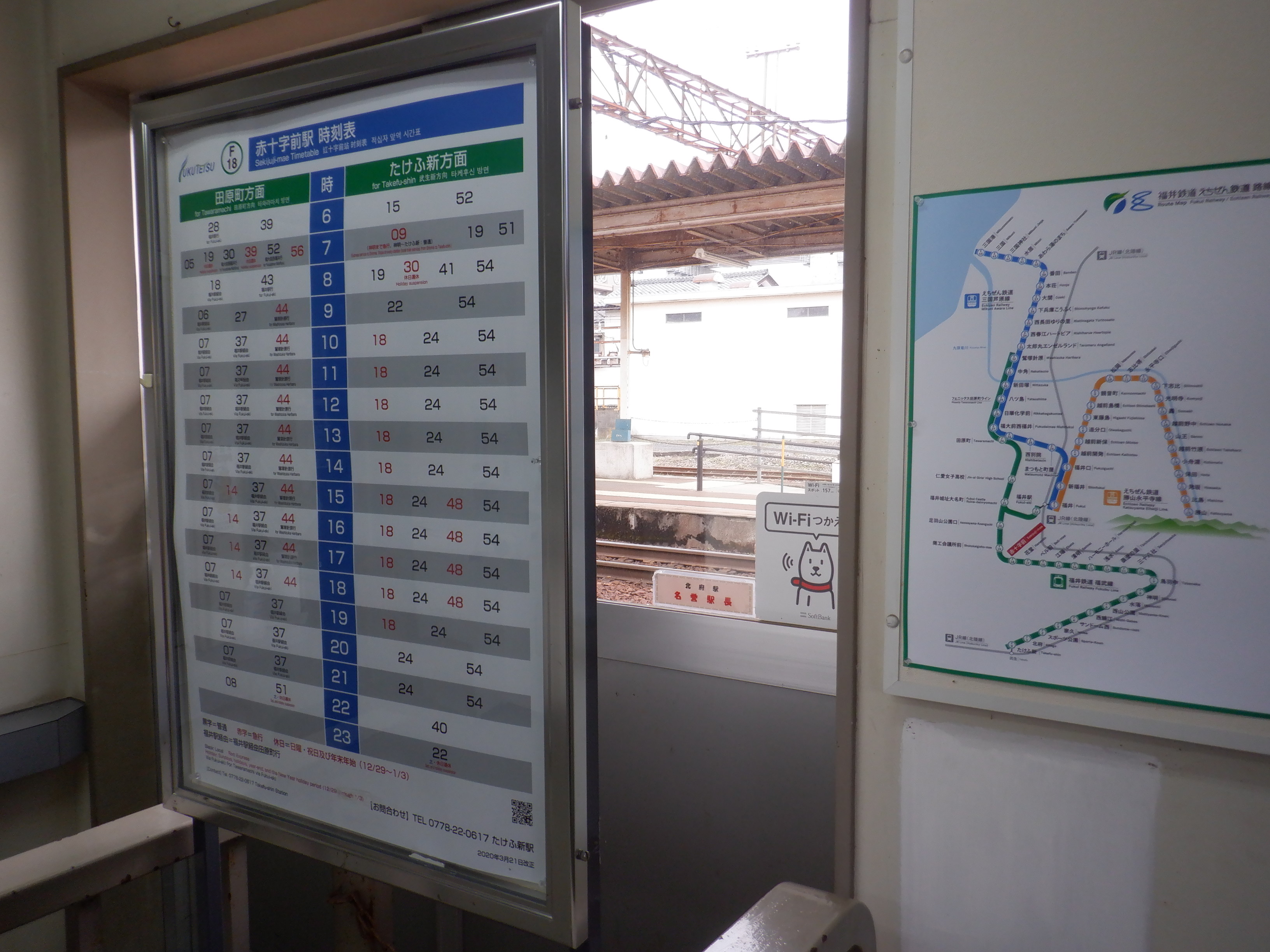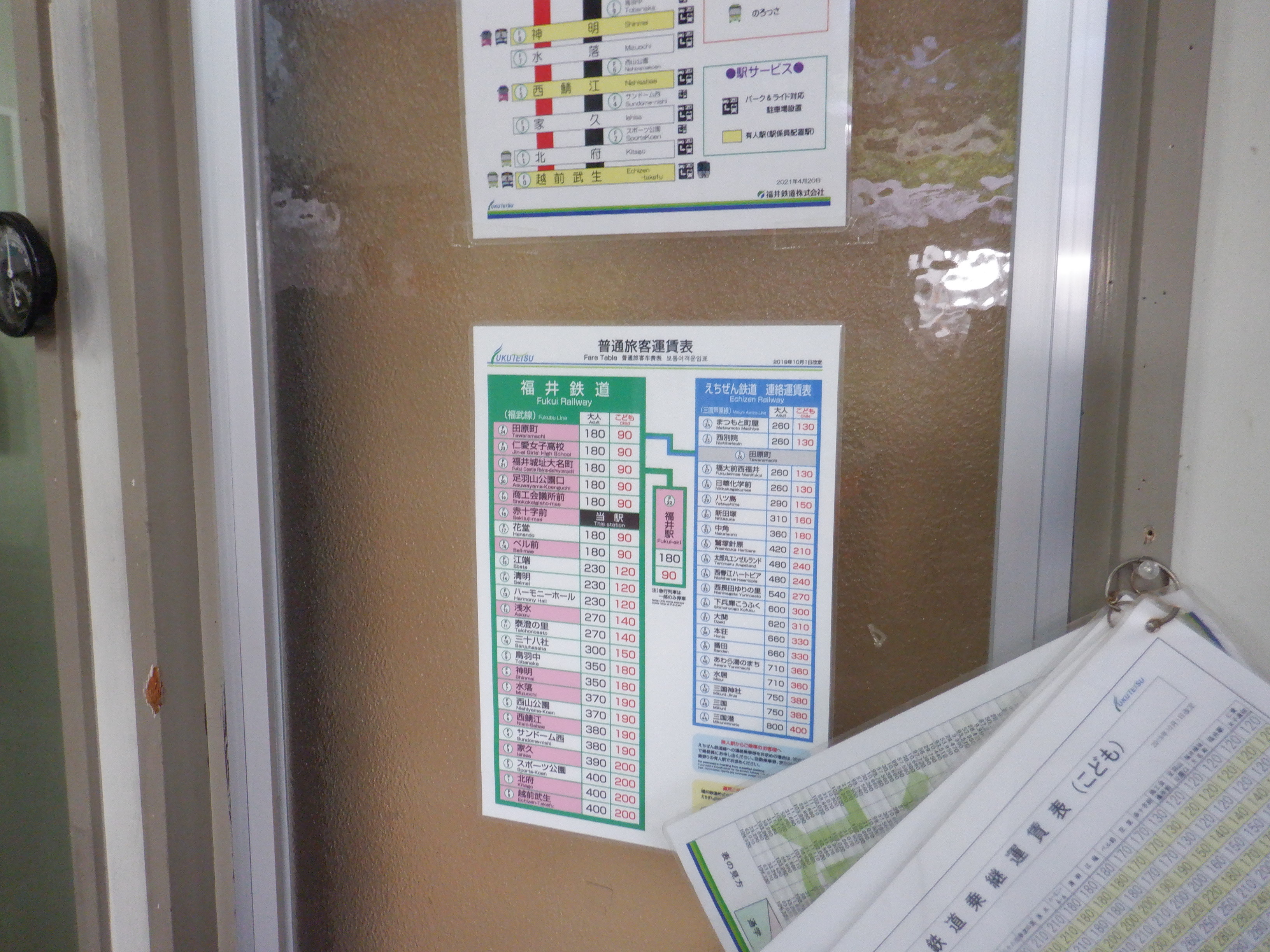 駅舎内は時刻表や運賃表、路線図などは「たけふ新」に変わっていました。