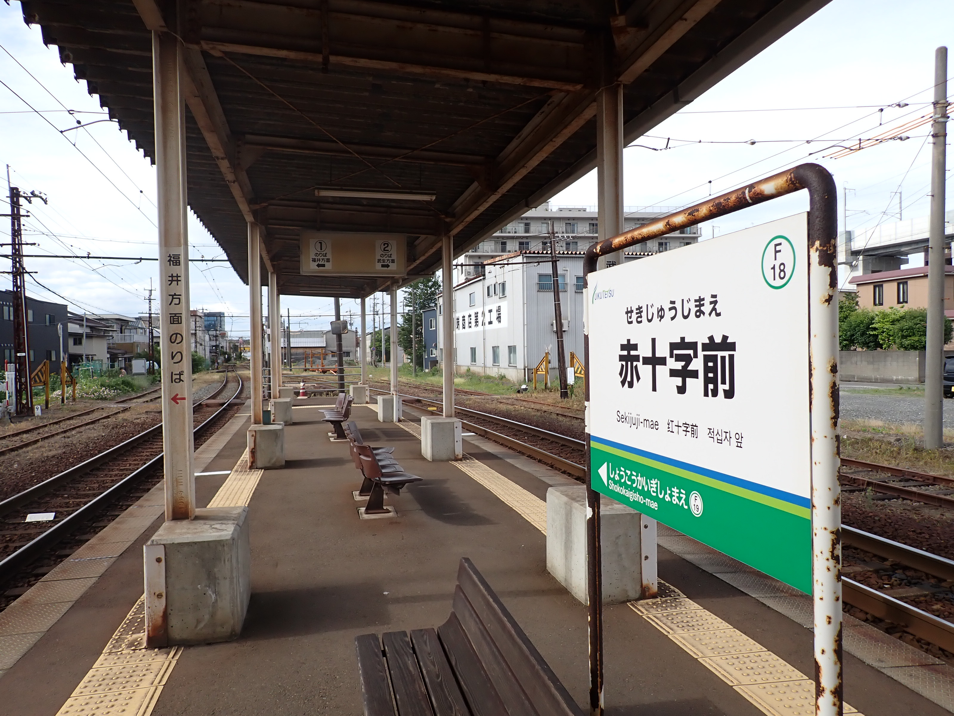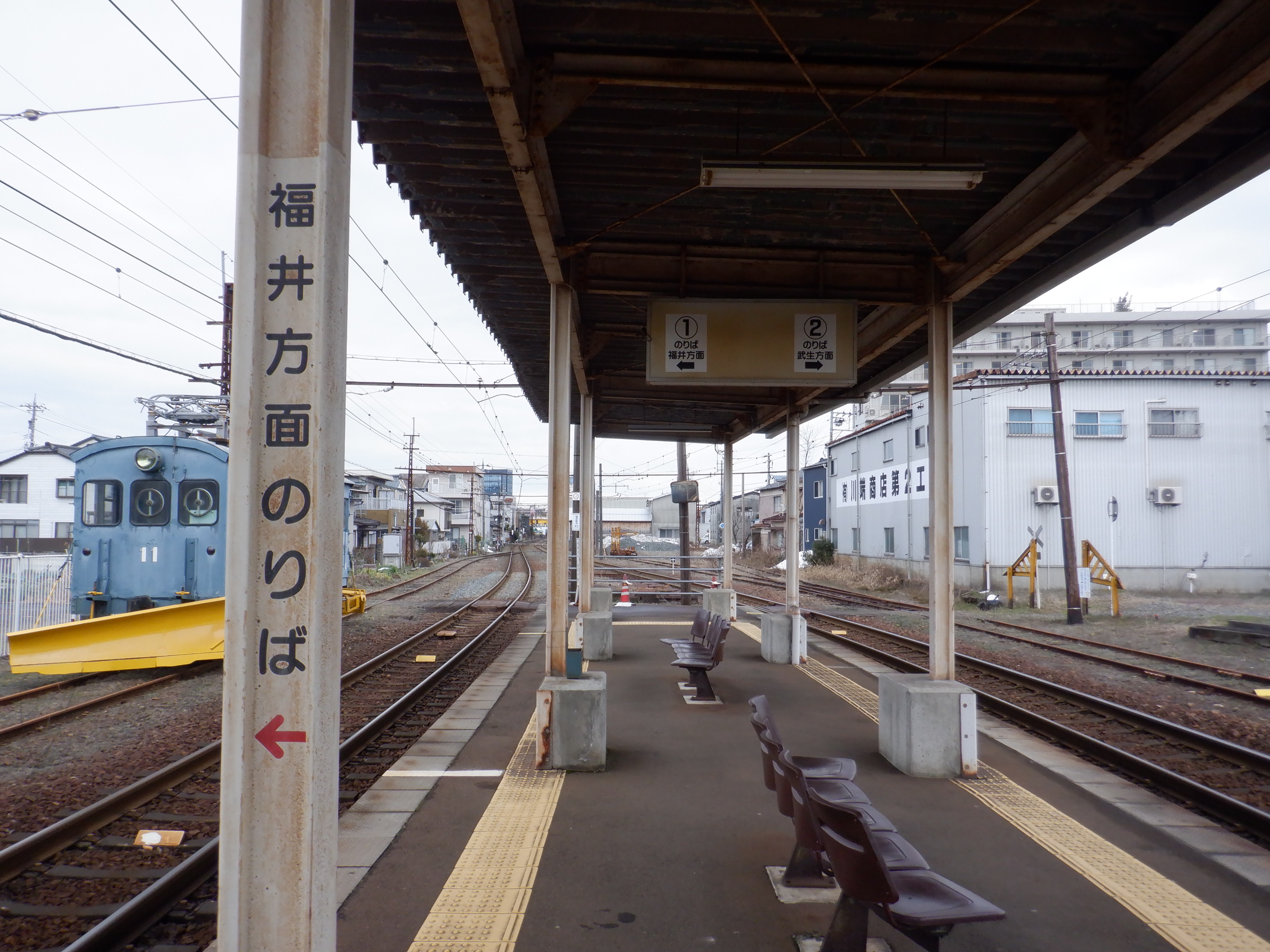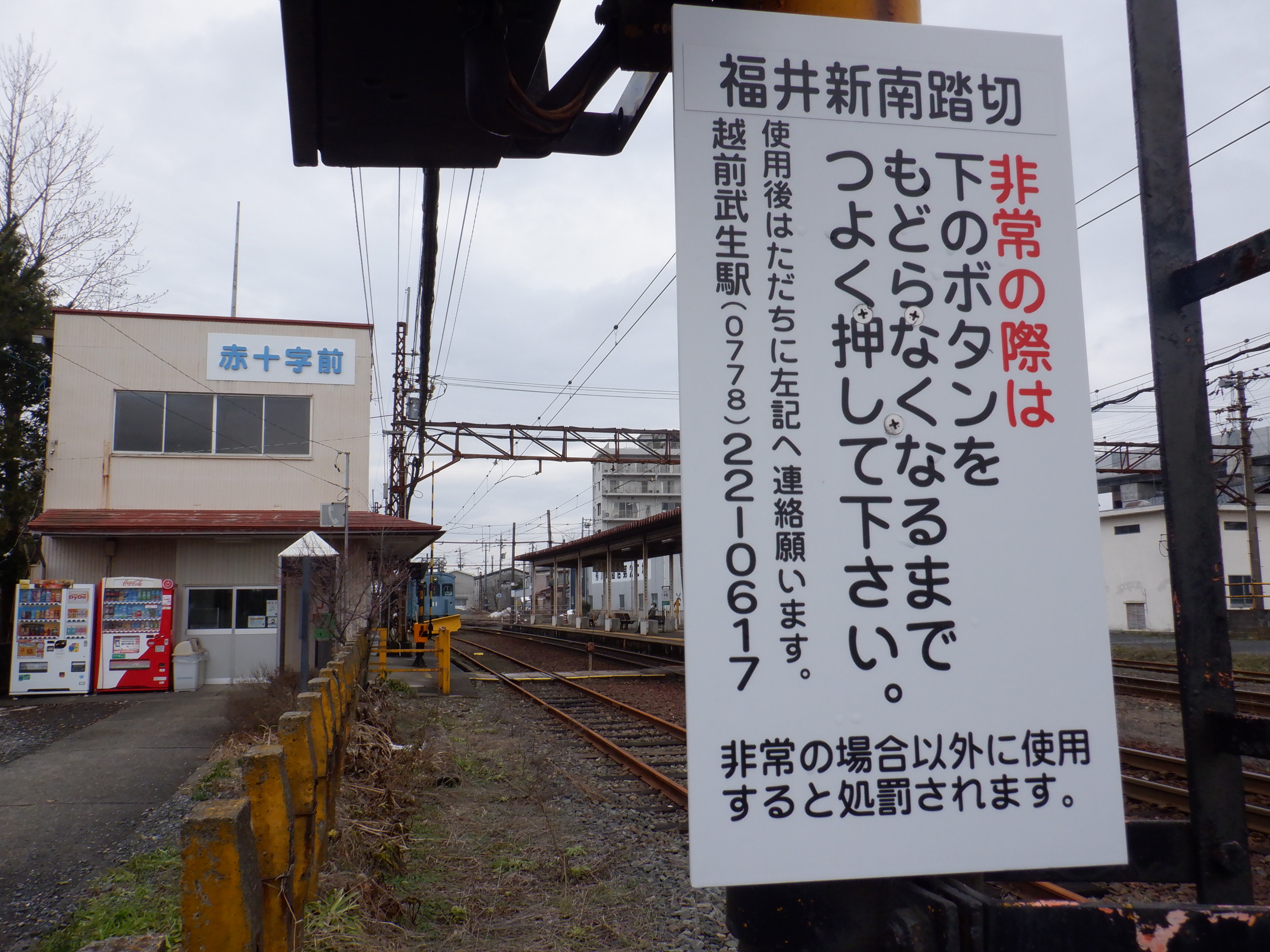 駅のそばの踏切とその付近から。こちらも「福井新」の名前が残っています。