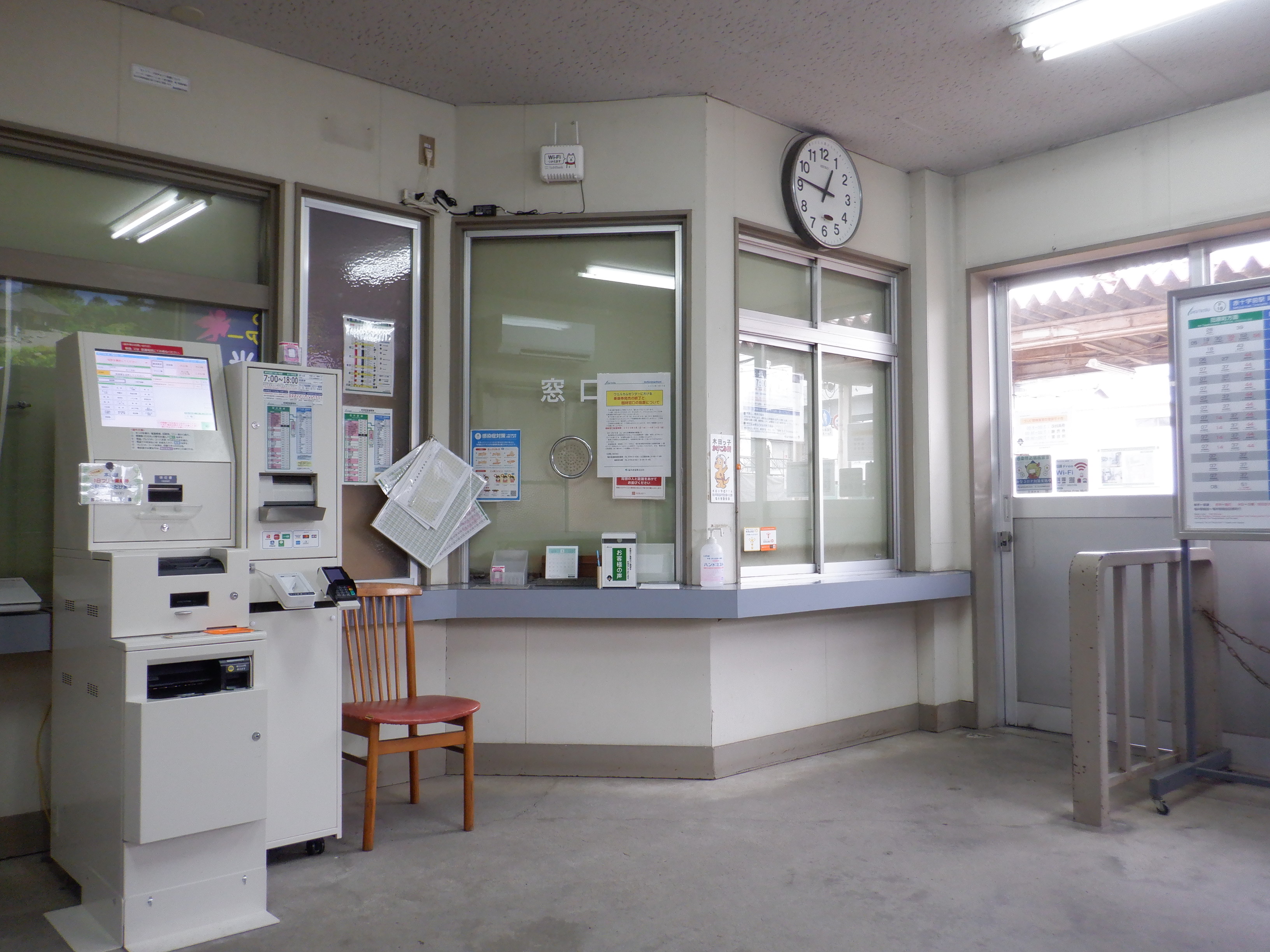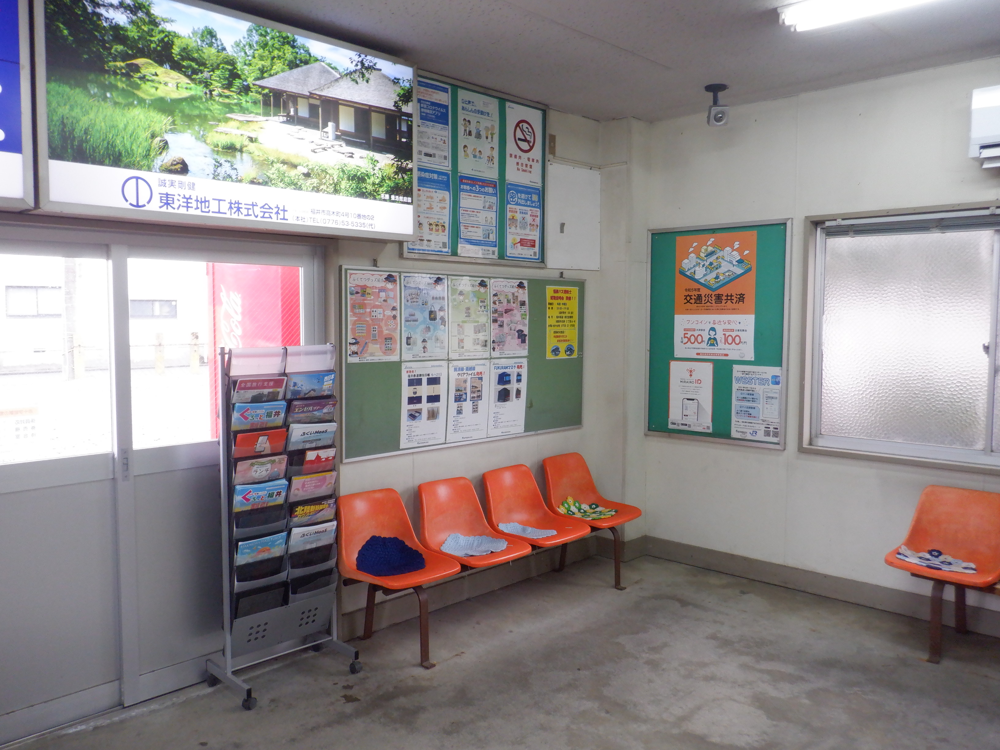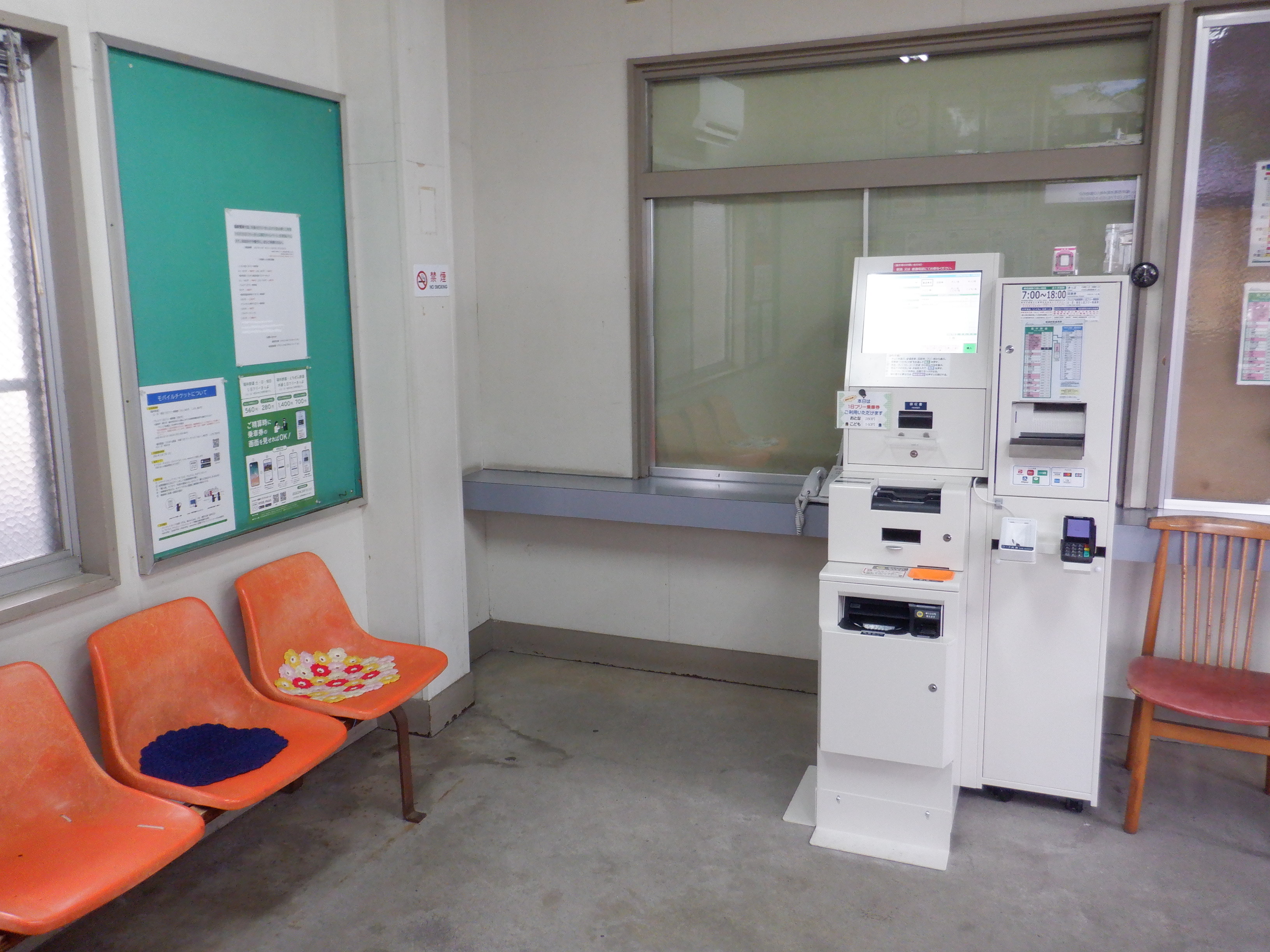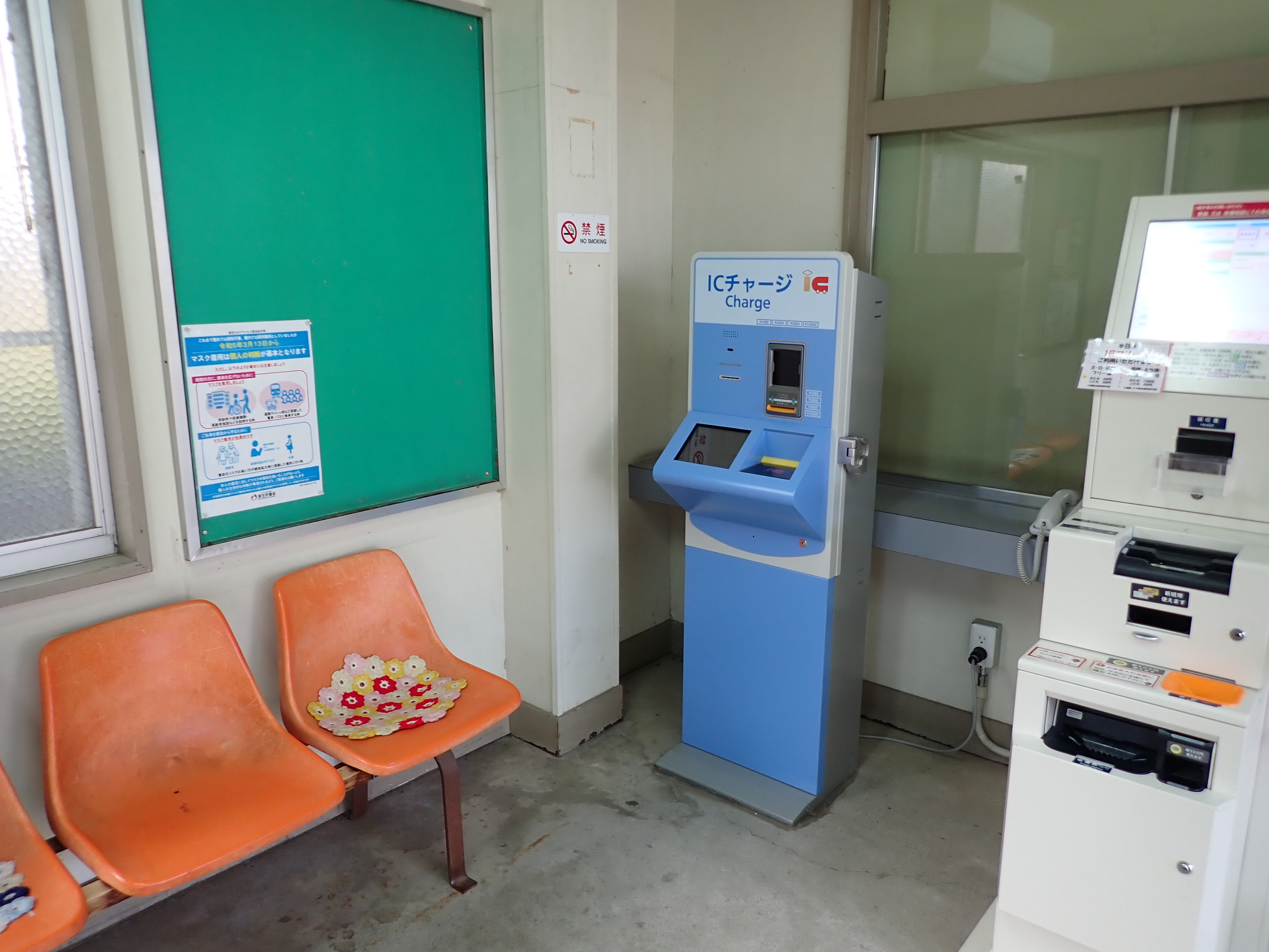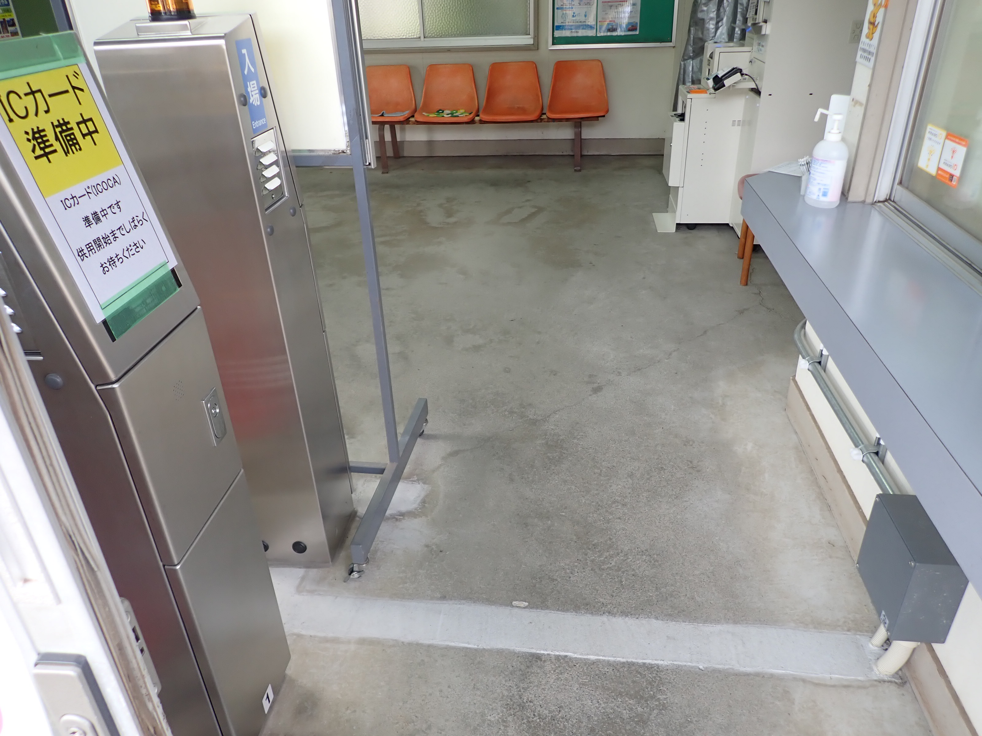駅舎内。ICOCA改札機とカバーを被ったチャージ機が設置されていました。