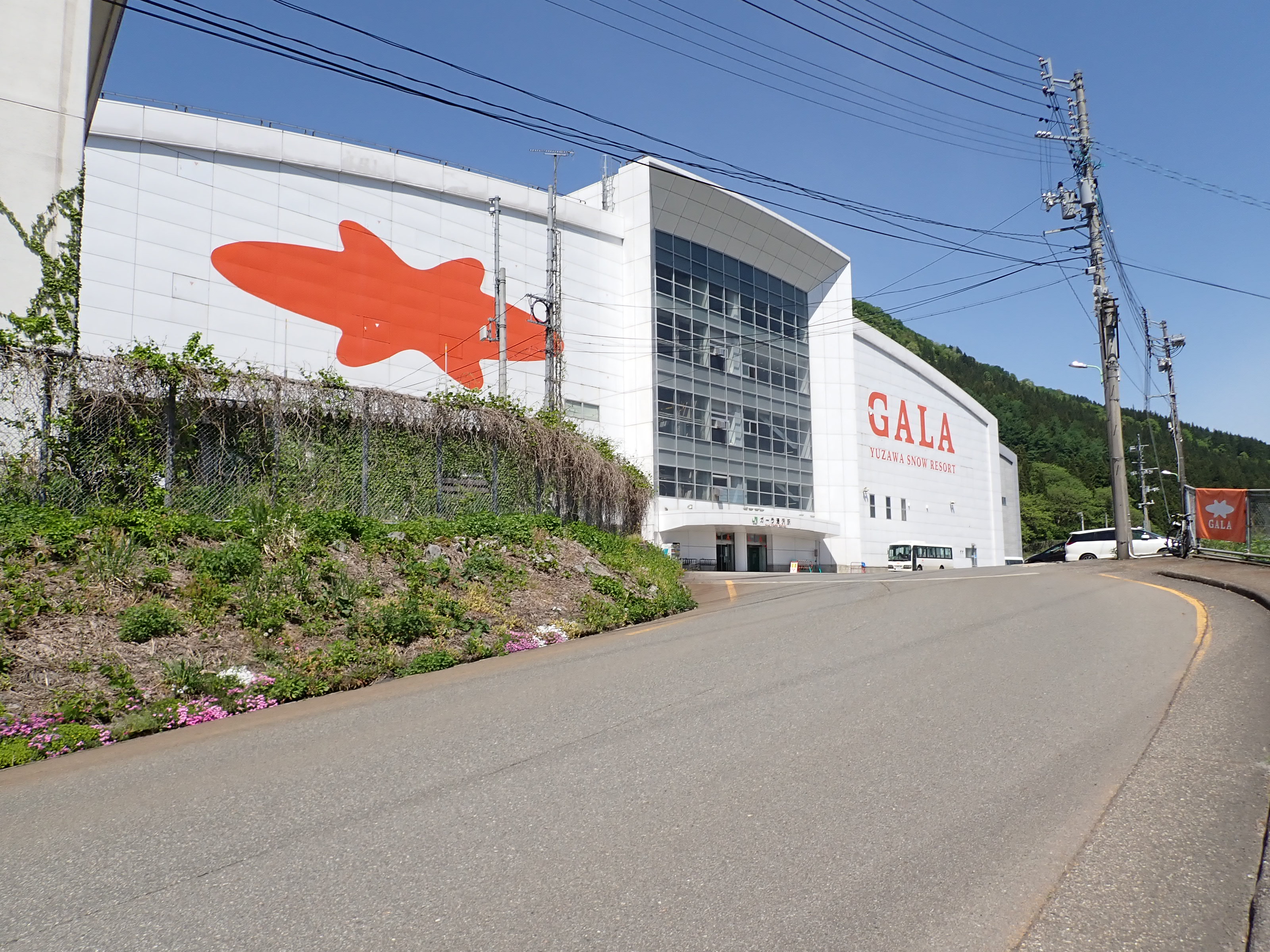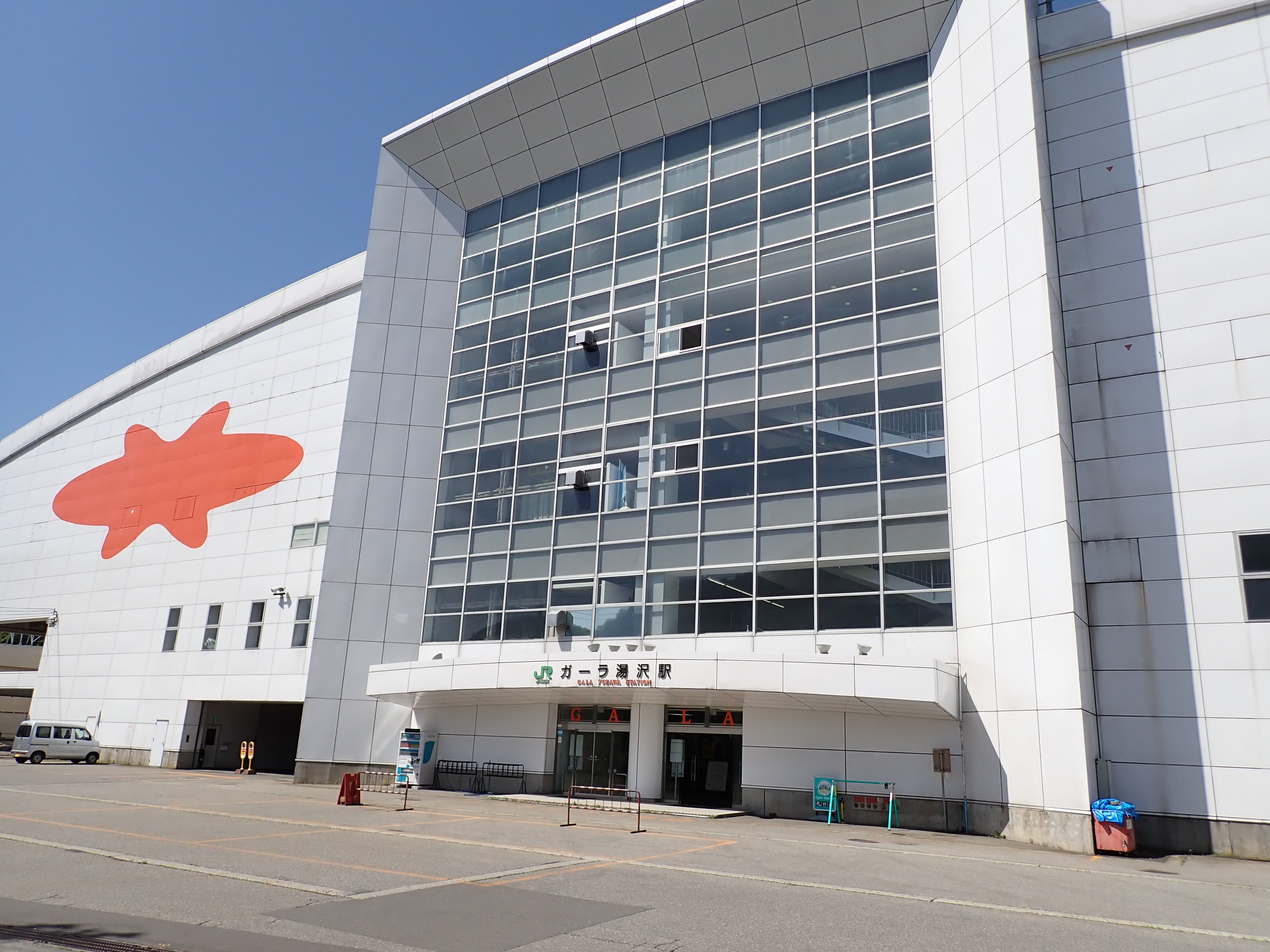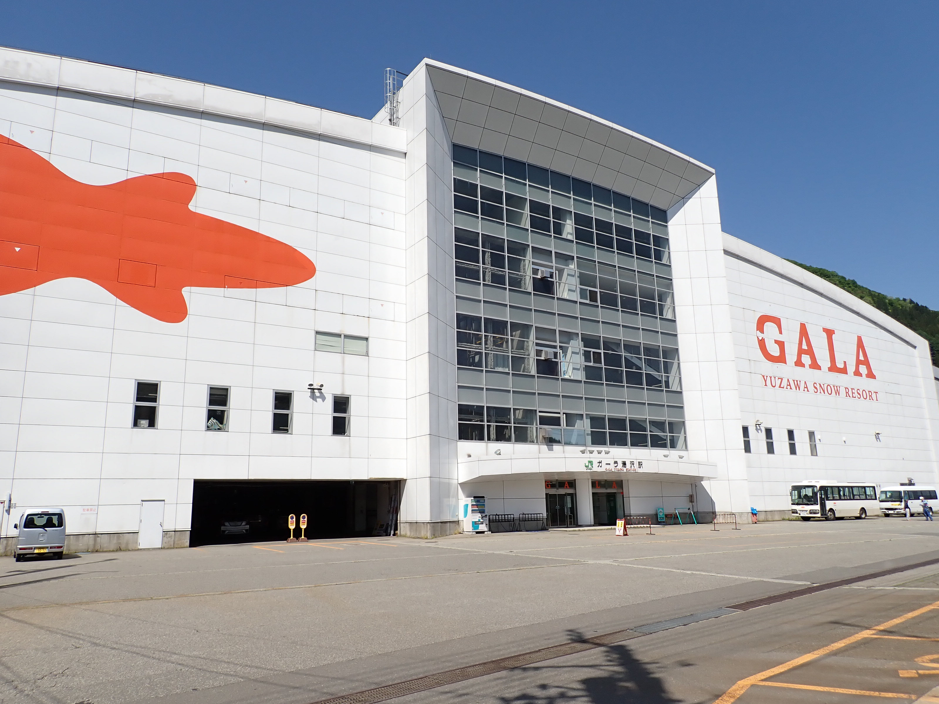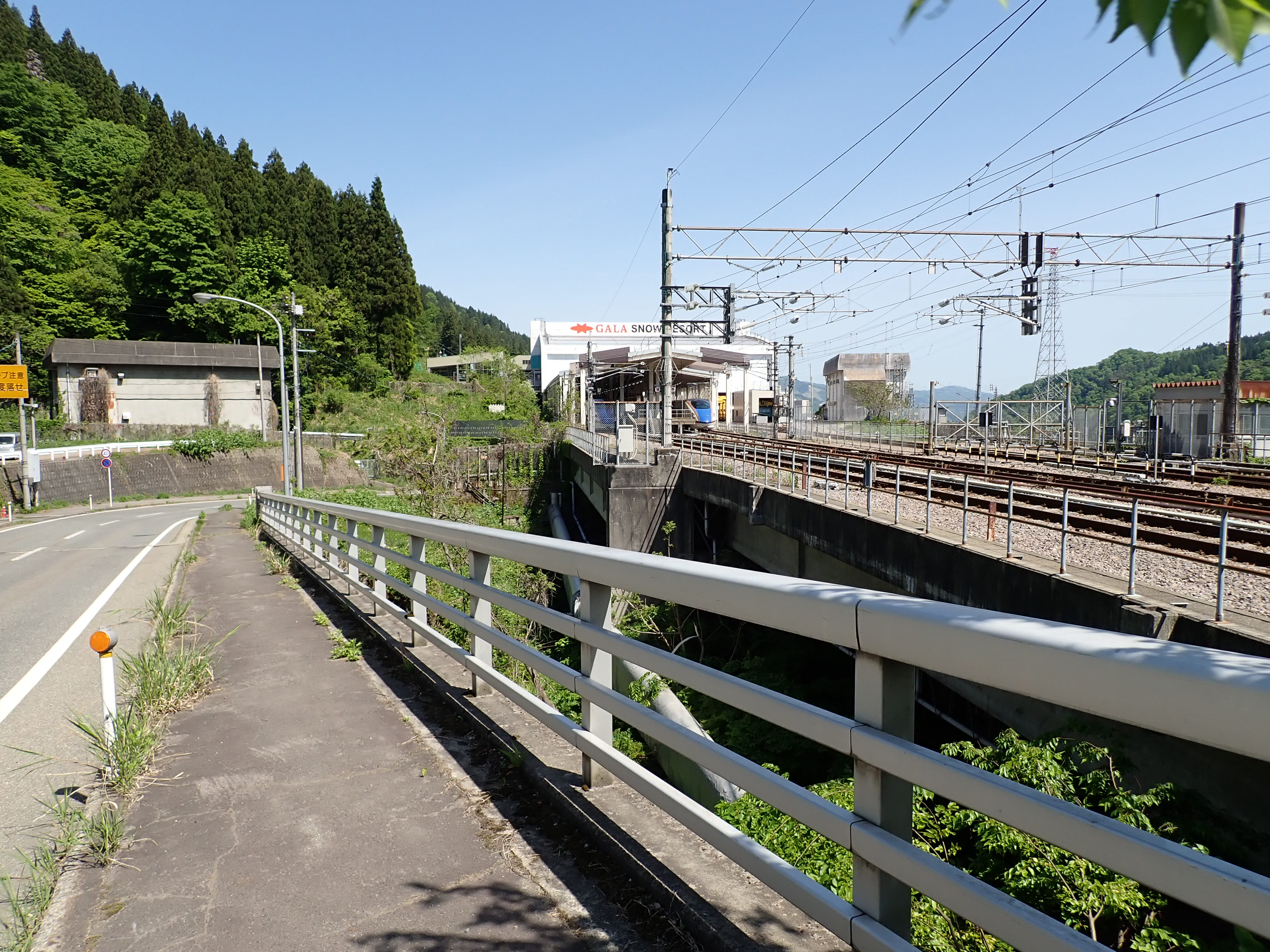 スキー場施設へ直結している季節営業の駅です。在来線の駅という扱いですが、列車や施設はもちろん新幹線の駅そのものです。駅・スキー場建物から外へ出ると、関越道や国道、上越線が通る谷を見おろすことができます。