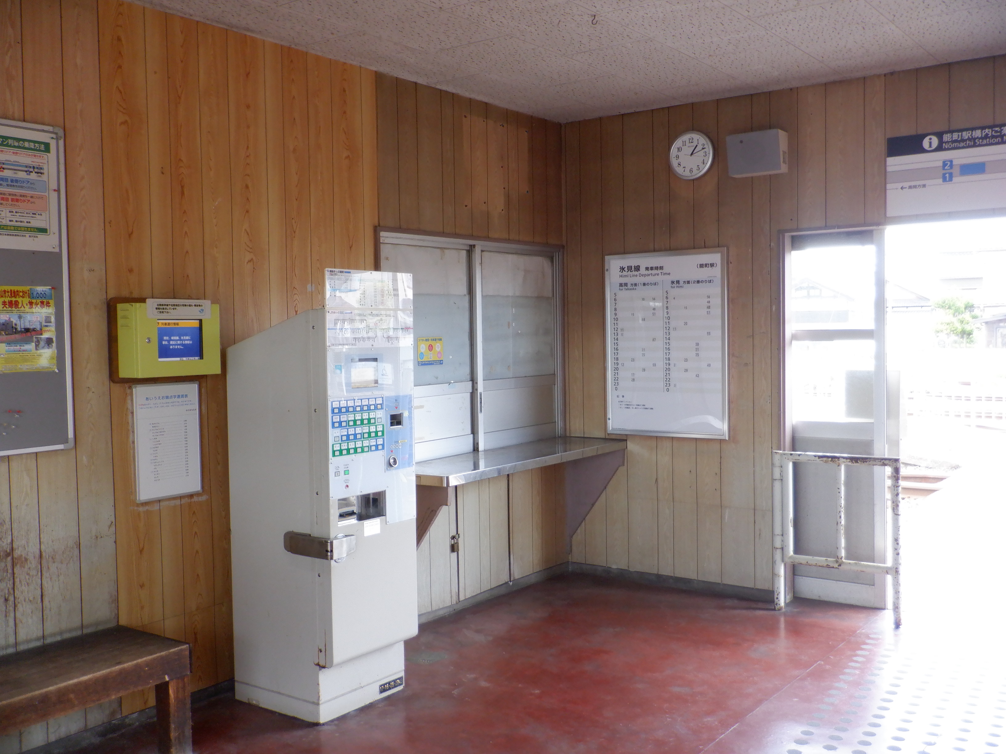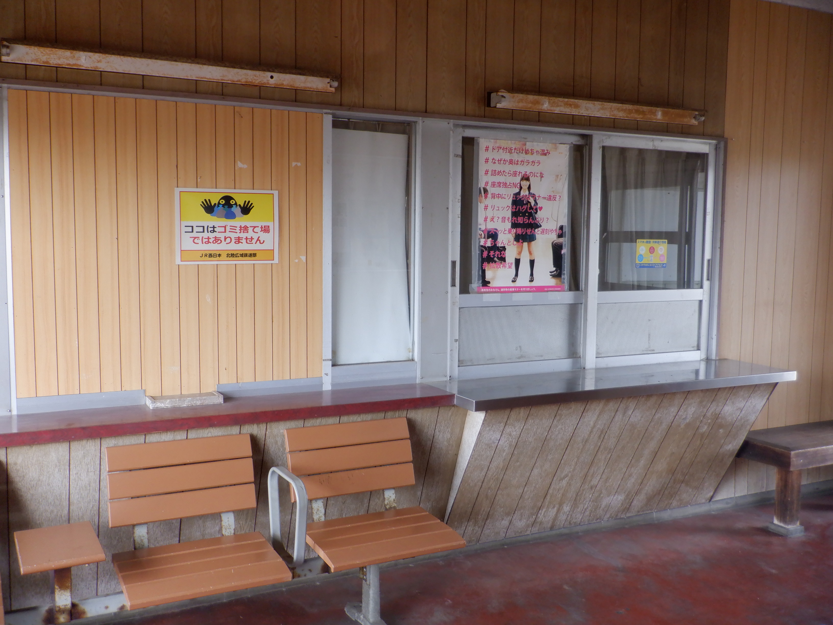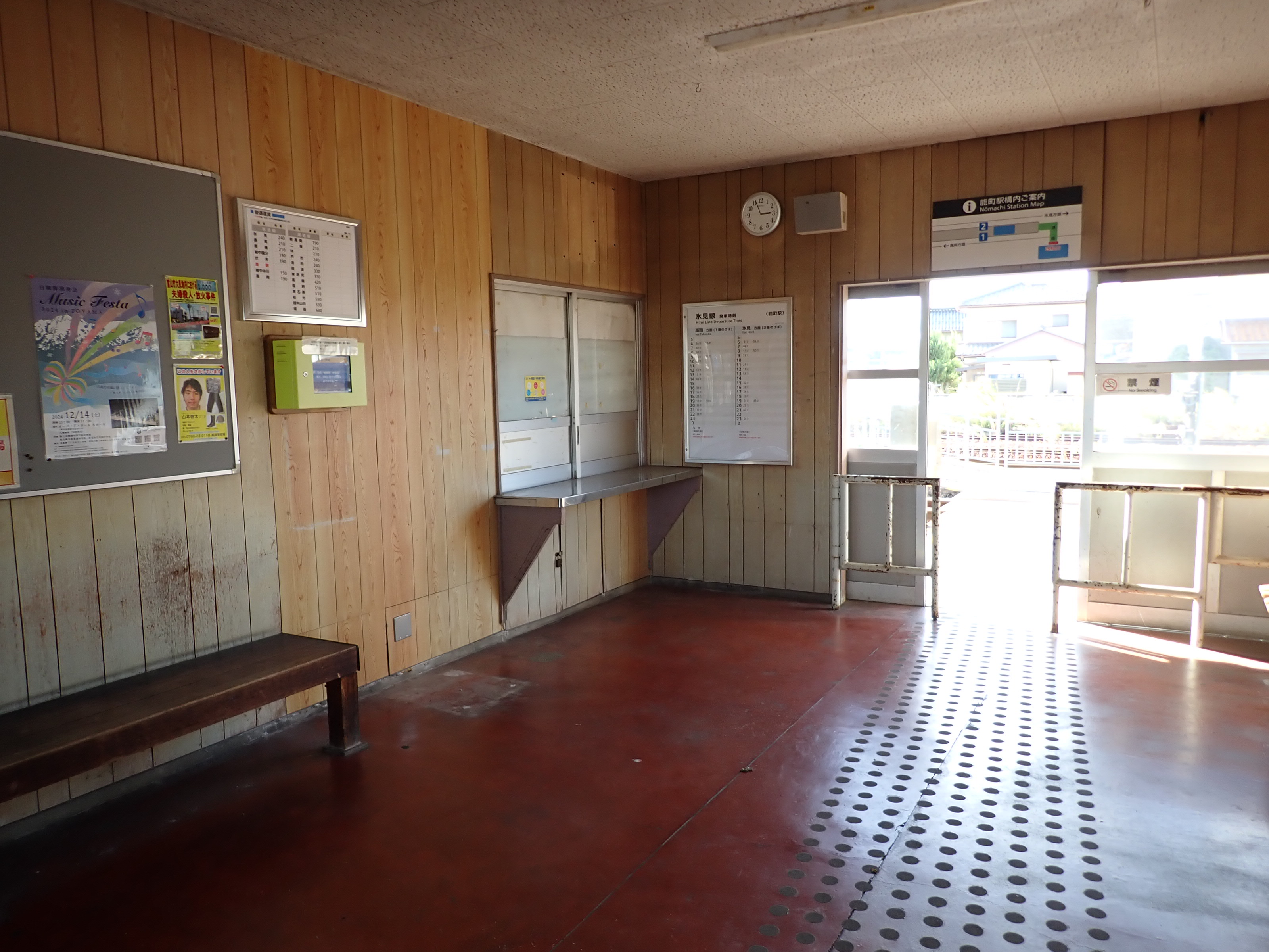 券売機が撤去され、運賃表が設置された駅舎内の様子。