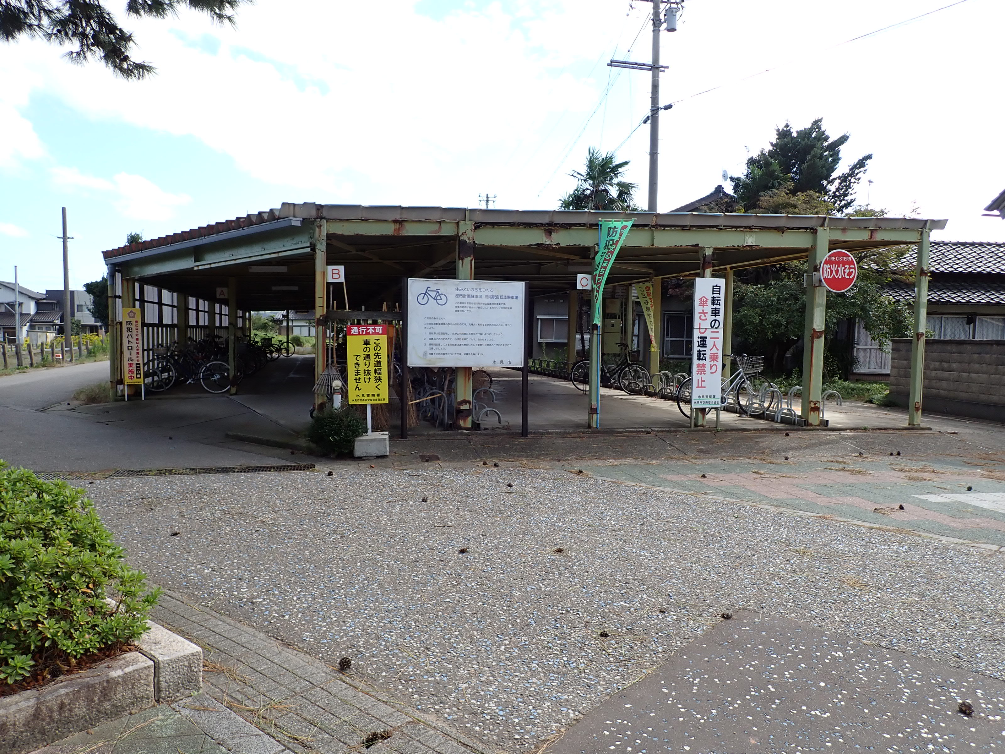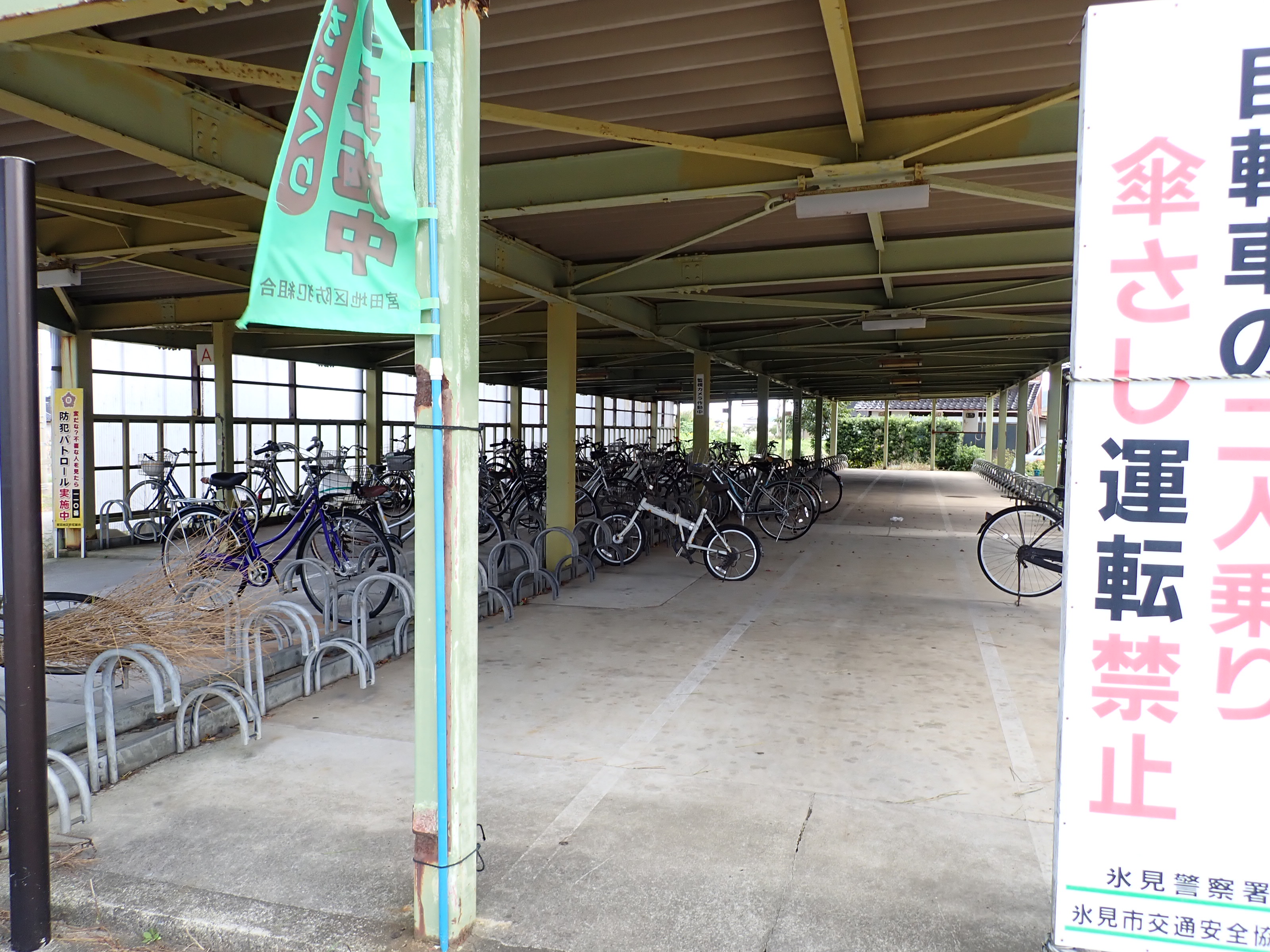 駐輪場から見た駅舎の方向。