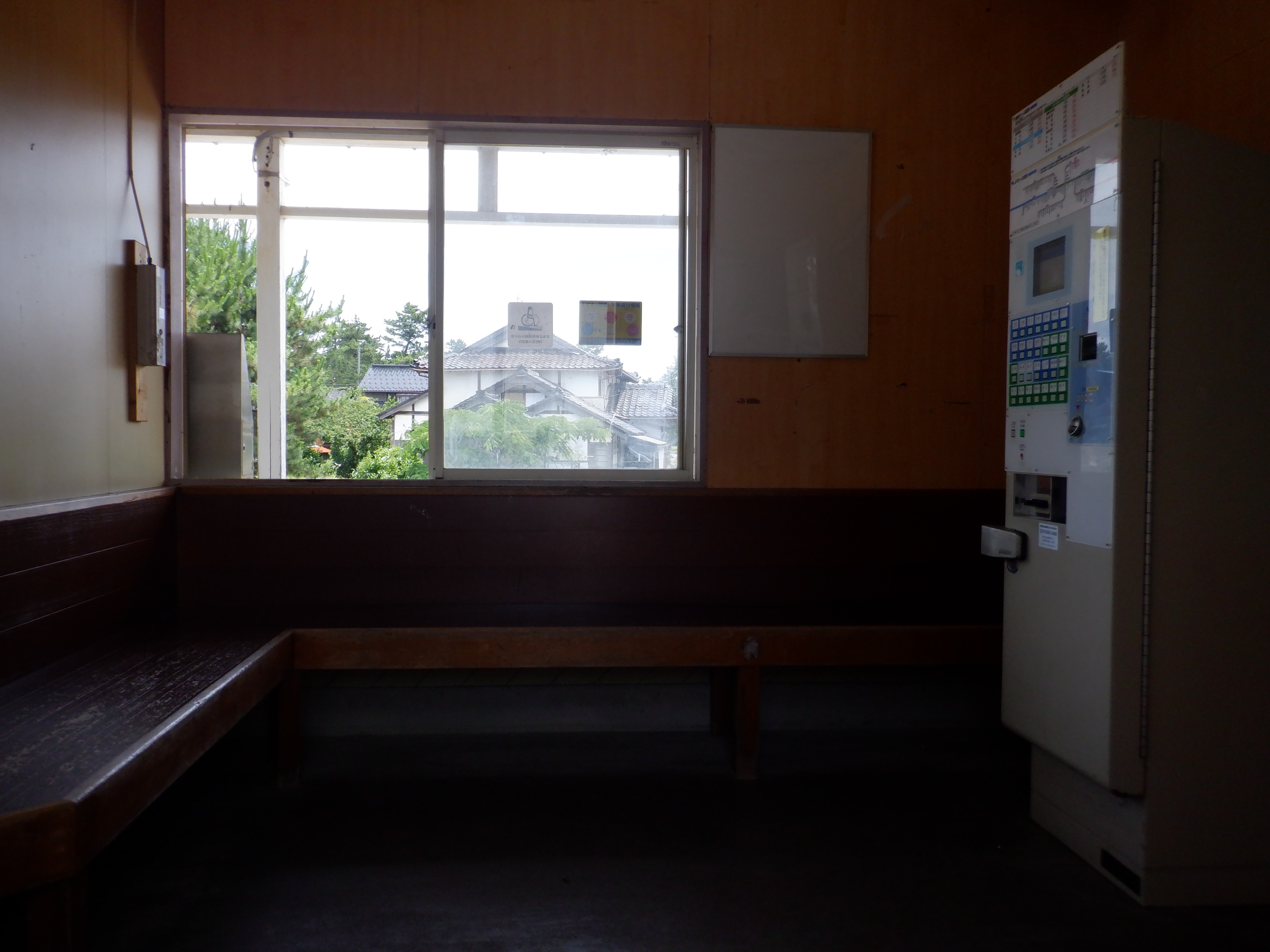 待合室内の様子。券売機が撤去され、運賃表が設置されていました。