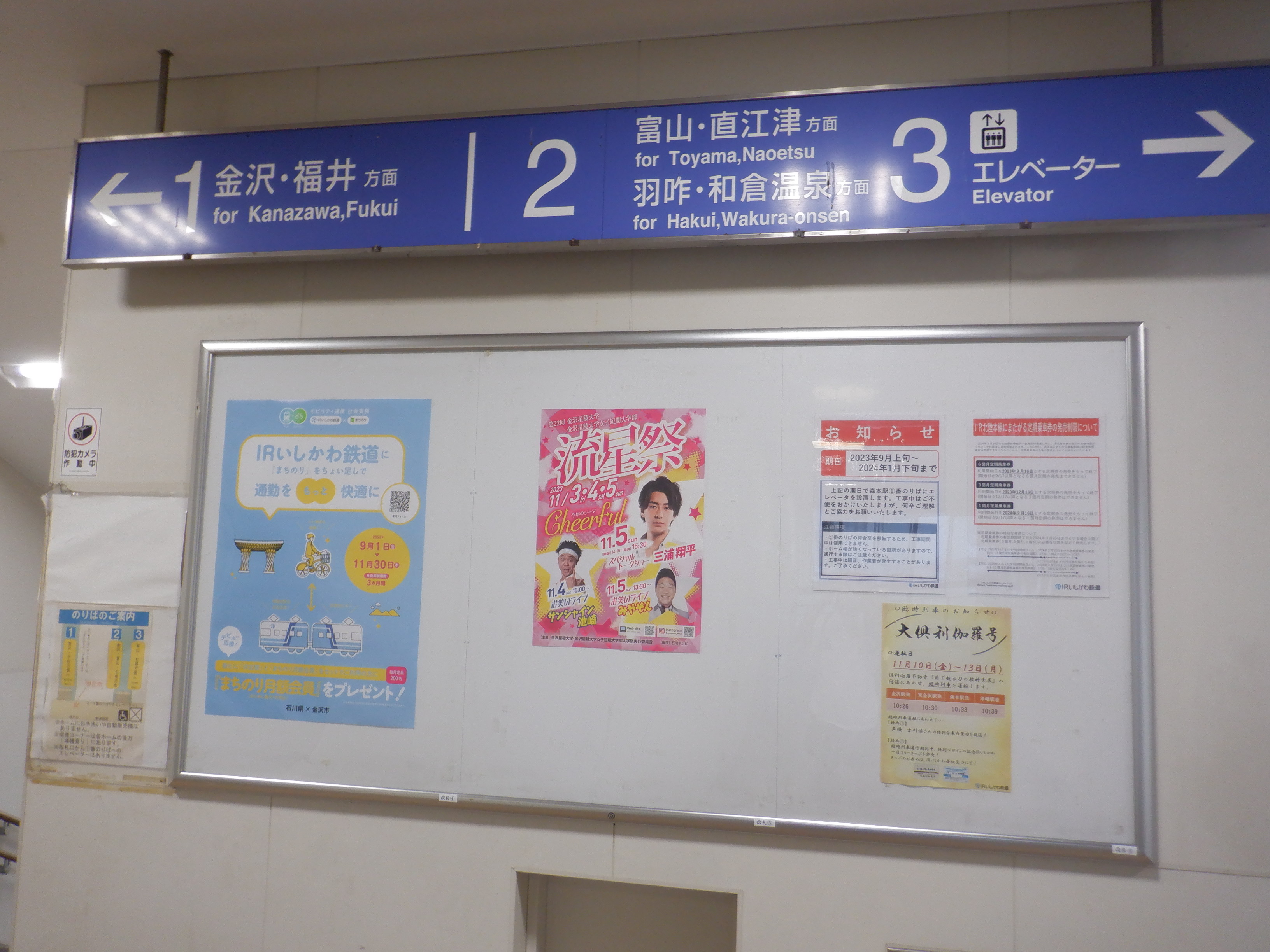 改札外の掲示板は、改札内とうって変わってIRいしかわ鉄道のポスターが1枚も貼られていません。