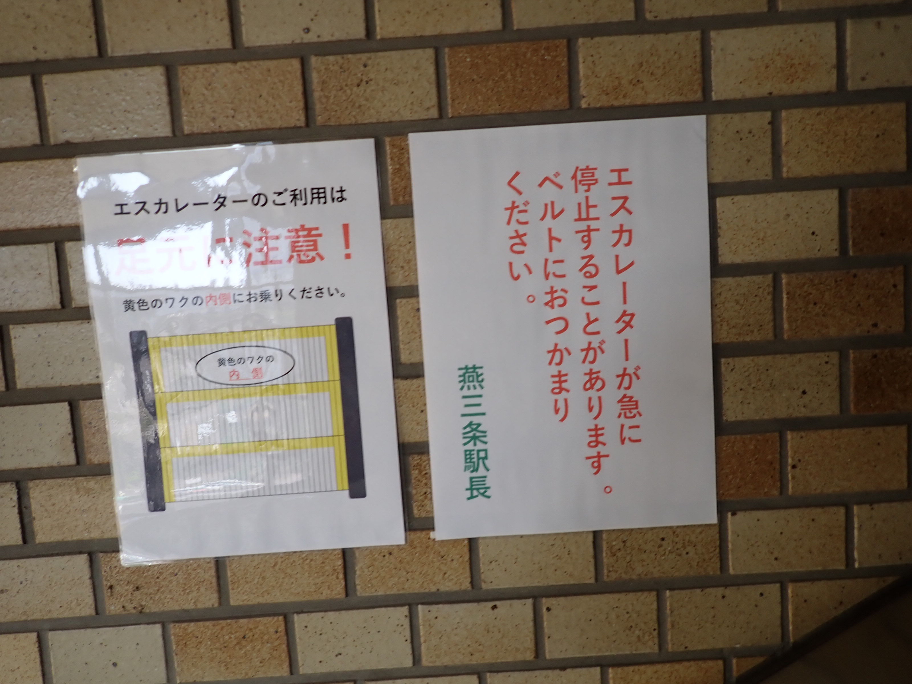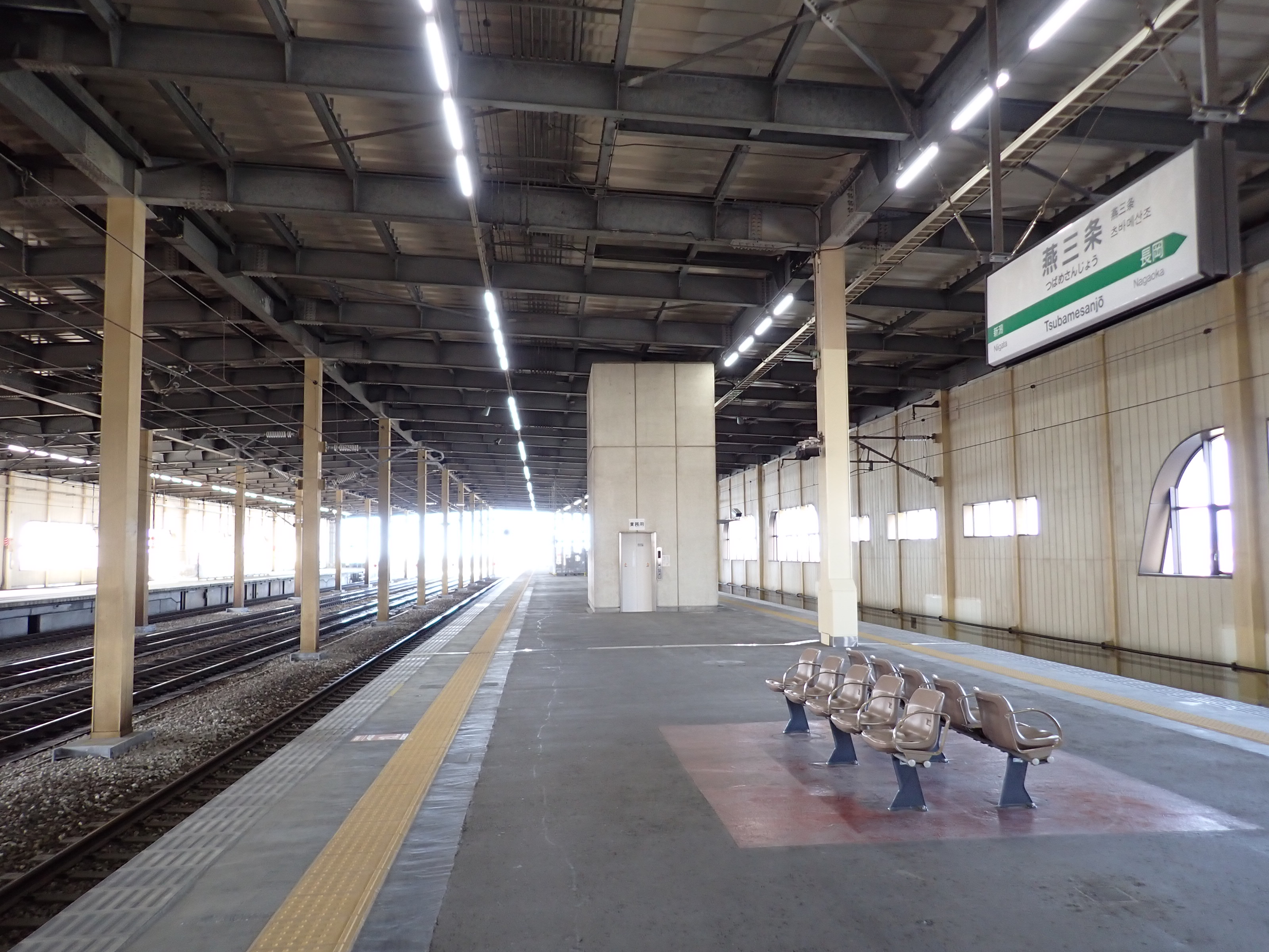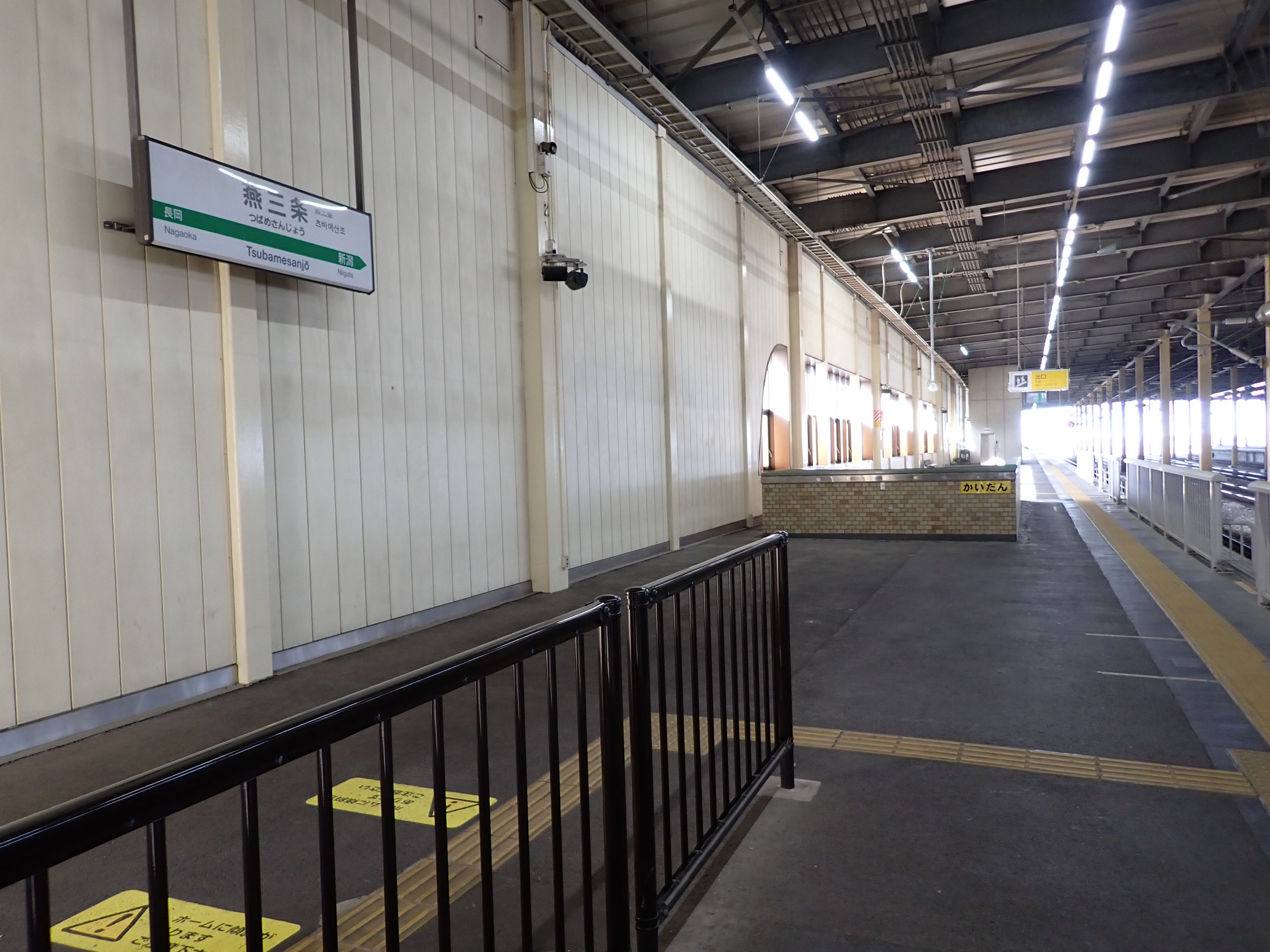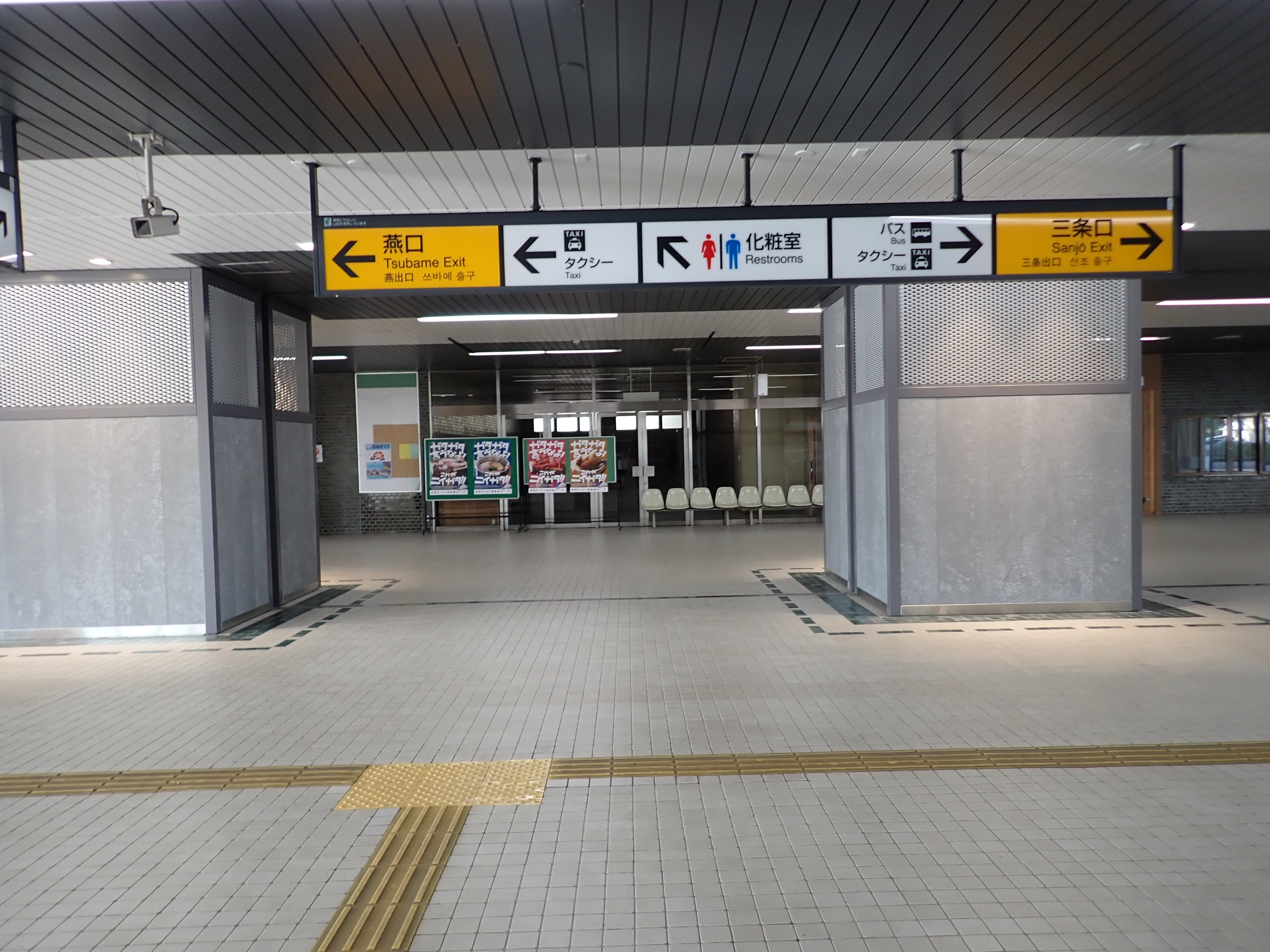 弥彦線と交差するところにある駅で、燕市と三条市の間に作られました。駅長室があるところが三条市なので、所在地は三条市となっています。それぞれの出入口も「燕口」「三条口」となっていて、規模等に差が出ないようになっていることがよく分かります。