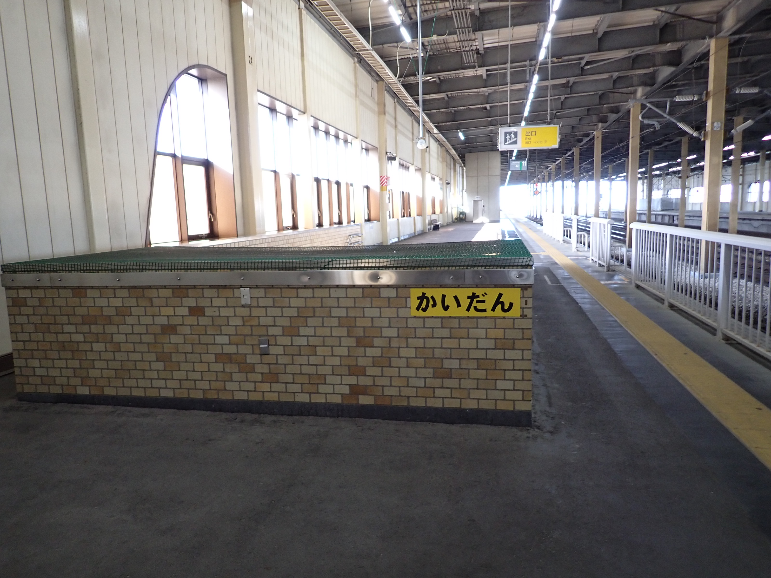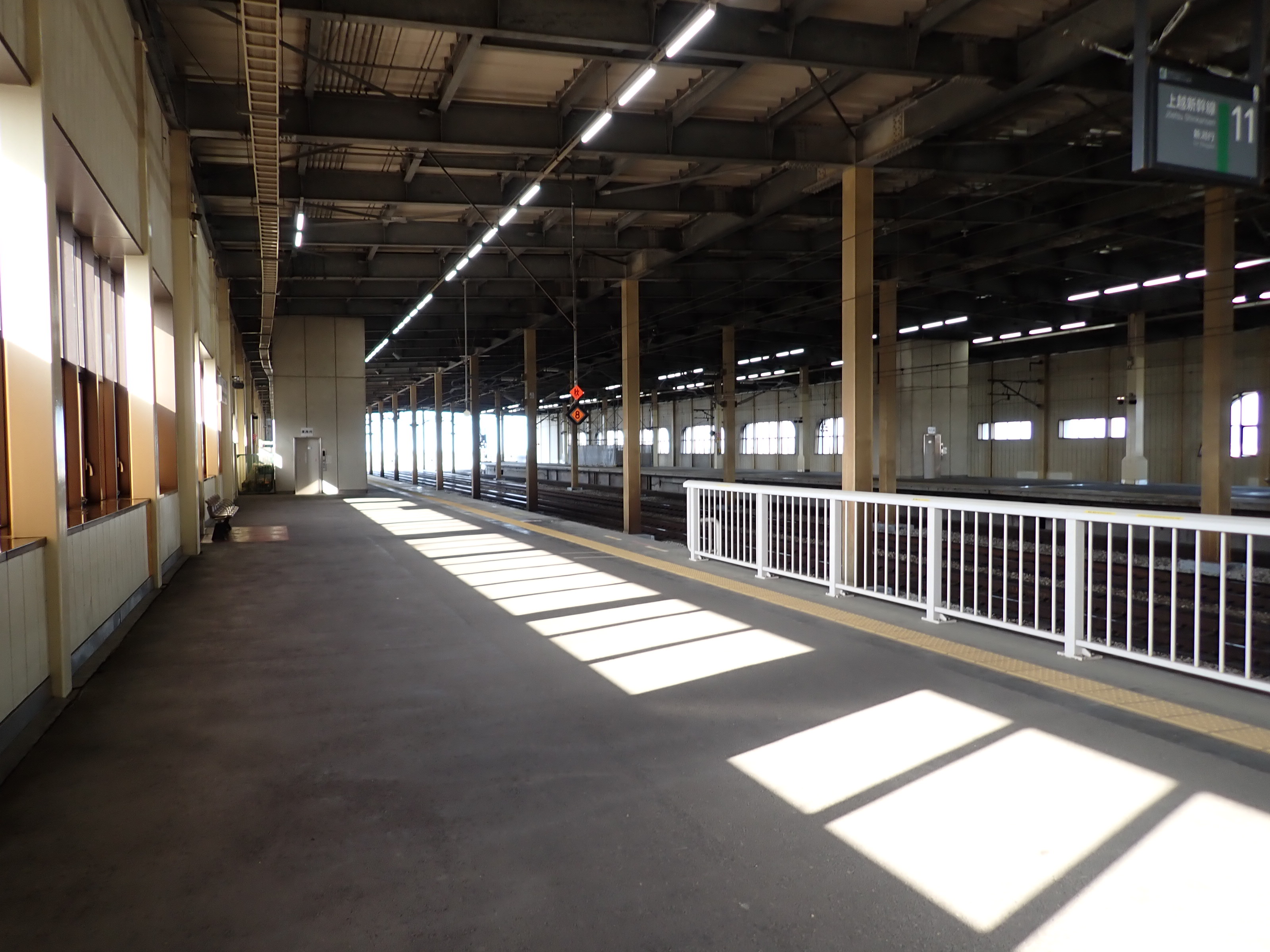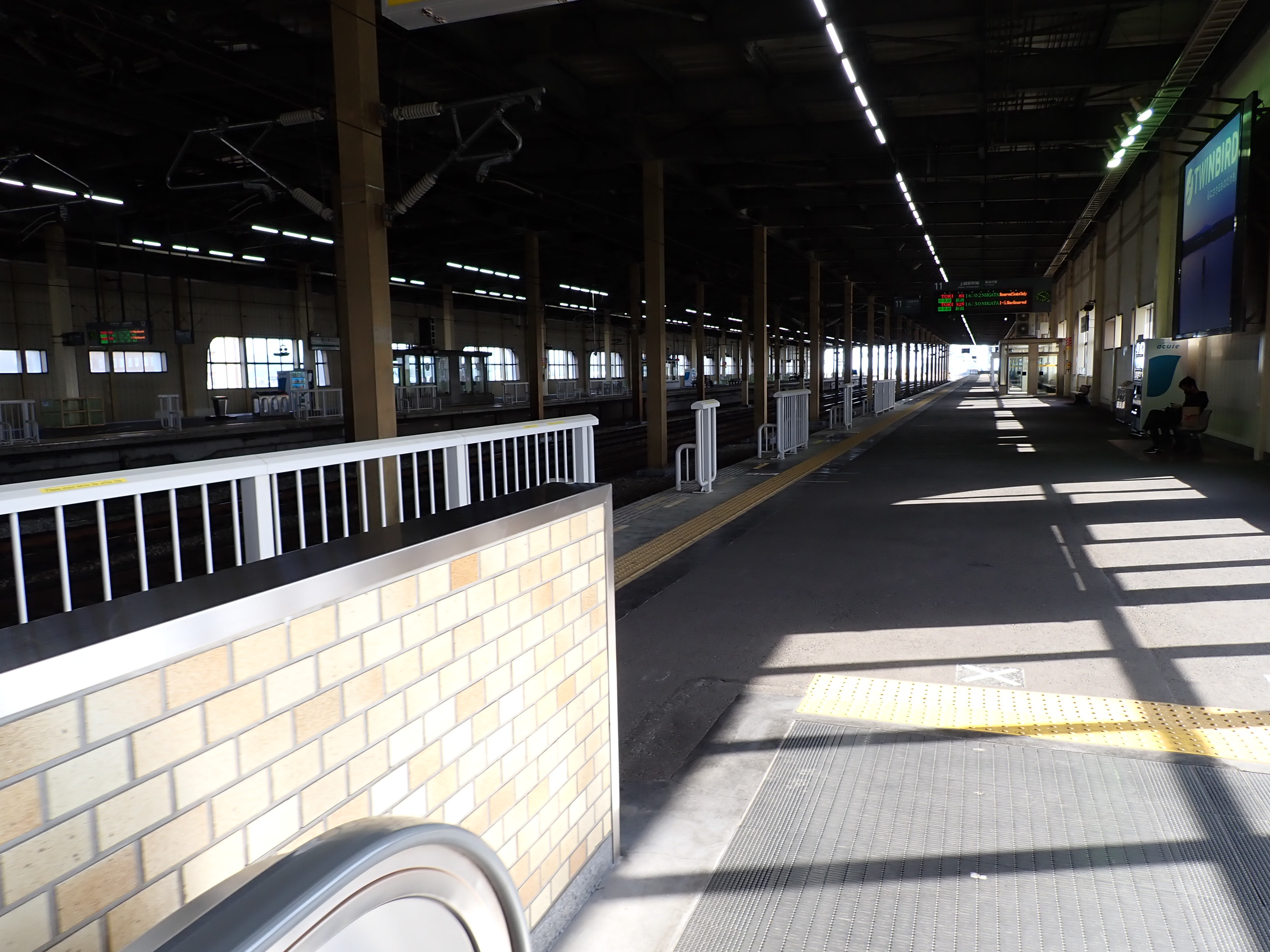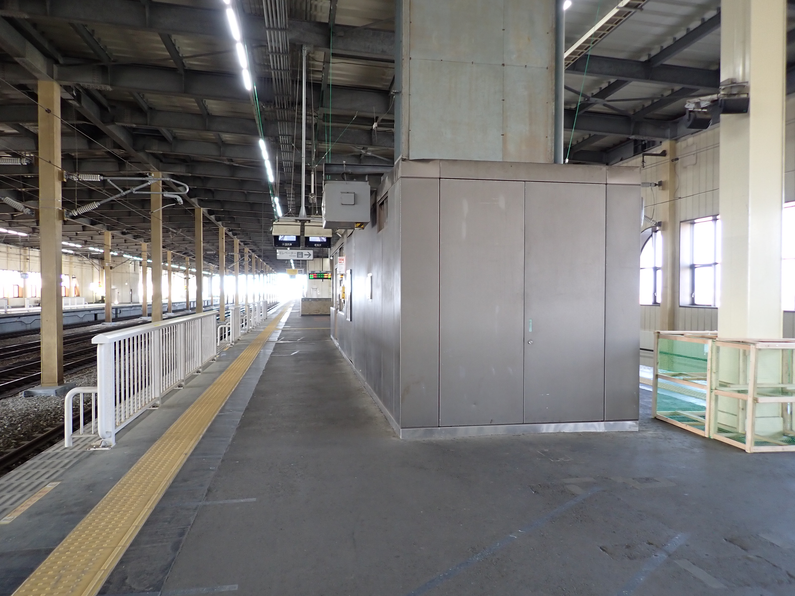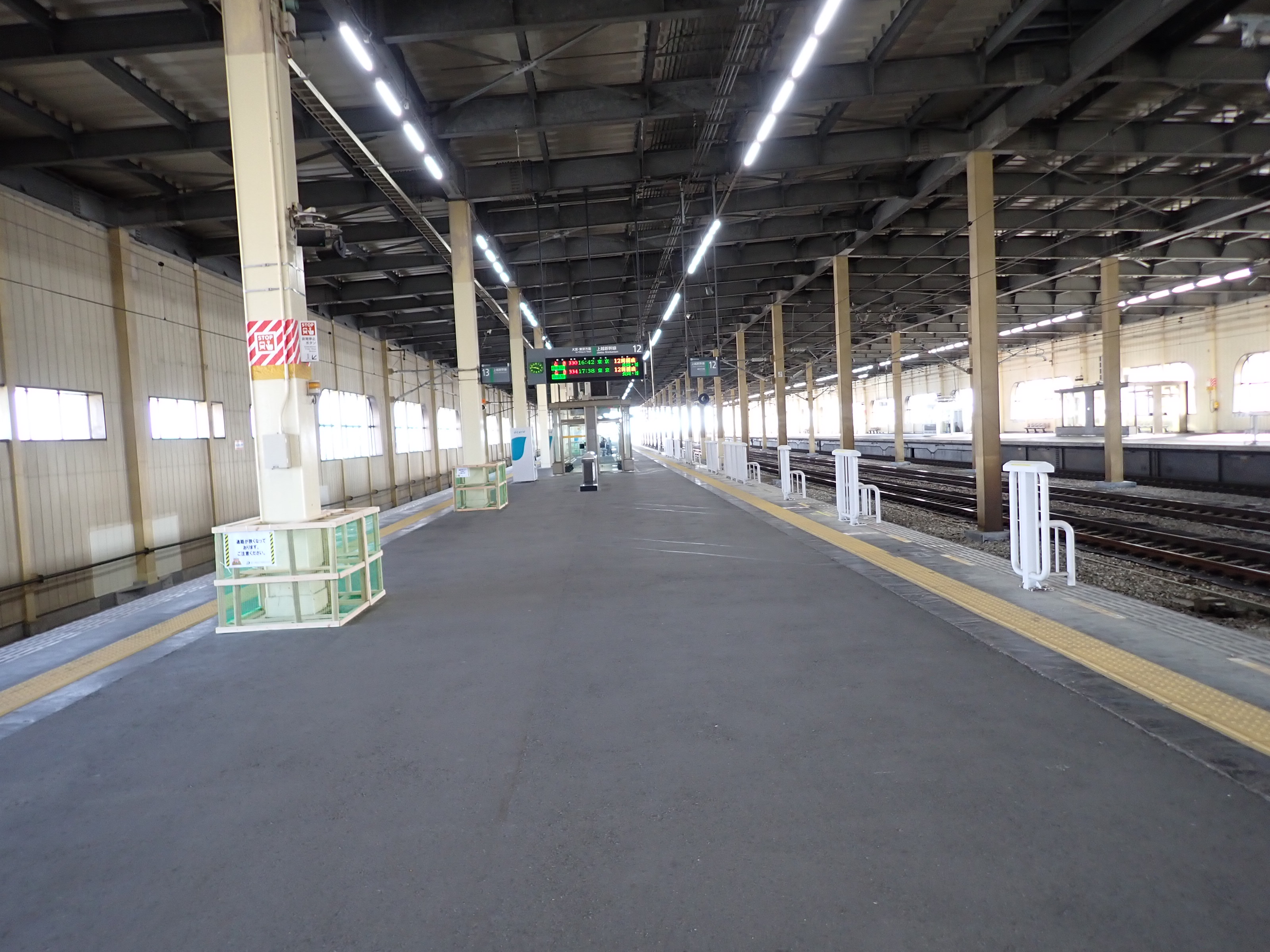 ホームの新潟駅側。現在、12両編成の列車が停車しない範囲。一部囲いがされています。