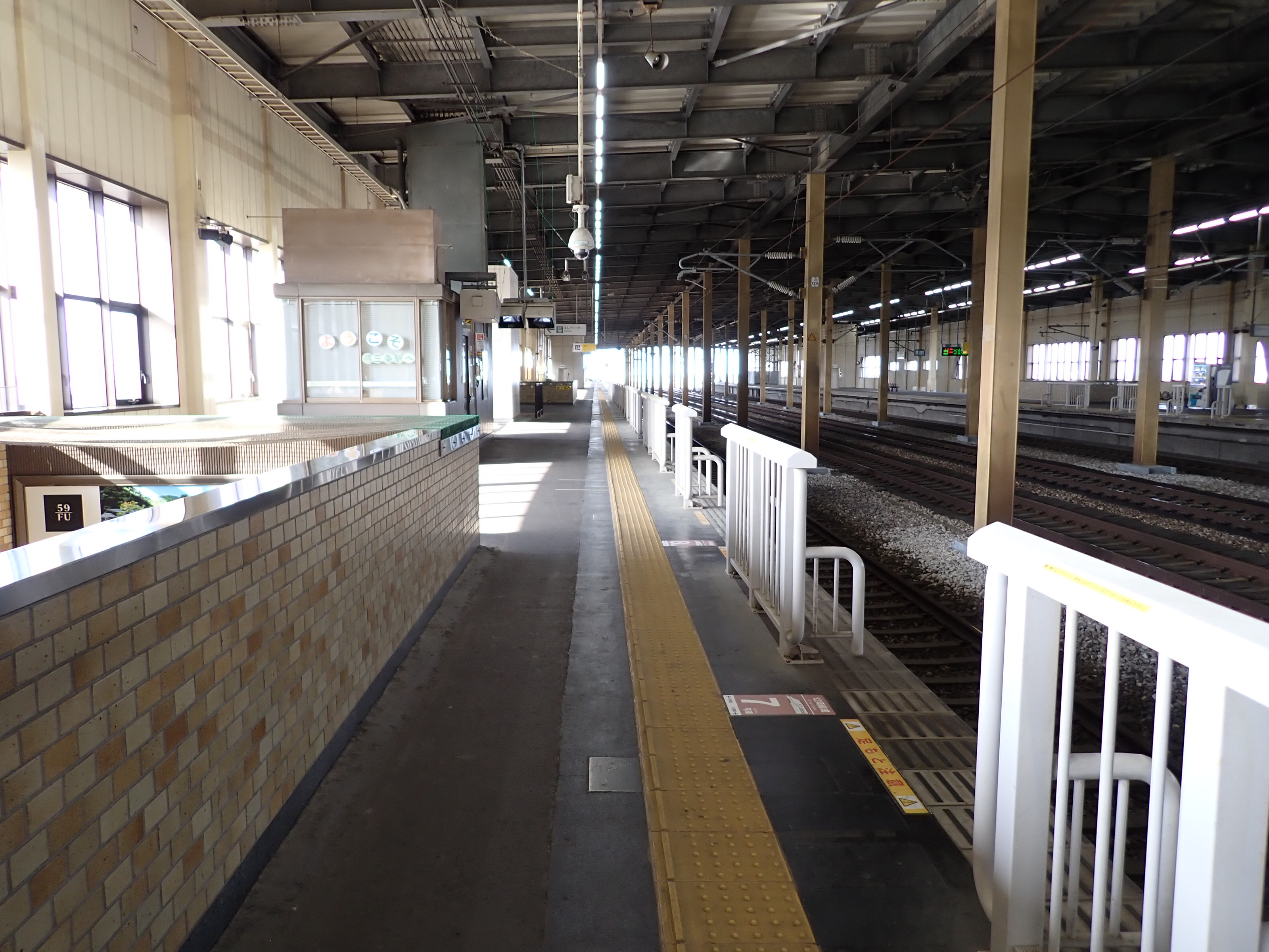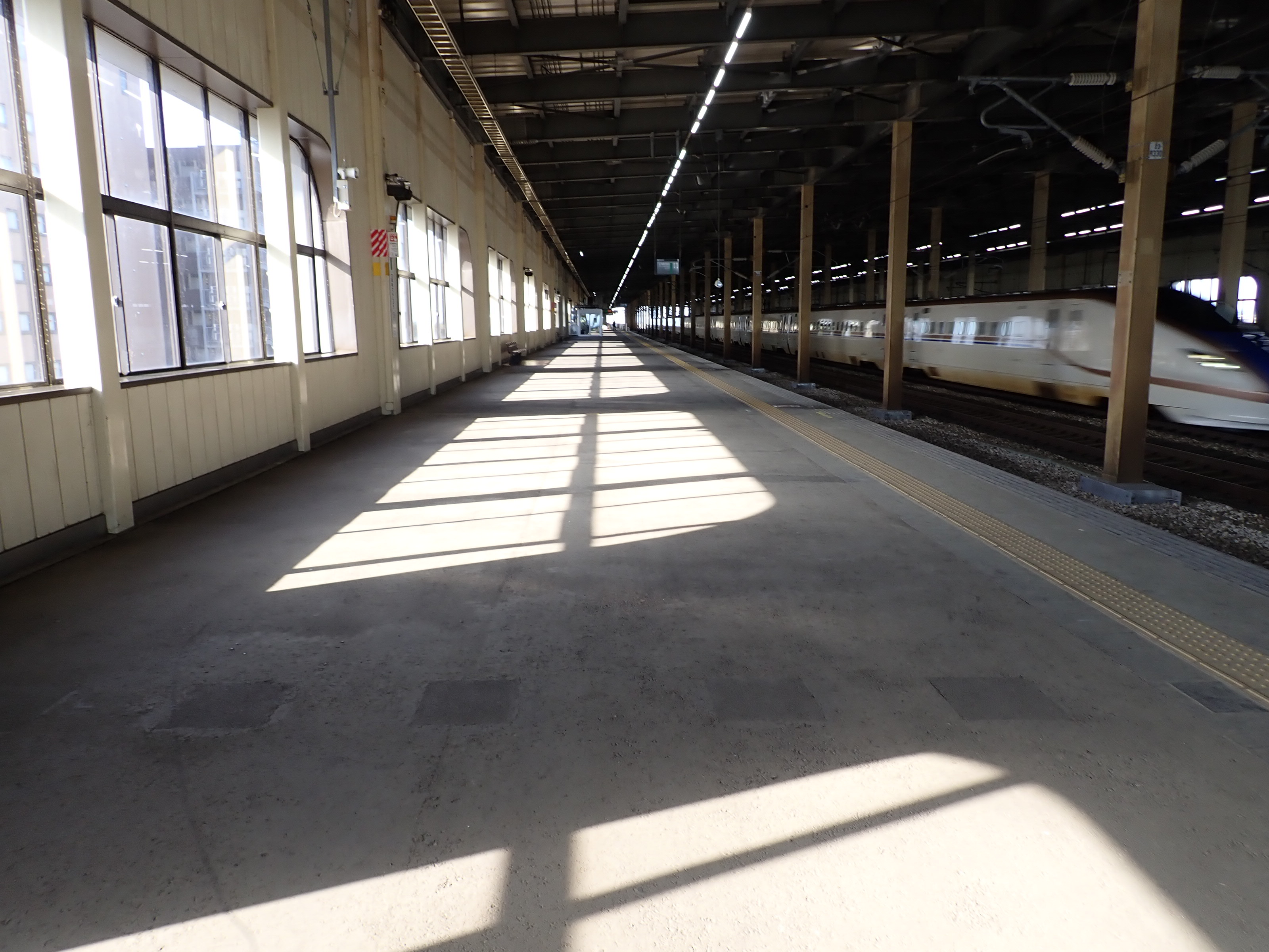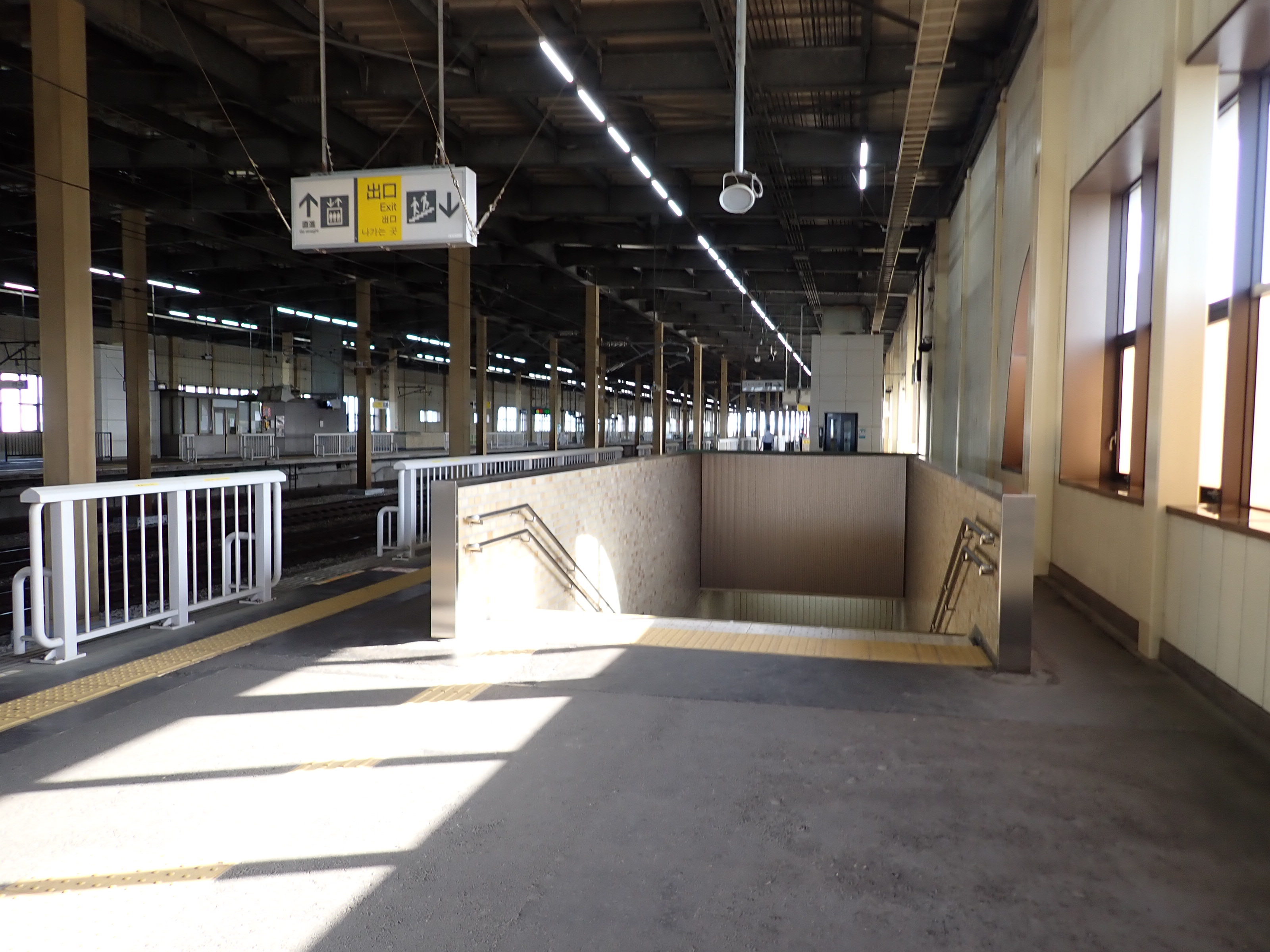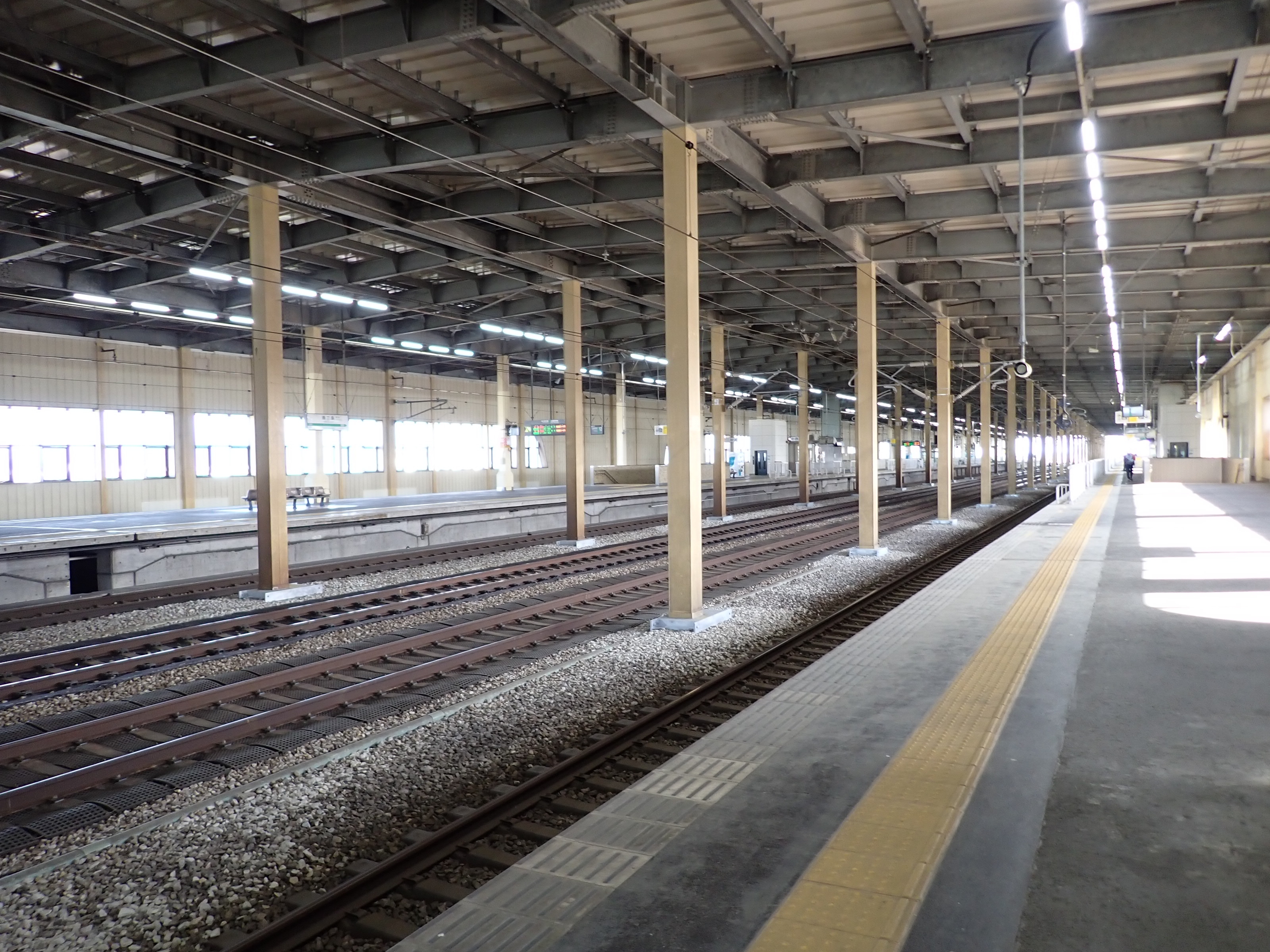 ホームの新潟駅側。現在、12両編成の列車が停車しない範囲。一部囲いがされています。