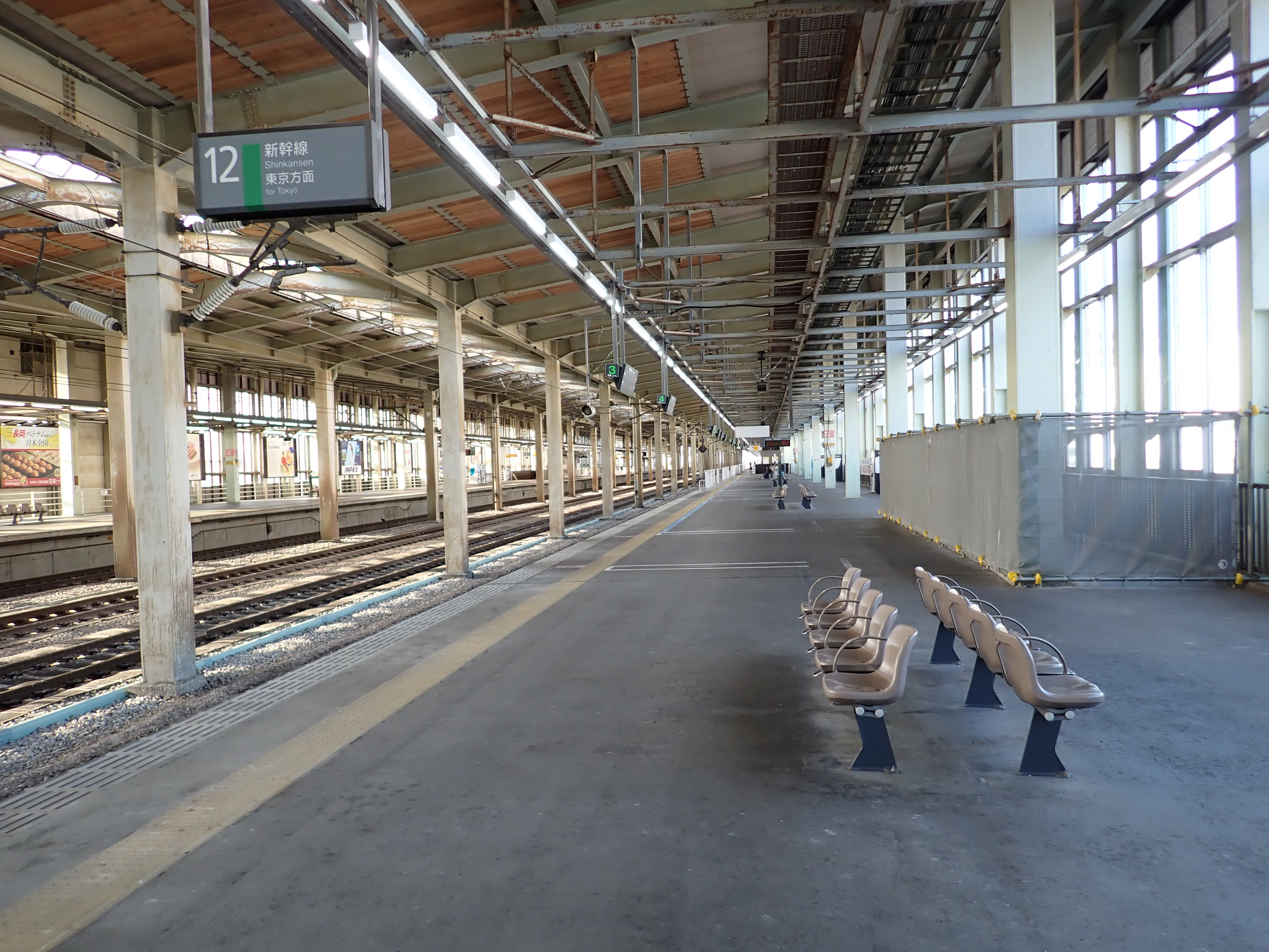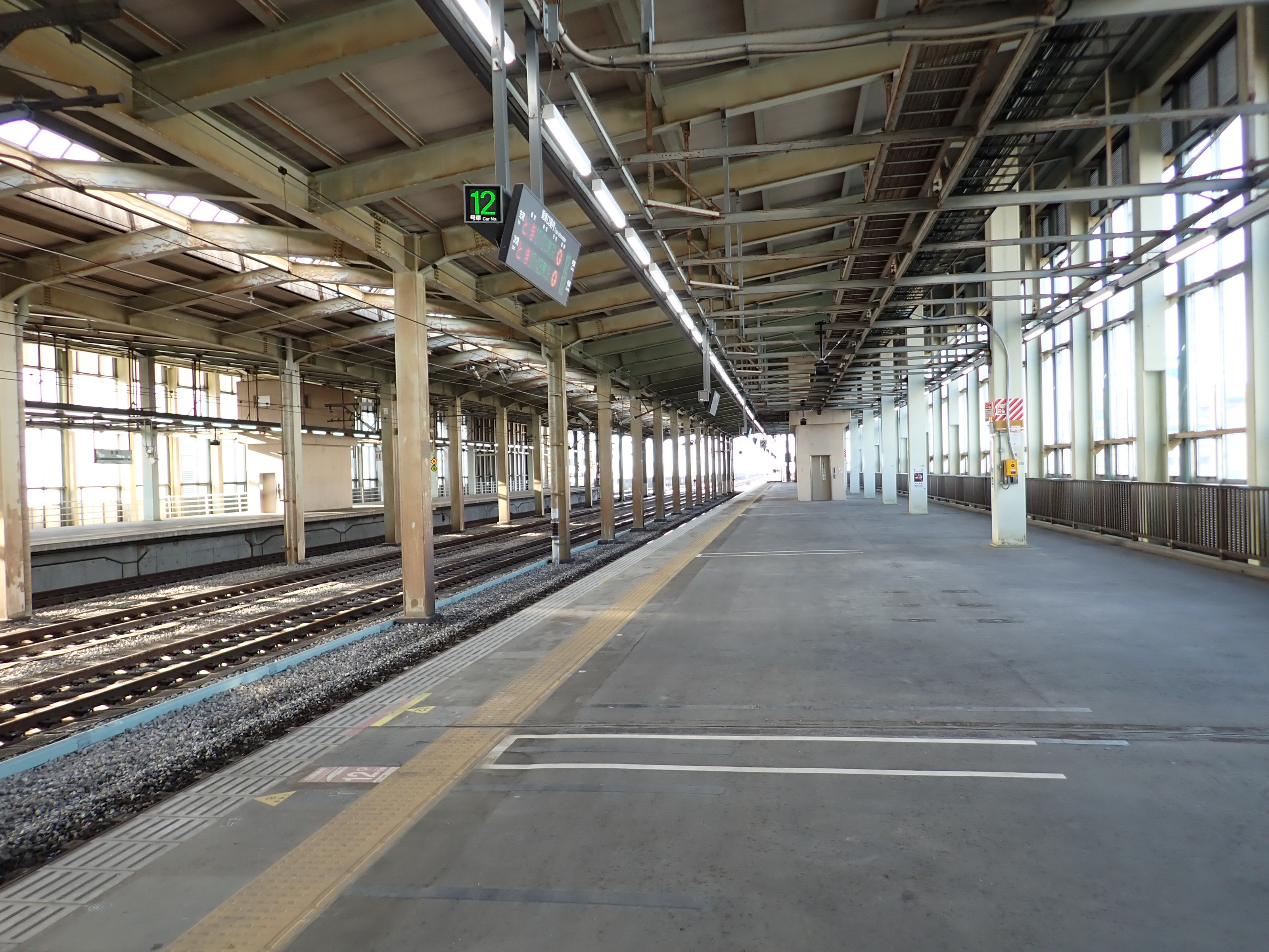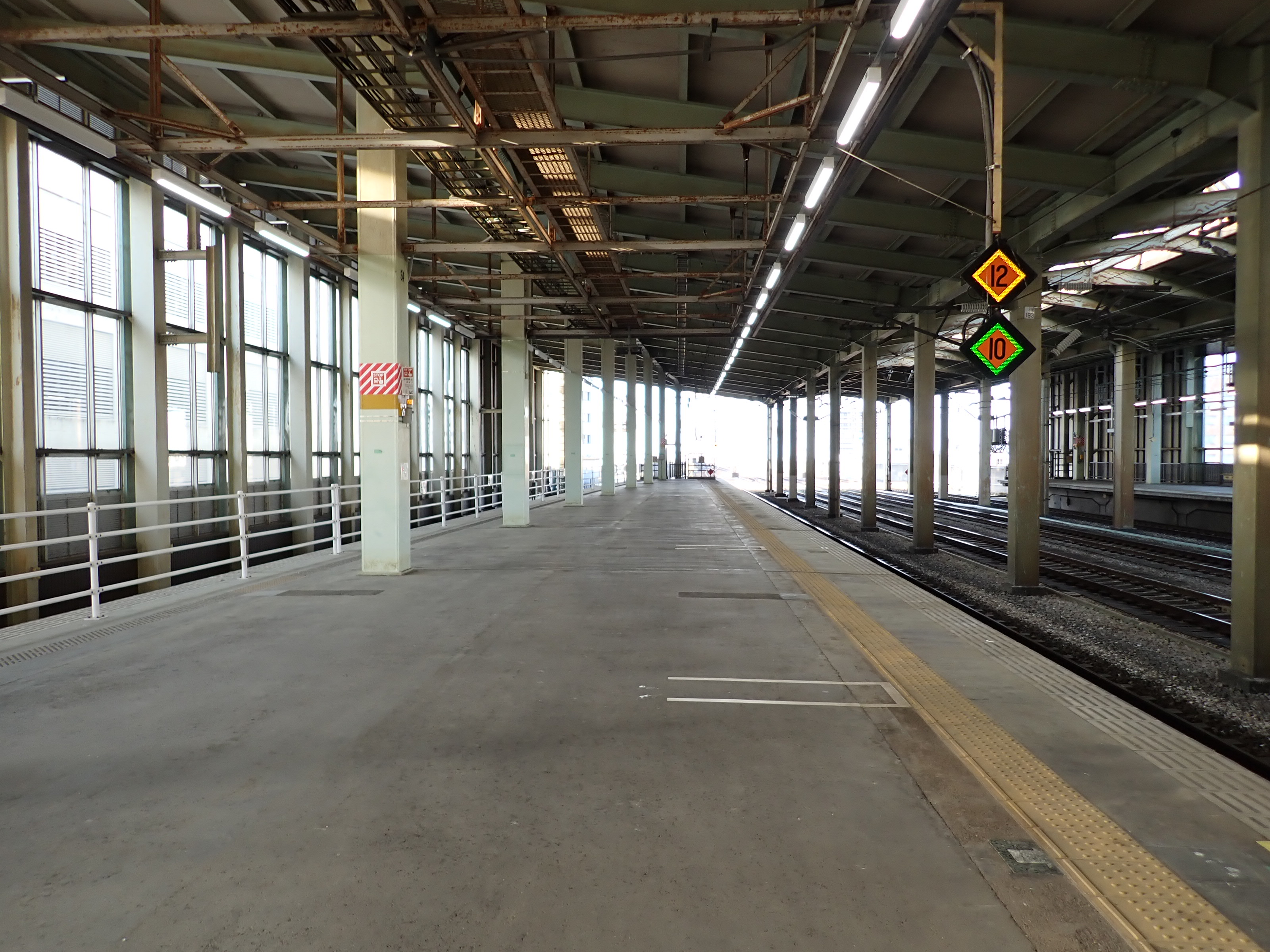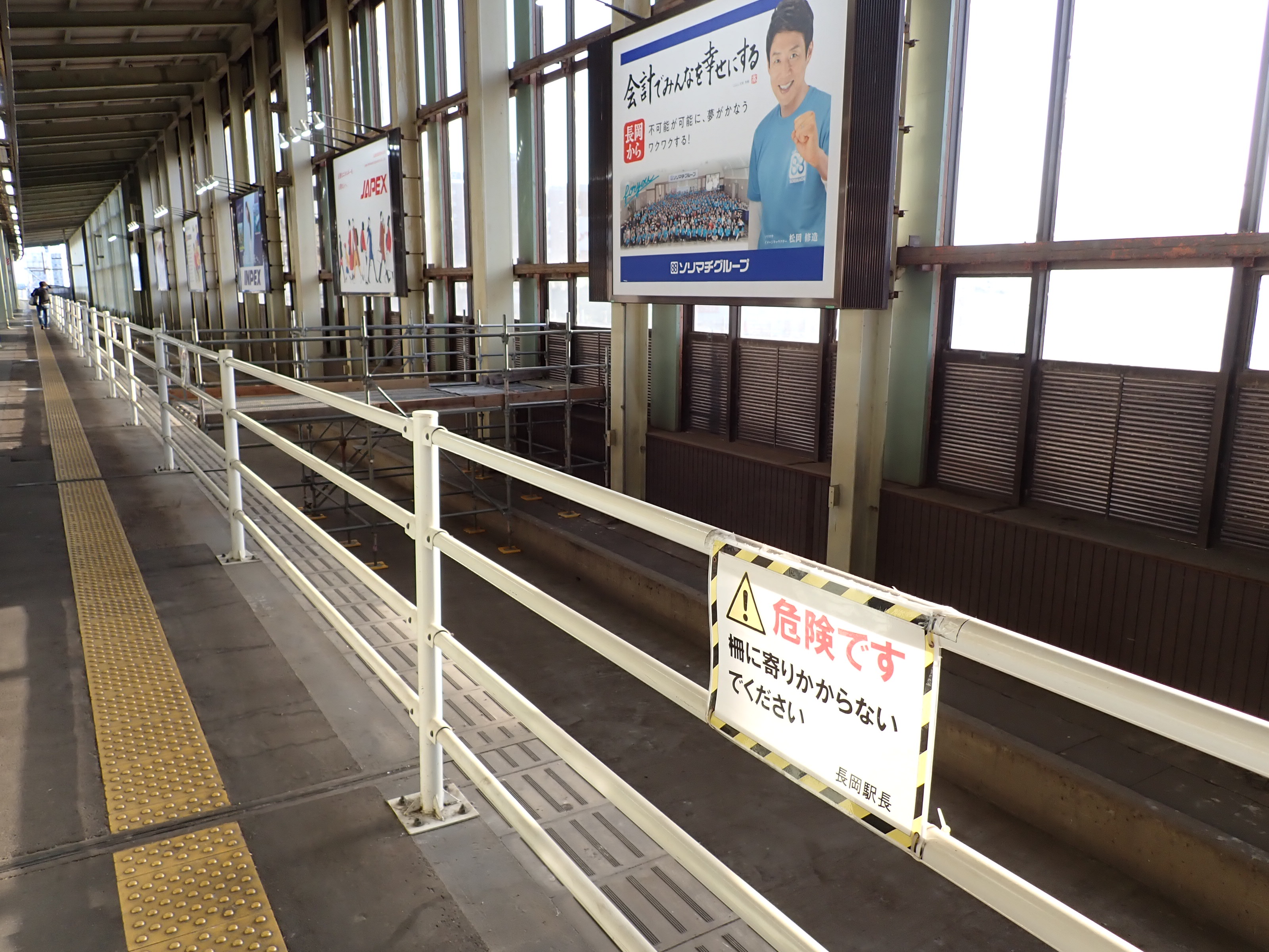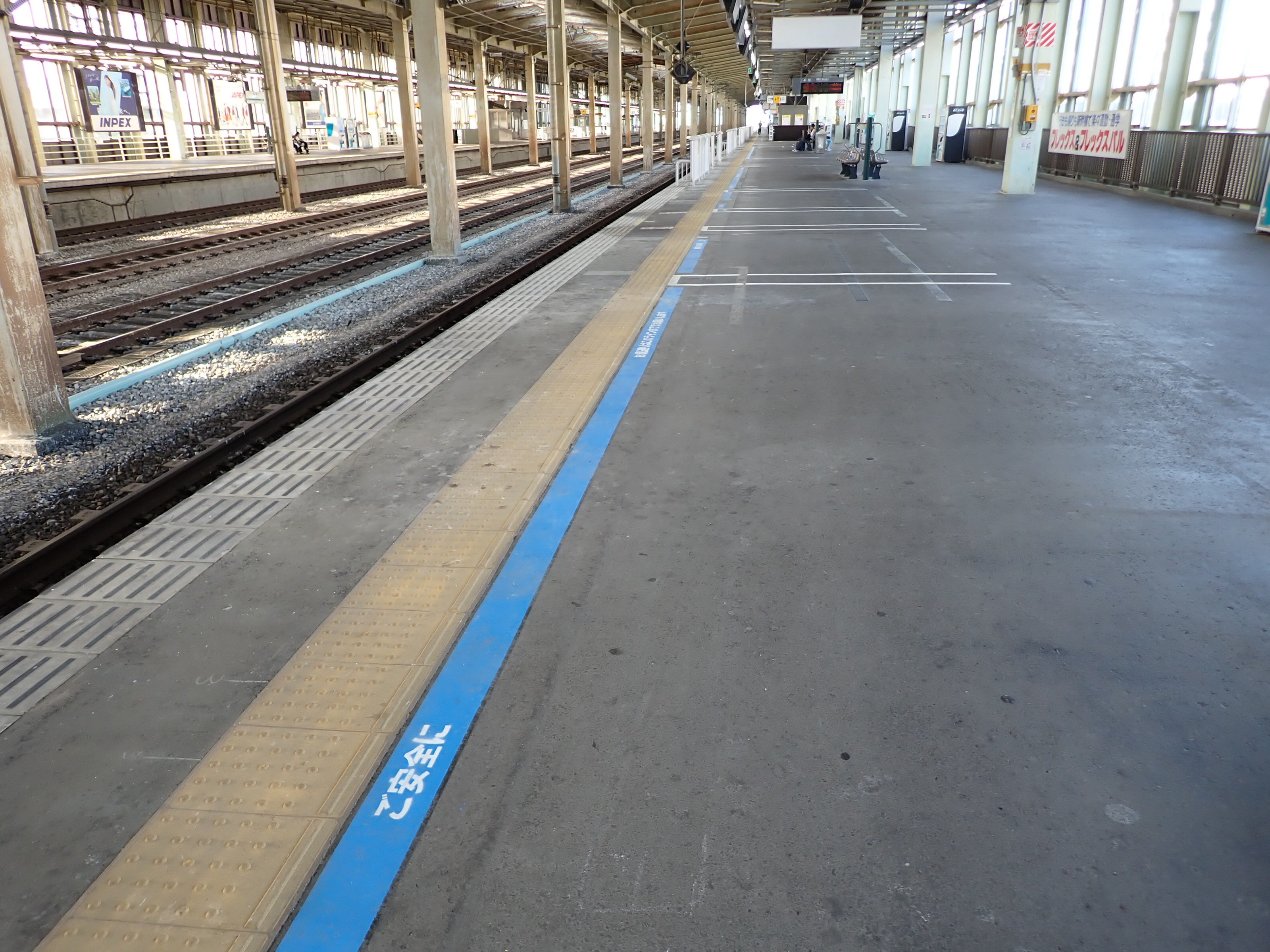 12番線の燕三条駅側。このあたりは12両編成に固定されてから乗車位置ではなくなっています。