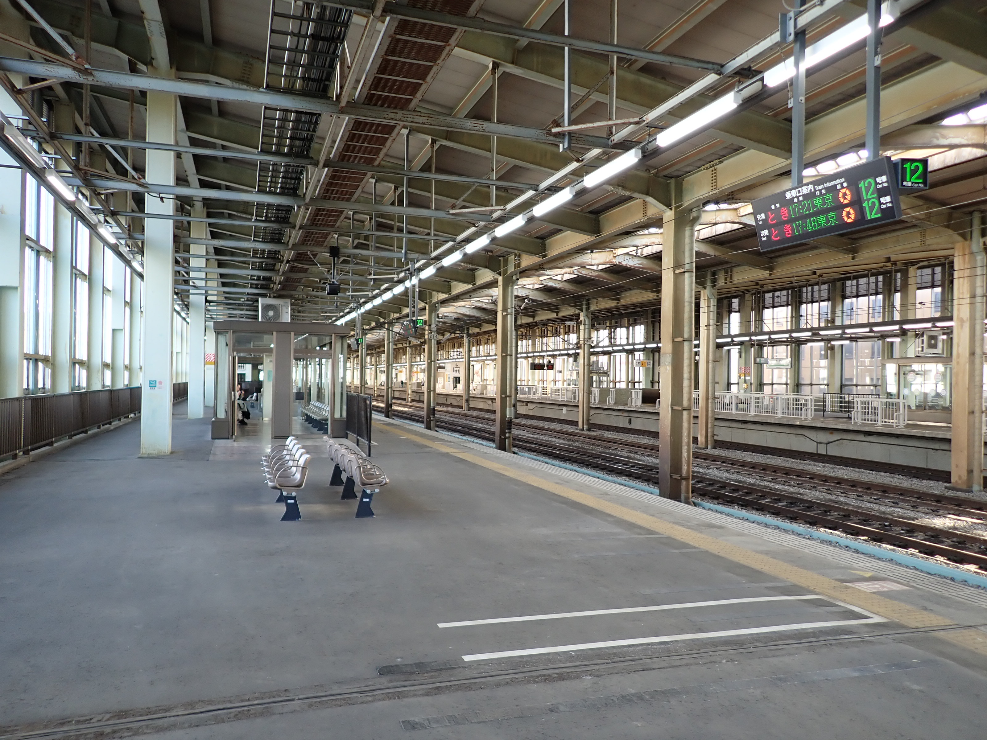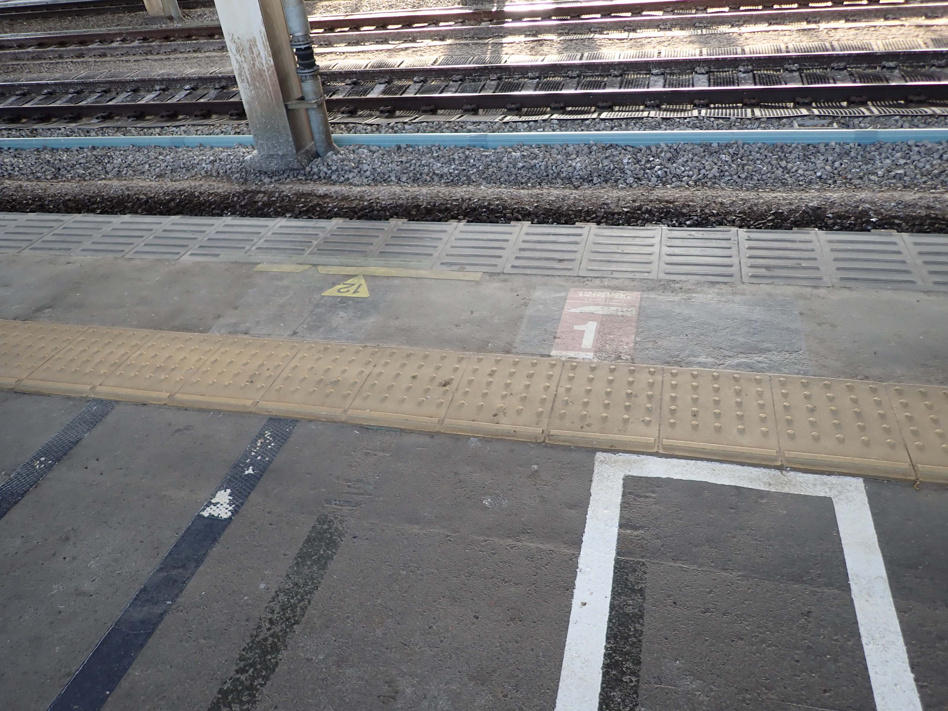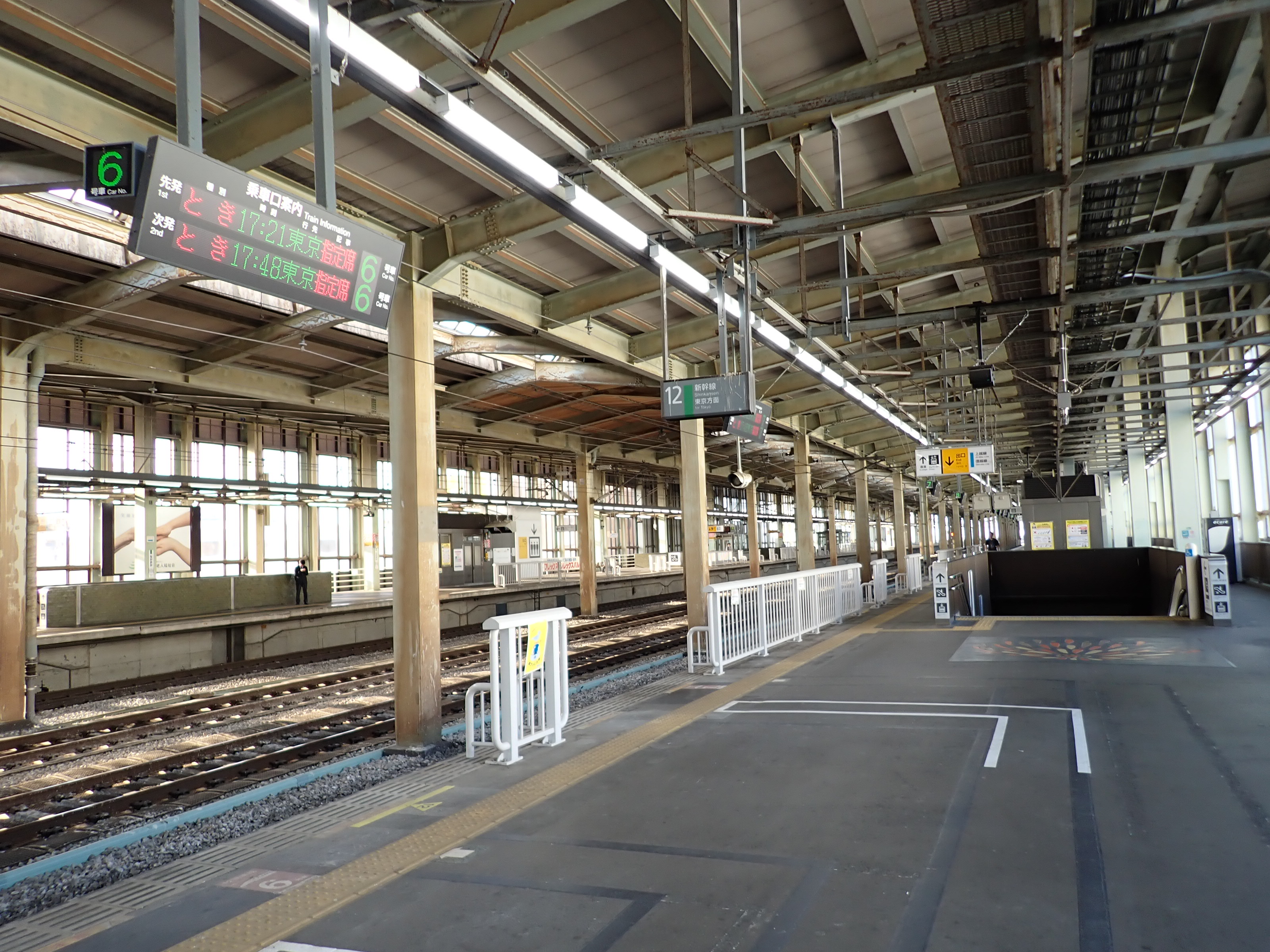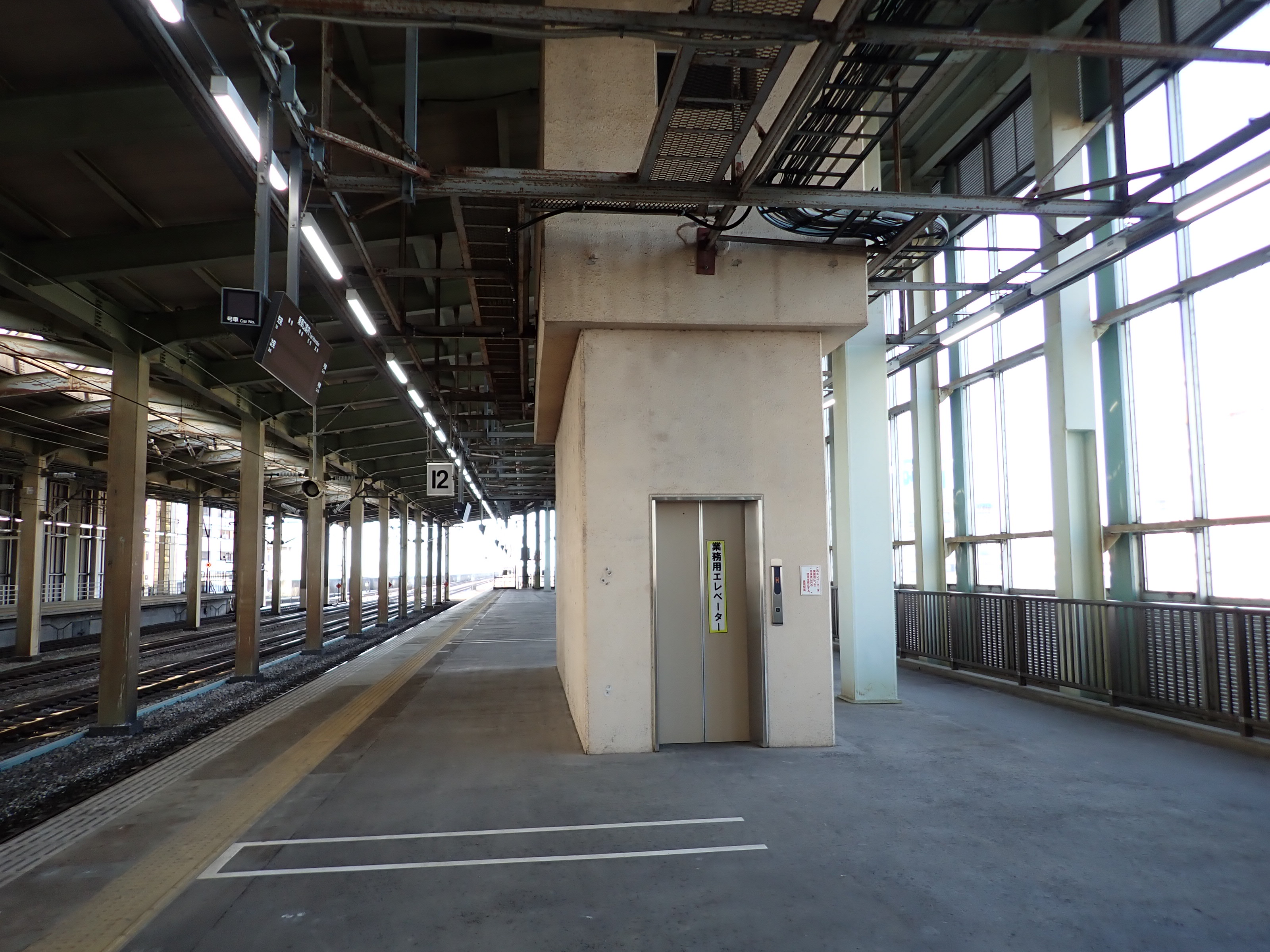 12番線の燕三条駅側。このあたりは12両編成に固定されてから乗車位置ではなくなっています。