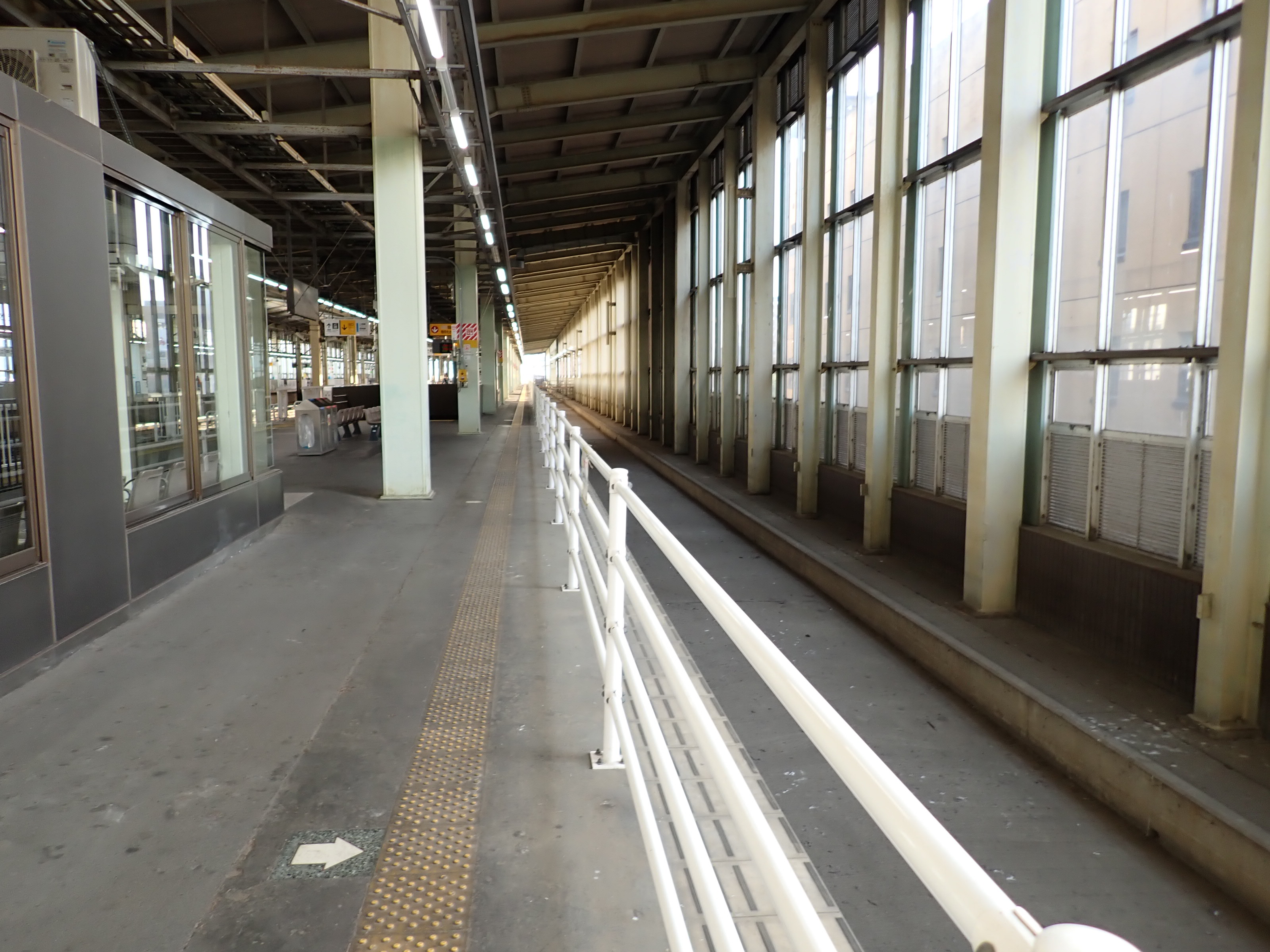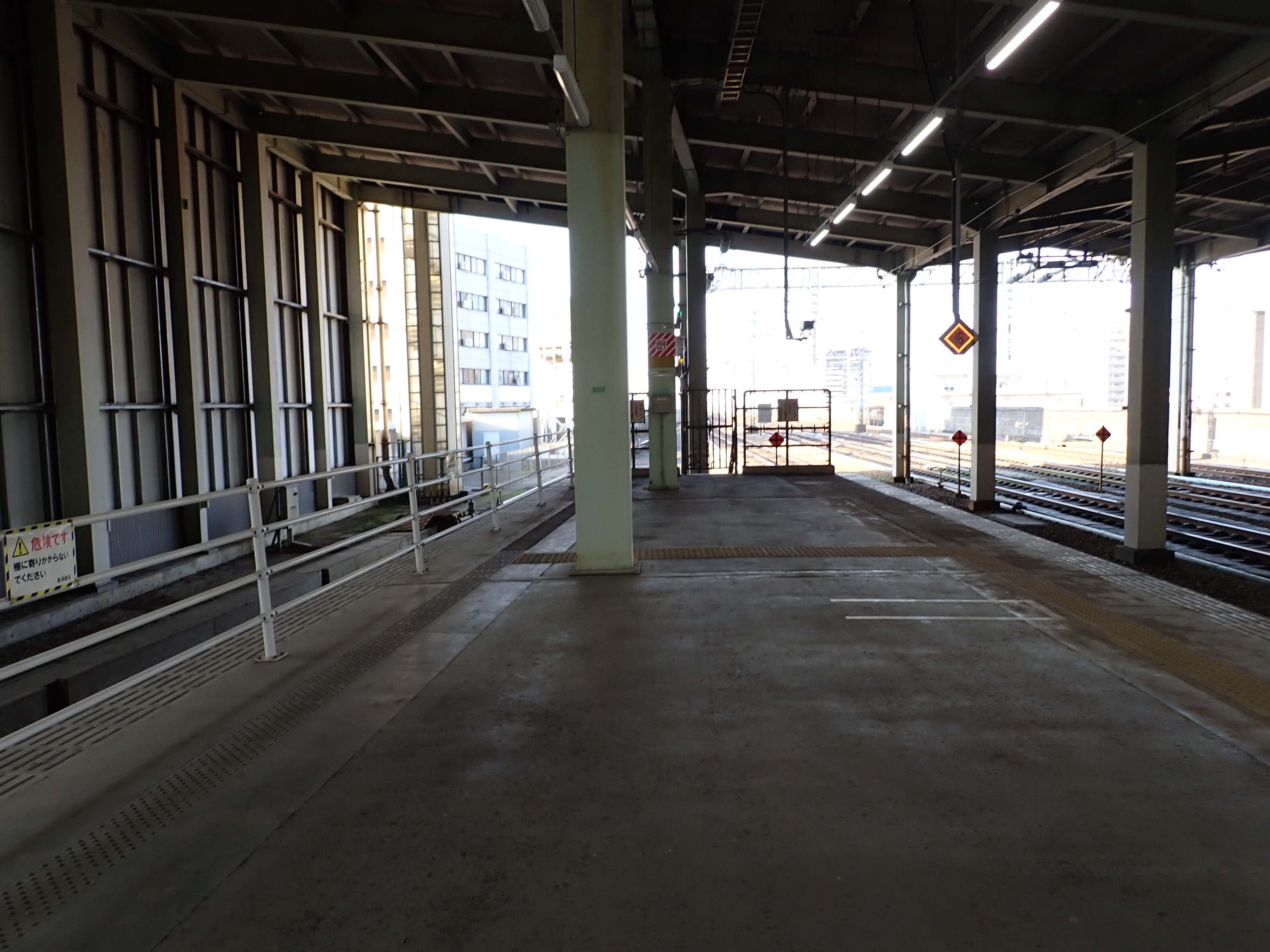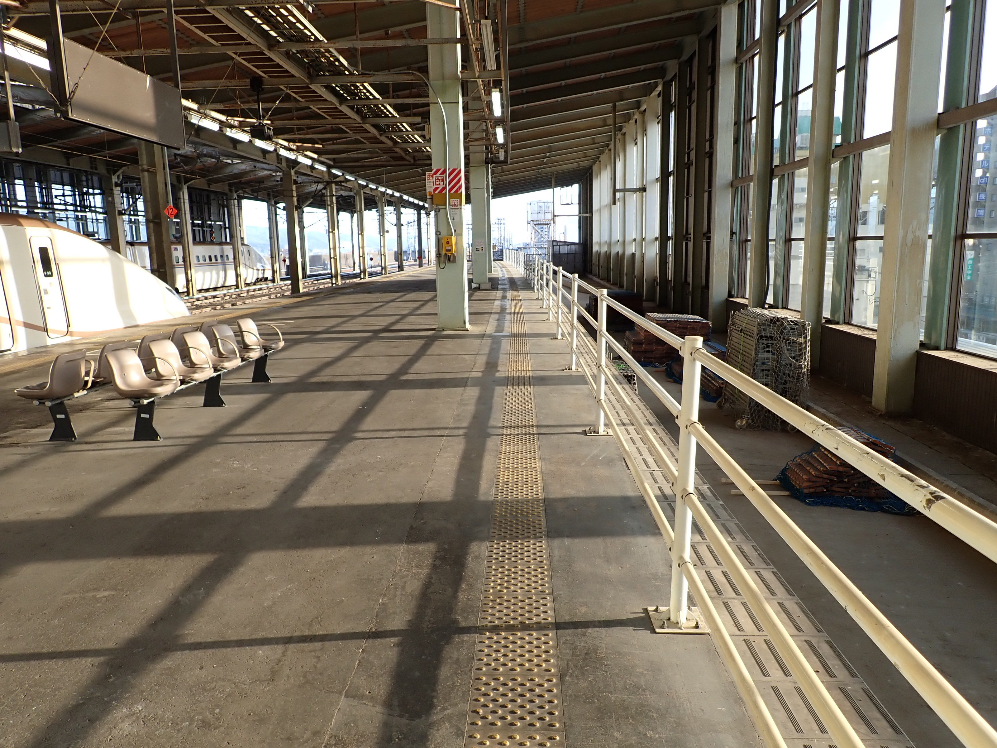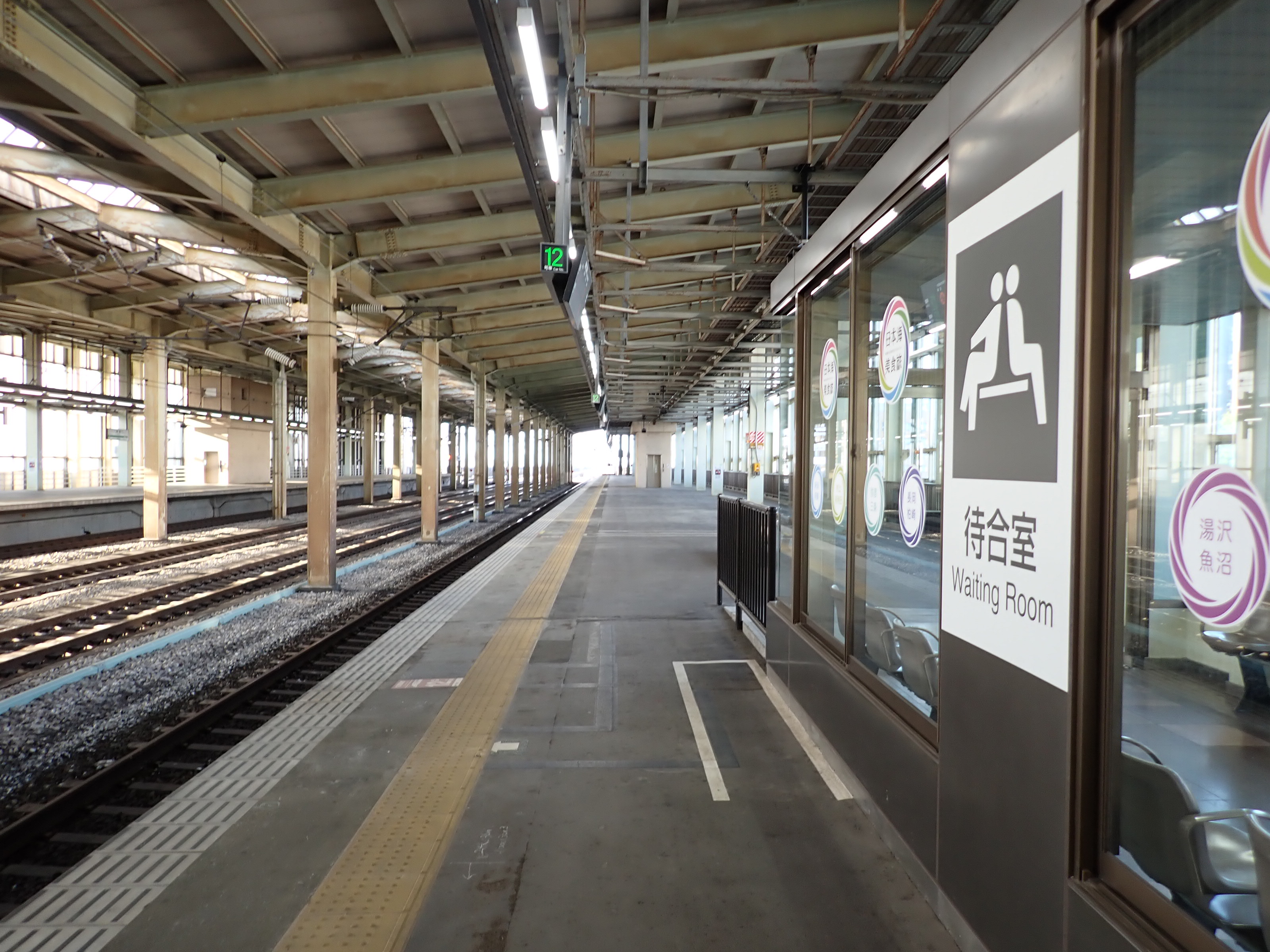 11番線の浦佐駅側。先端の方のホームが壁から少し離れています。