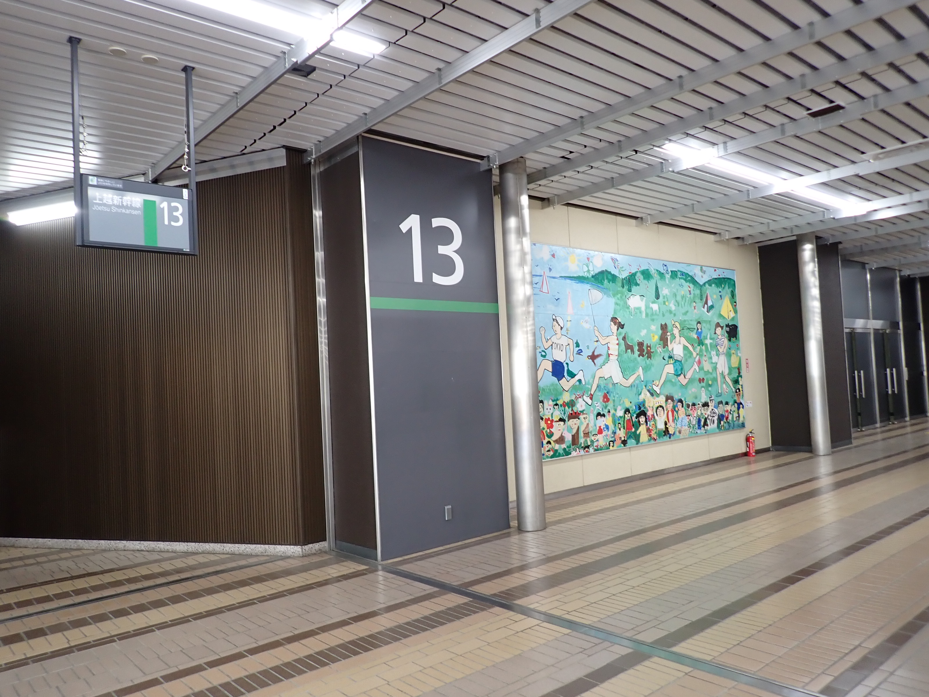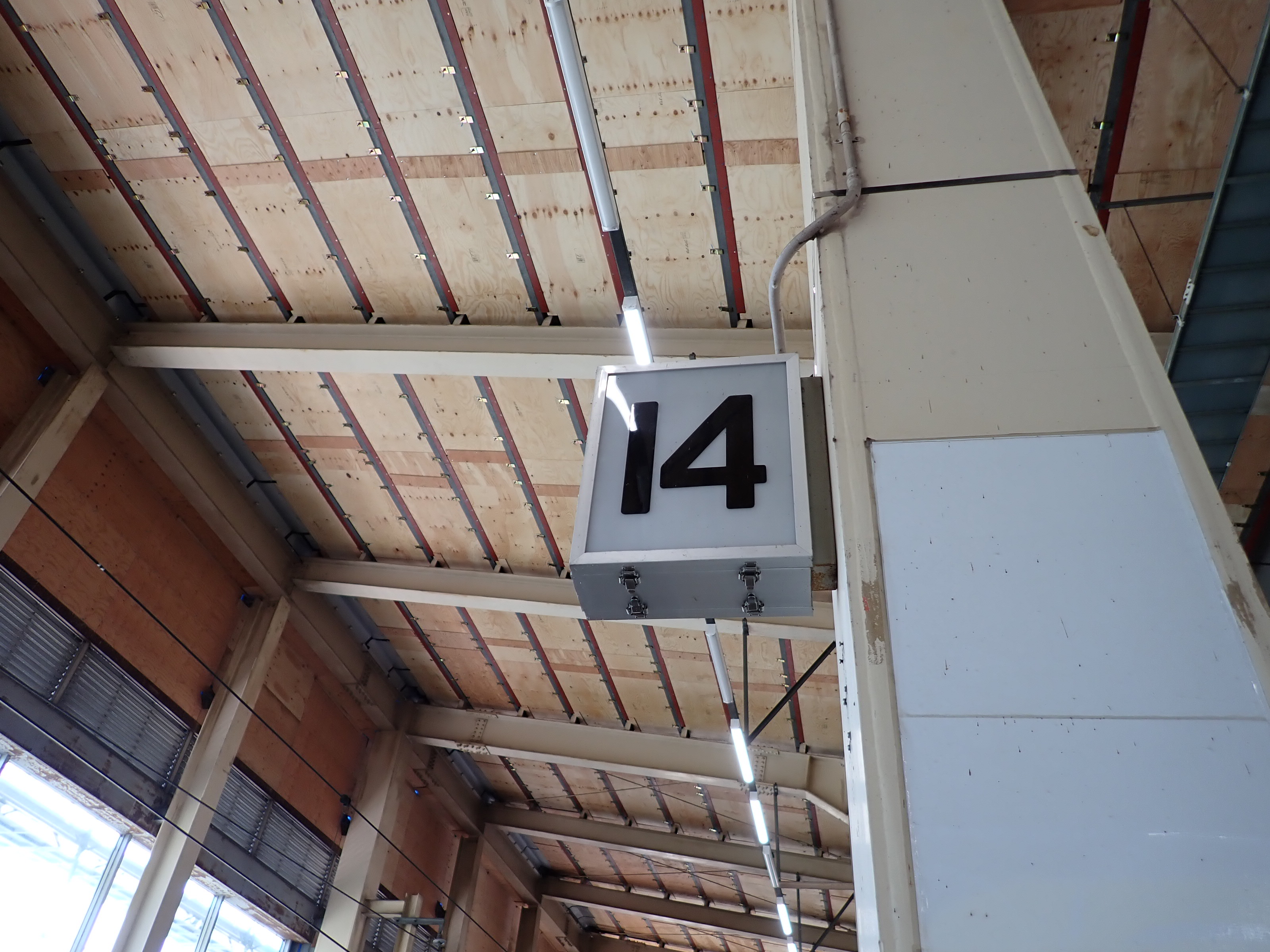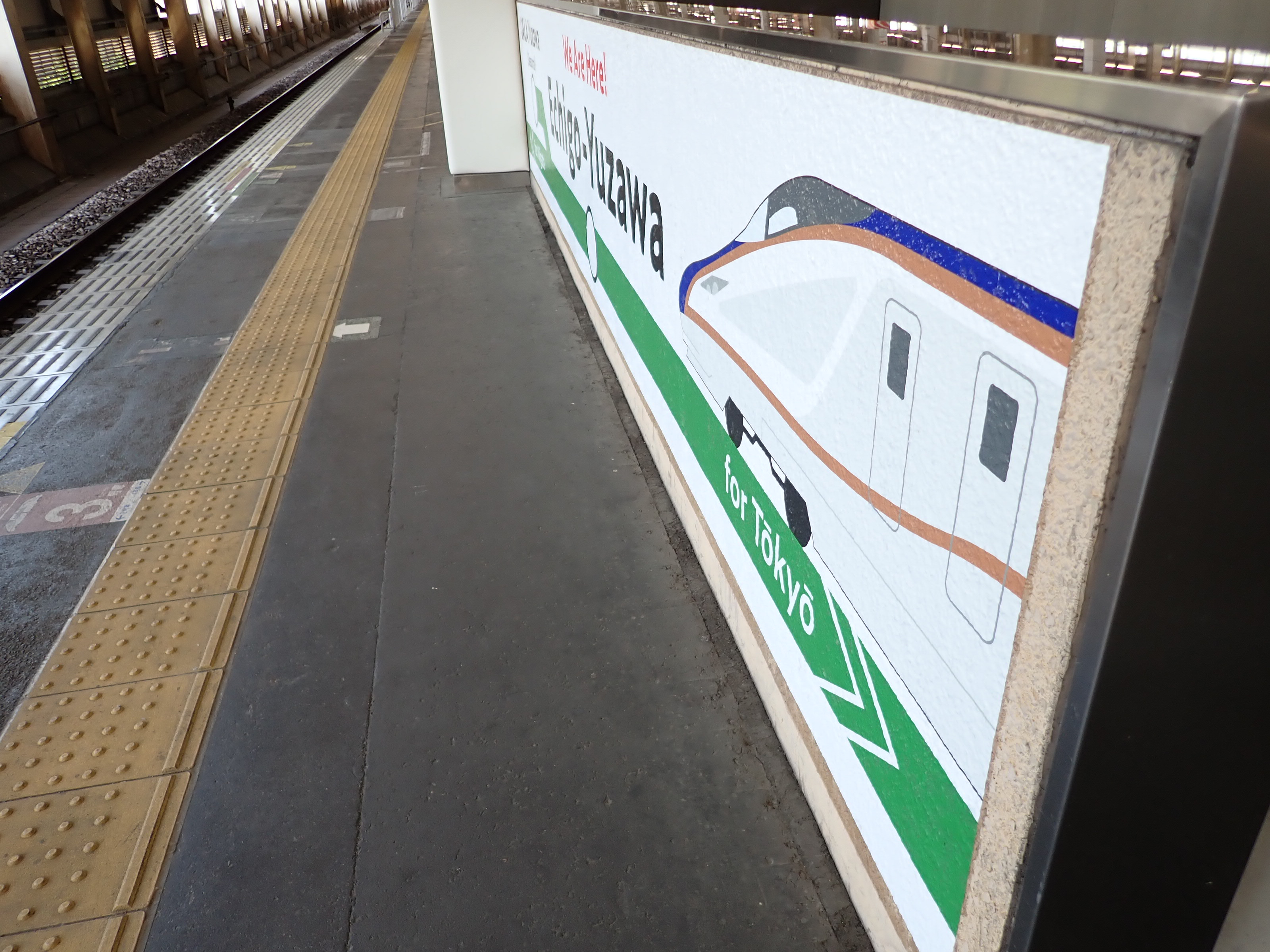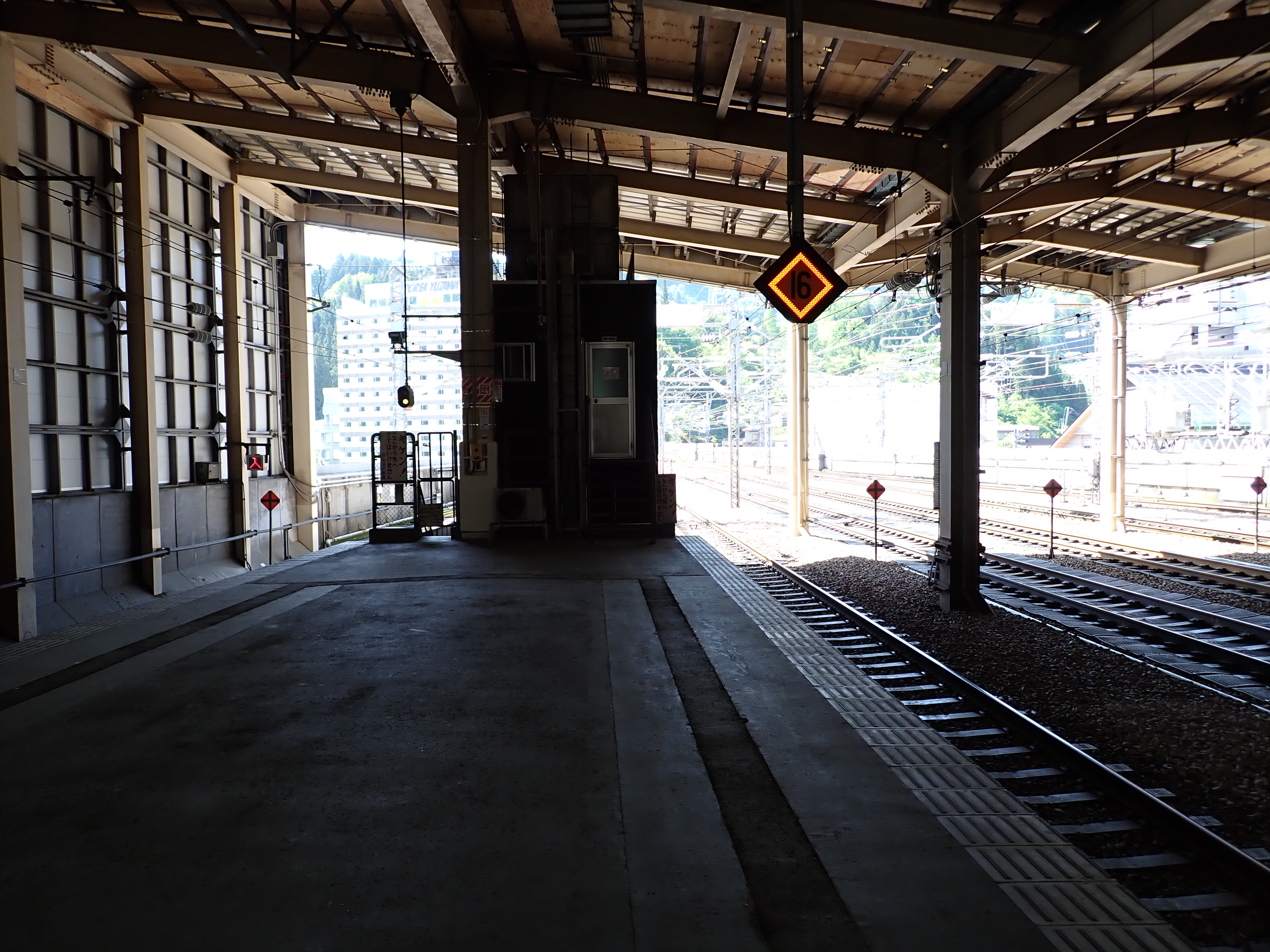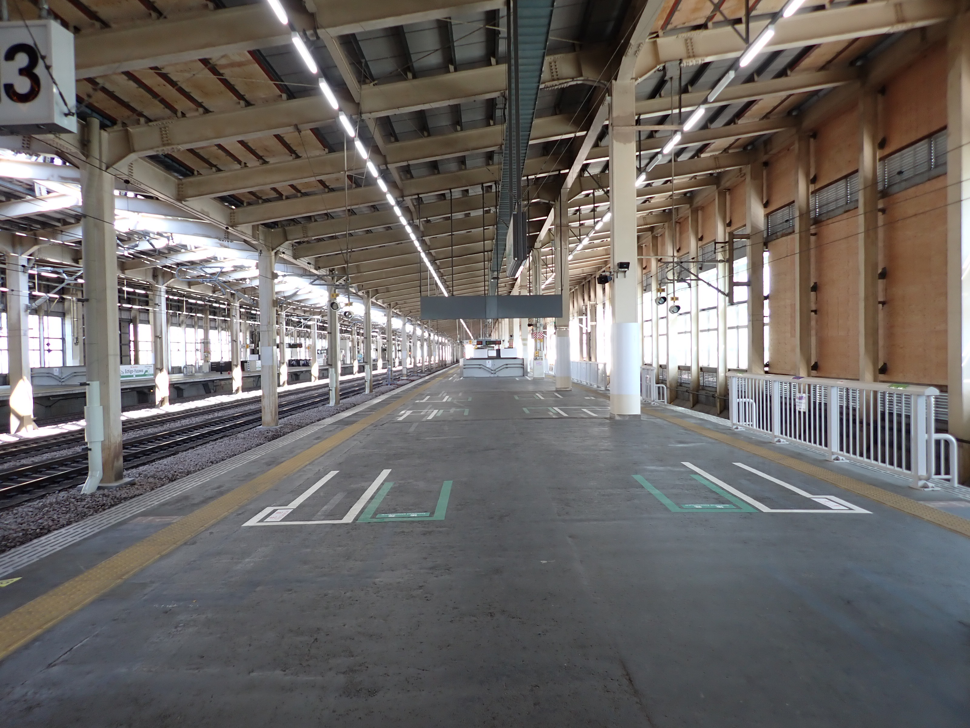 13・14番線の上毛高原駅側。この駅は両ホームに何台もこの番線標があります。