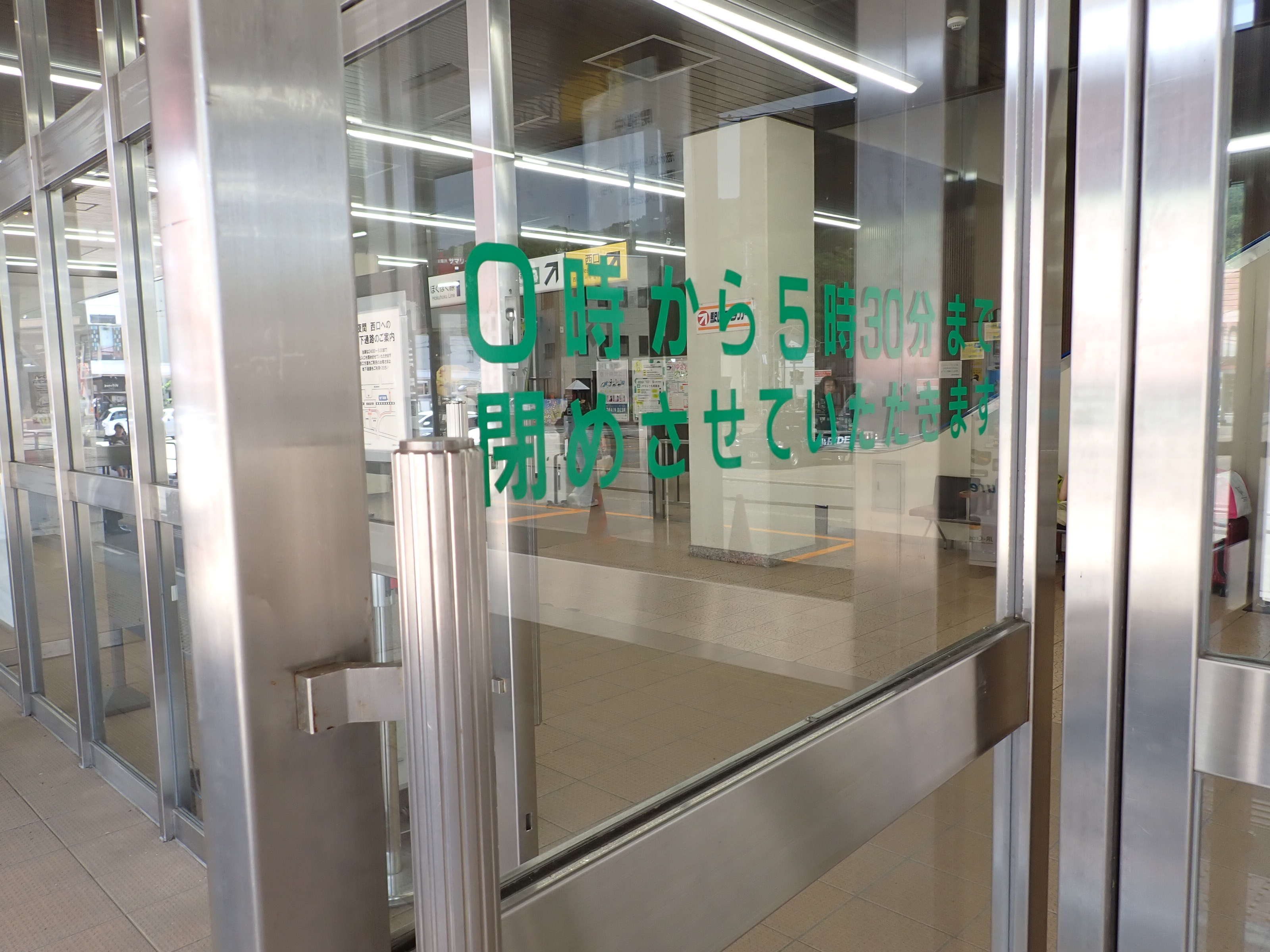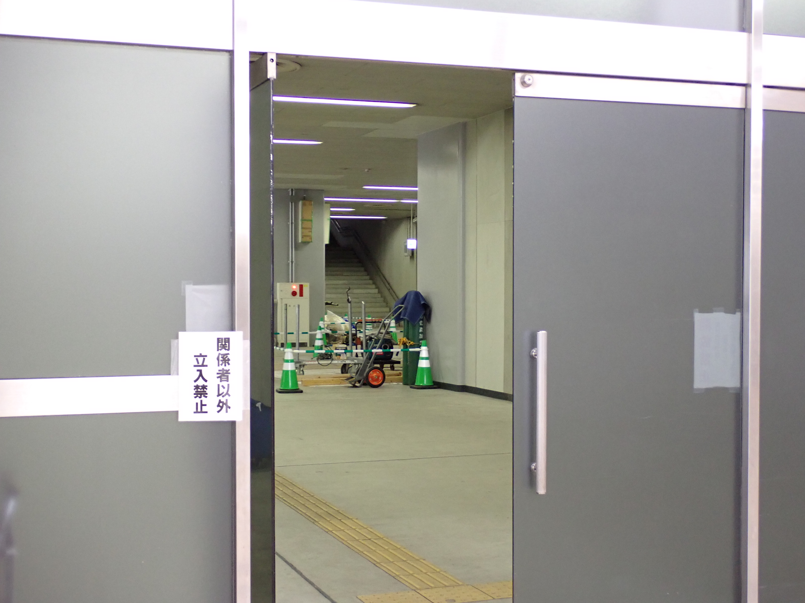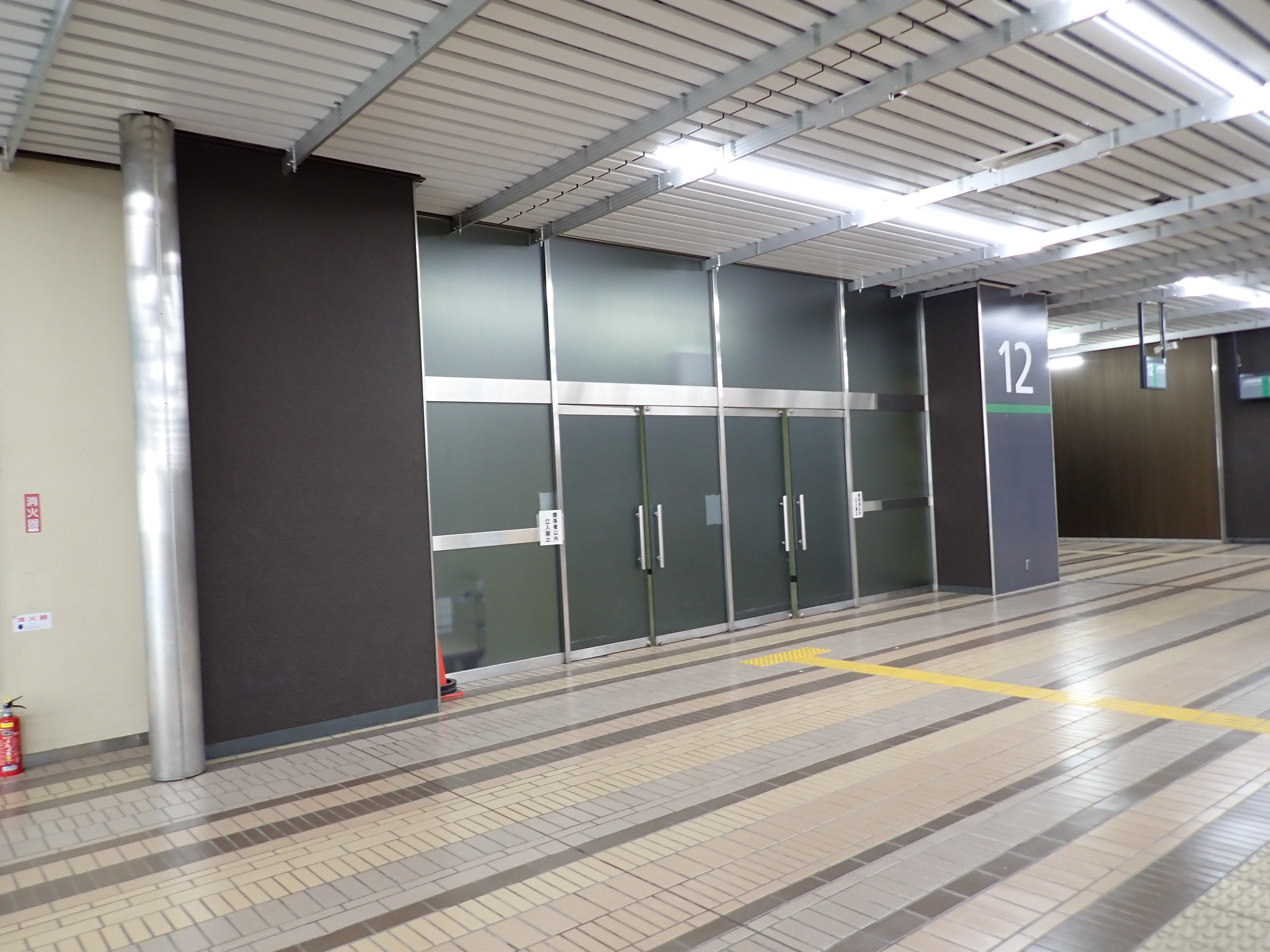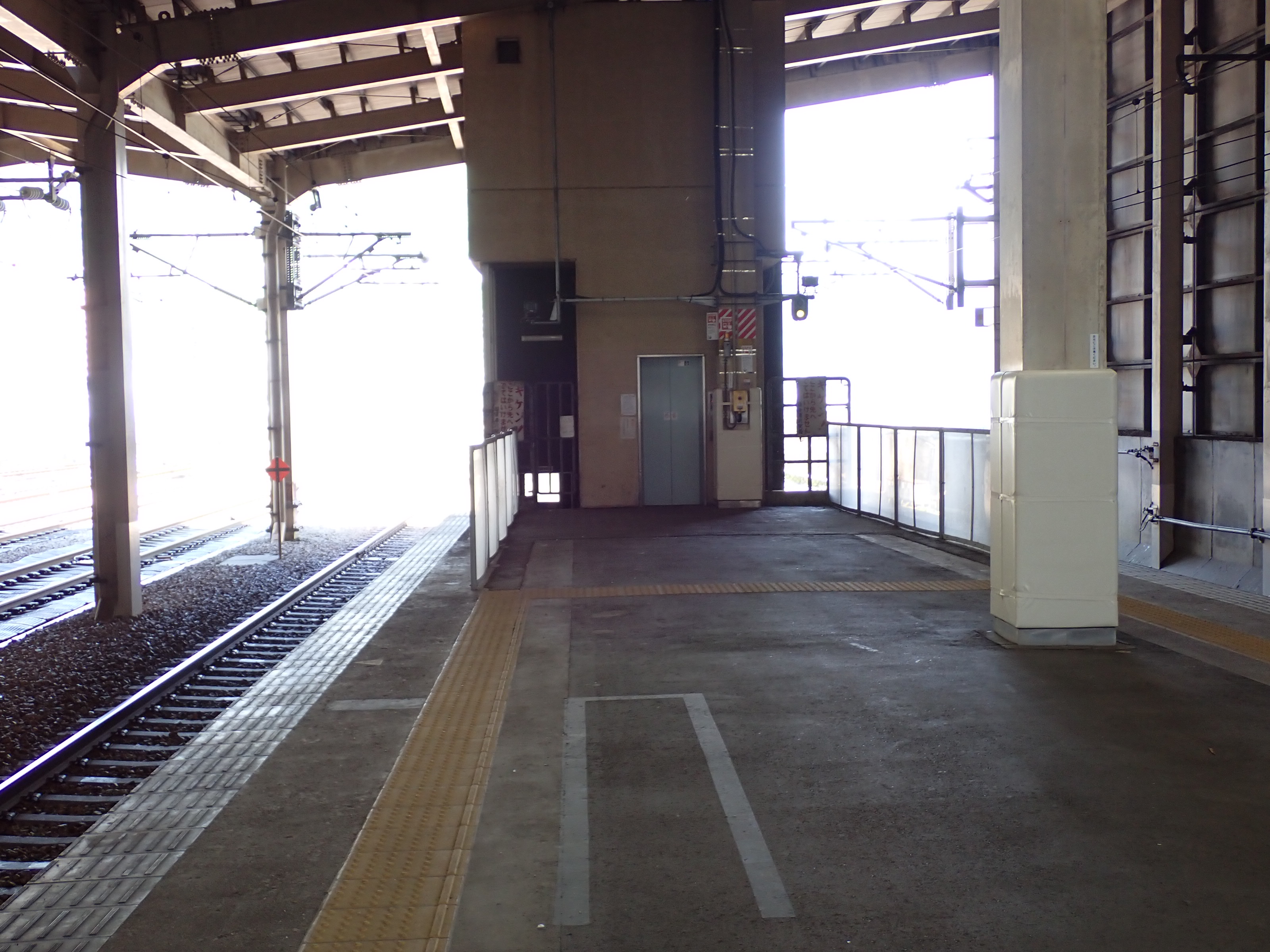 改札口に遠い側の両ホーム階段入口と使われていない待合室らしきスペース入口。