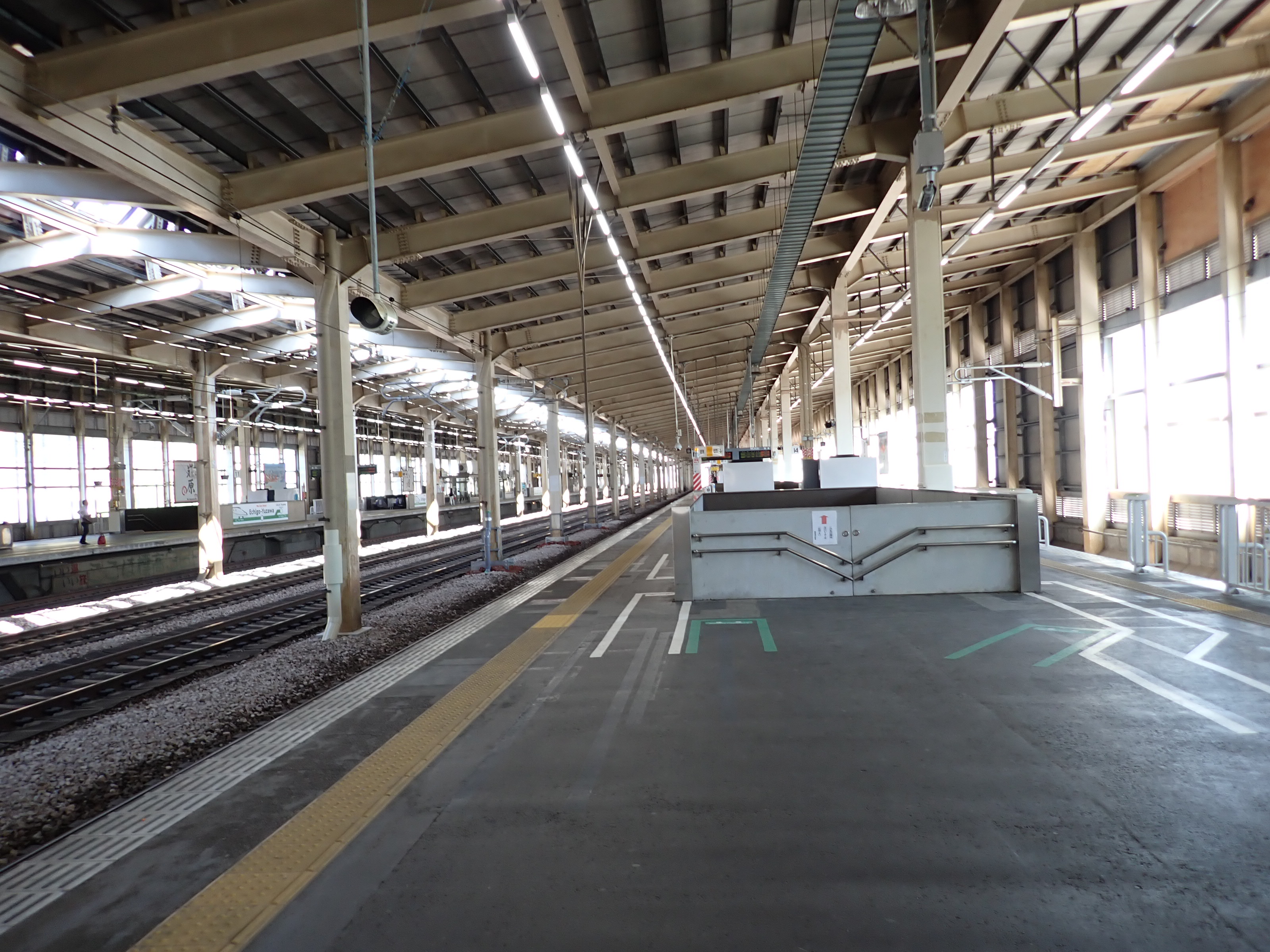 13・14番線の上毛高原駅側。12両編成に統一されてからは列車が停車しない範囲になりました。