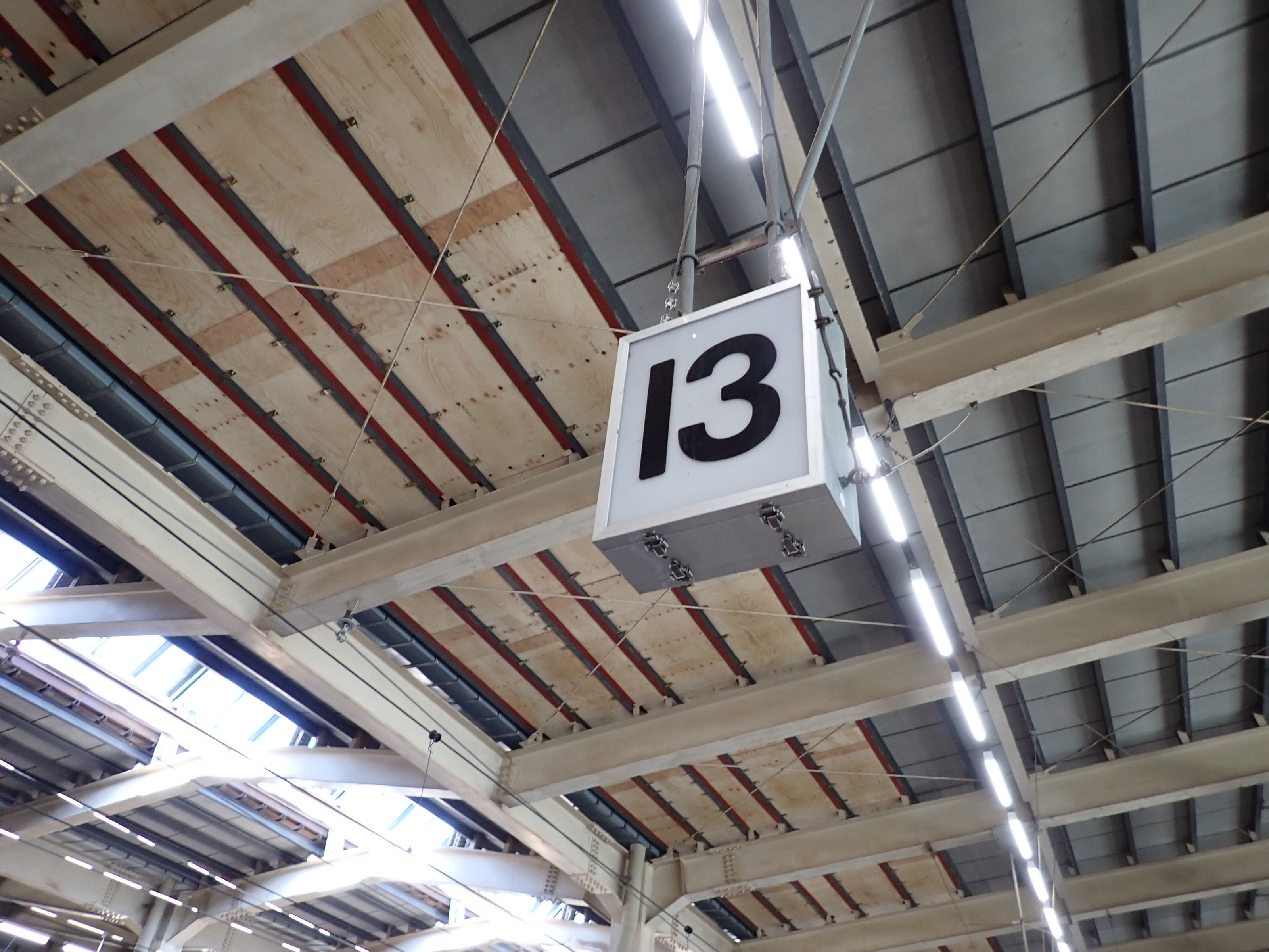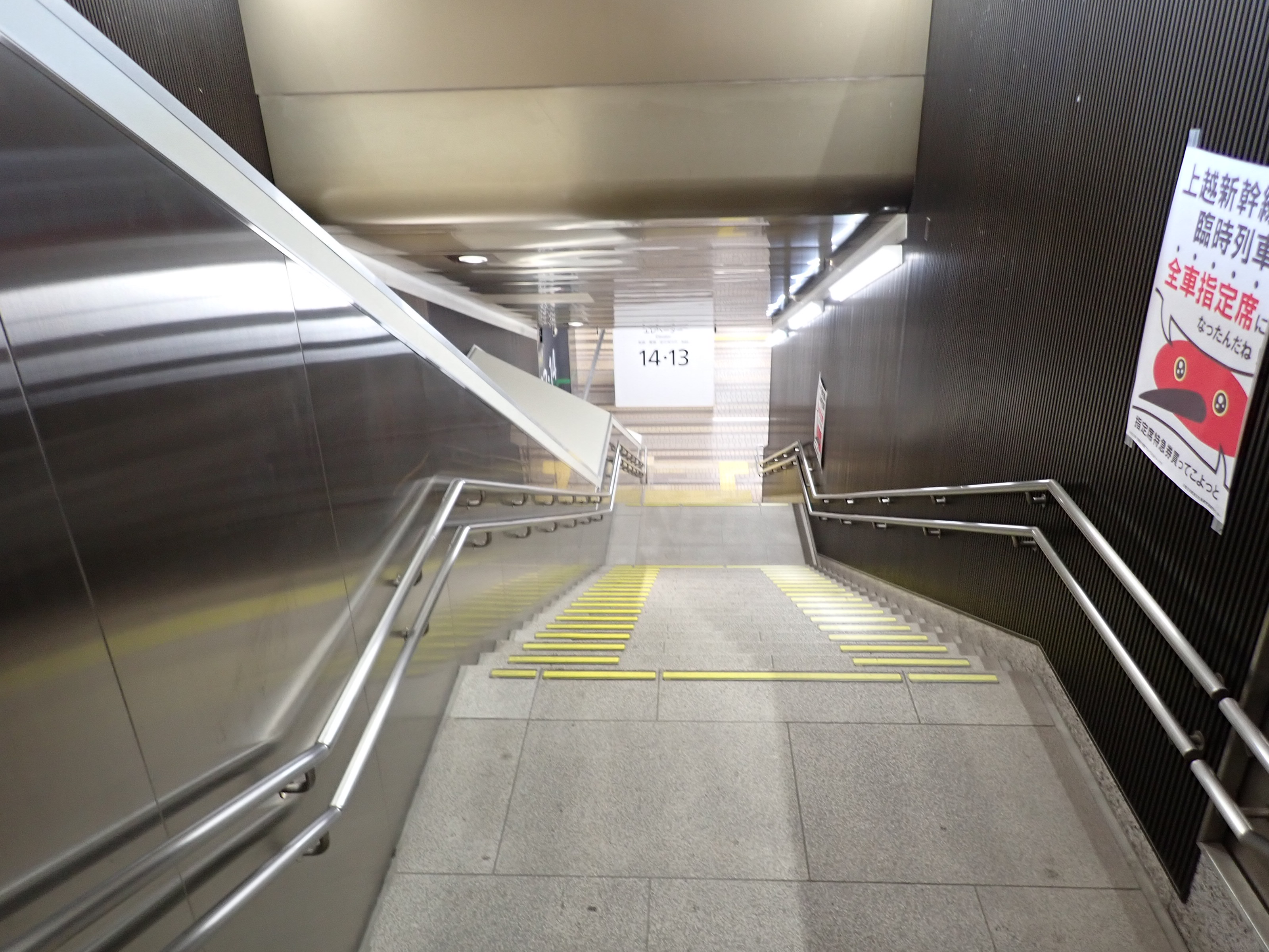 13・14番線の改札口に近い側の階段・エスカレーターの遠景。