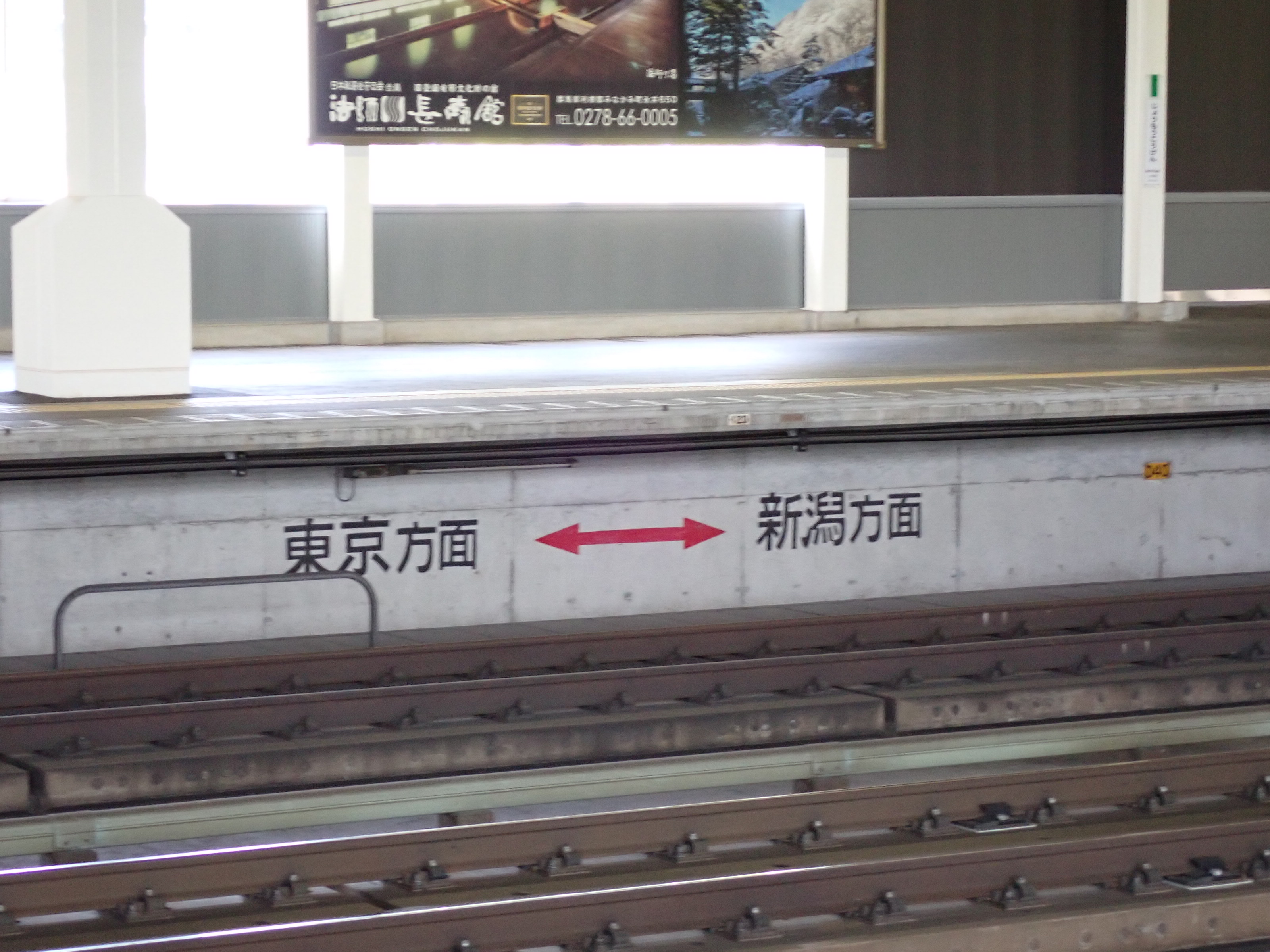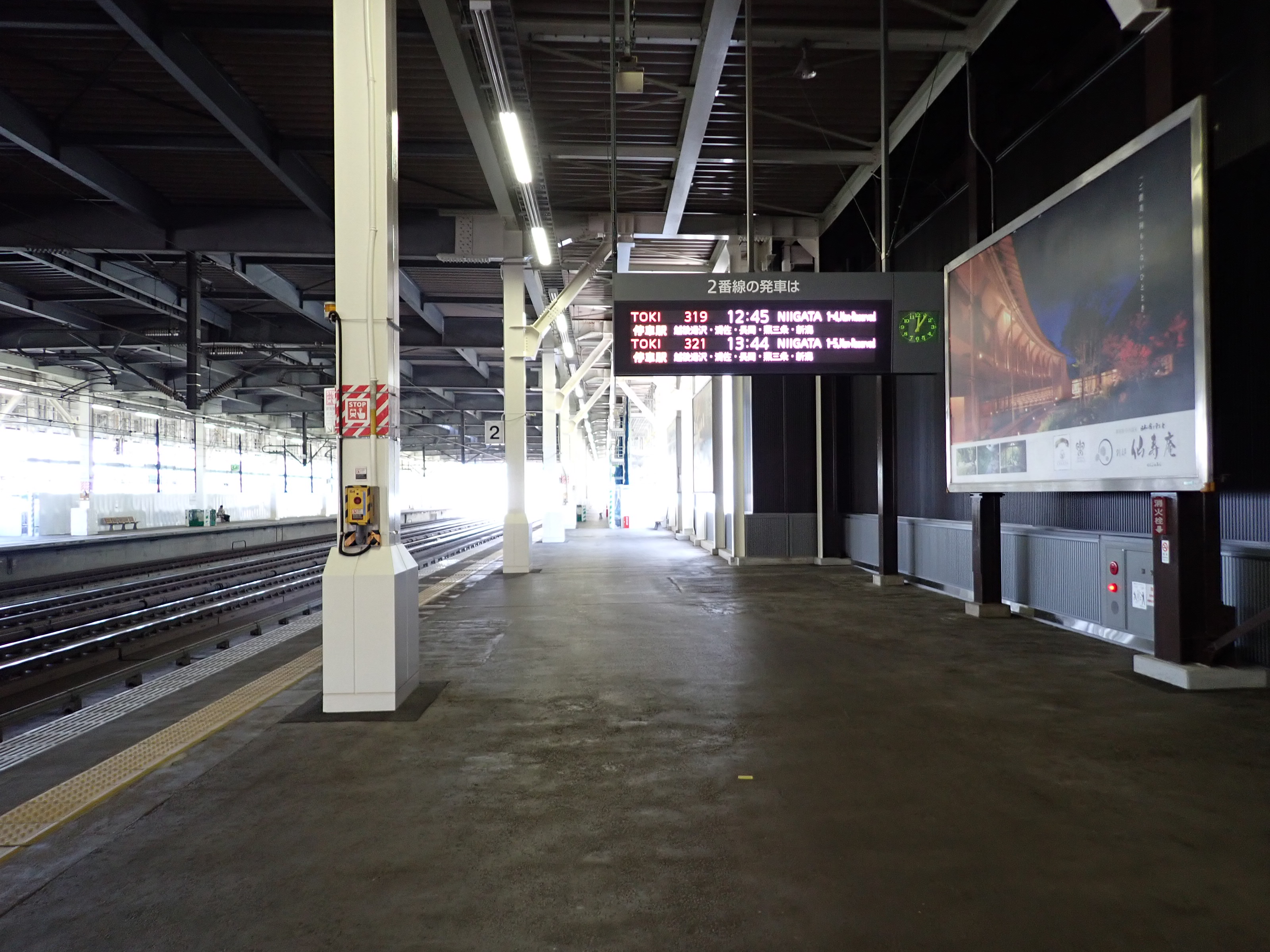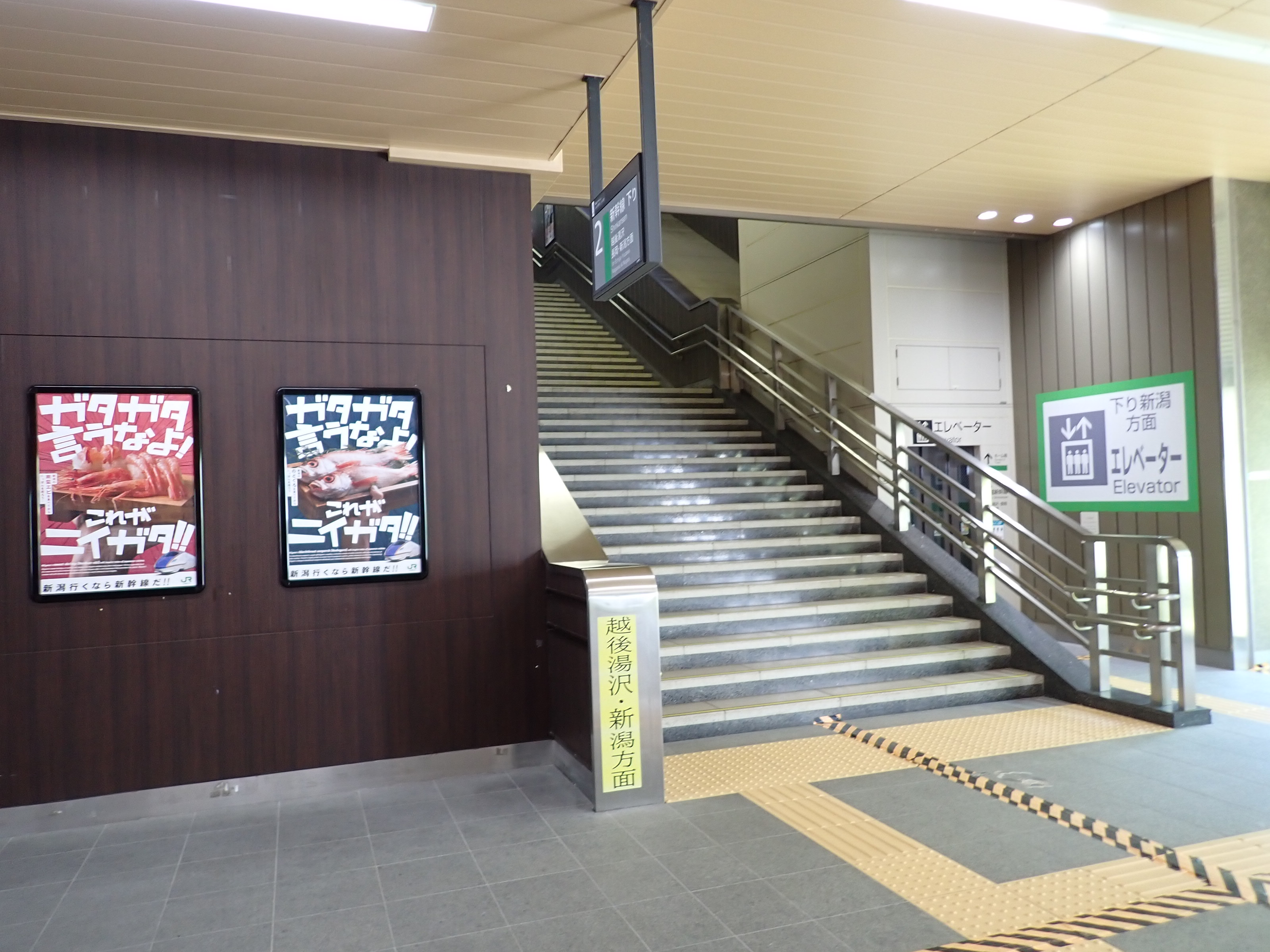 2番線両側の階段と上越新幹線のポスター。