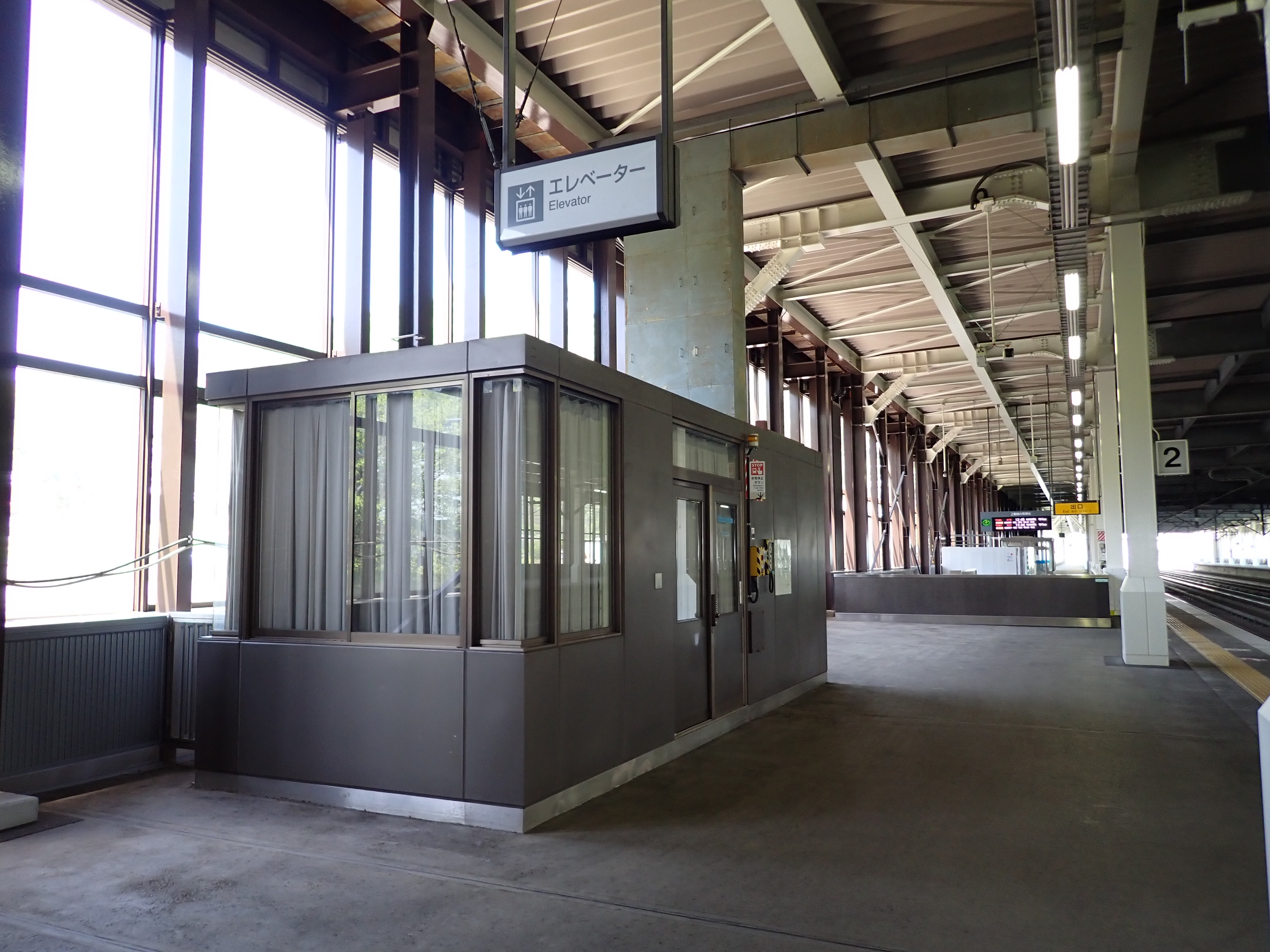 階段と階段の間の運転事務室とそこから見た2番線。