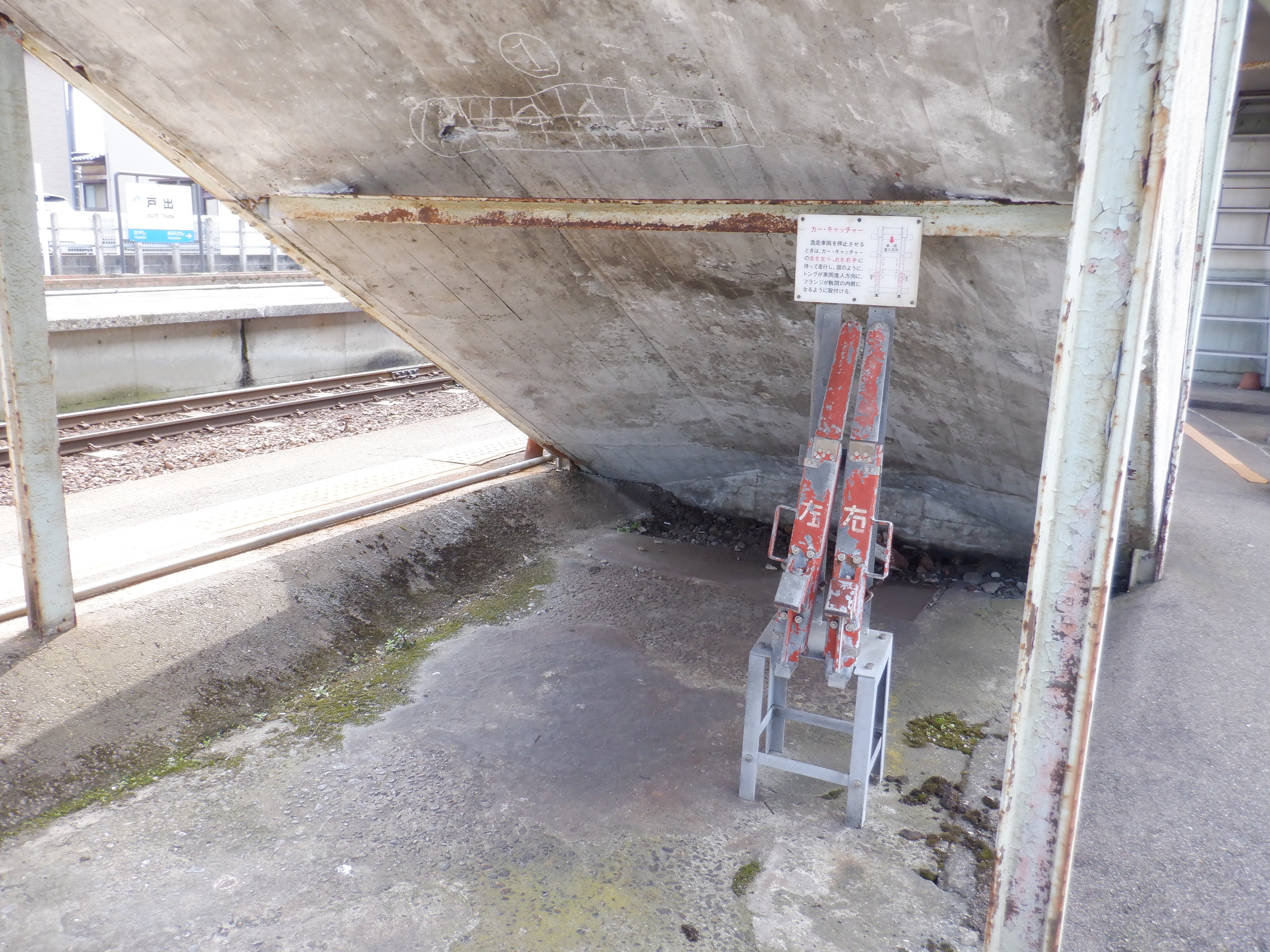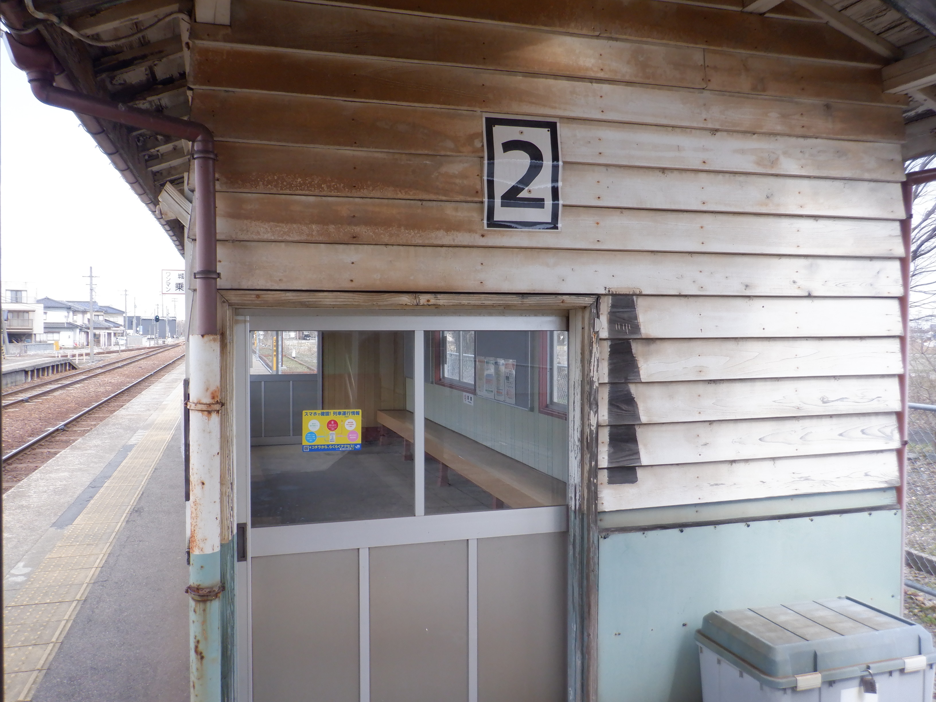 城端線の他駅同様、3両ワンマン対応のワンマンミラーが取り付けられました。この駅の場合はどちらのホームも運転席の左側にホームが存在するため、モニターが取り付けられず、ワンマンミラーでの対応となったようです。また、本編取材時は高校生が多くてホームの駅舎に面したところを撮ることができなかったため、今回改めて撮ってあります。