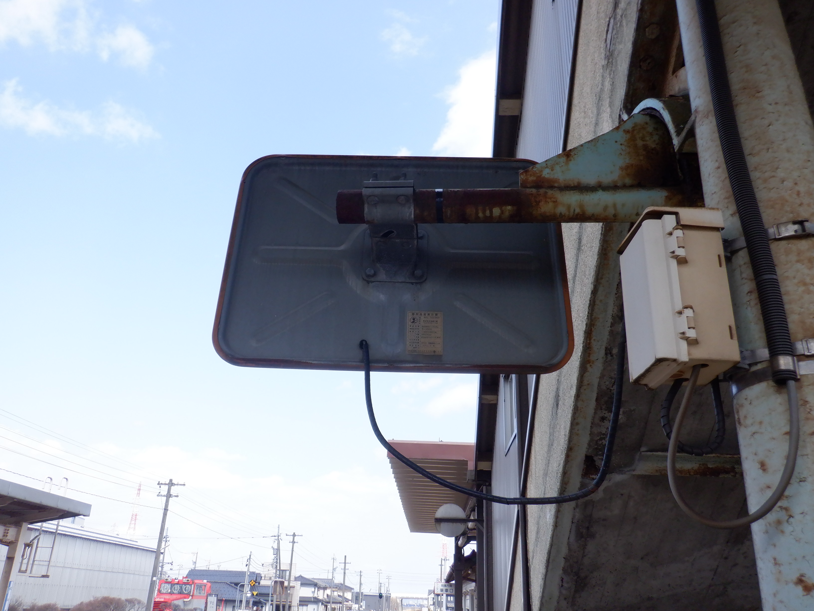 1番のりばの林駅側の取り付けられたワンマンミラー。3両ワンマン対応のため「くもらーず」です。柵の外側にあるため、裏面は2番のりばから撮っています。