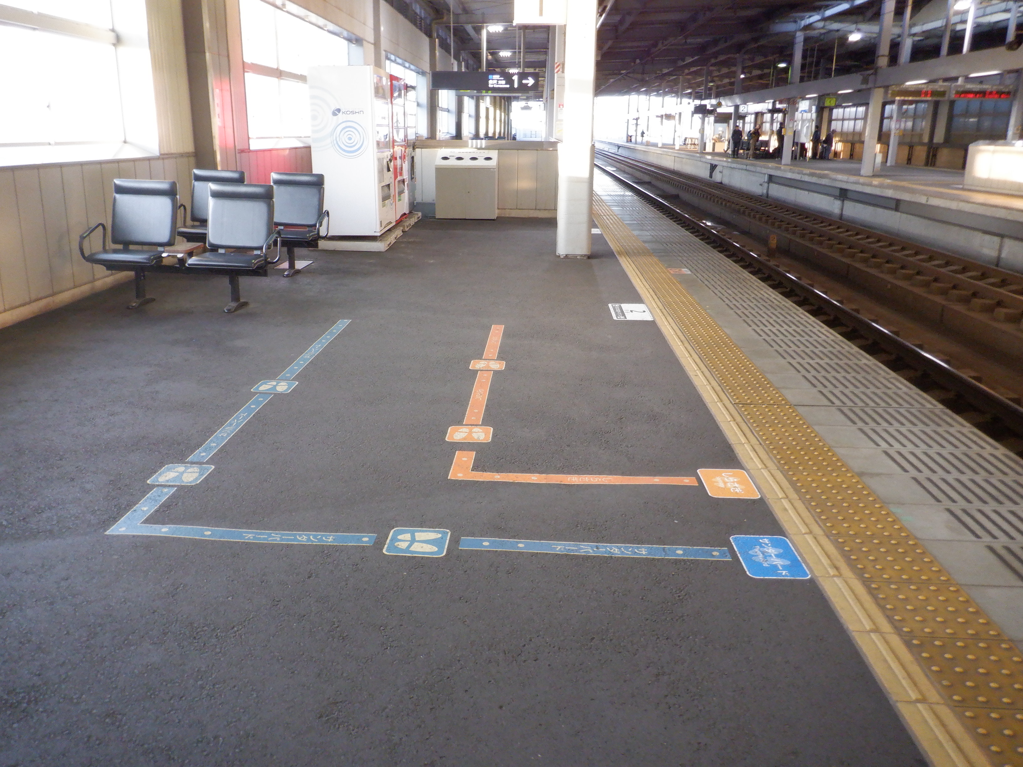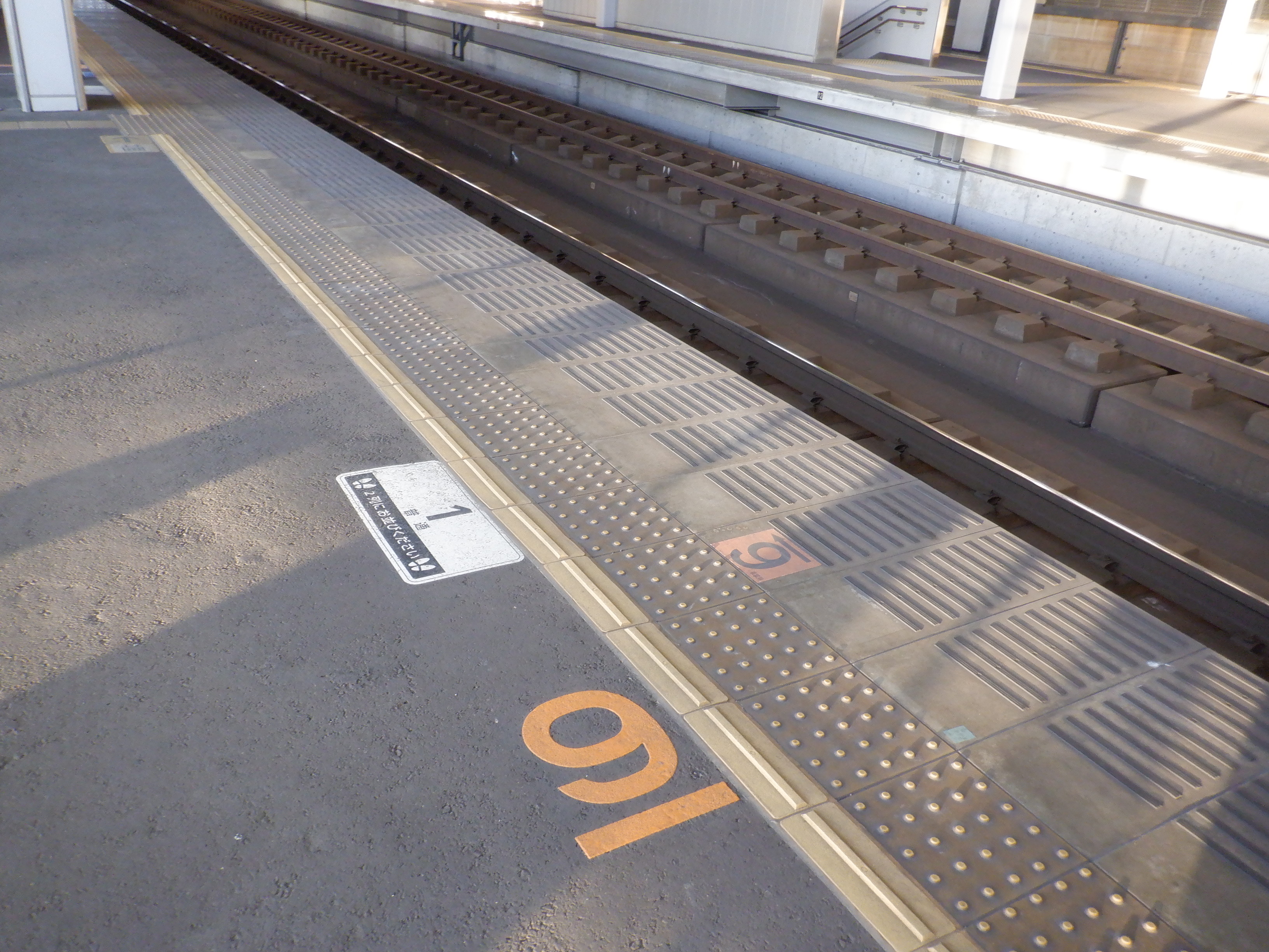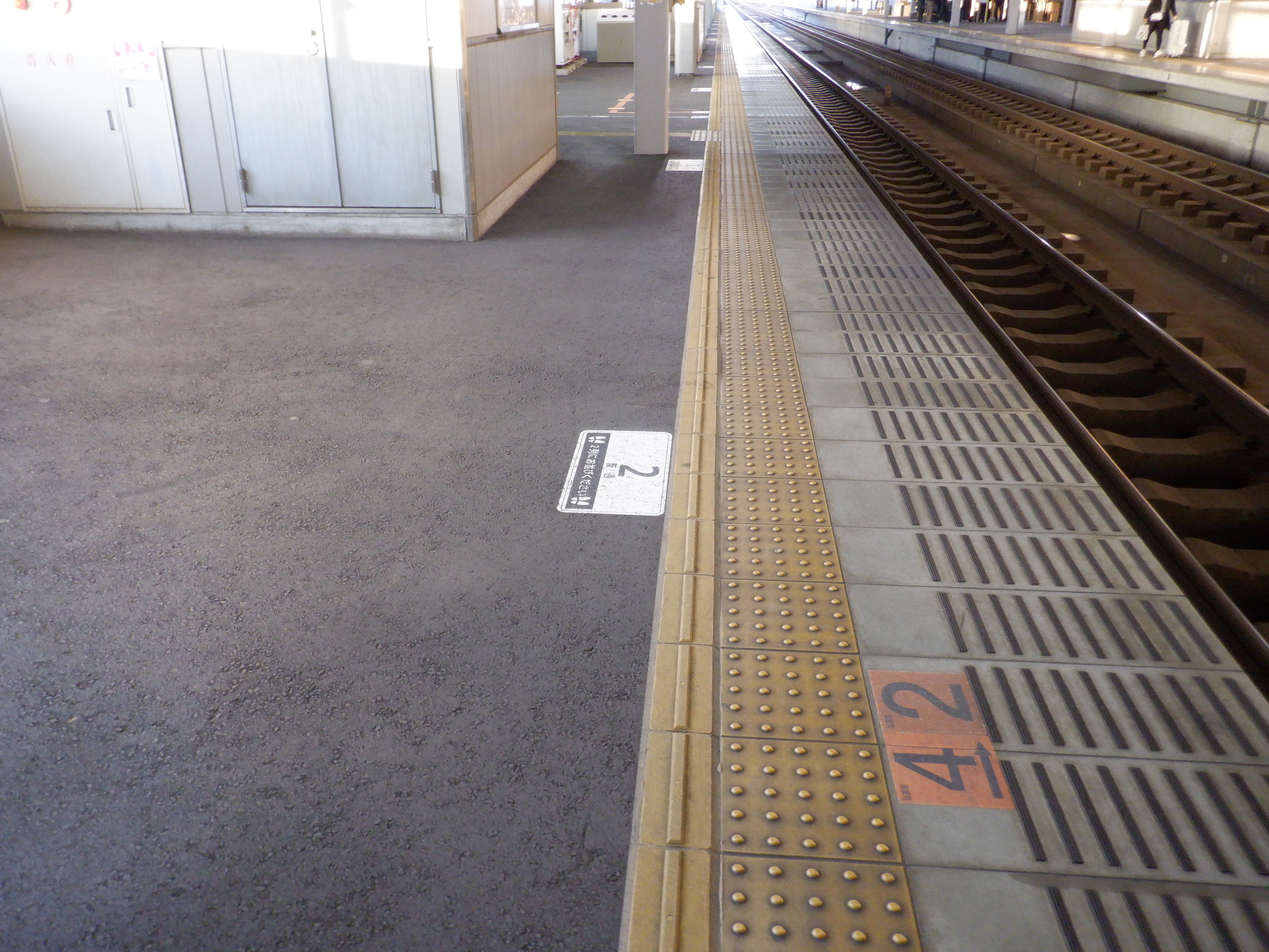 1番のりば普通列車の乗車位置案内、6両・2両・4両の最後尾。