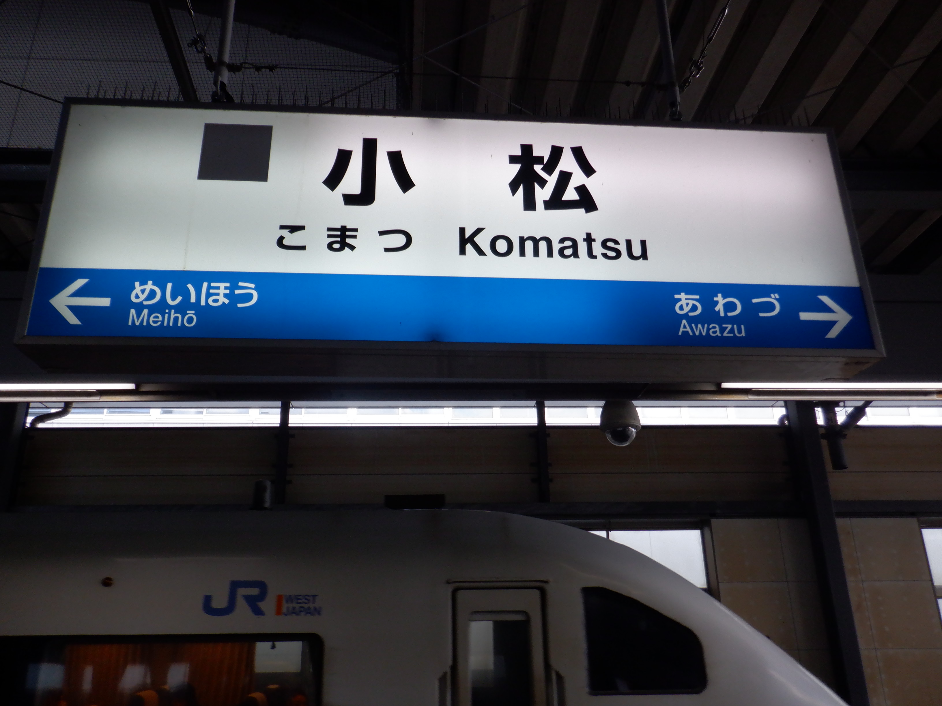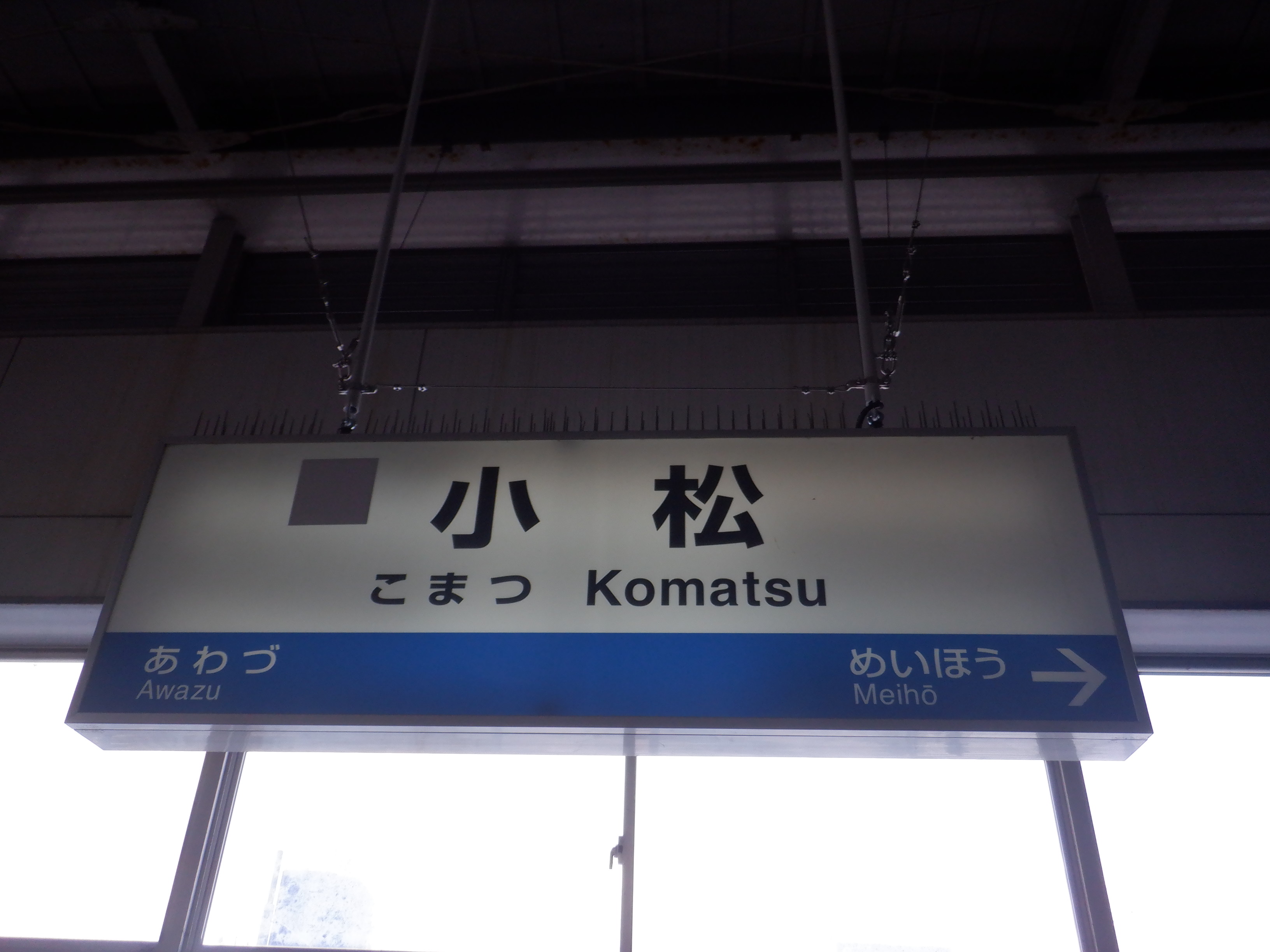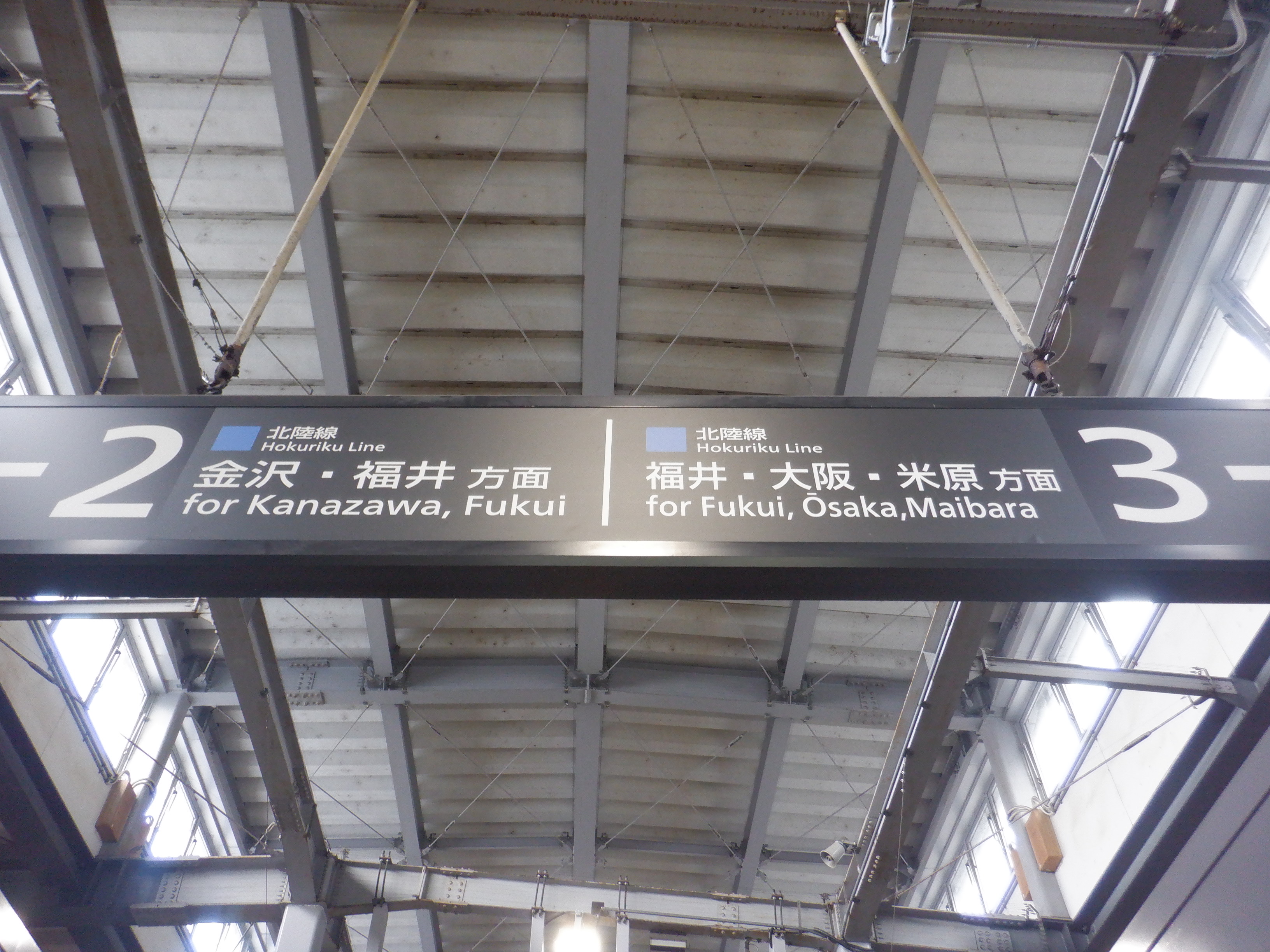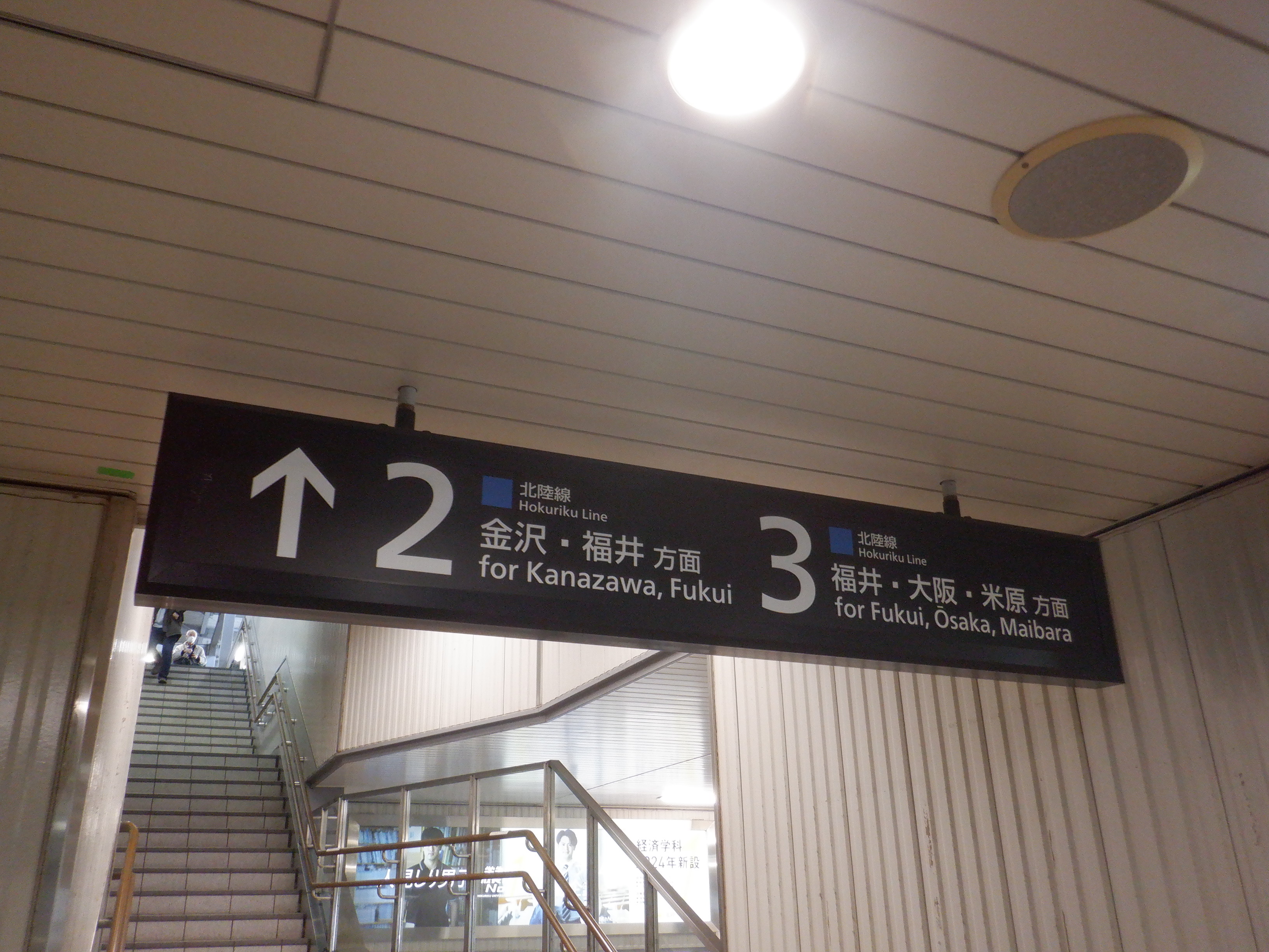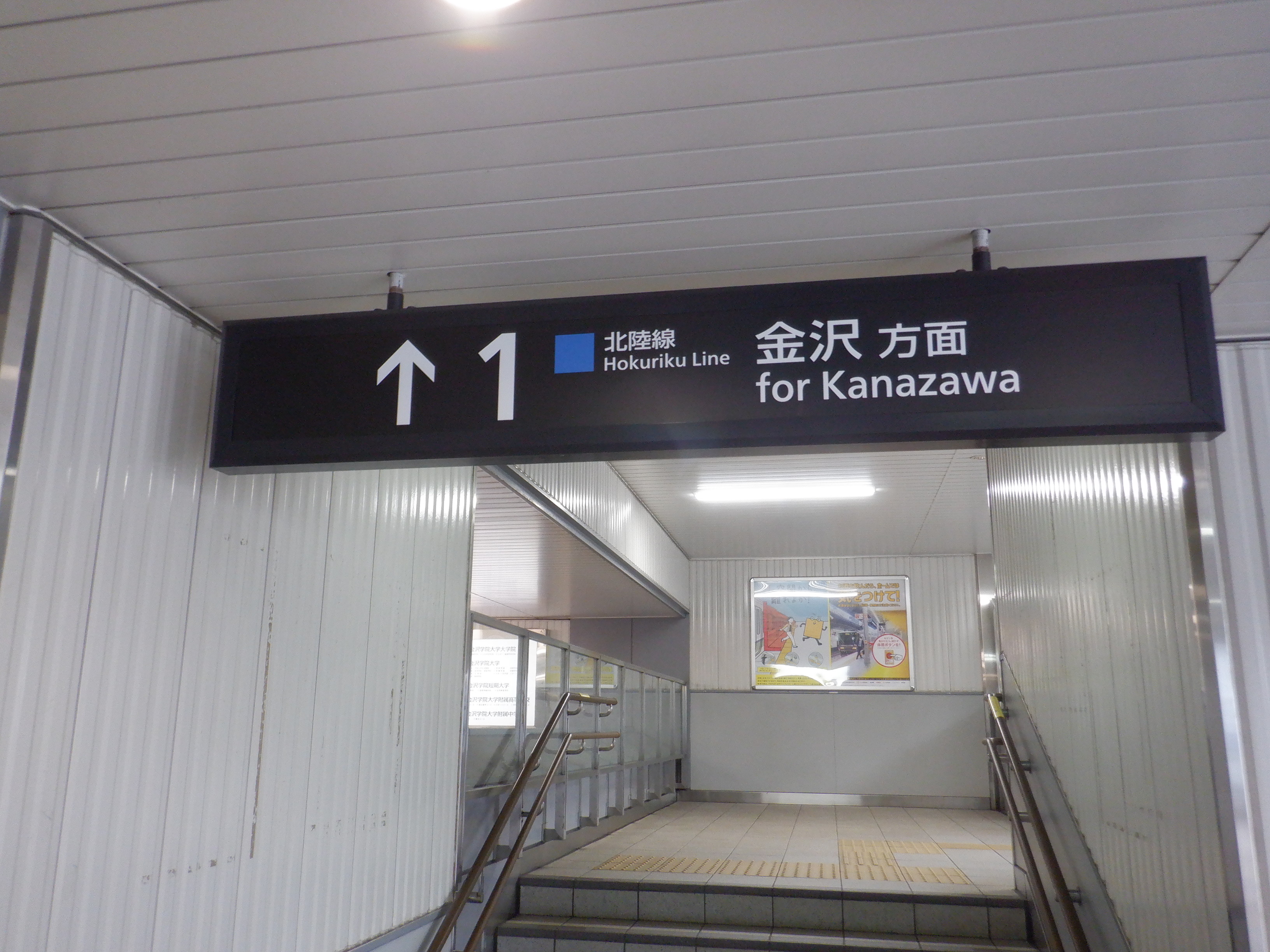2・3番のりば明峰駅側の階段・エスカレーター寄りの駅名標。IRいしかわ鉄道のものに差し替わっていますが、ロゴがあると思われるところはシールが貼られています。