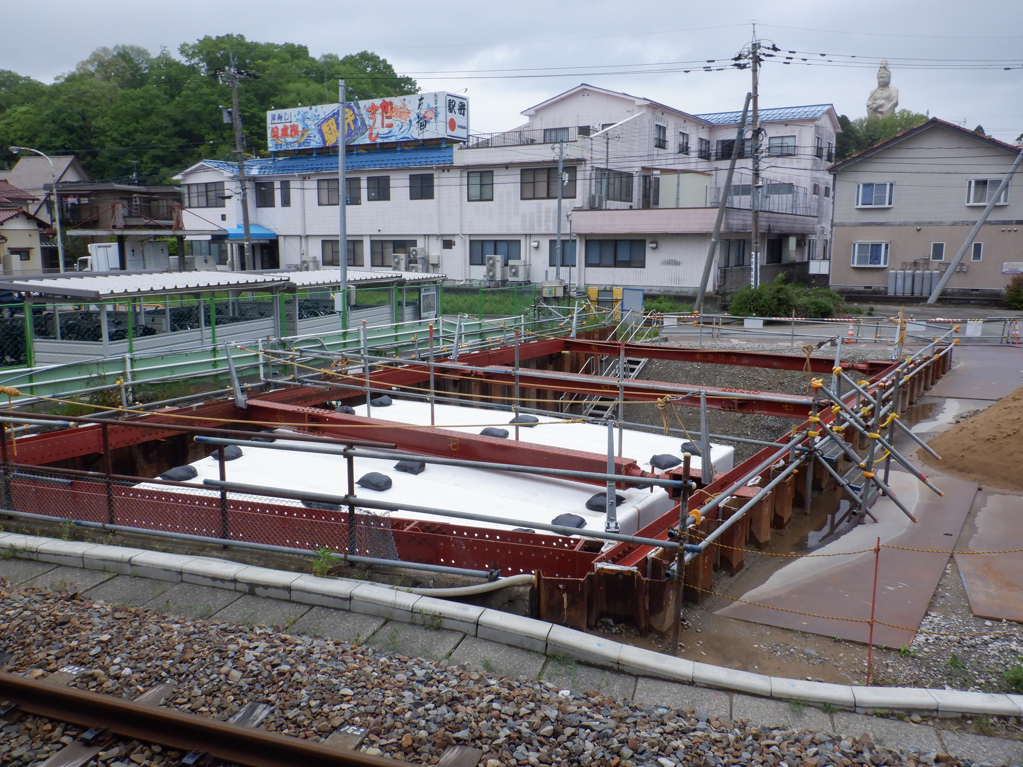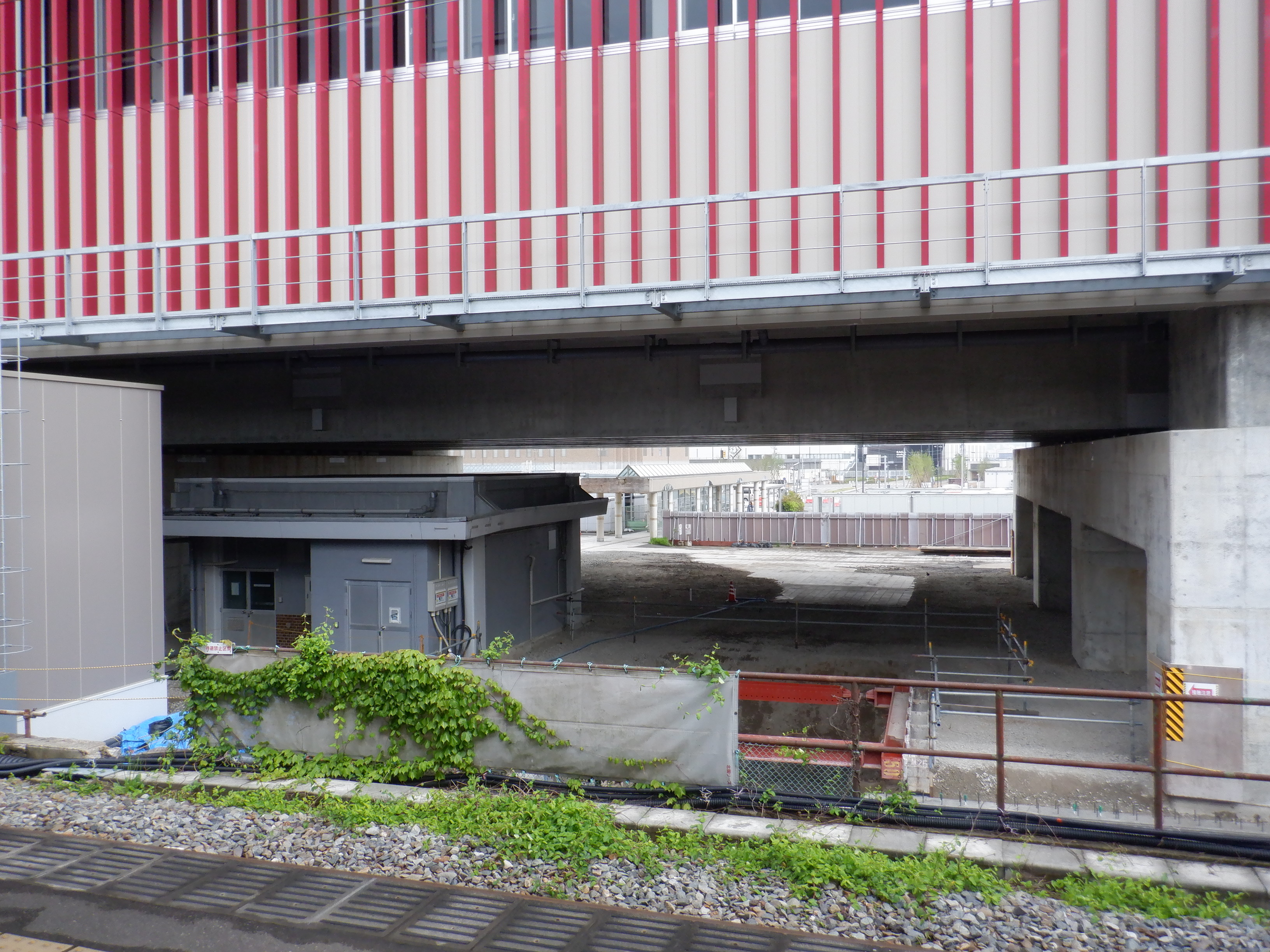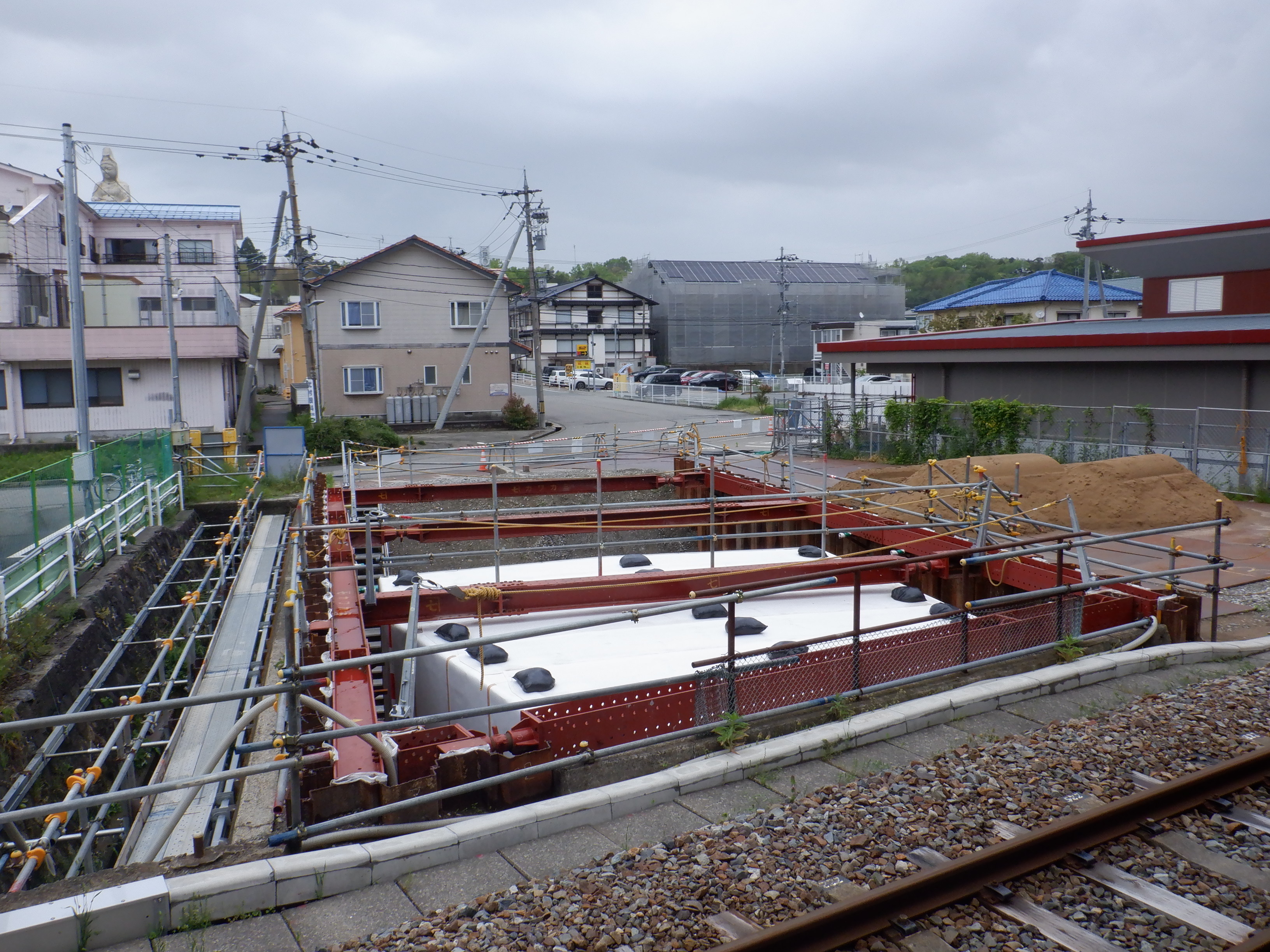 北口駅舎の横から見た地下自由通路を再建設中のところ。