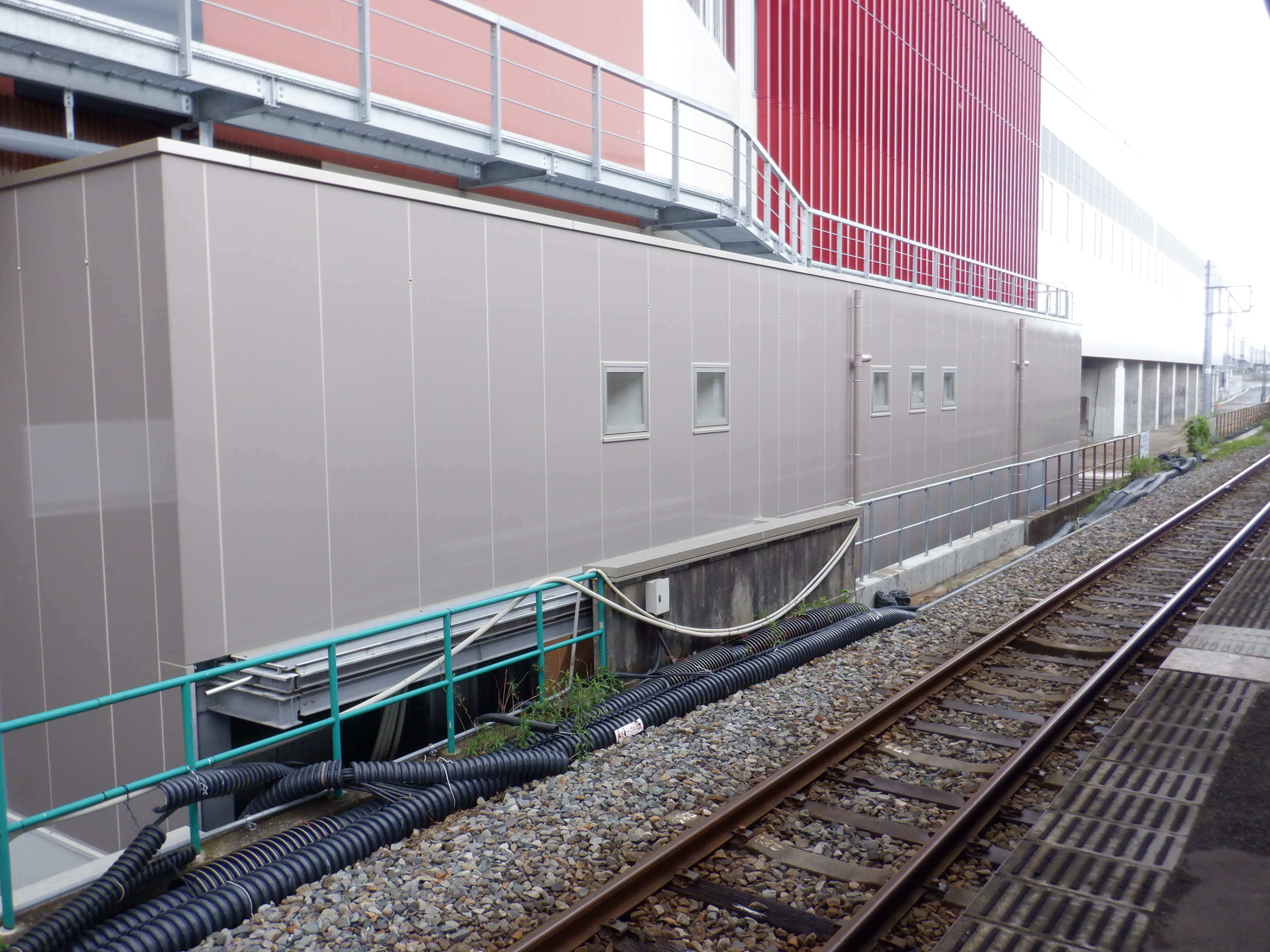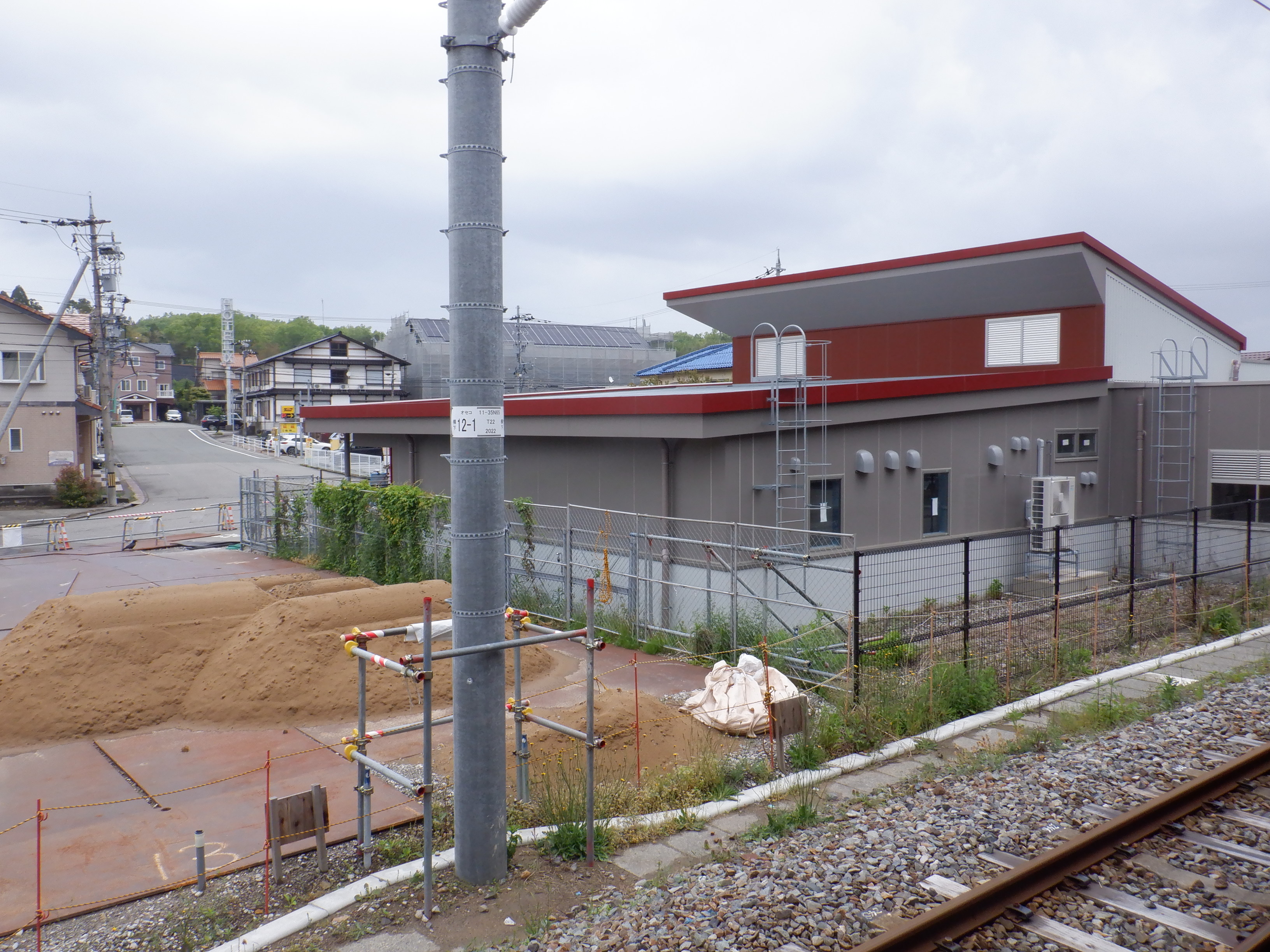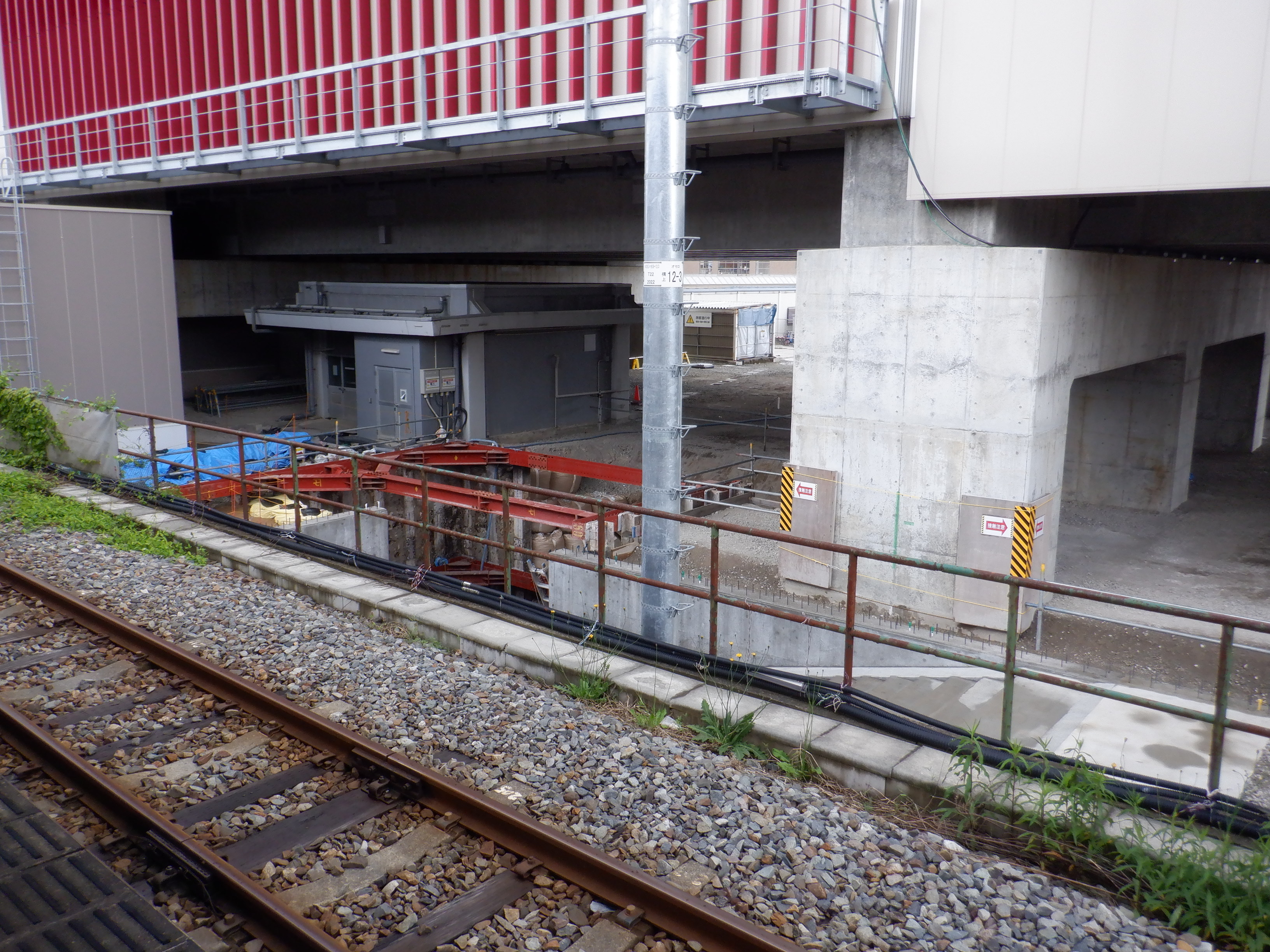 北口駅舎の横から見た地下自由通路を再建設中のところ。