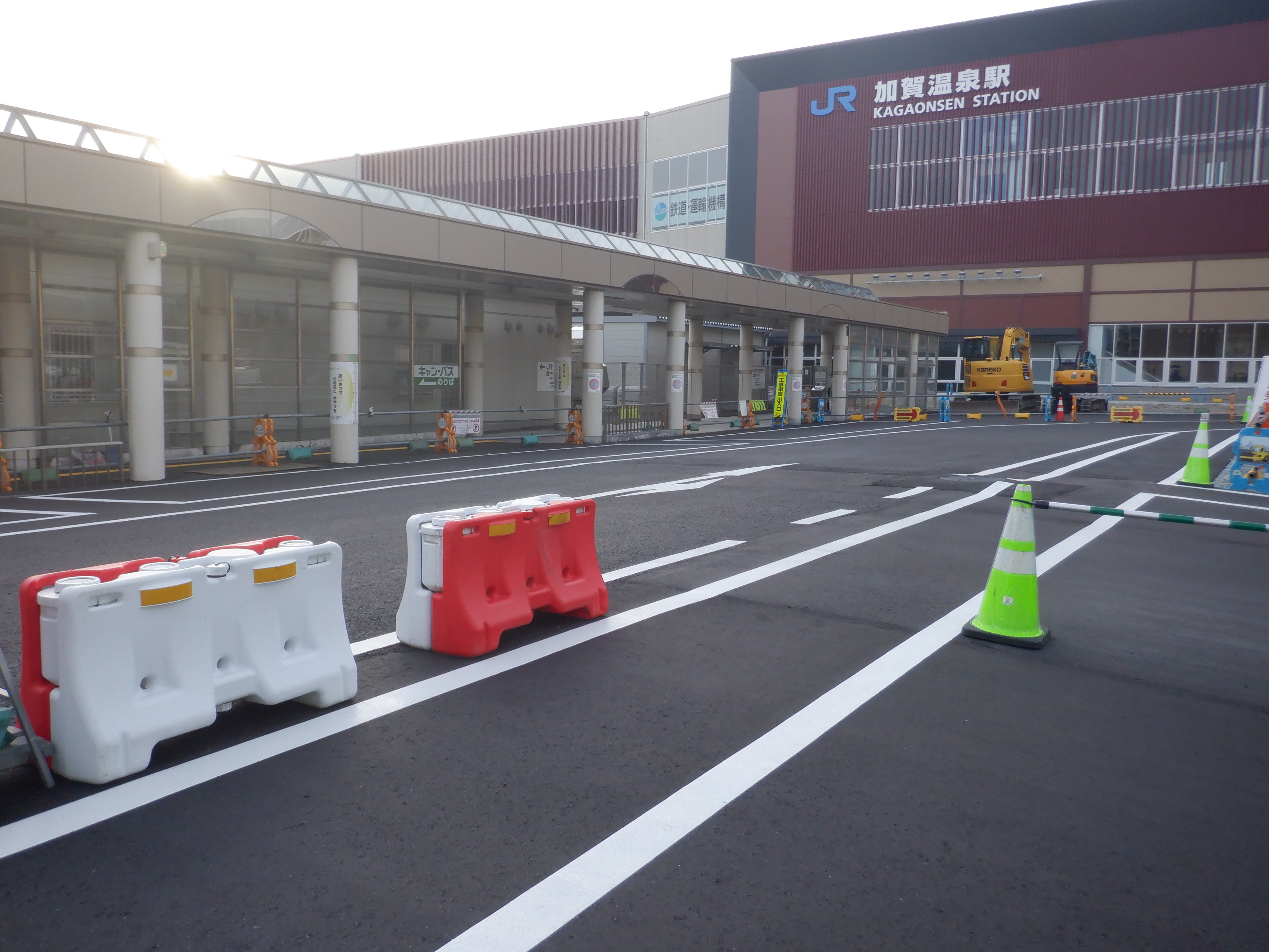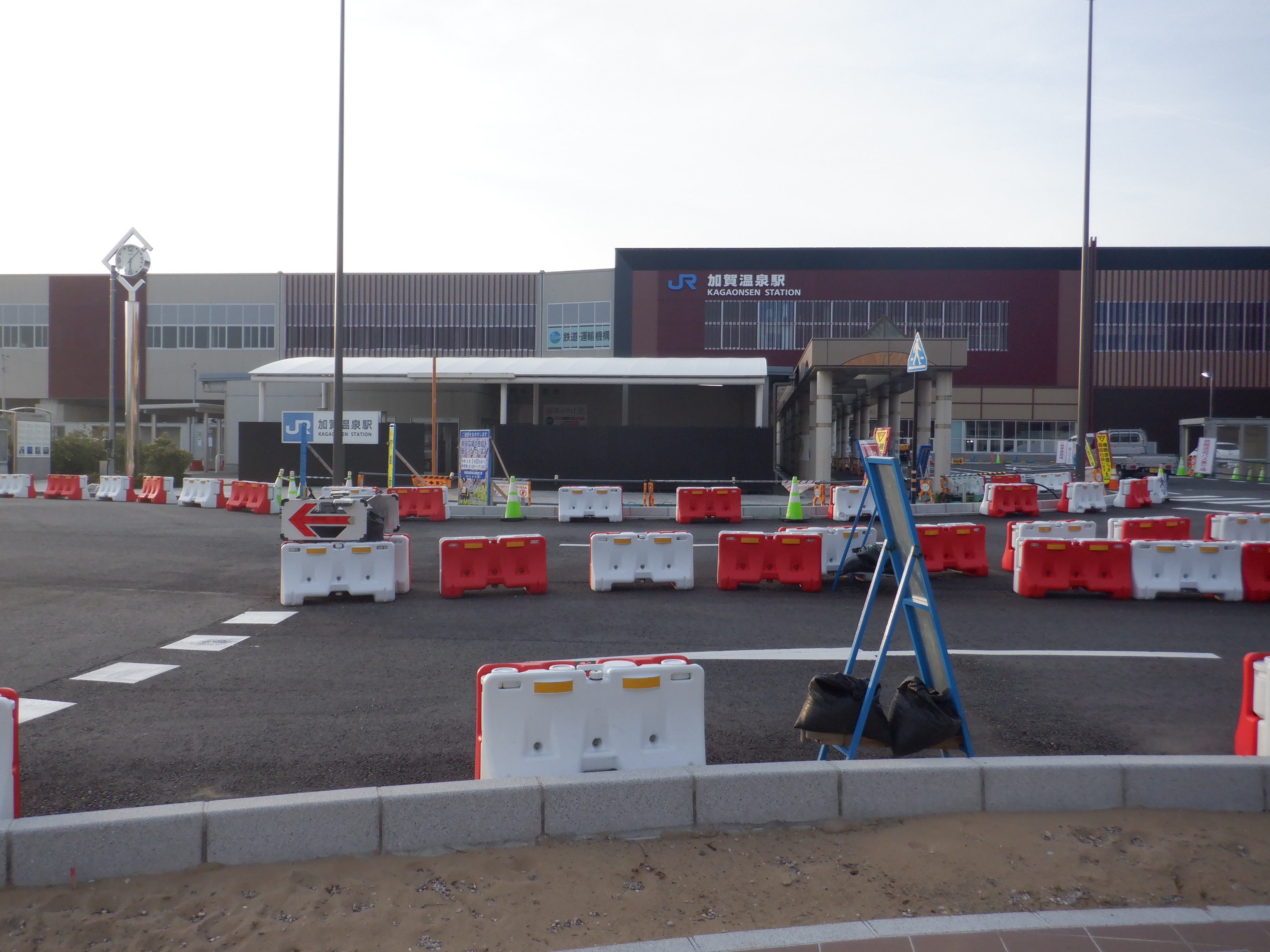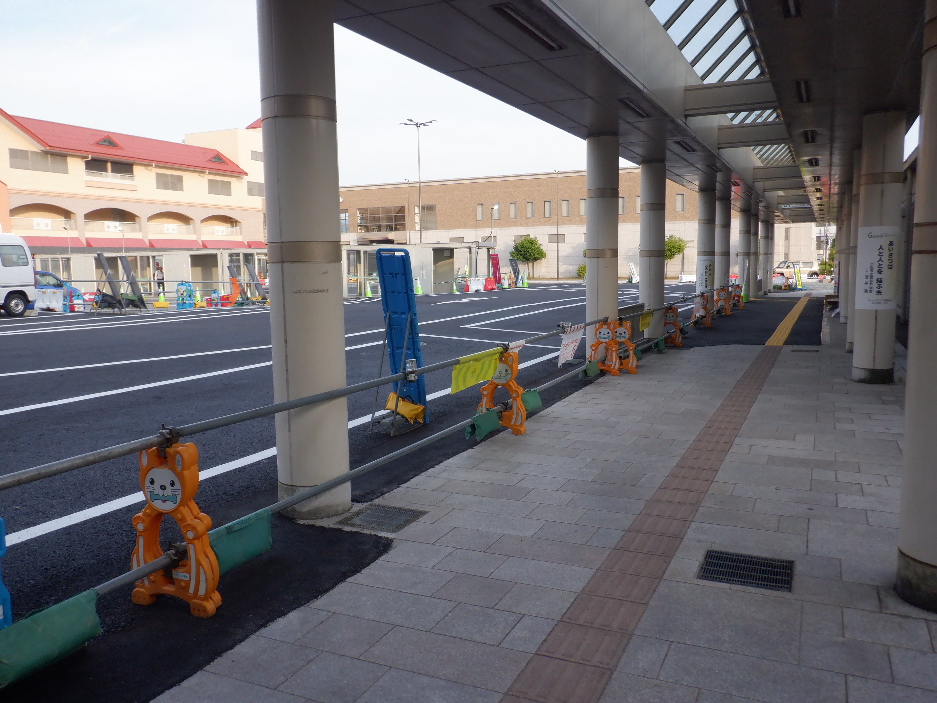 再び駅前の環状交差点となるところと、そこから見た仮設バスのりばの前のタクシーのりば。。
