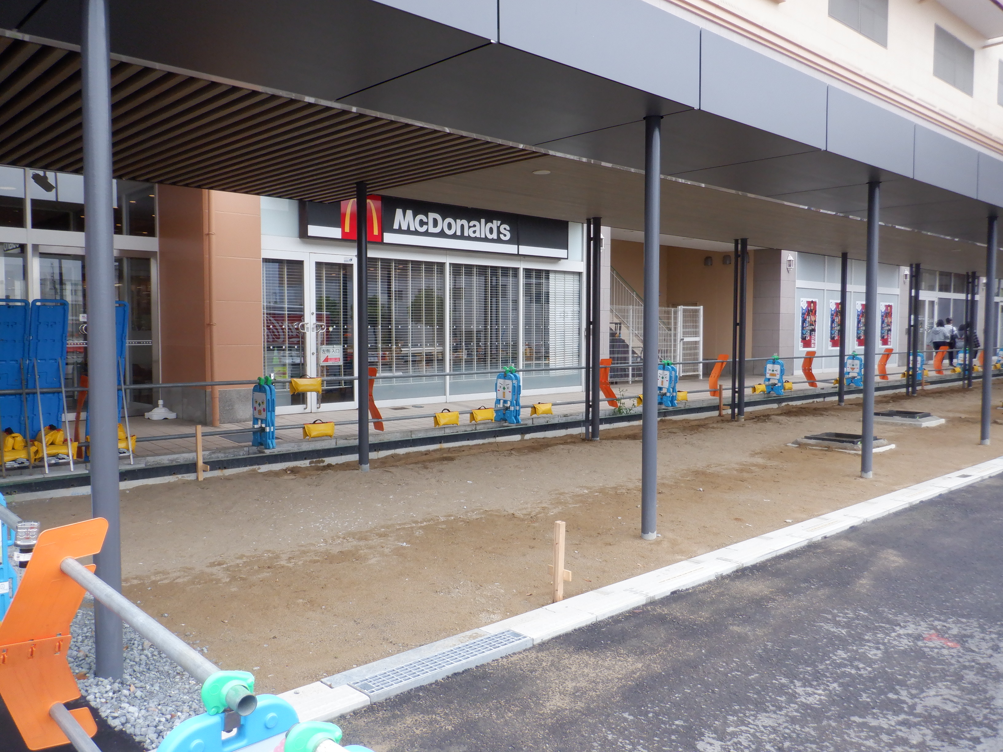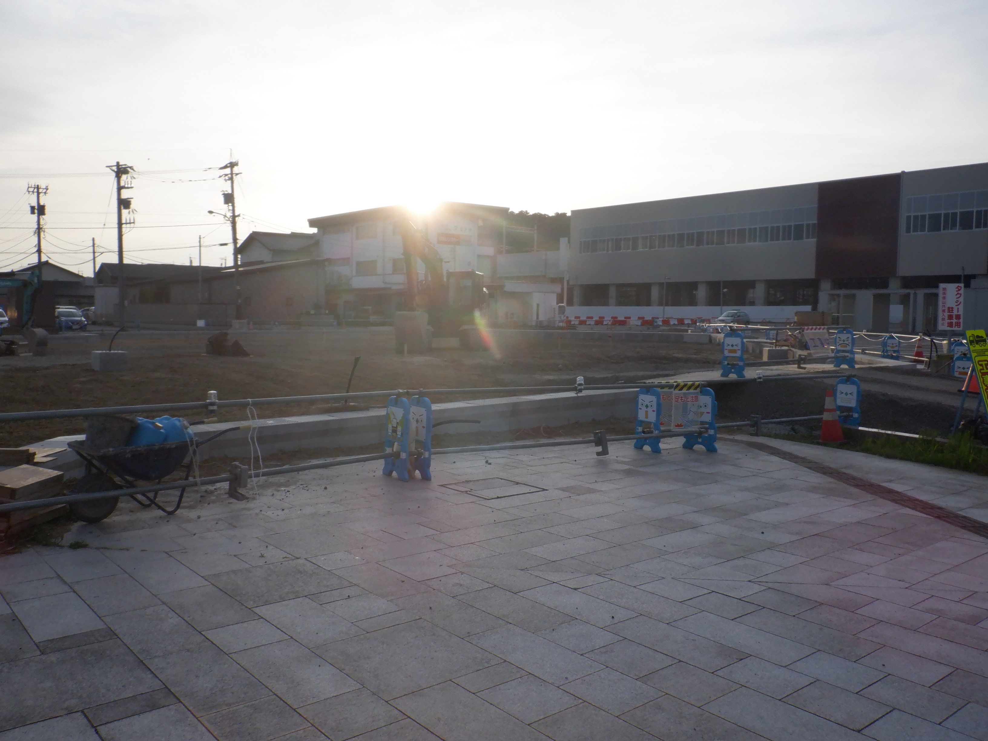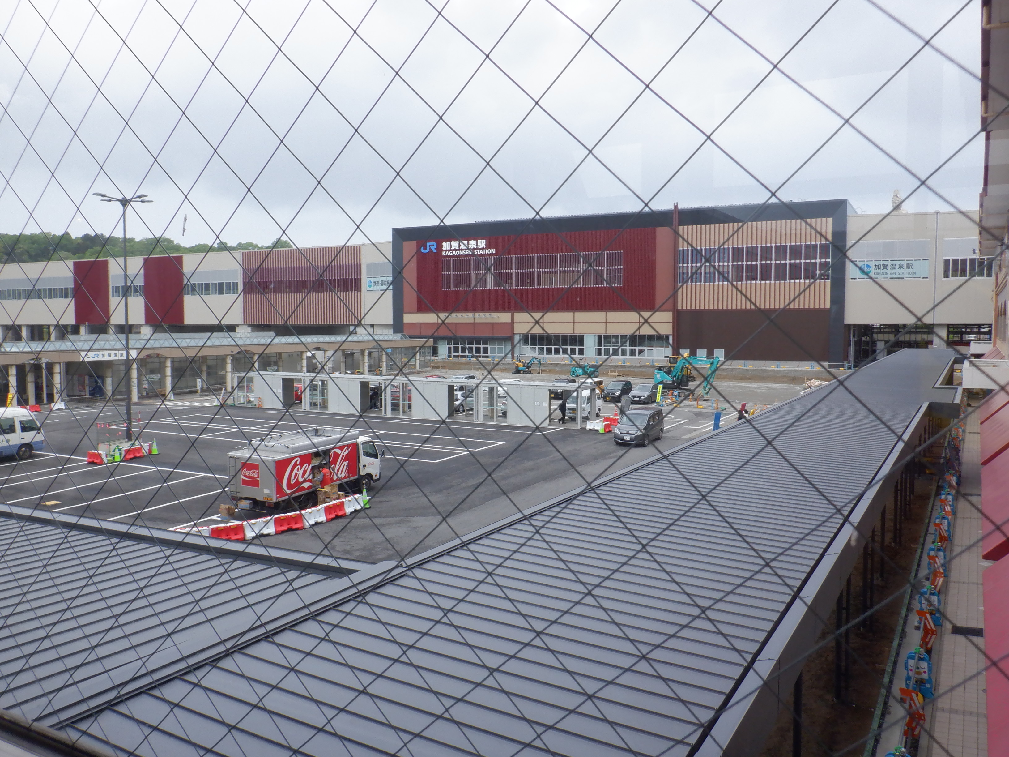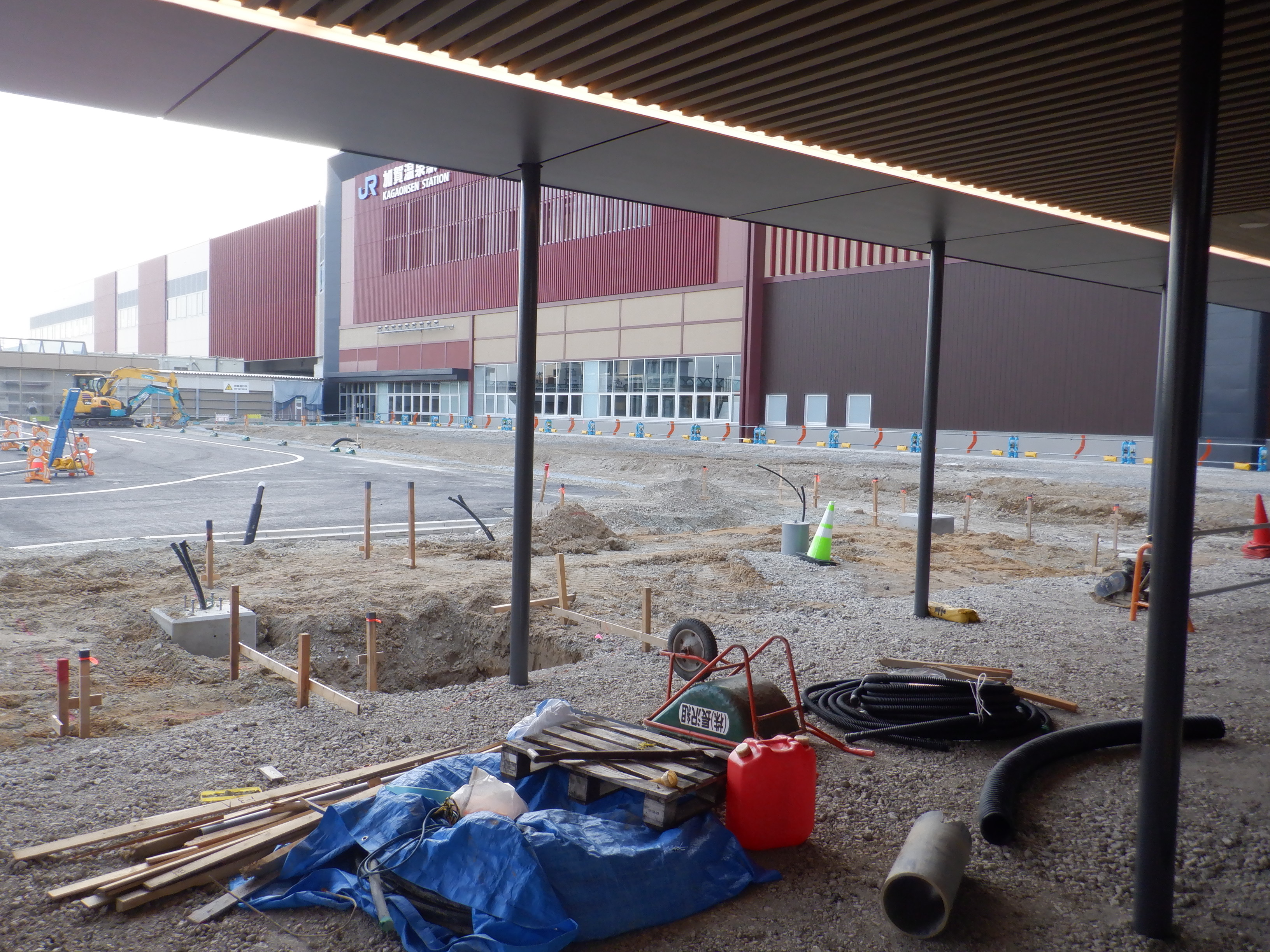 アルプラザの前のシェルター建設中の様子と、そこから見た新幹線駅舎。