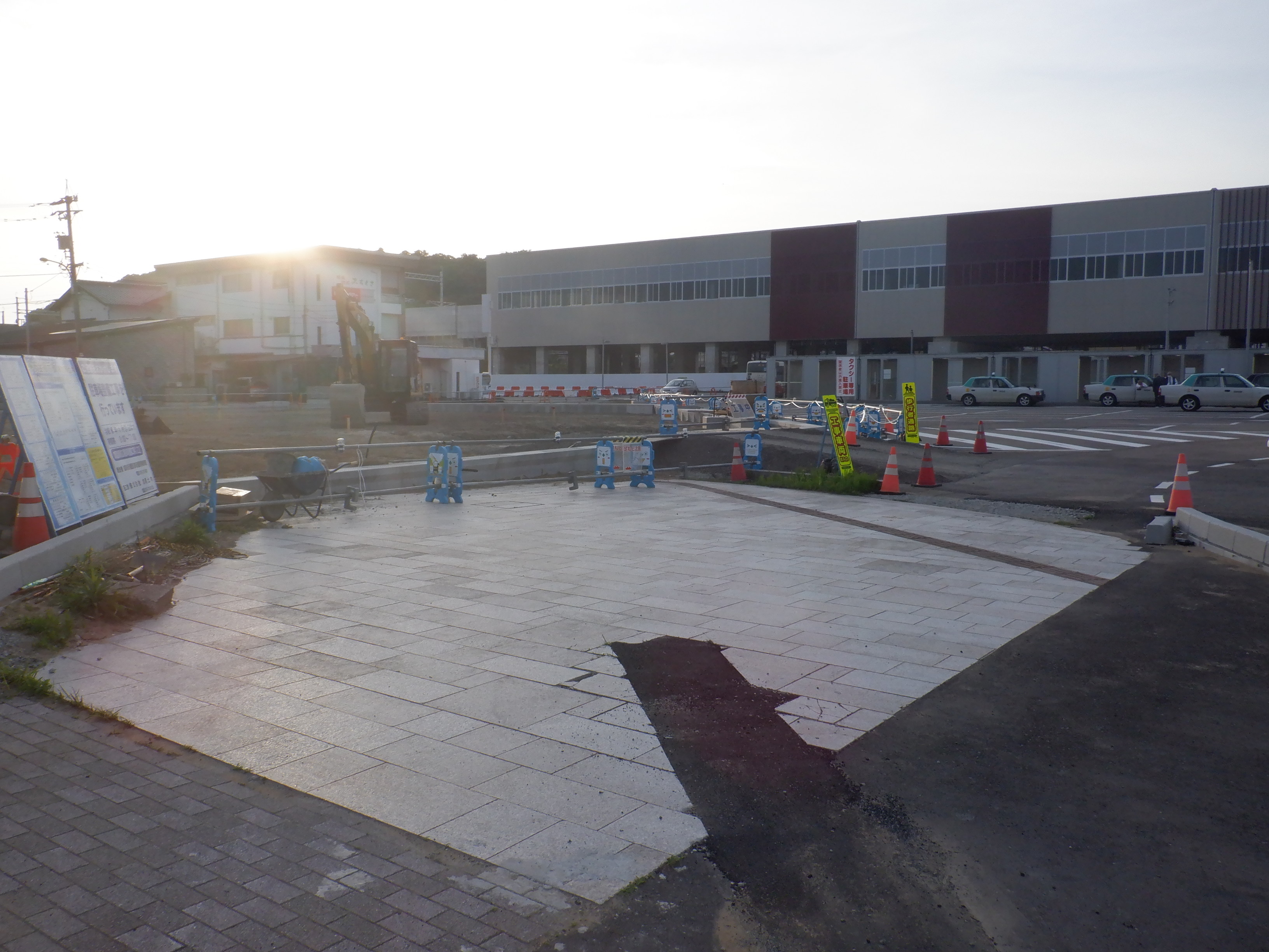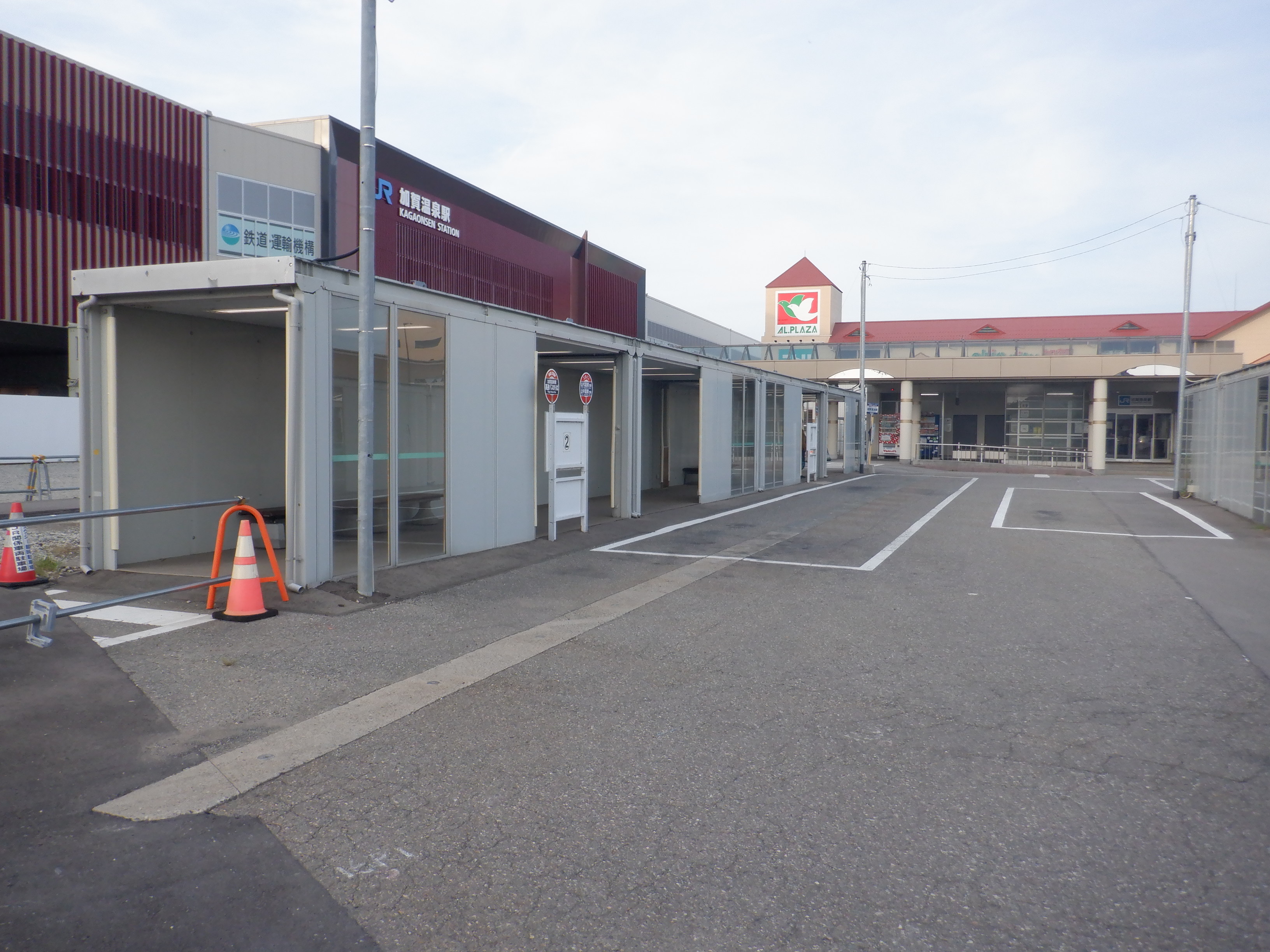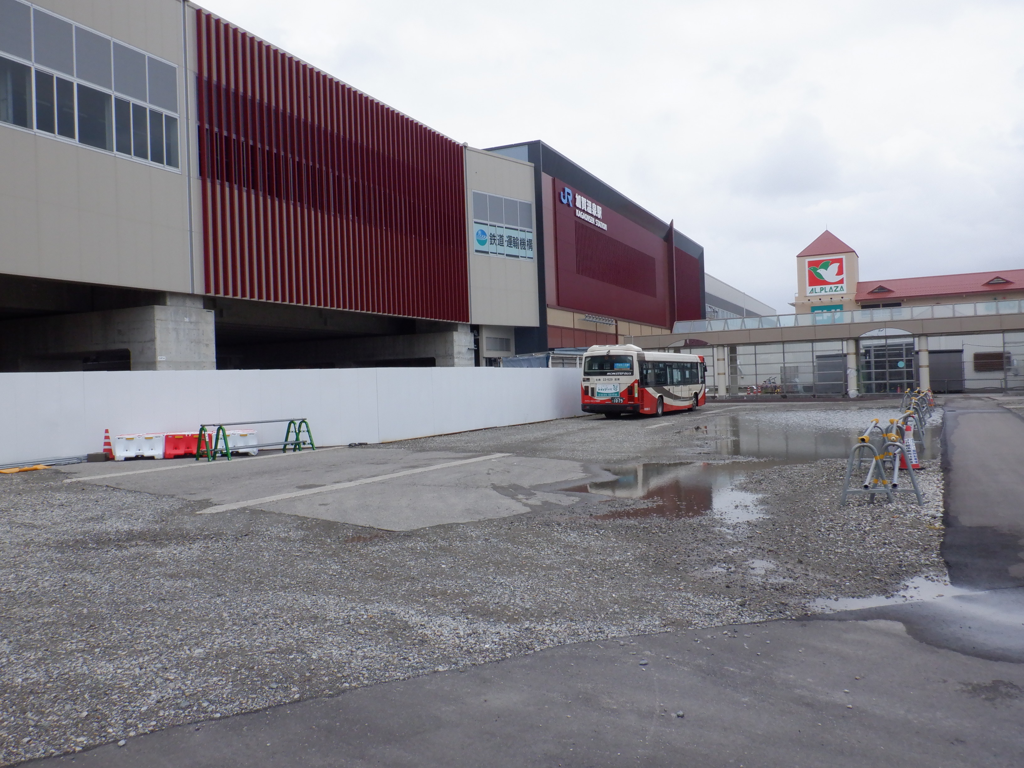 仮設駅舎の横から見た仮設バスのりばとかつてのバスのりば。