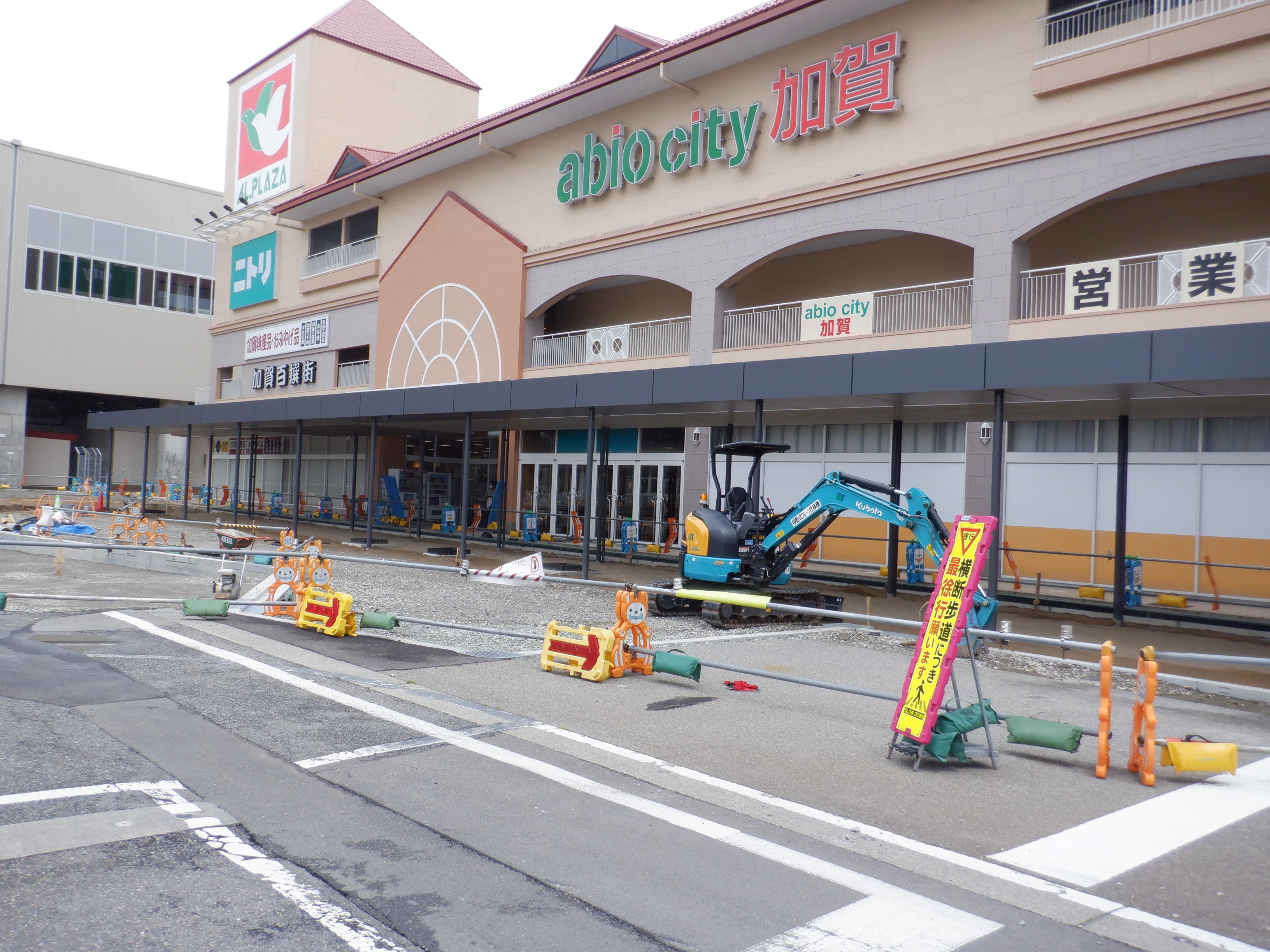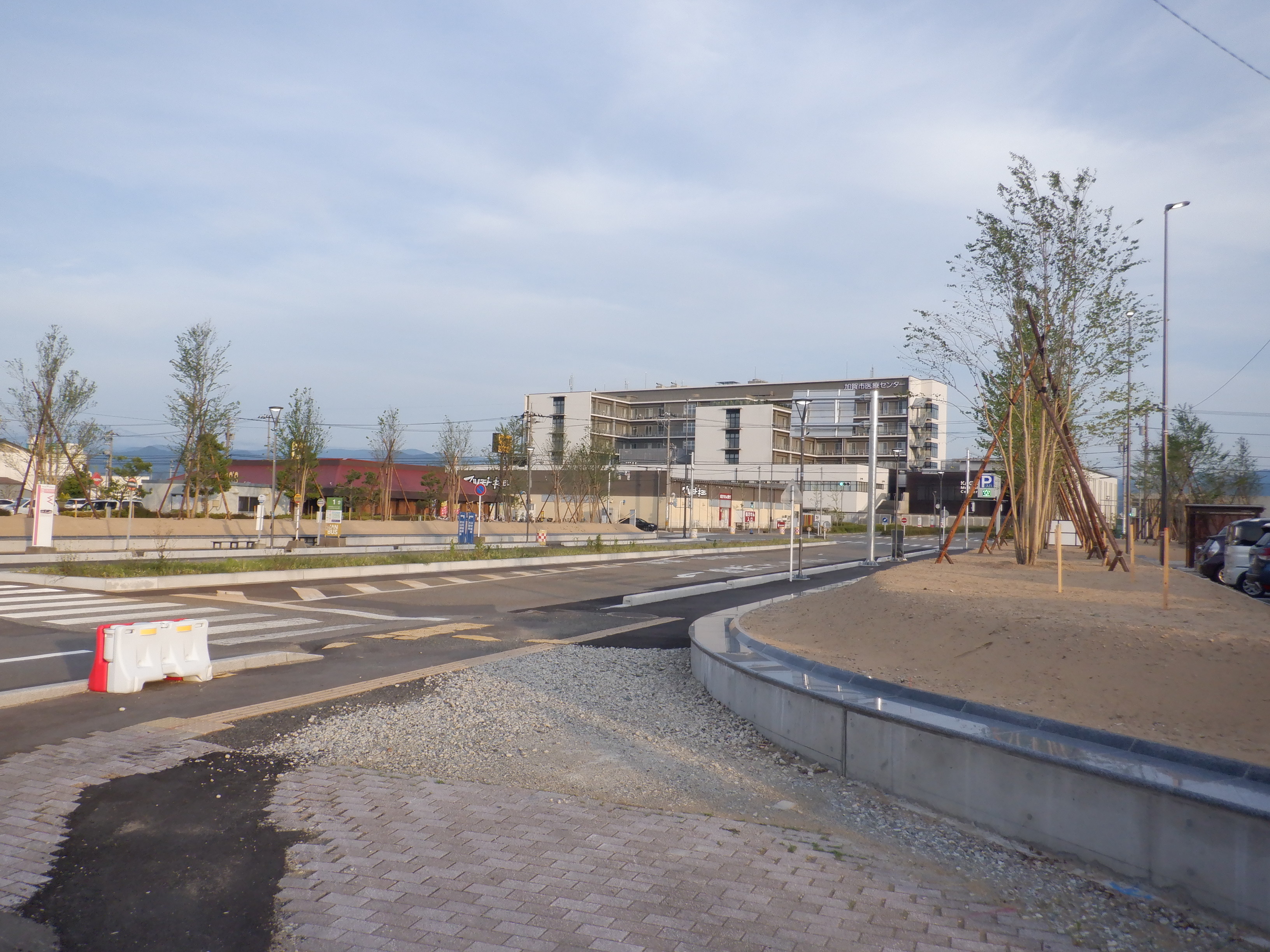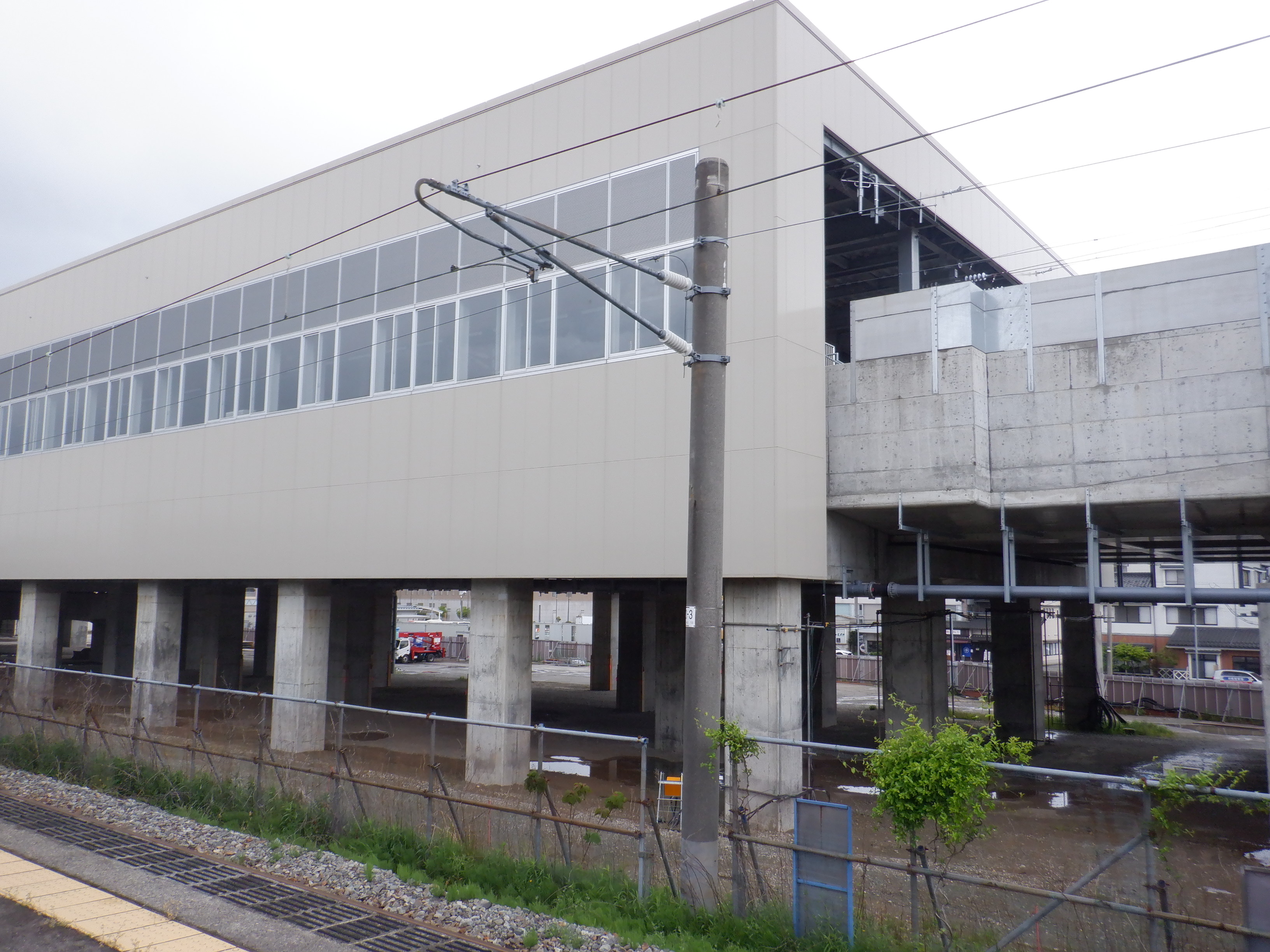 アルプラザの前のシェルターの工事が進んでいるように見えます。また、駅近くには商工会議所や北國銀行などが入るビルができていました。