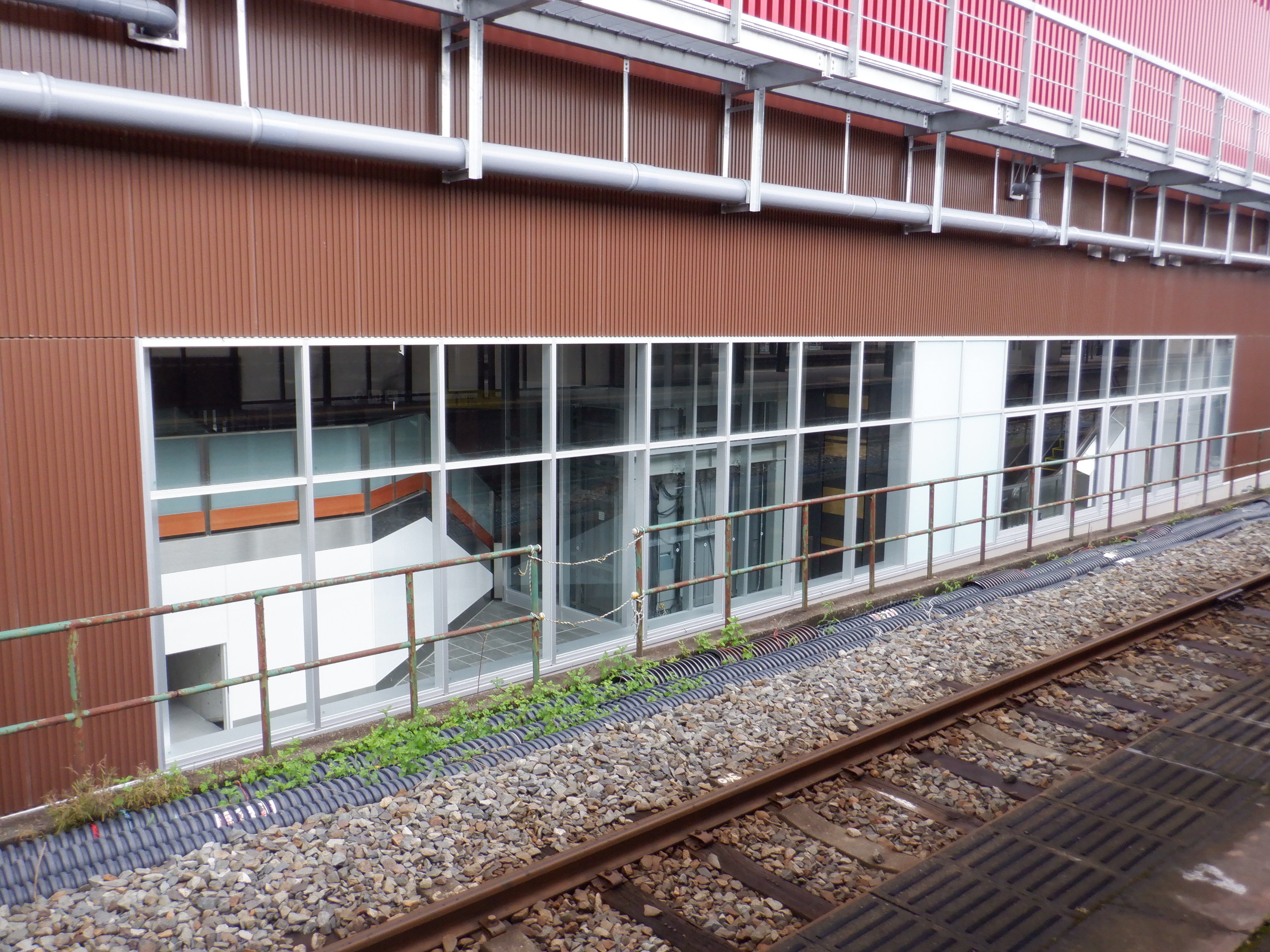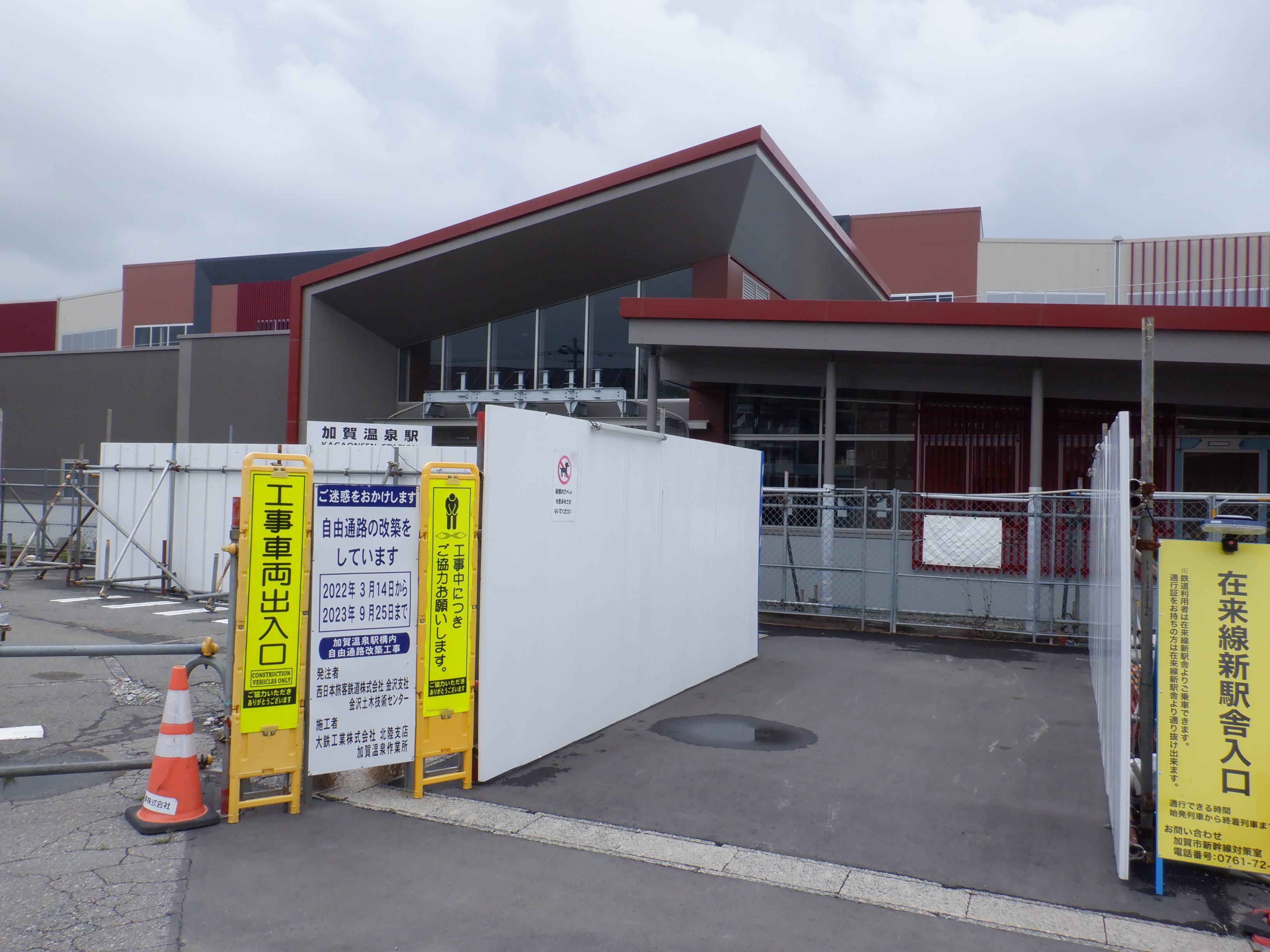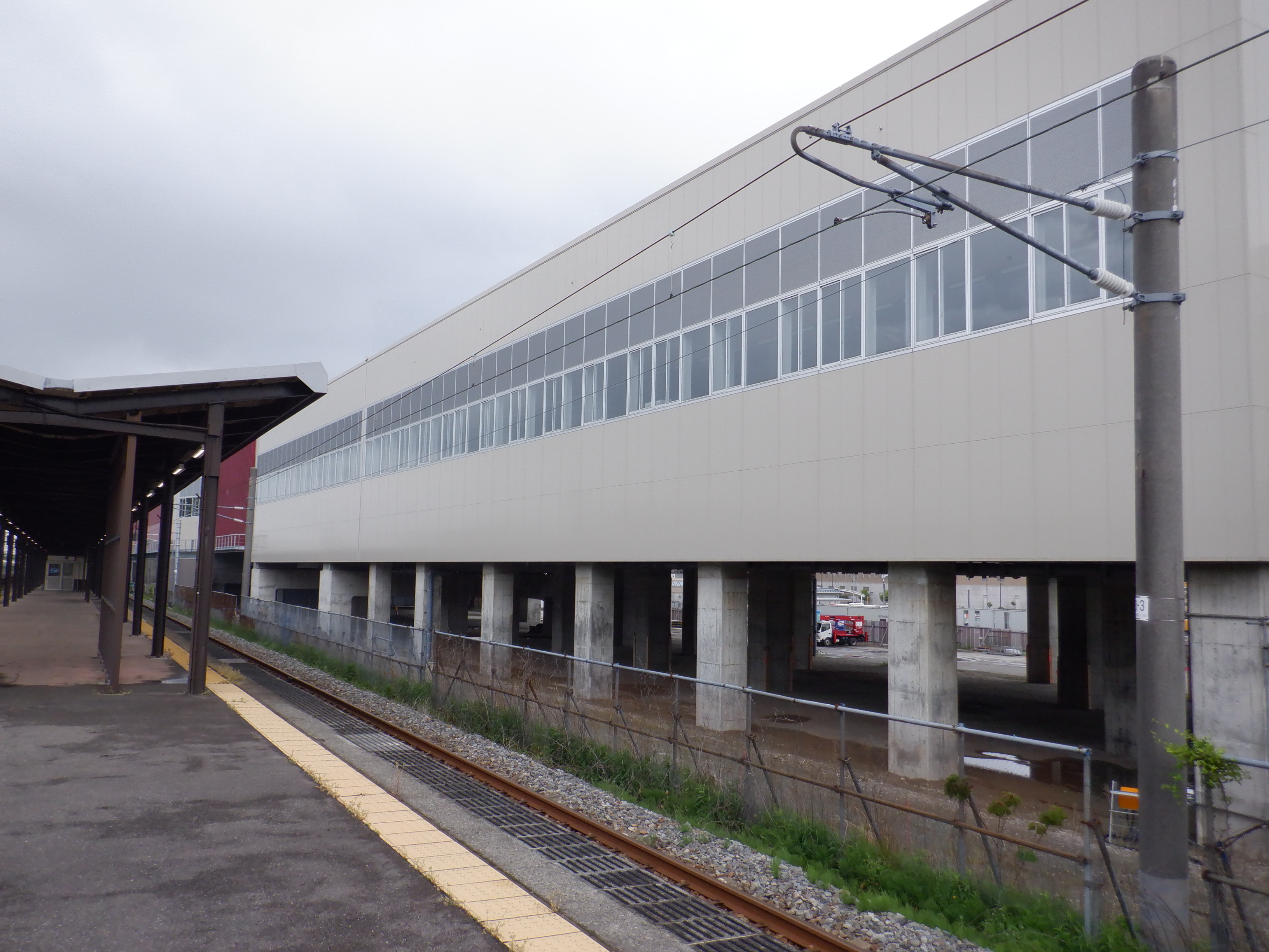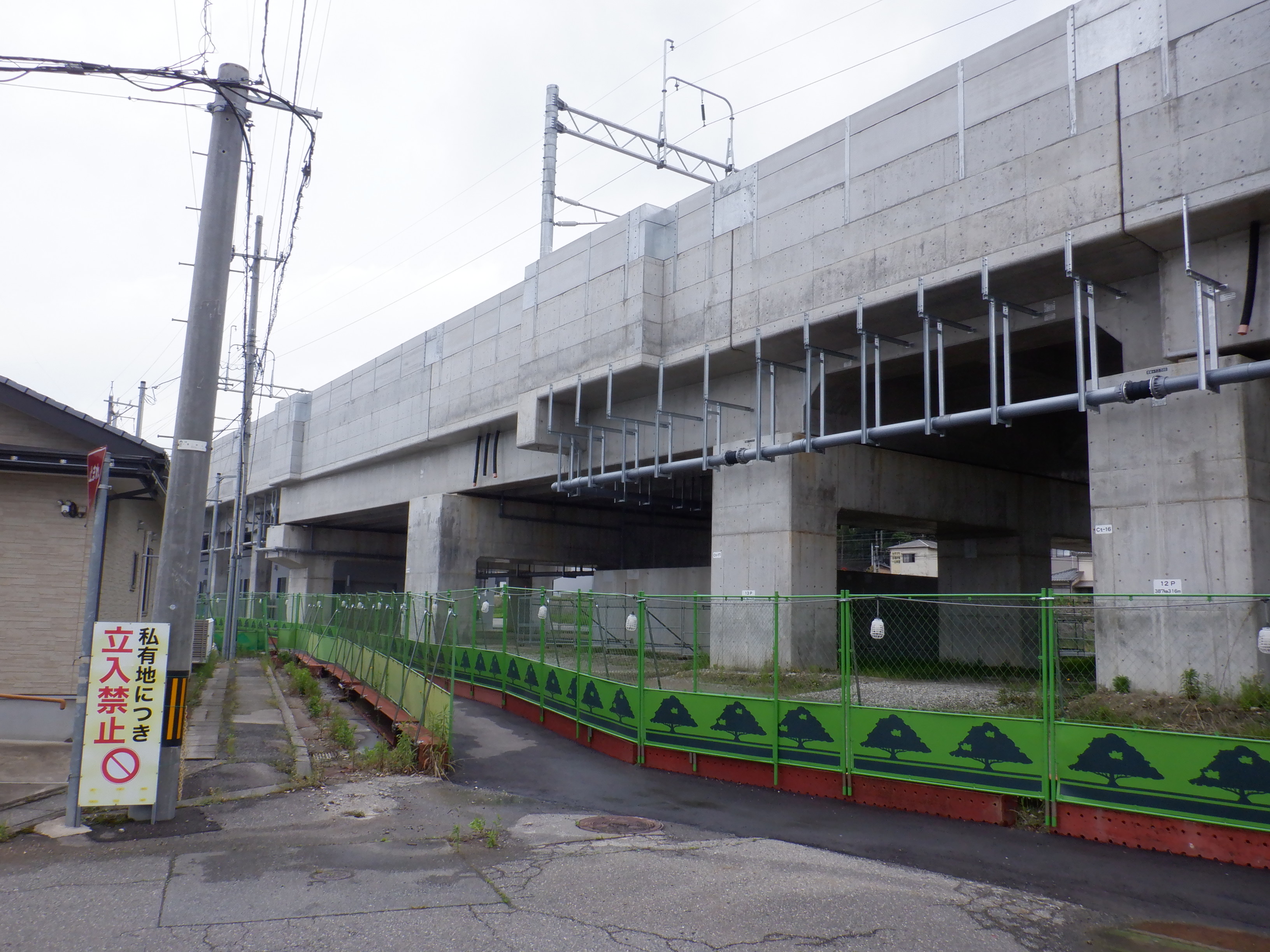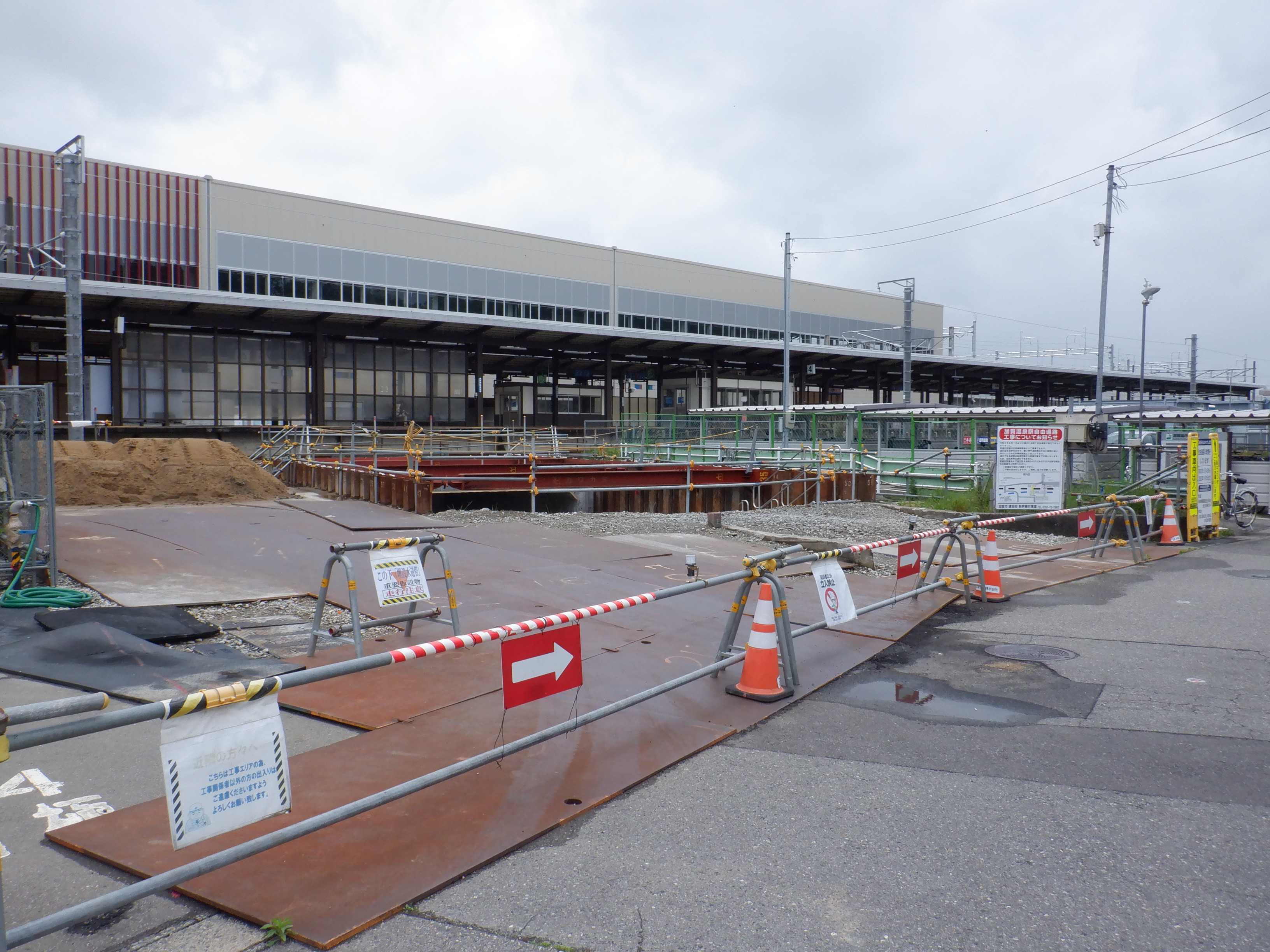 アルプラザ側のシェルター建設工事とそこから見た新幹線駅舎。