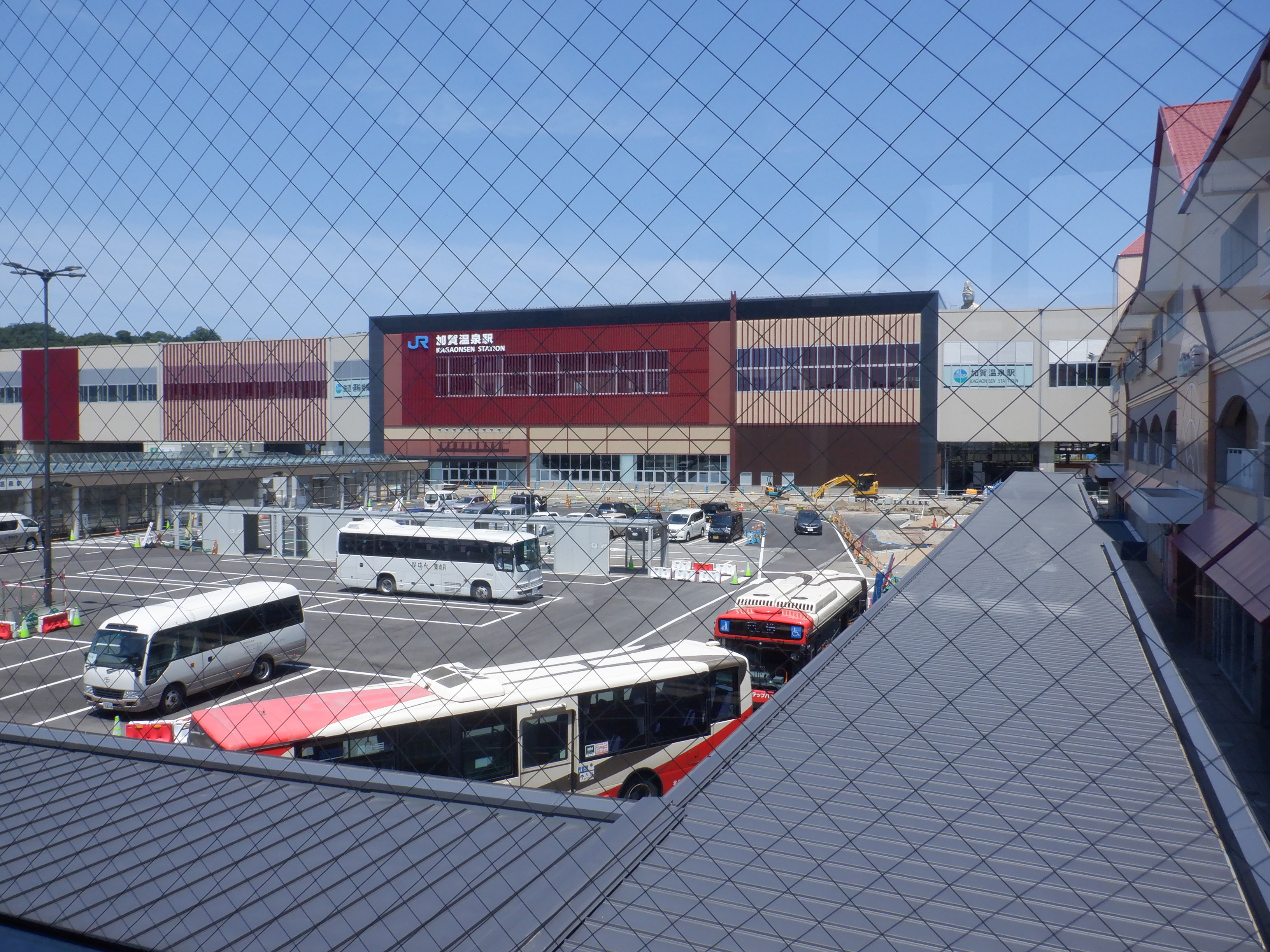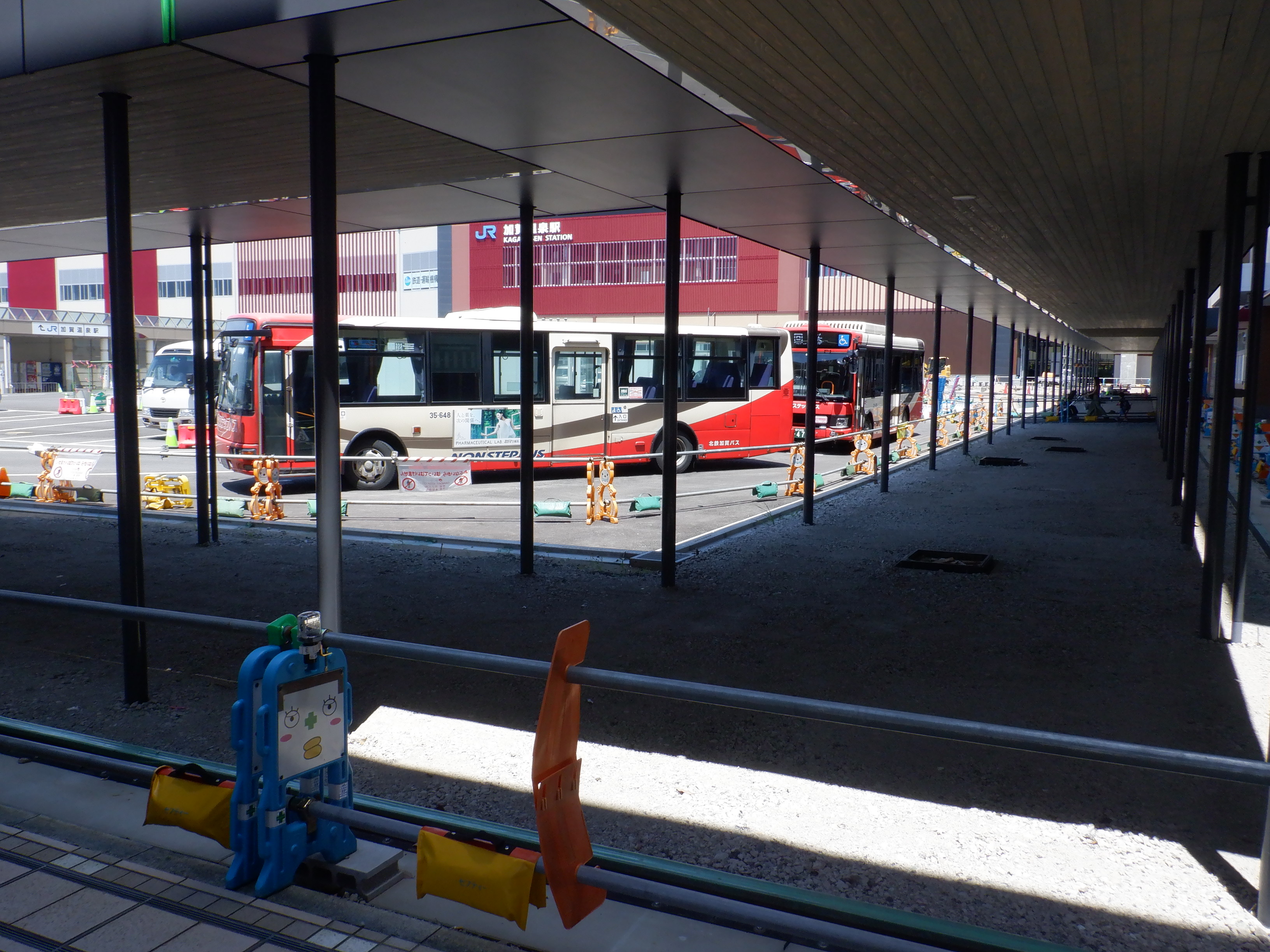 仮設駅舎のアルプラザ側の仮設バスのりばとそこから見た新幹線駅舎。