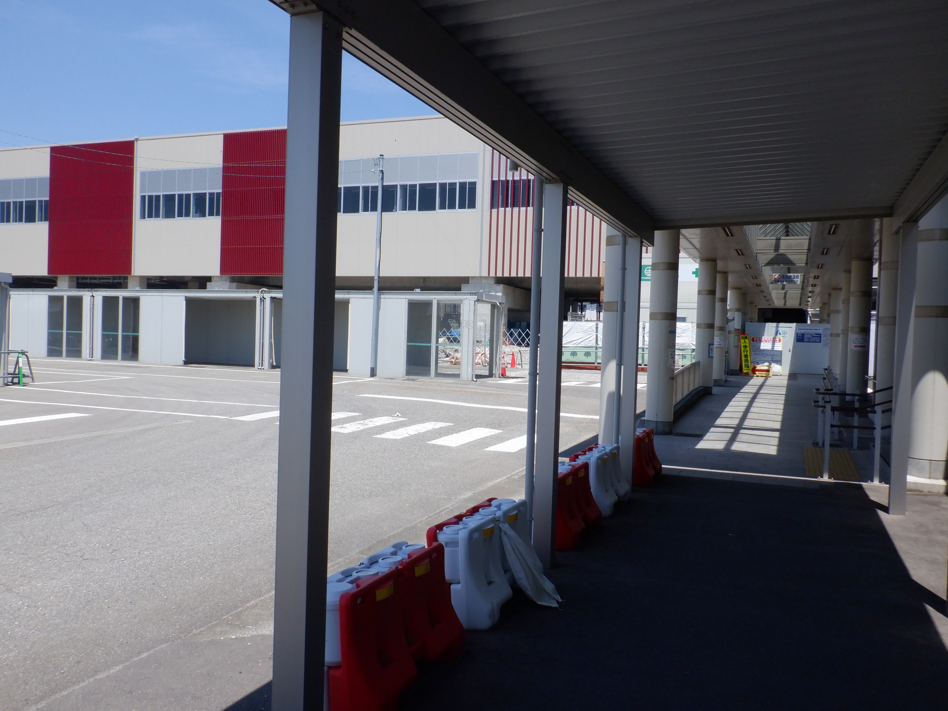 仮設駅舎のアルプラザ側の仮設バス停とそこから見た新幹線駅舎。