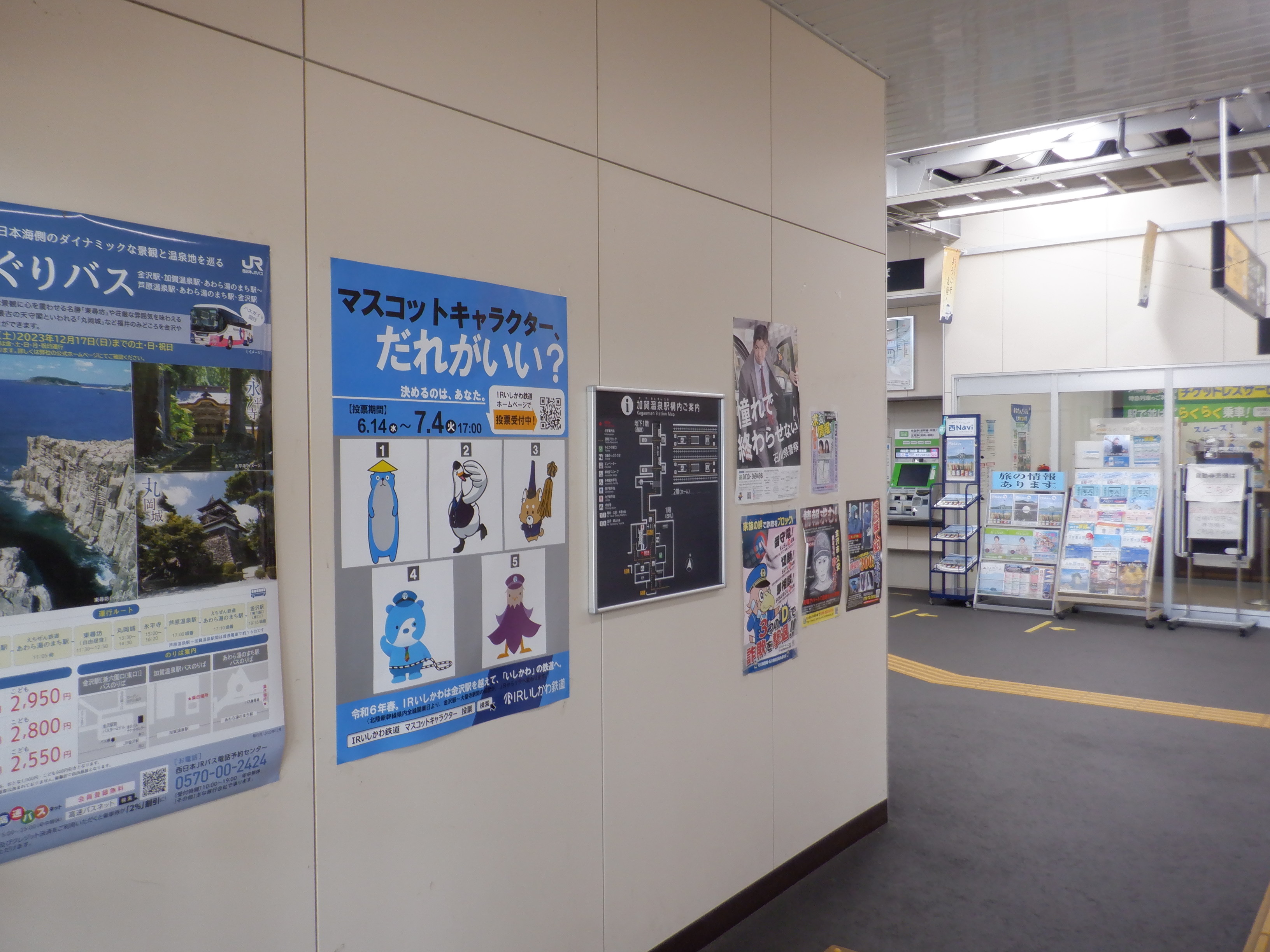 仮設駅舎内にはIRいしかわ鉄道のマスコットキャラクター投票のポスターが貼られていました。