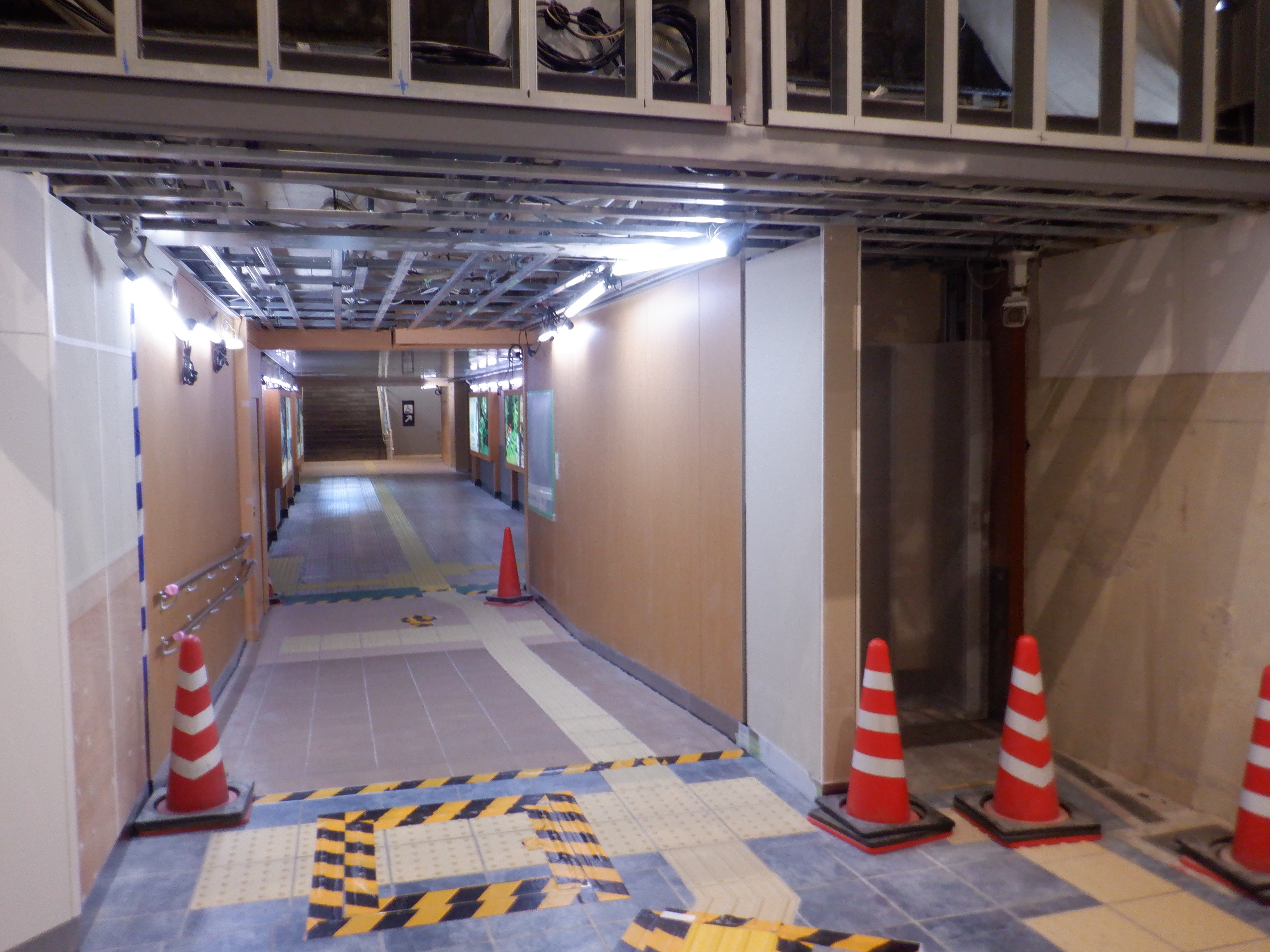 北口から見た自由通路再建設中の様子。一旦この形で地下道の階段が暫定供用されます。