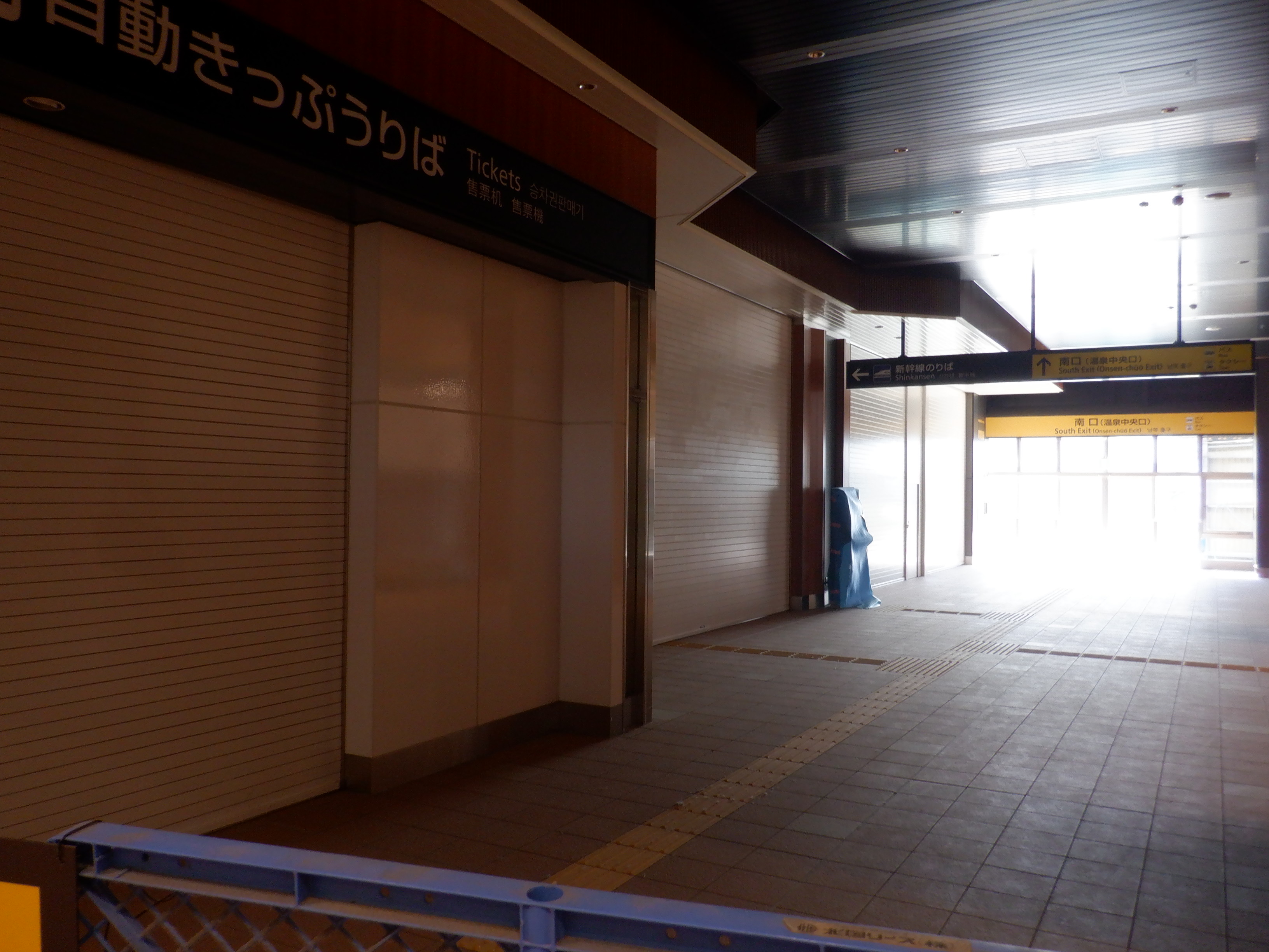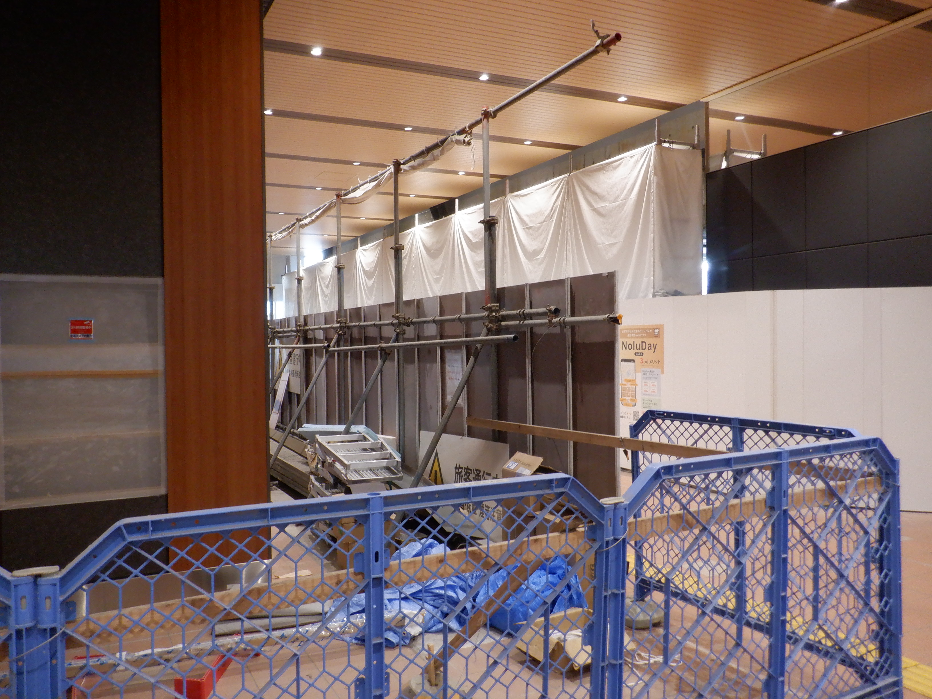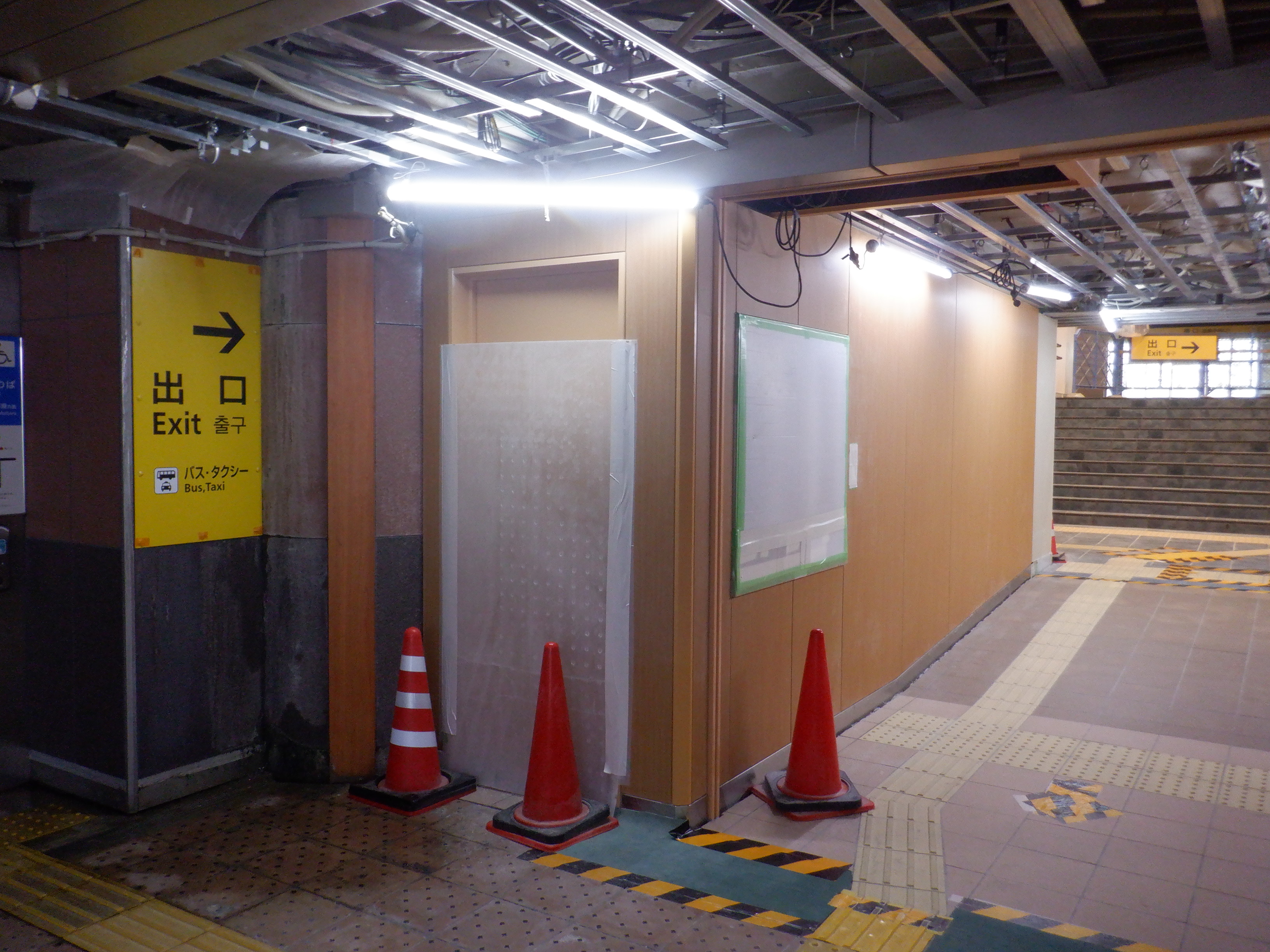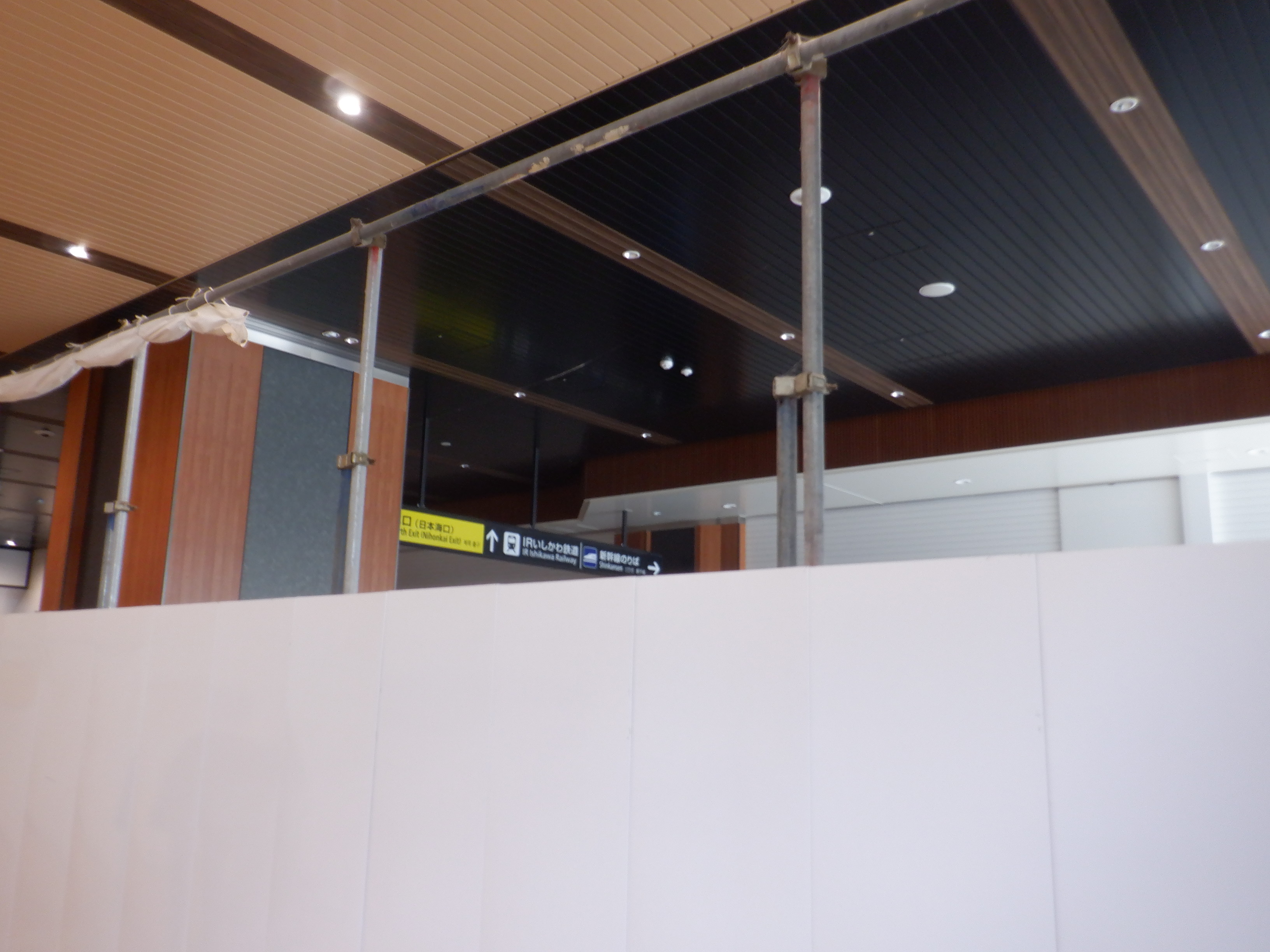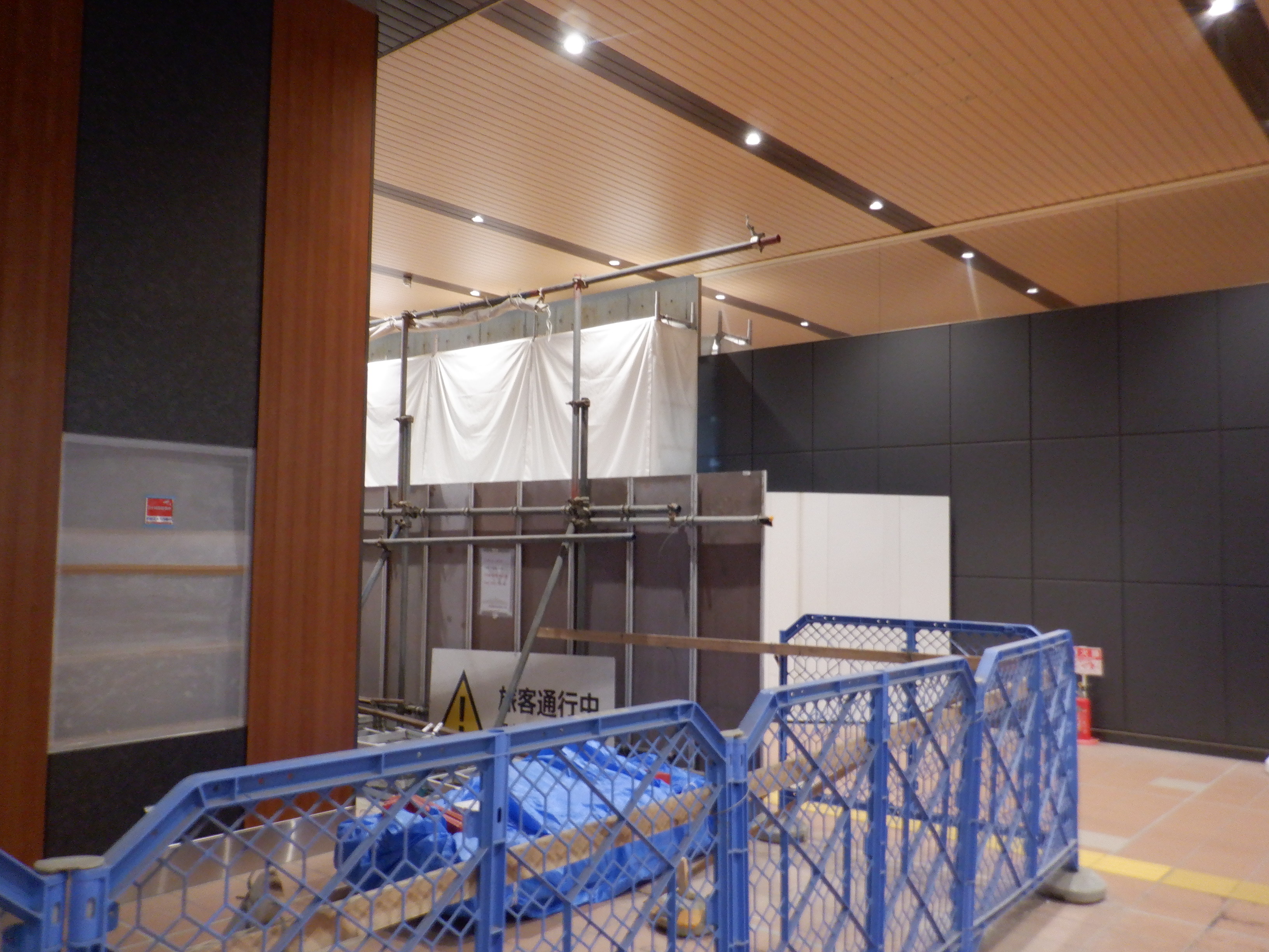 北口への地下自由通路への通路だったところにコンビニ・待合室等の建設工事の標示がされました。工期は新幹線開業時期を跨ぎます。