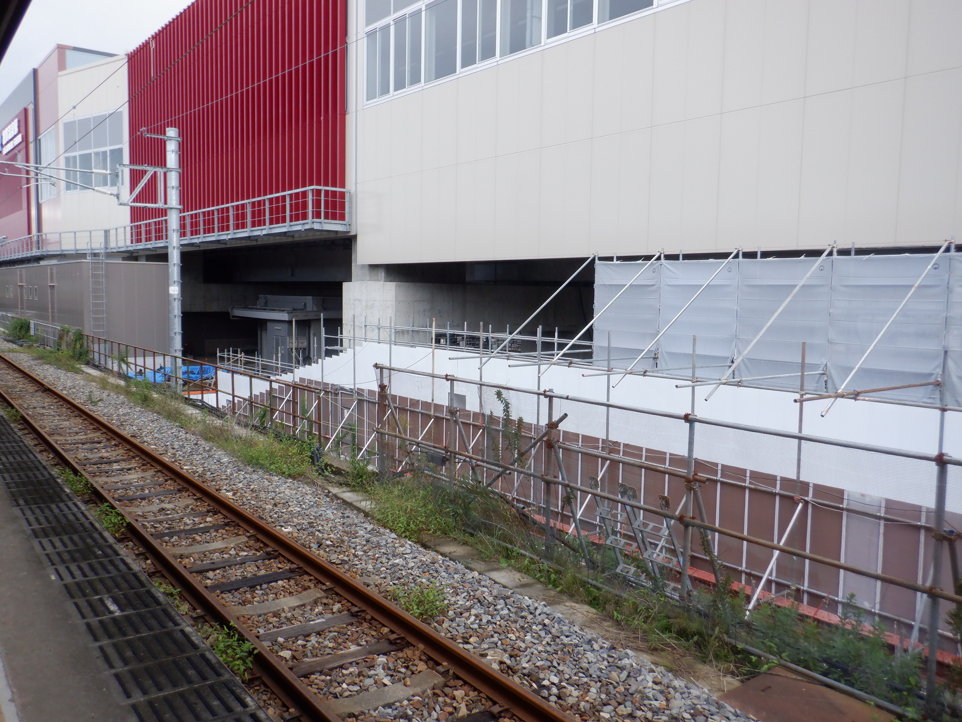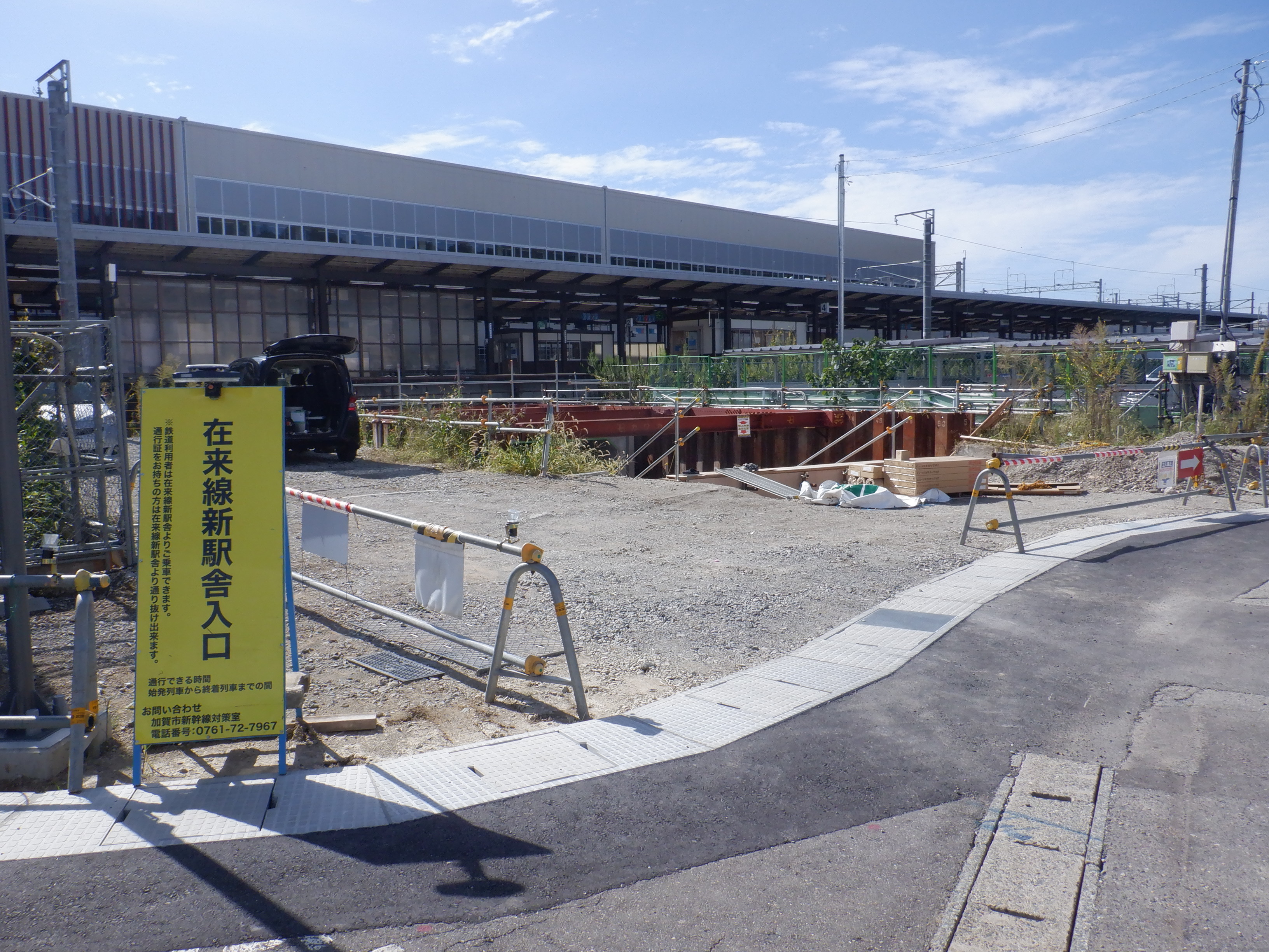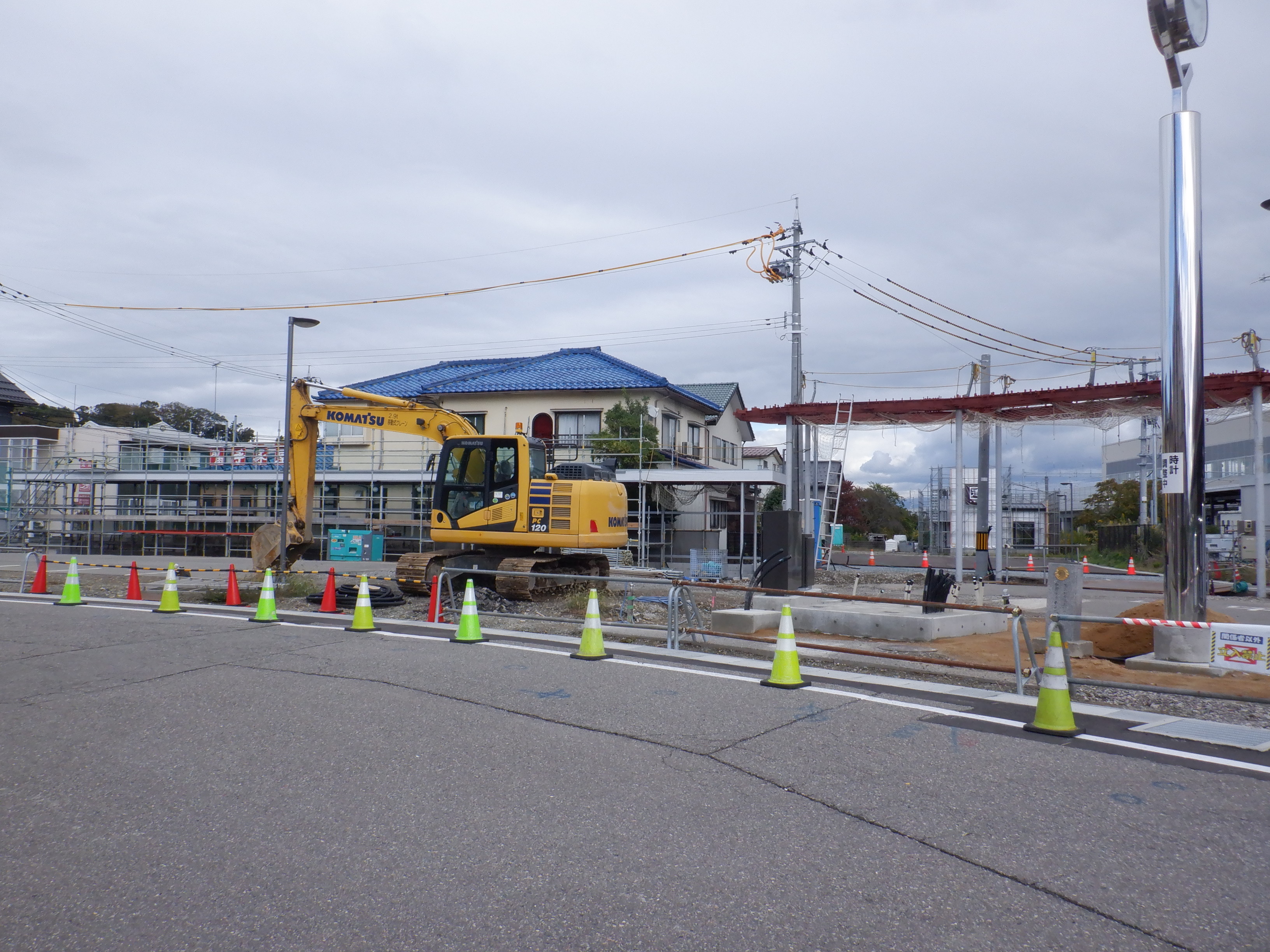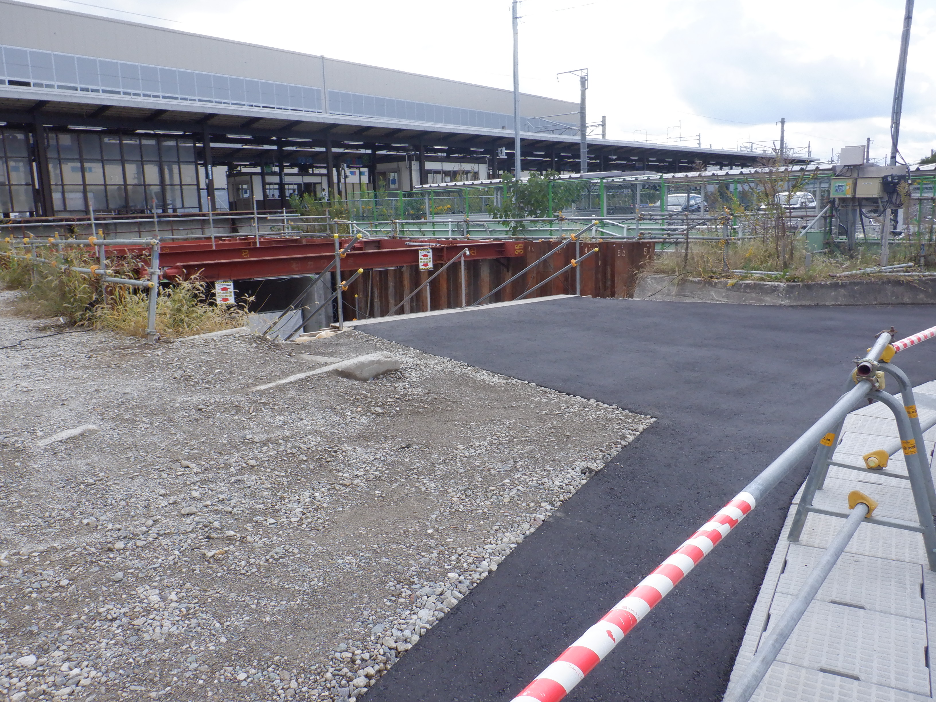 暫定北口を通るのがこの10月いっぱいということが案内されていました。それに向けて、コンビニ・待合室等建設中のそばが少し変化してきています。