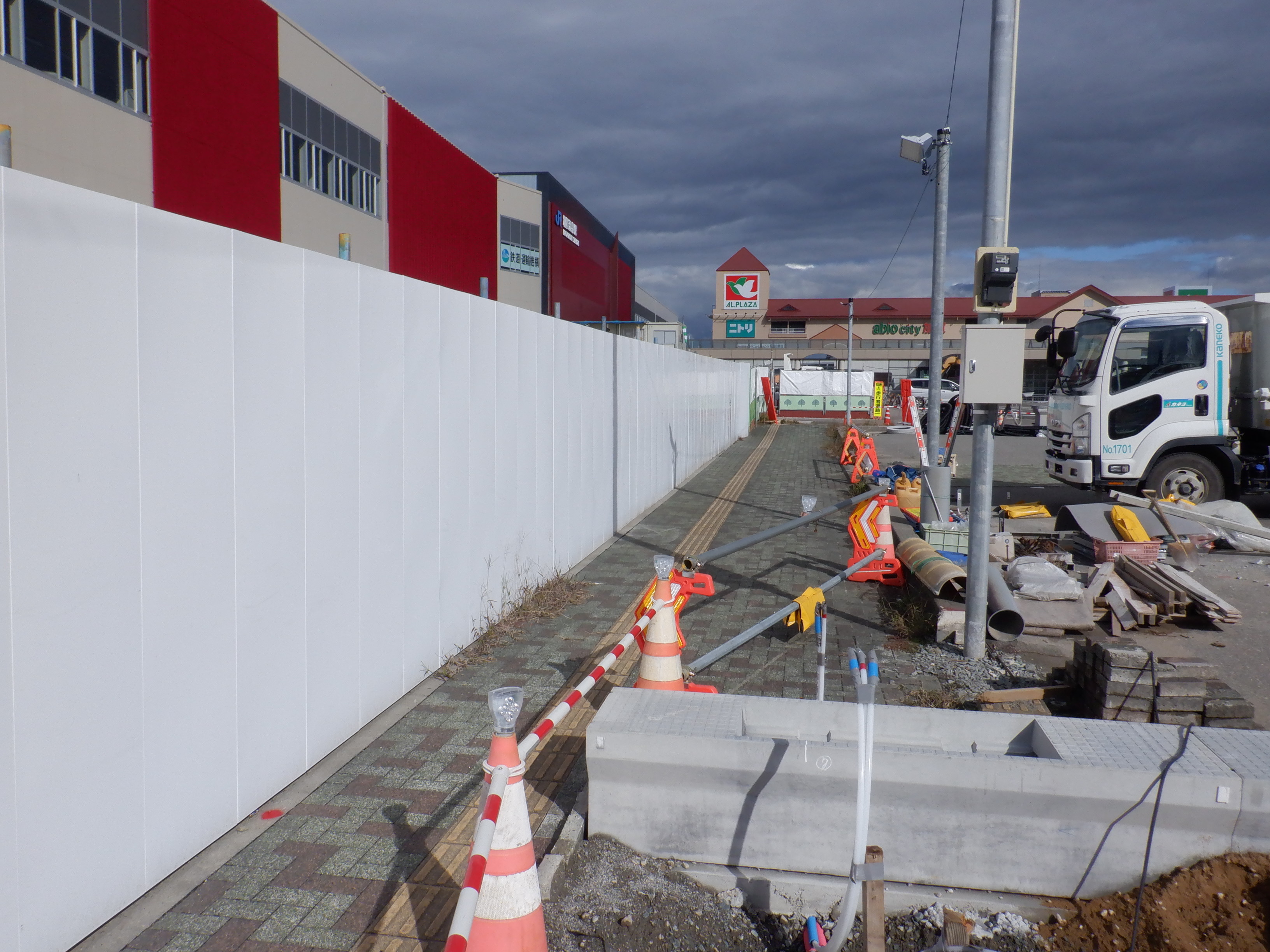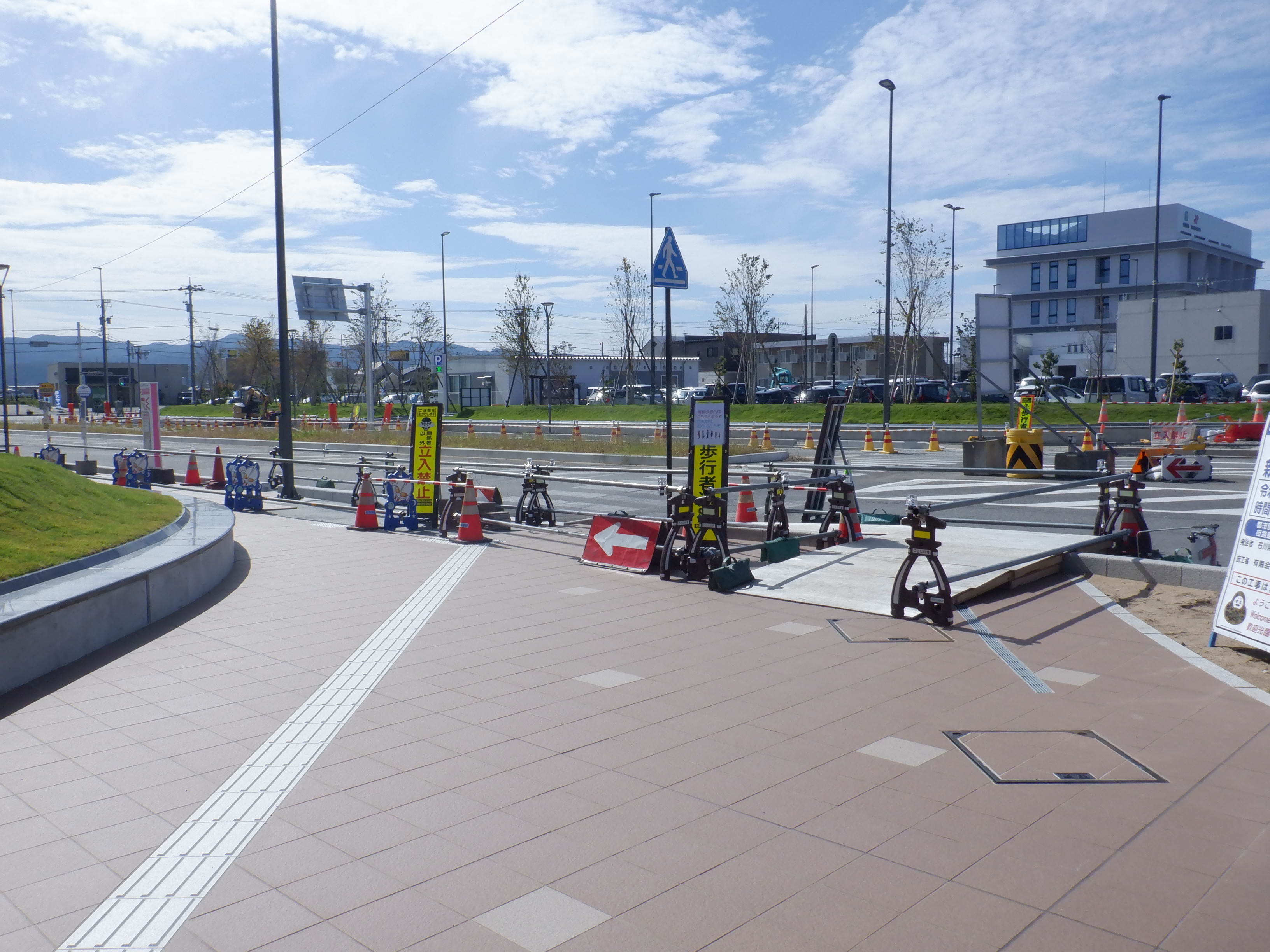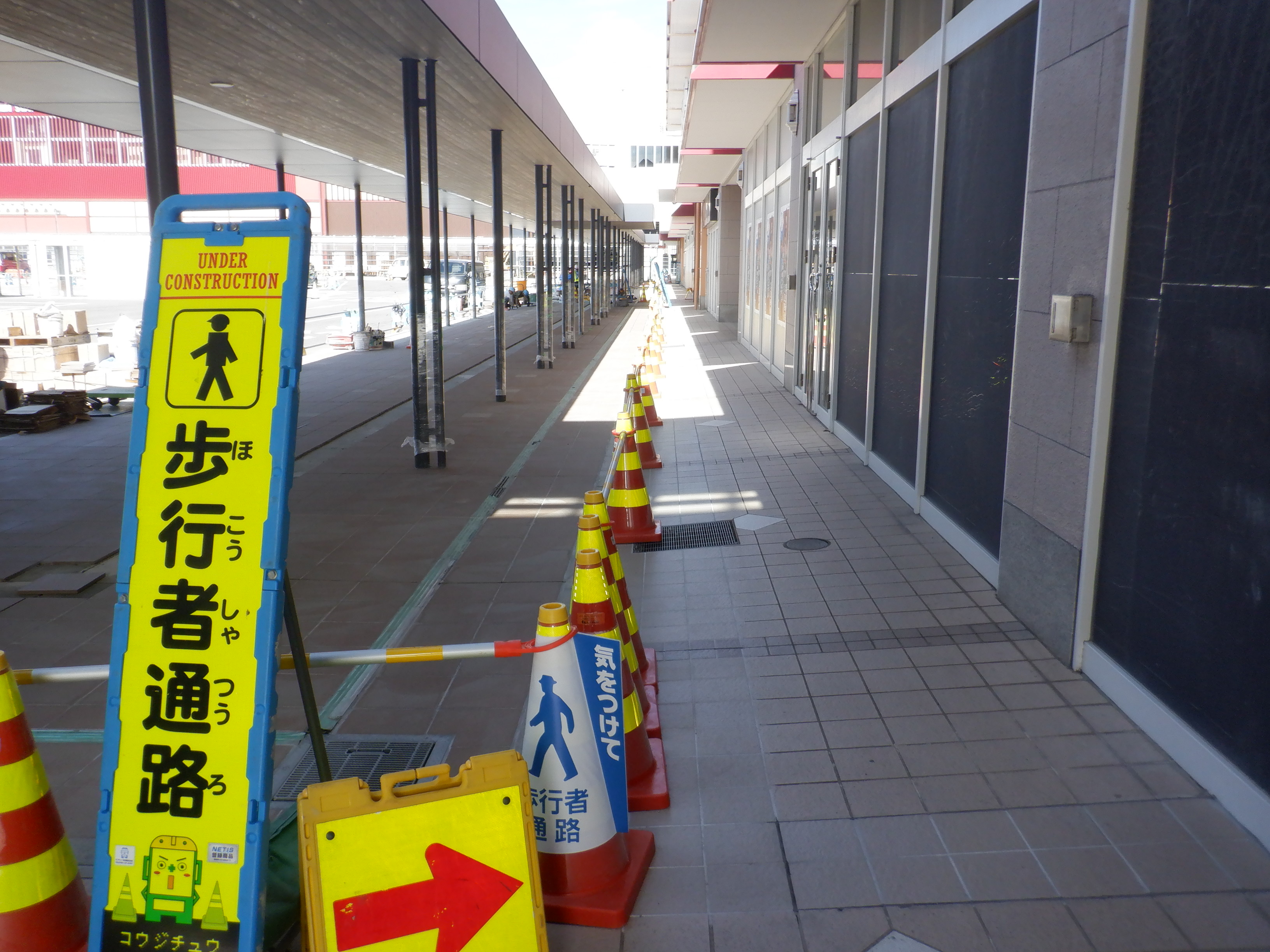 正面付近と、正面の道路のアルプラザ側の歩道が整備されたところ。