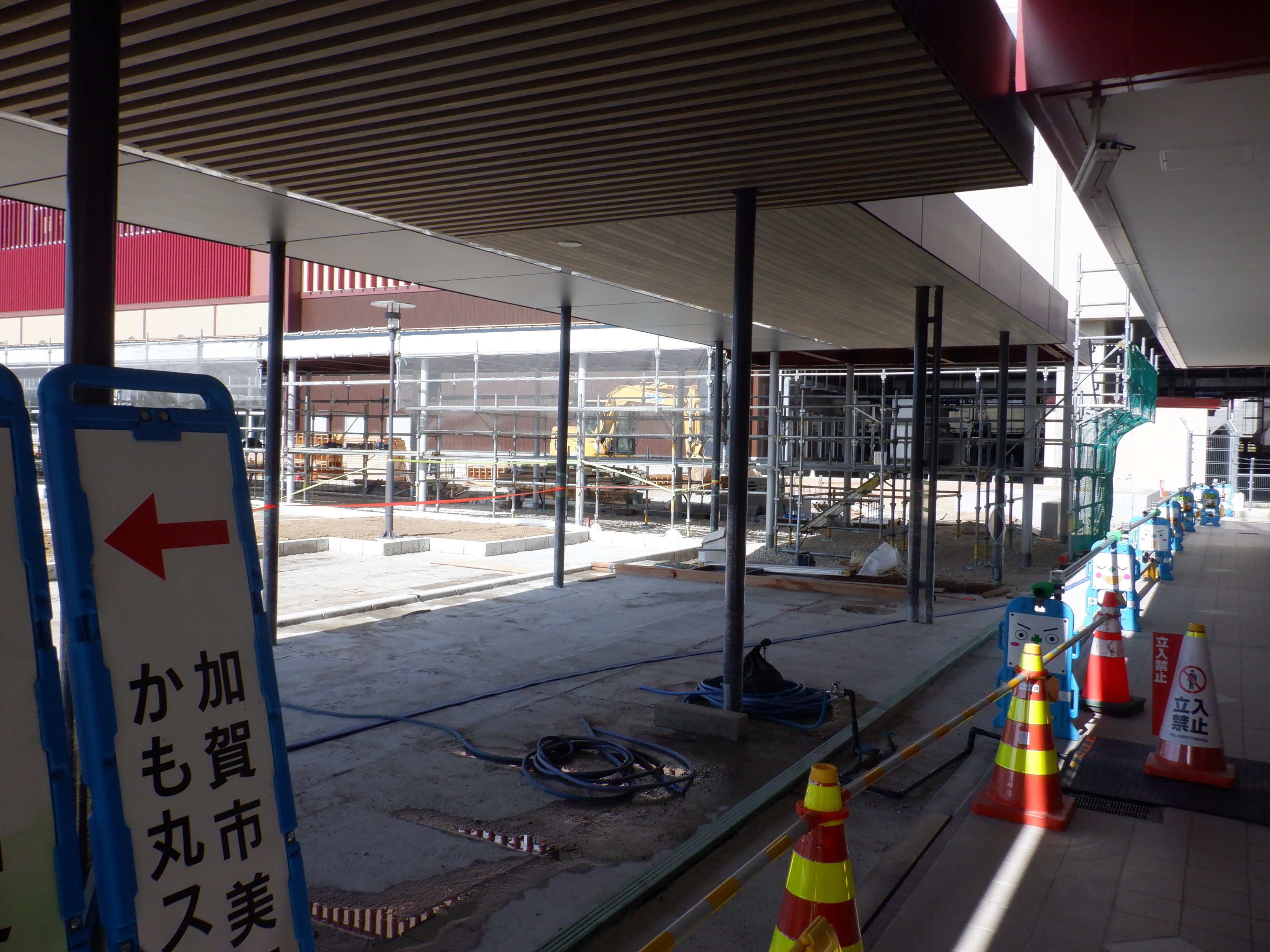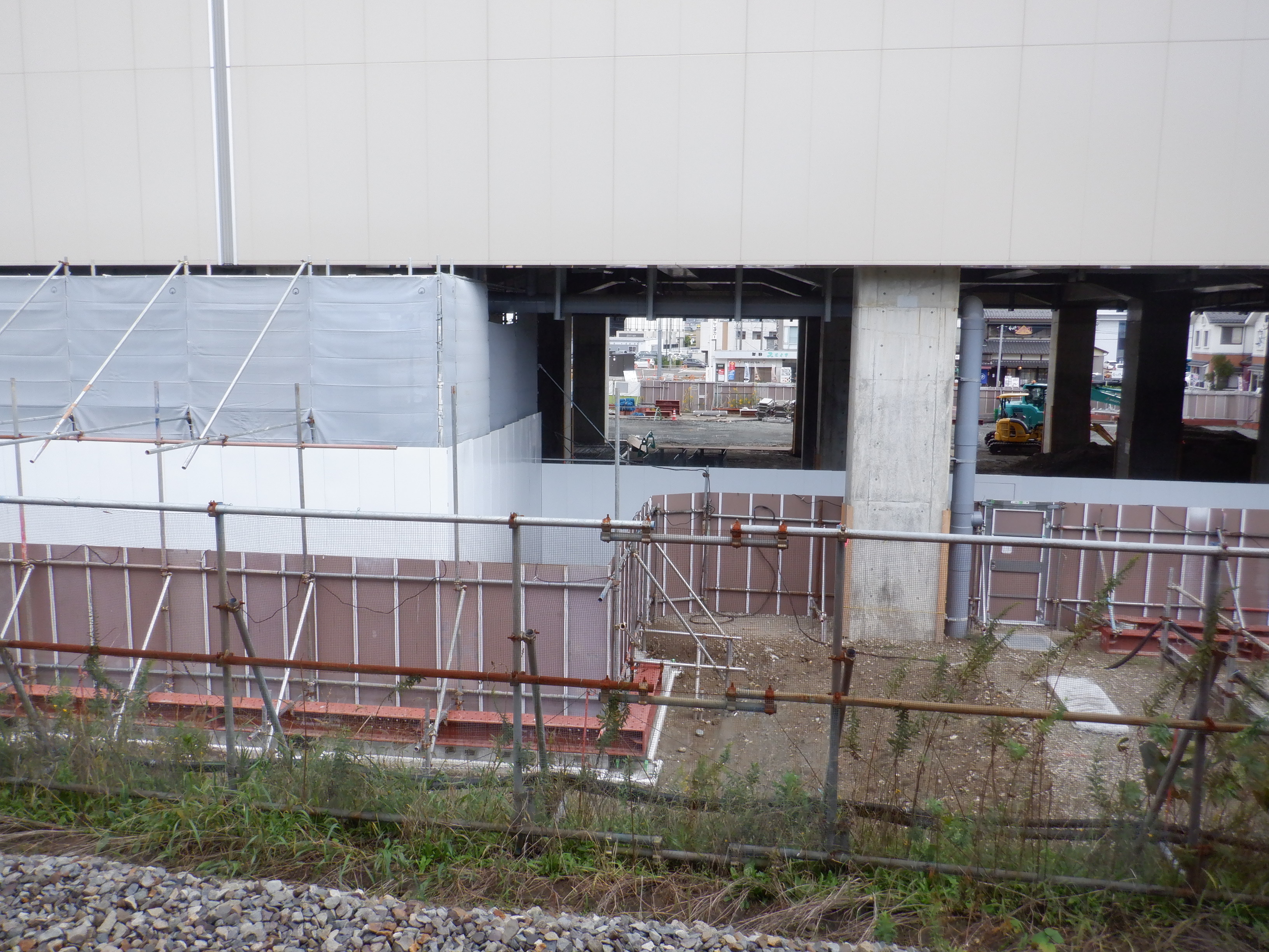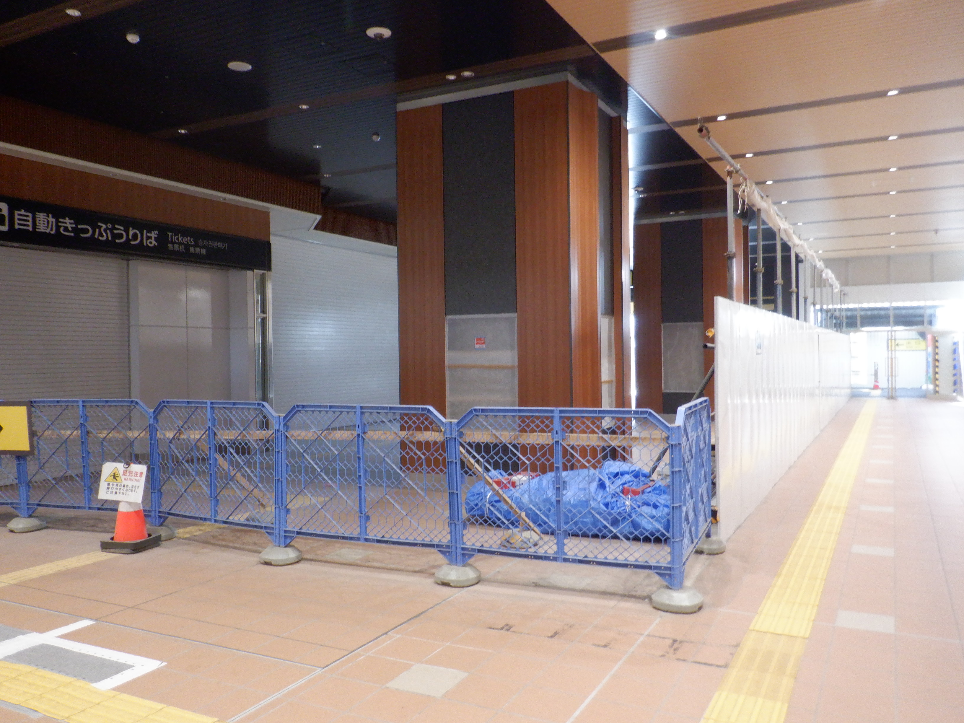 1・2番のりばから見た地下自由通路を再建設中のところとコンビニ・待合室等を建設中のところ。囲いができはじめています。