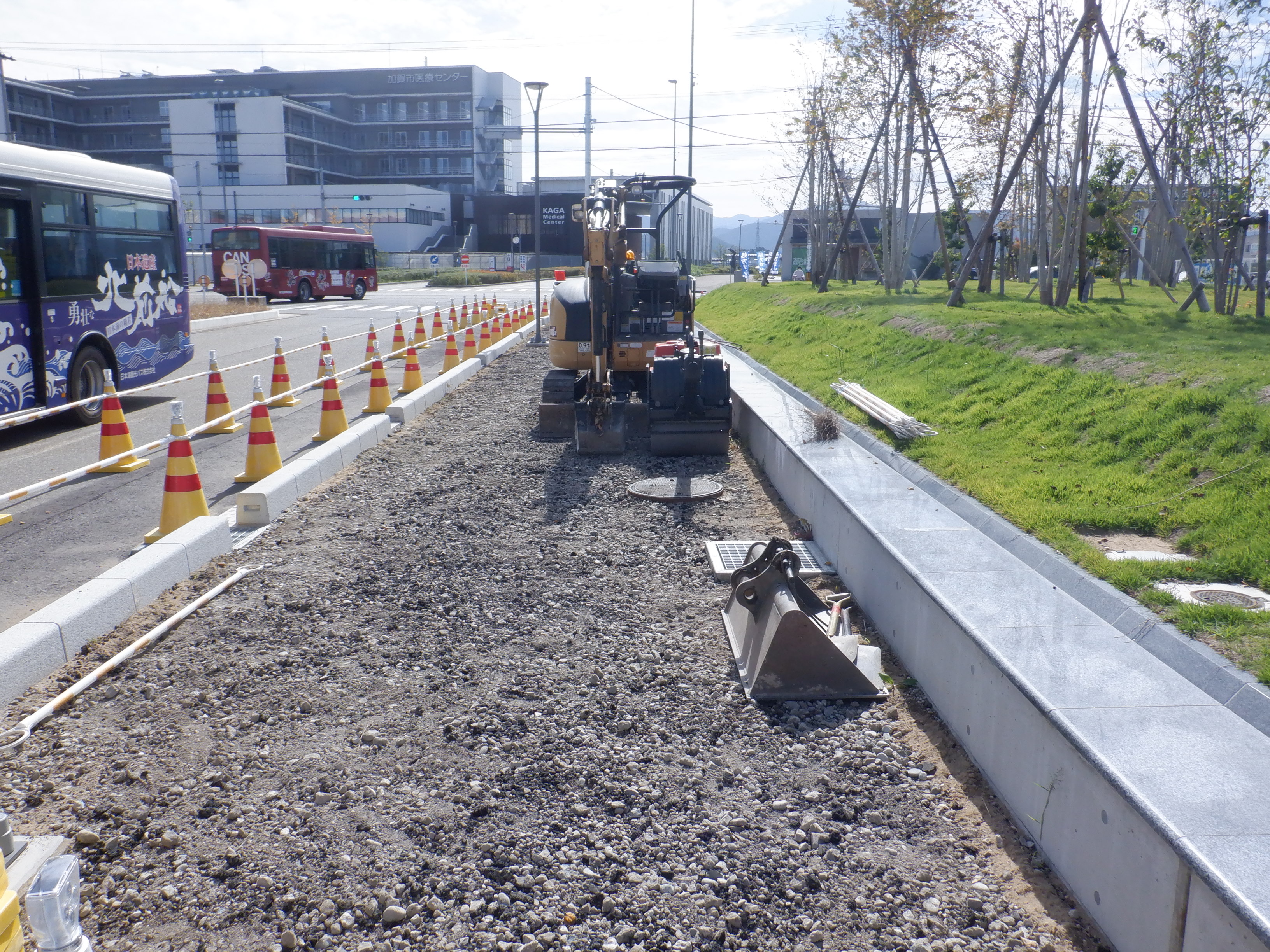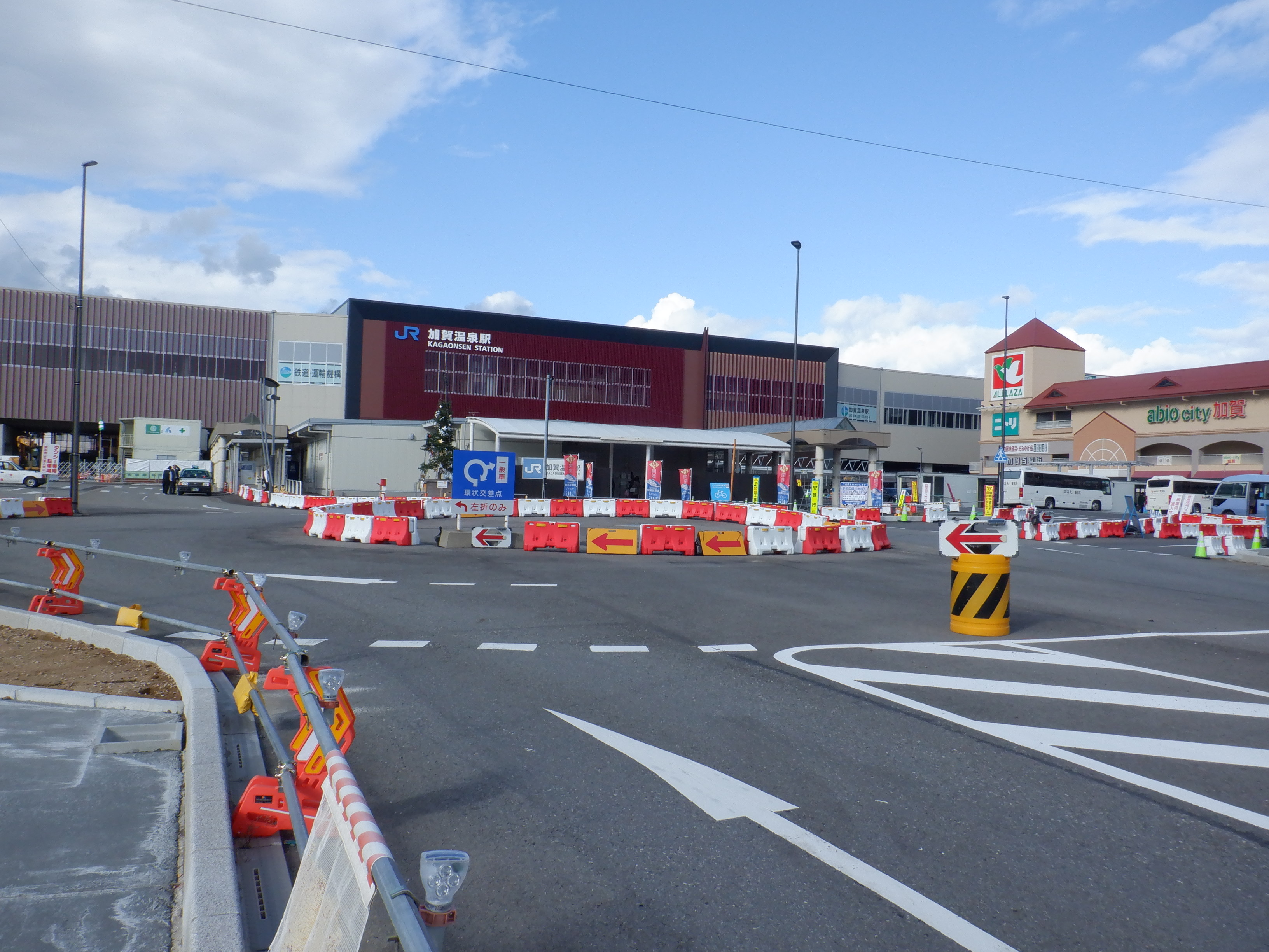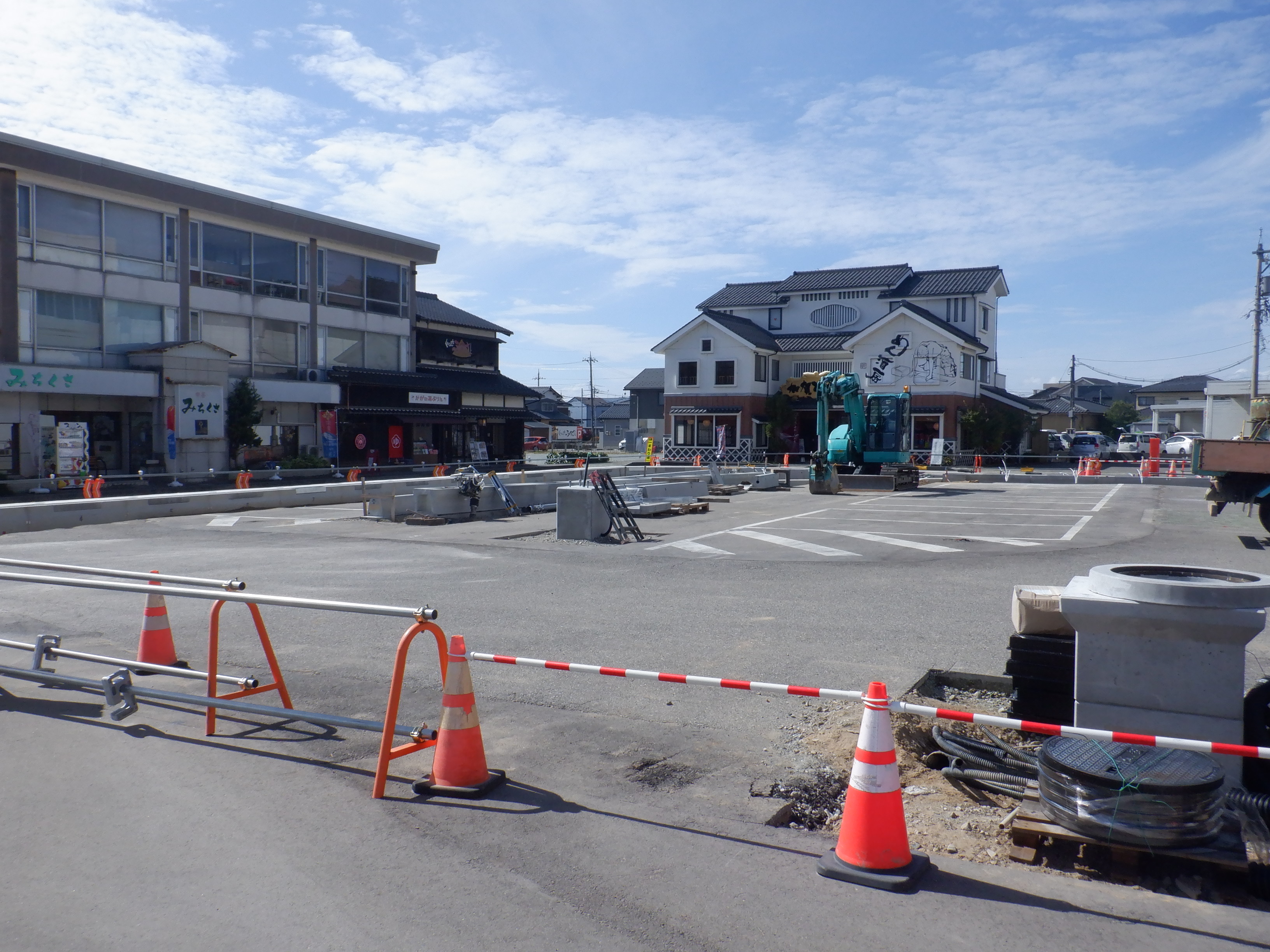 駅正面の道路、駐車場側の歩道工事が始まっています。環状交差点の青看板など。