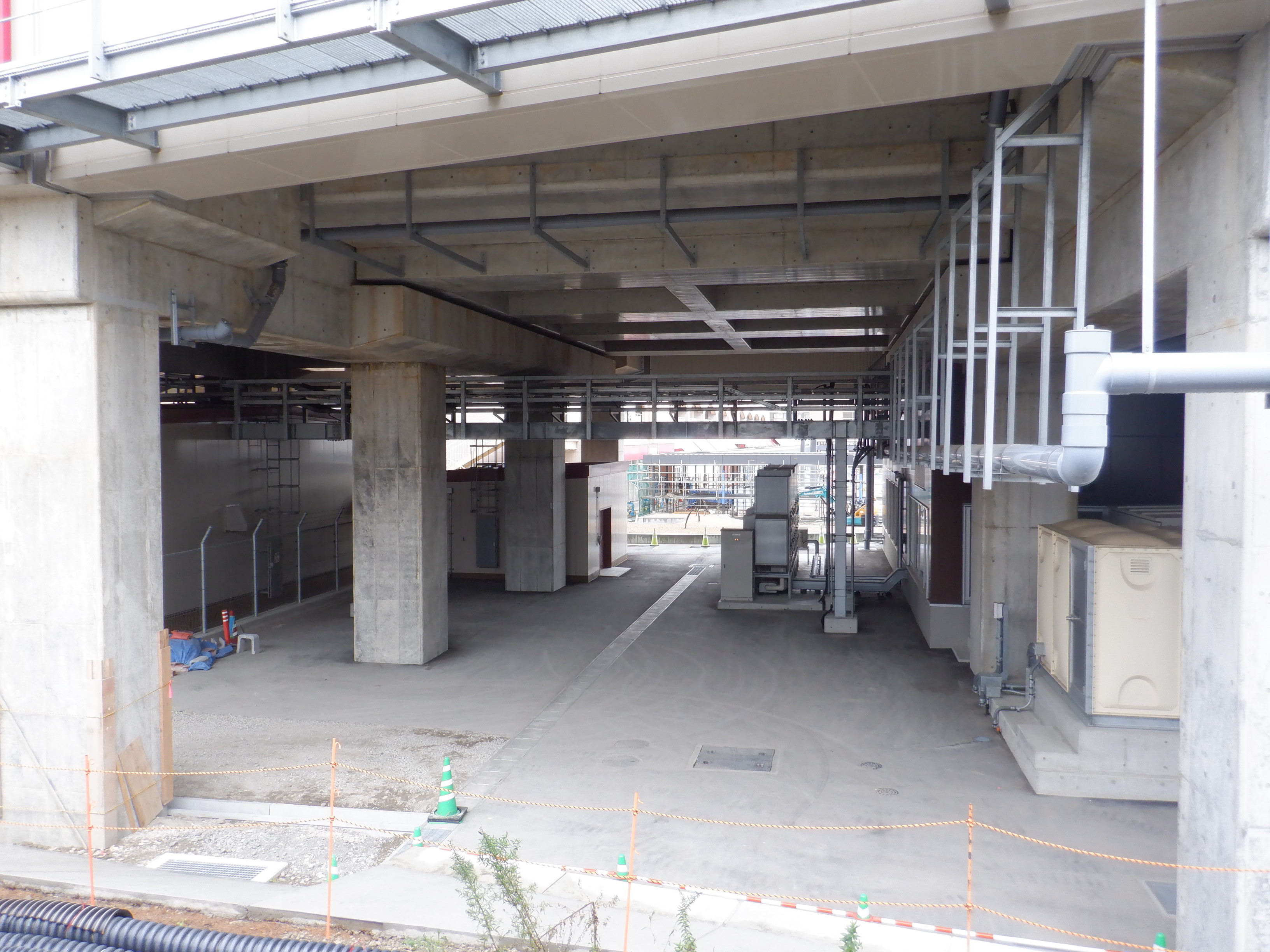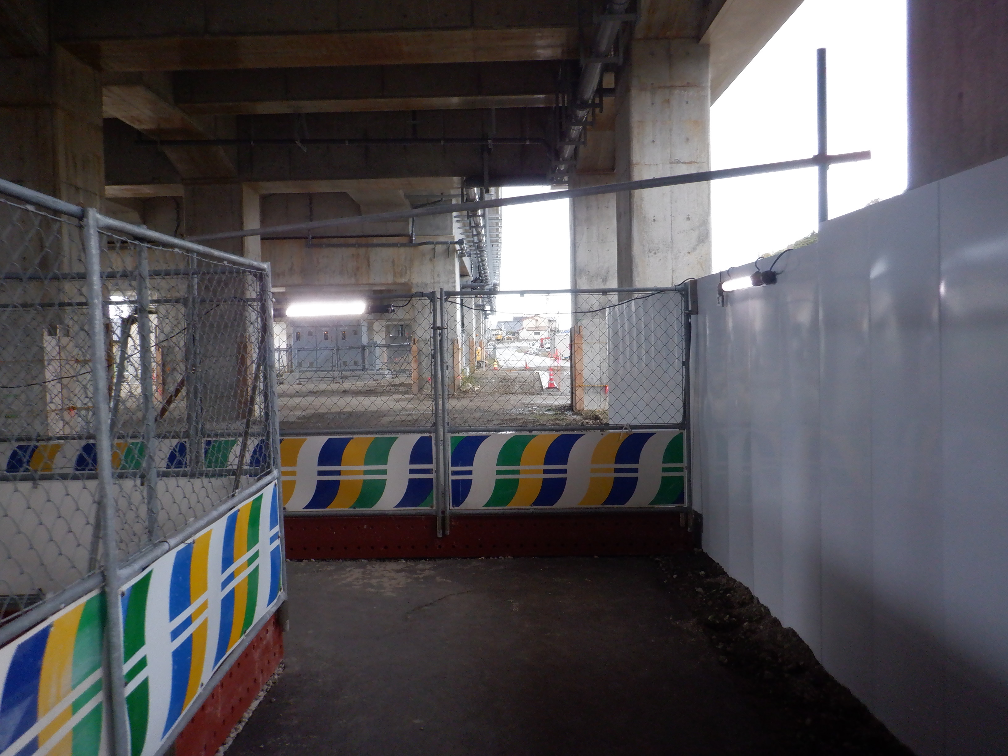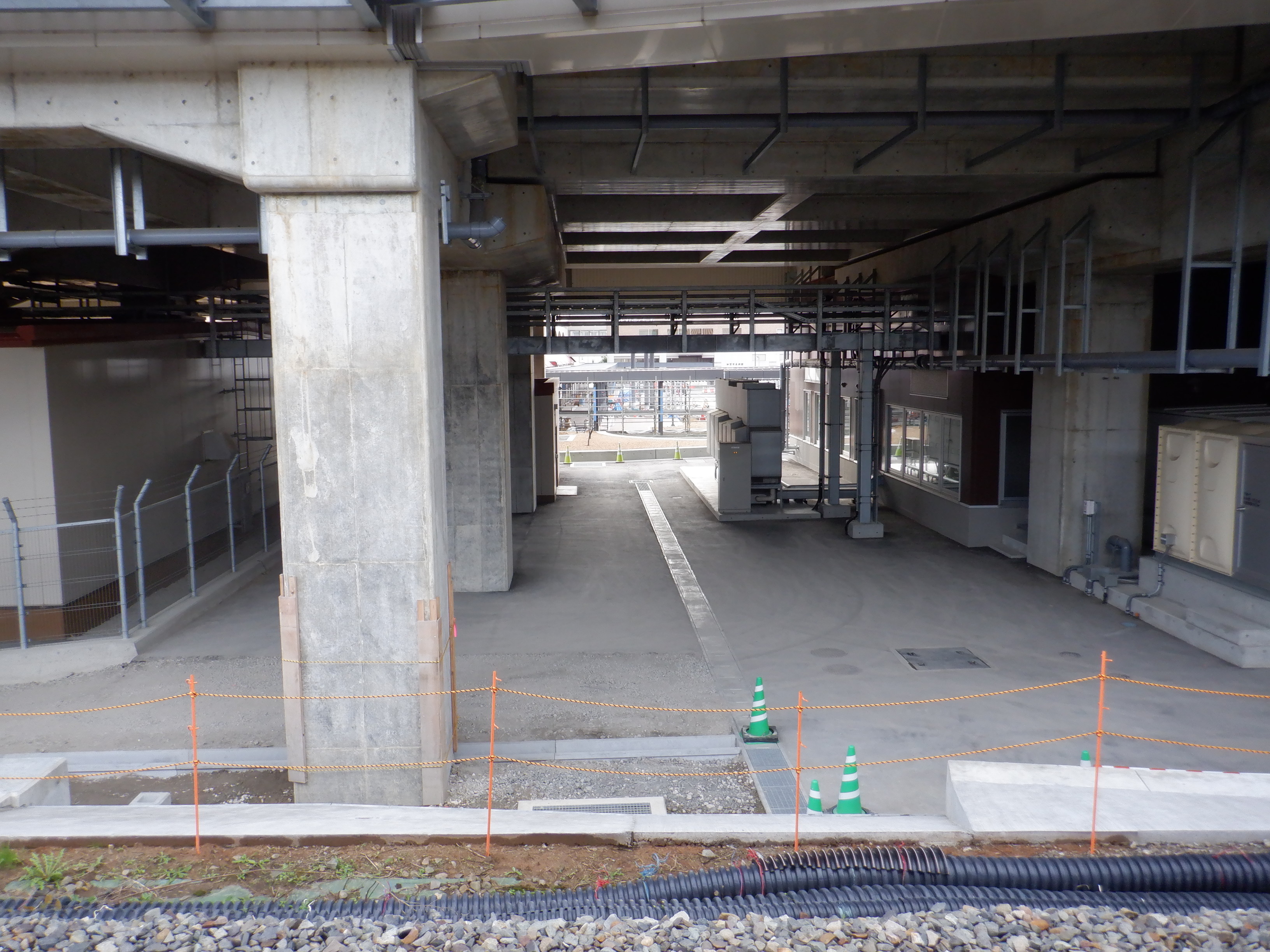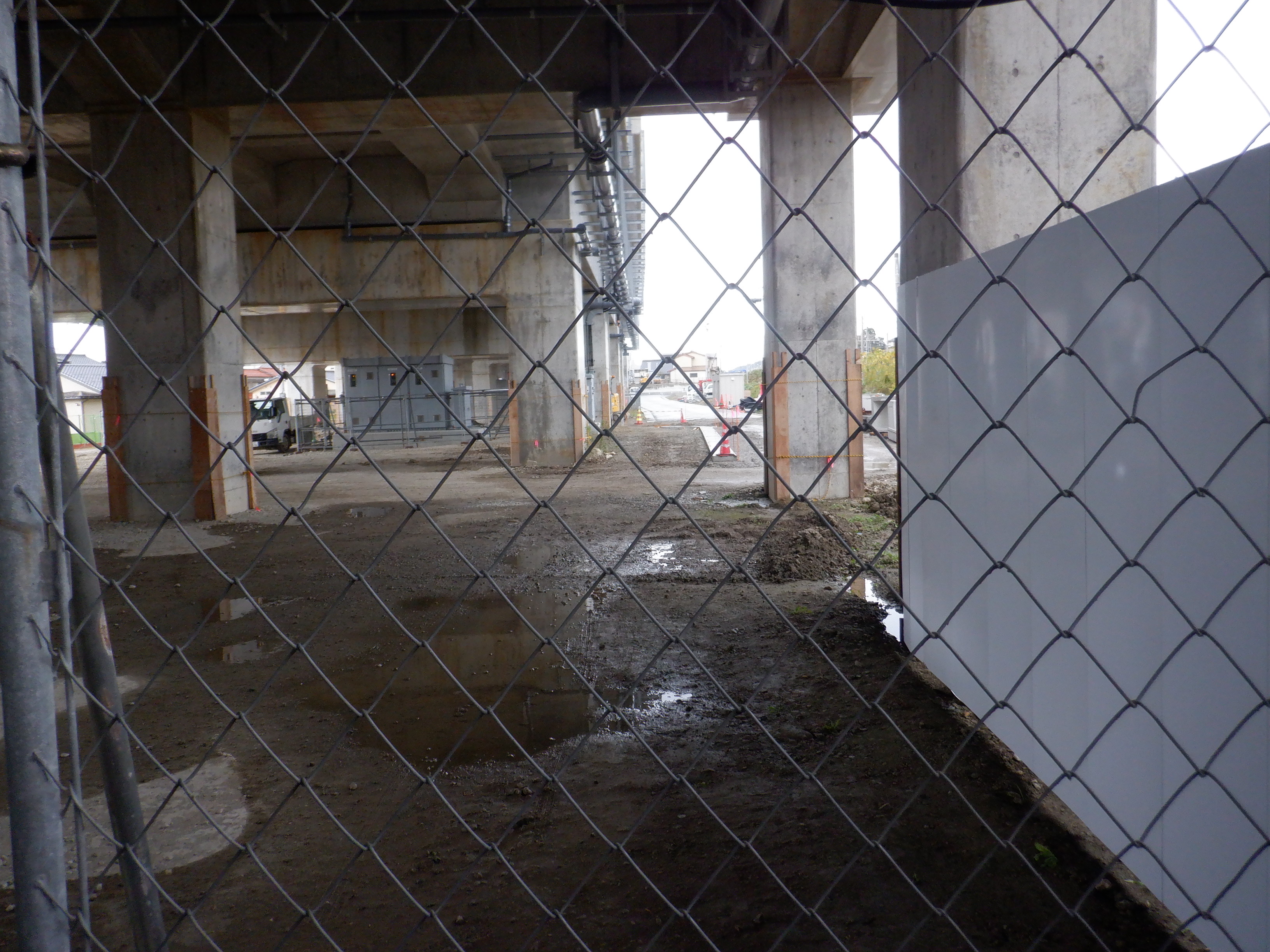 迂回路入口から見た高架下部都市施設(コンビニ・待合室等)建設中の様子。