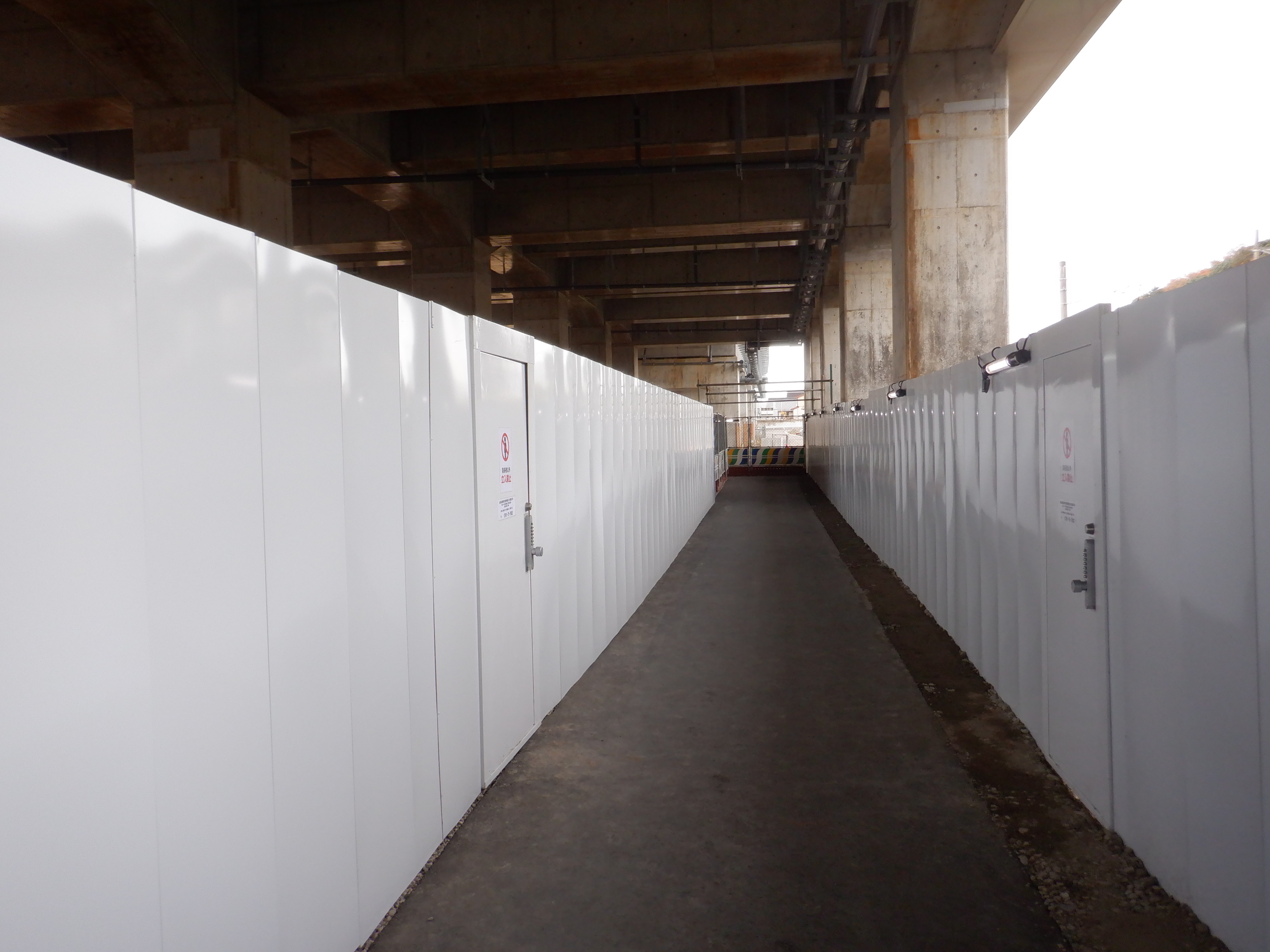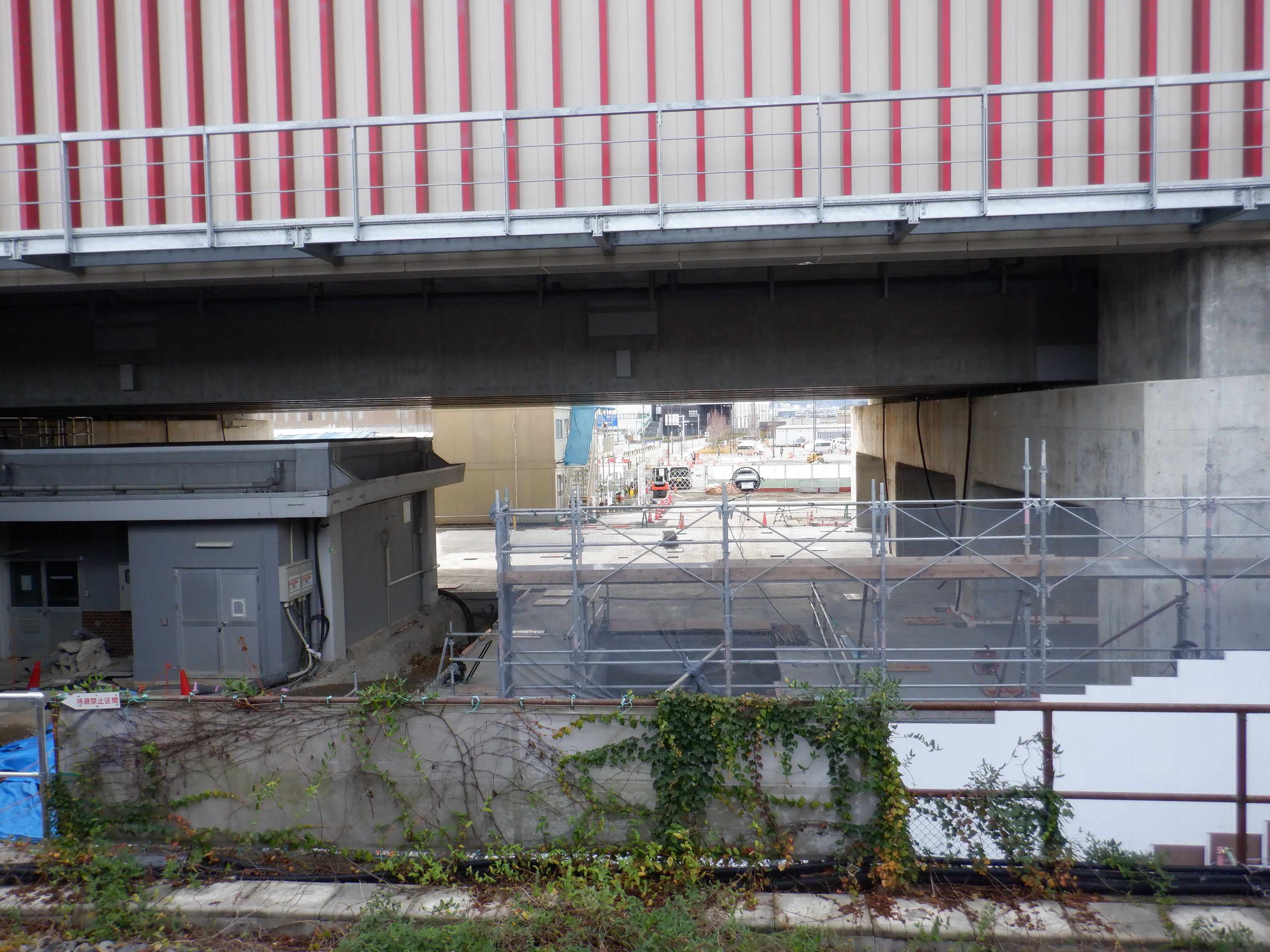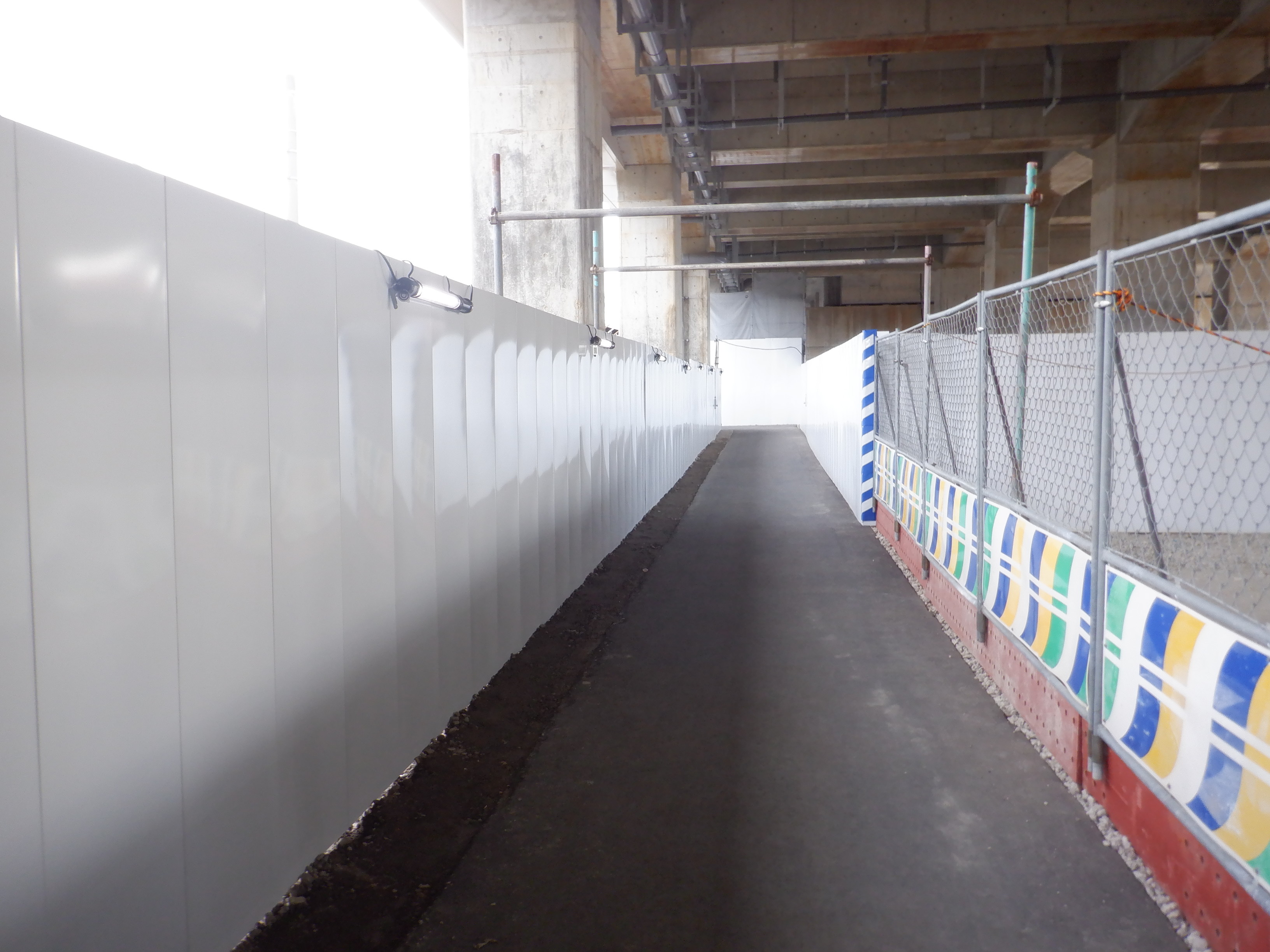 迂回路入口から見た高架下部都市施設(コンビニ・待合室等)建設中の様子。