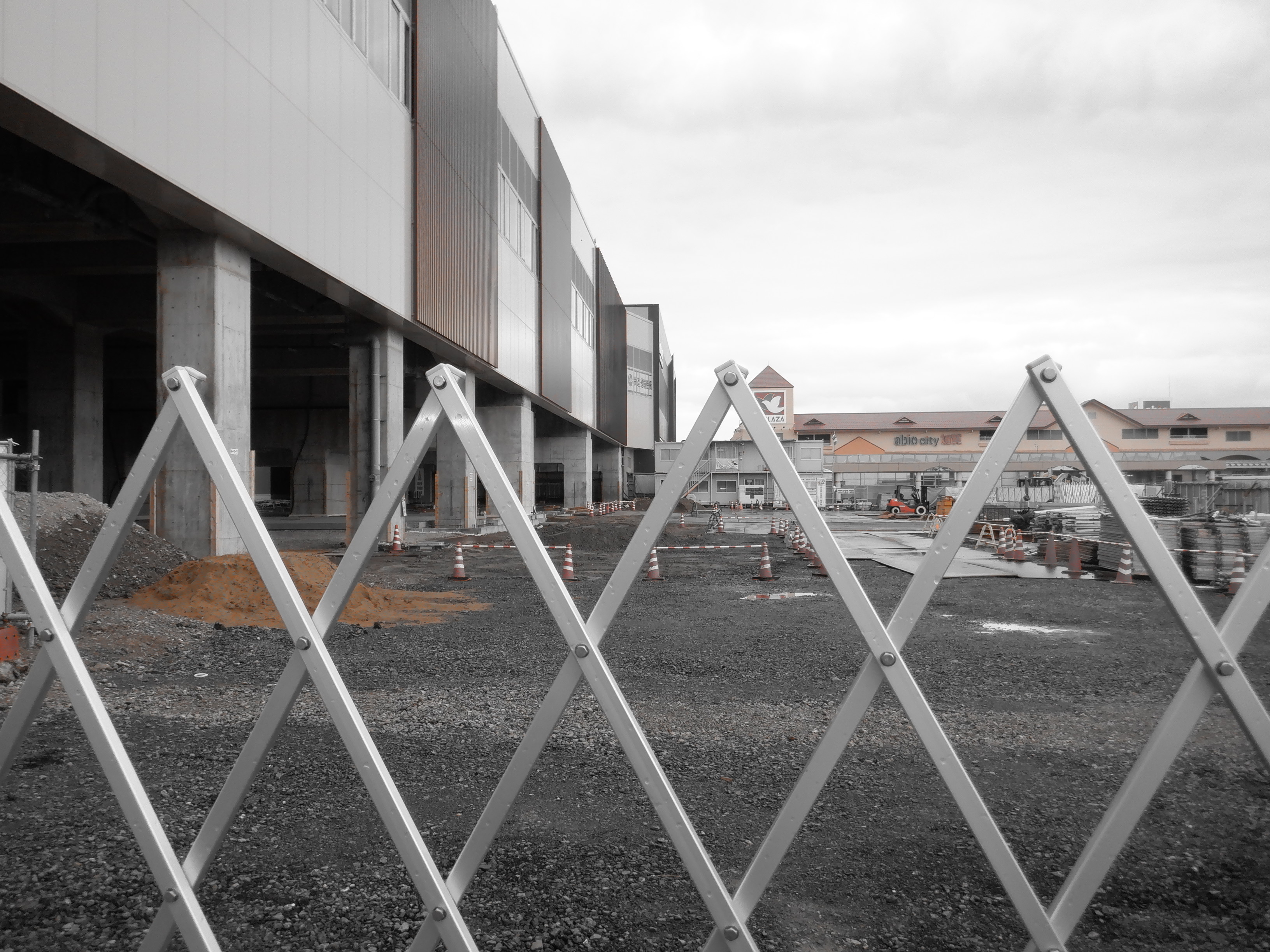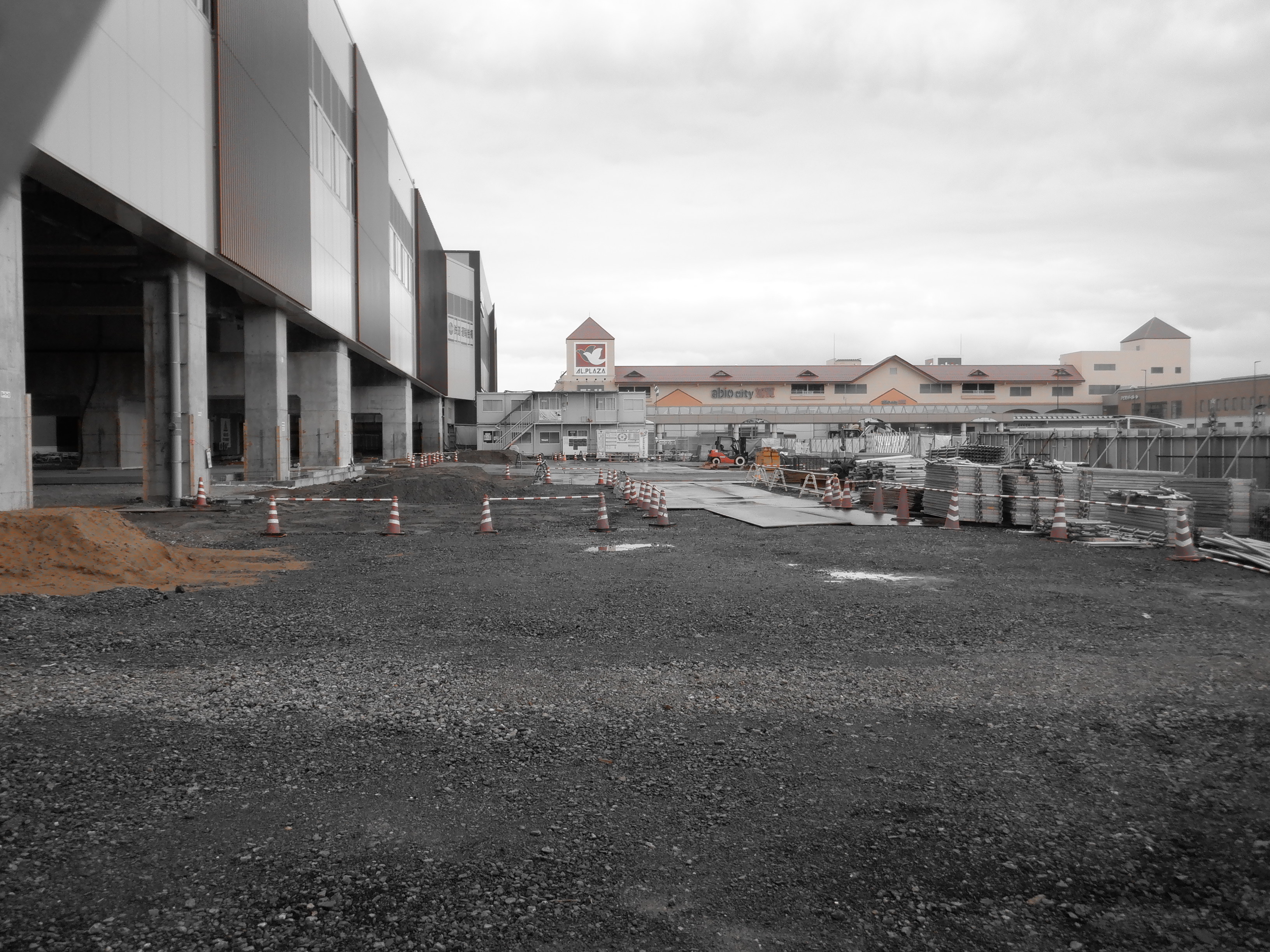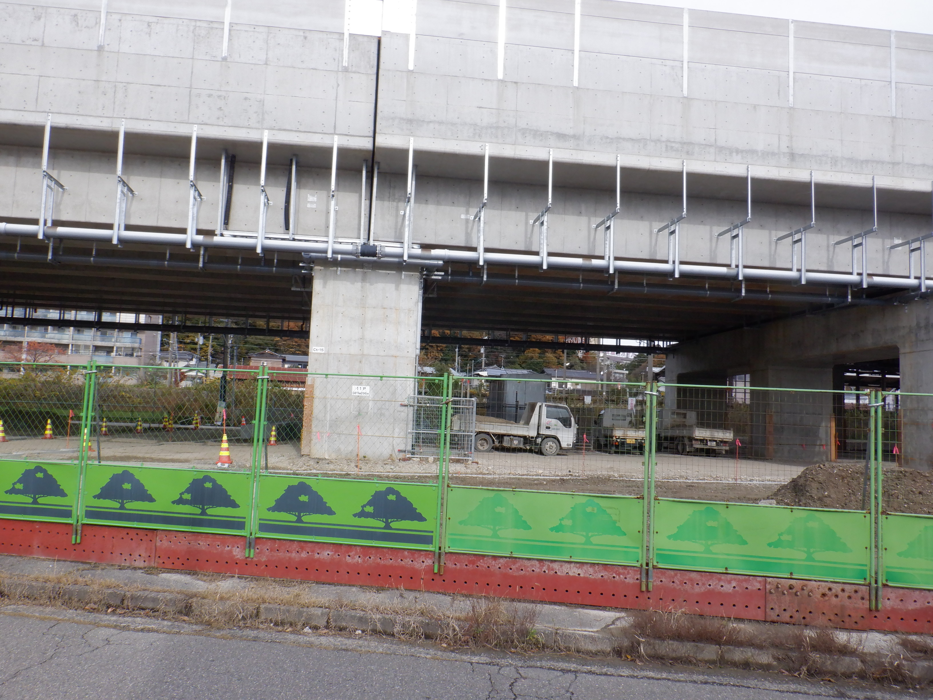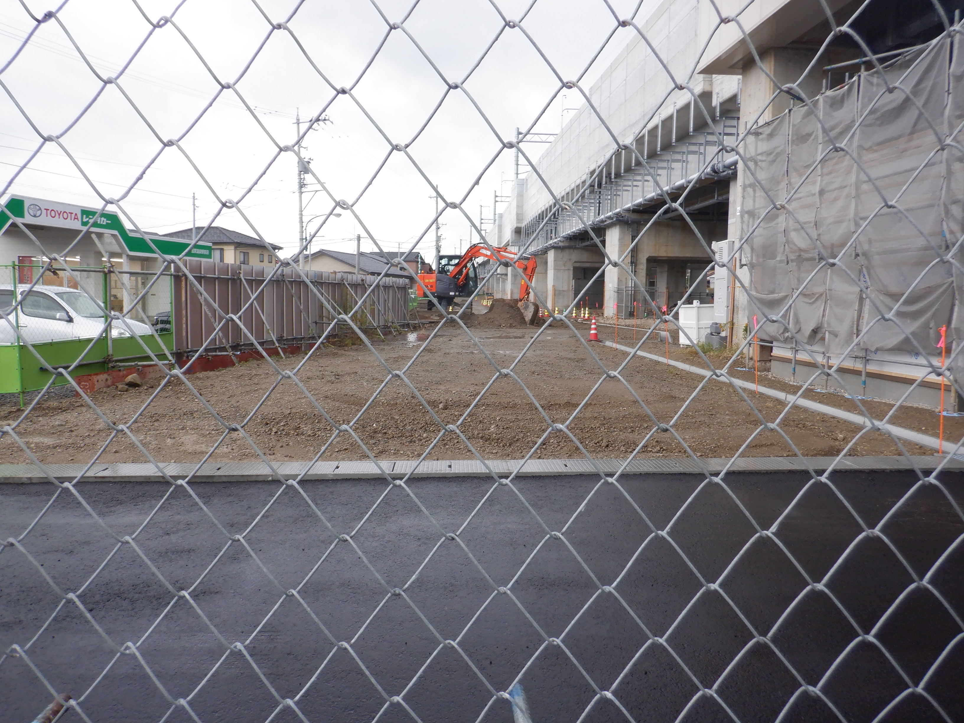 迂回路入口から見た高架下部都市施設(コンビニ・待合室等)建設中の様子。