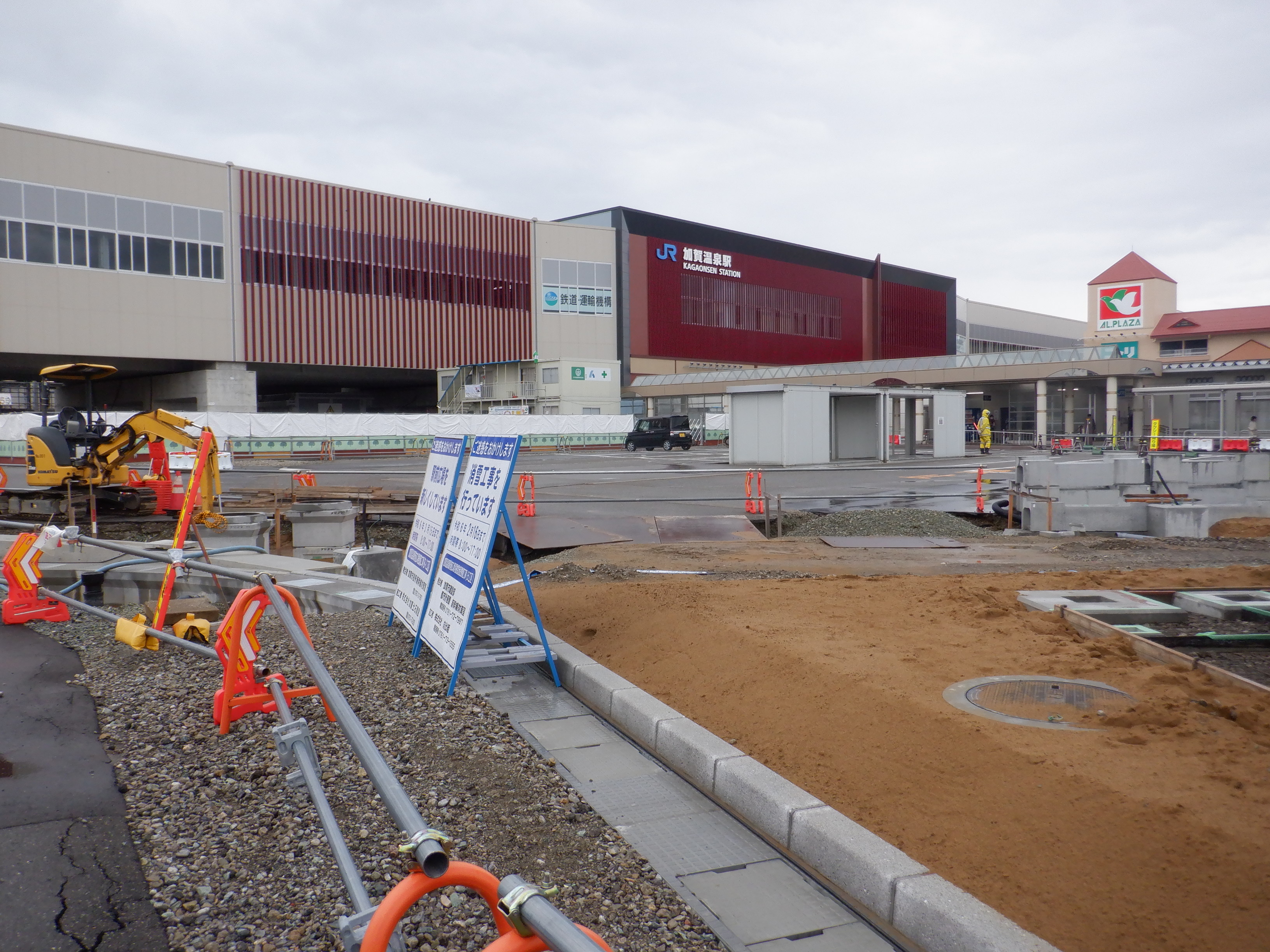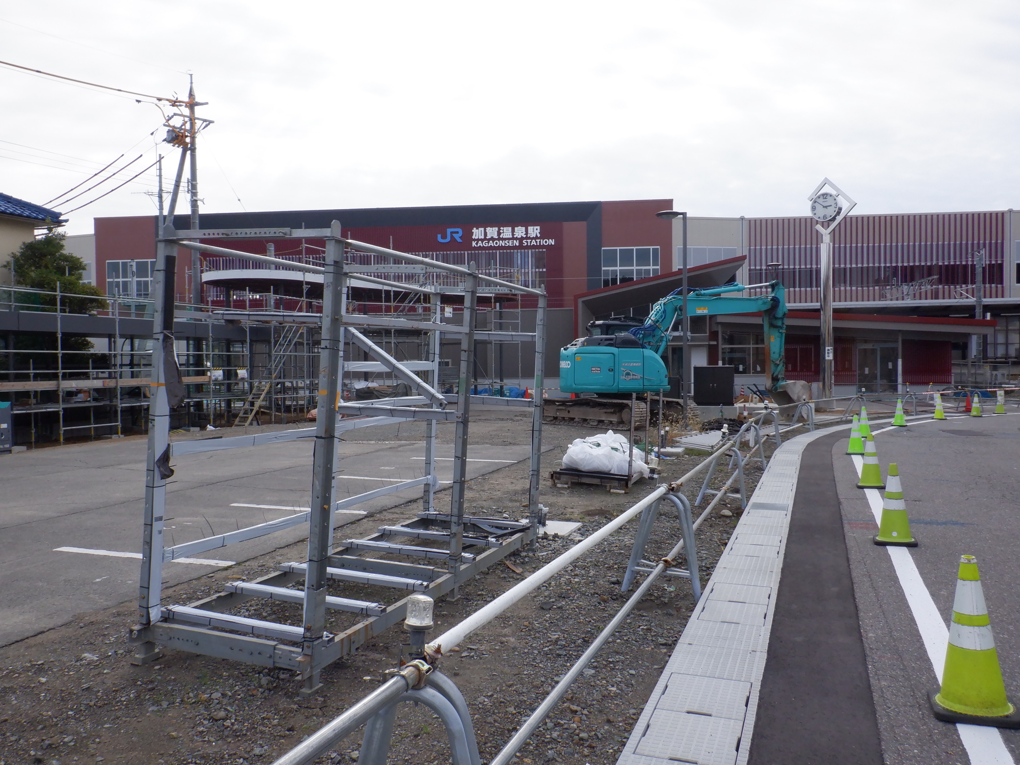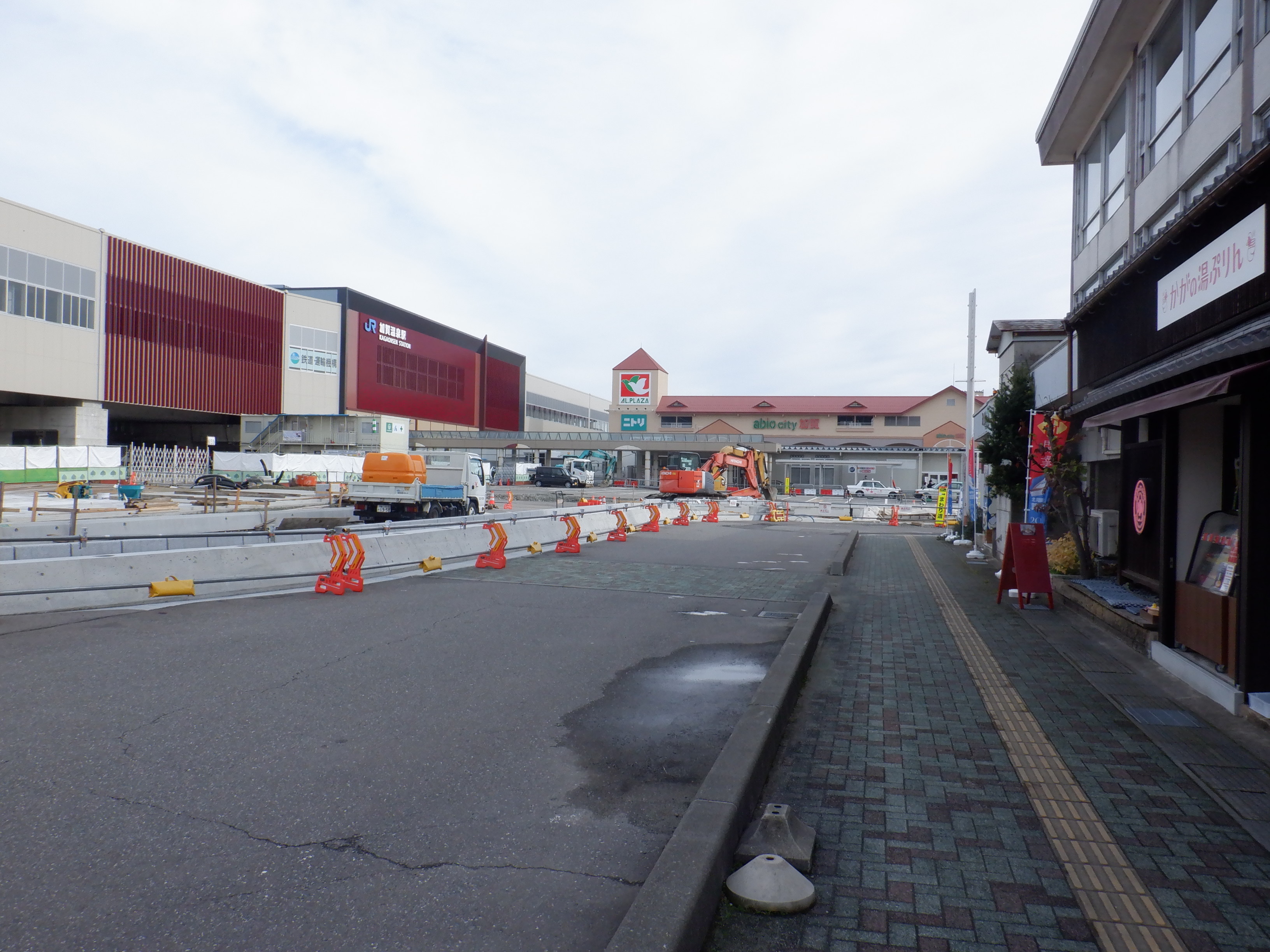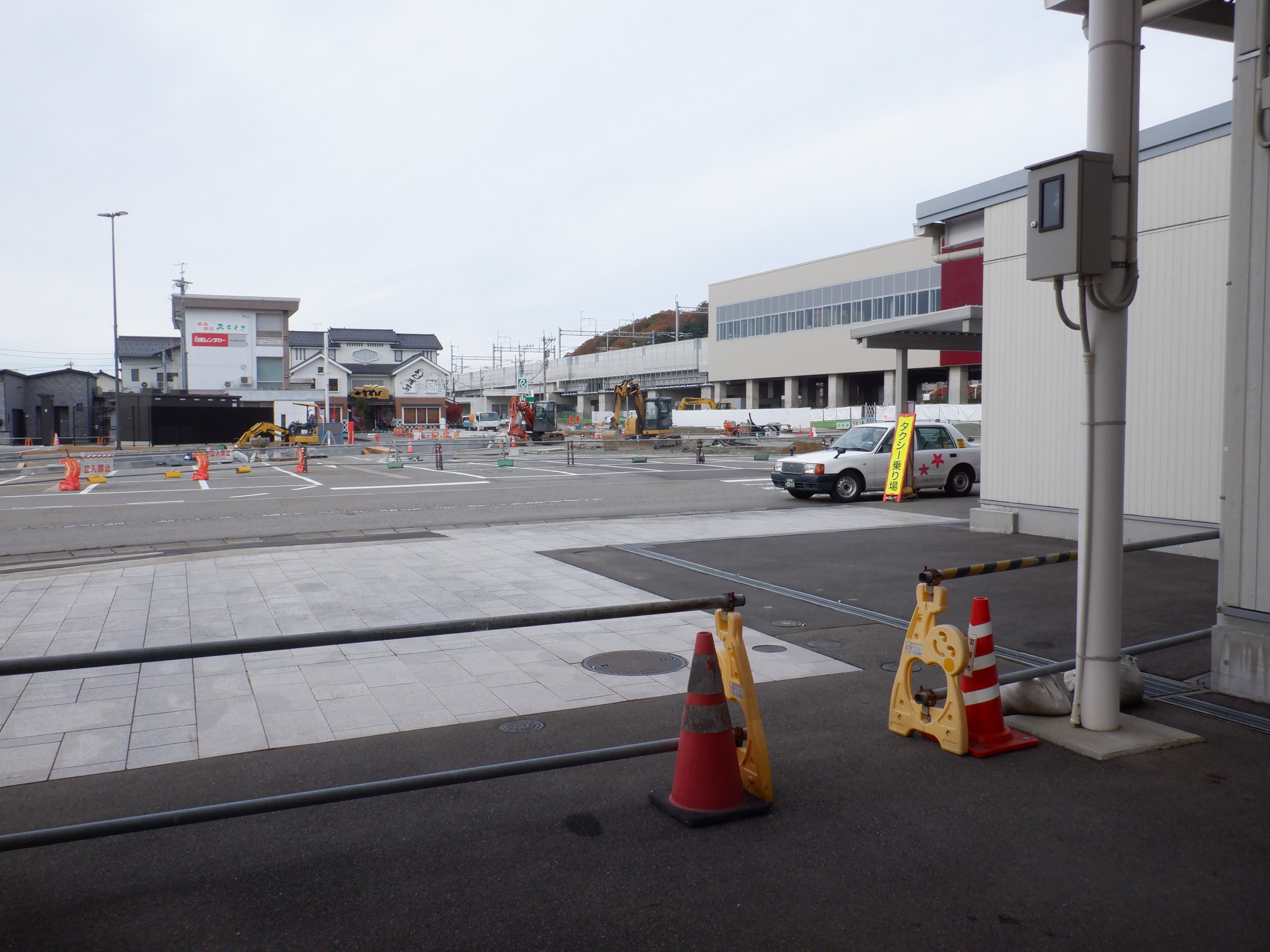 大聖寺駅側。右側にレンタカー屋さん建設中の様子が見えます。