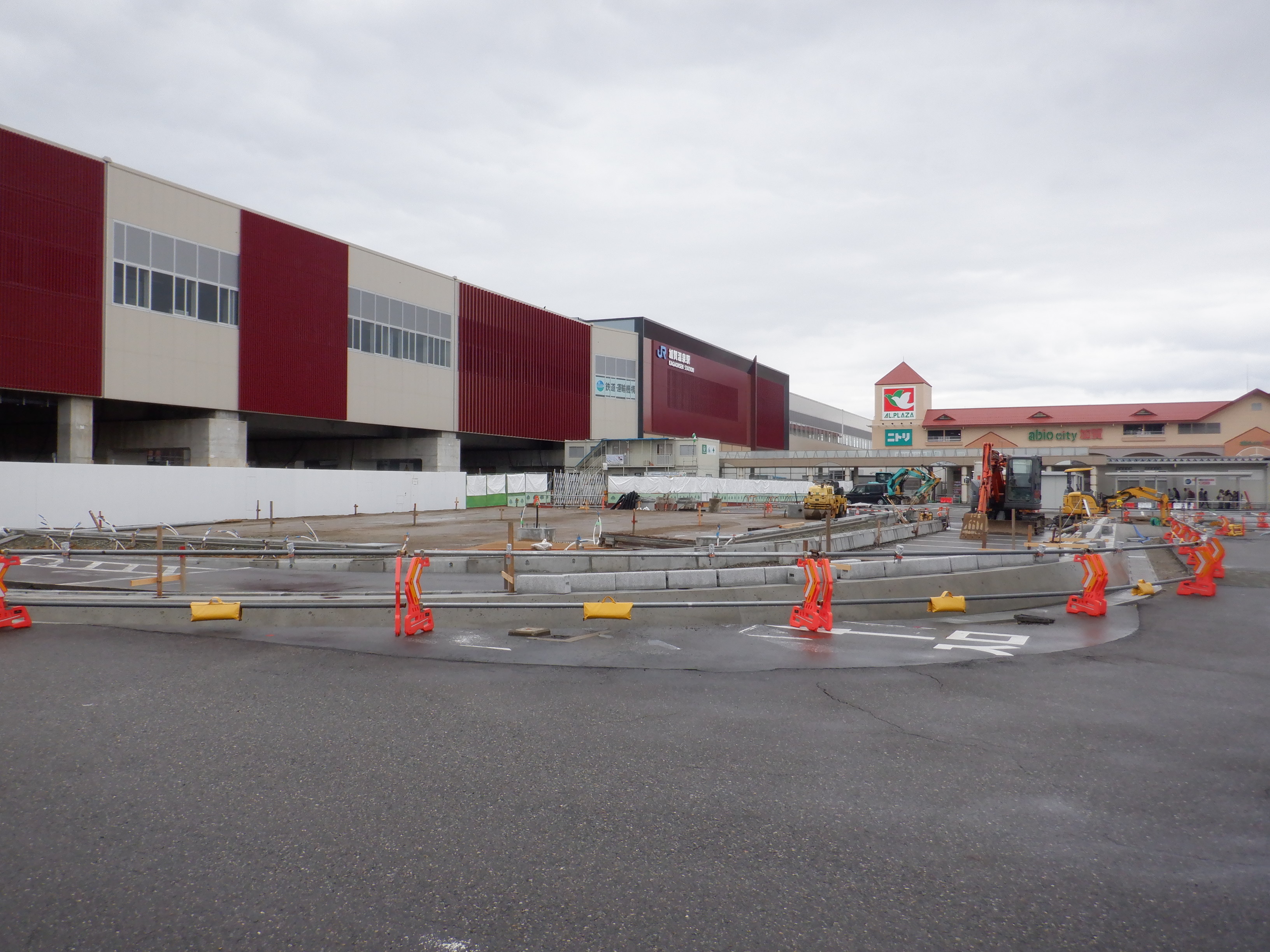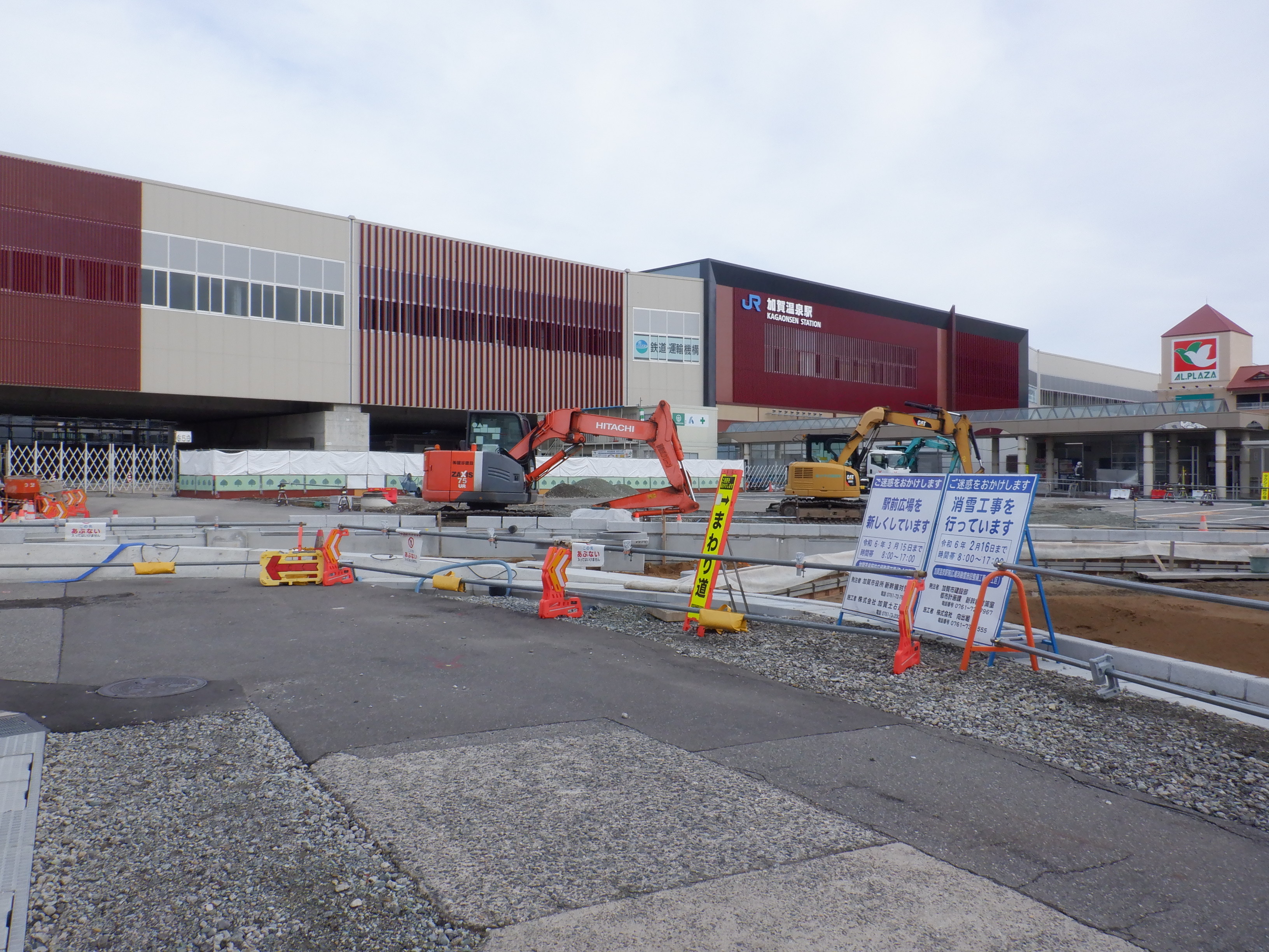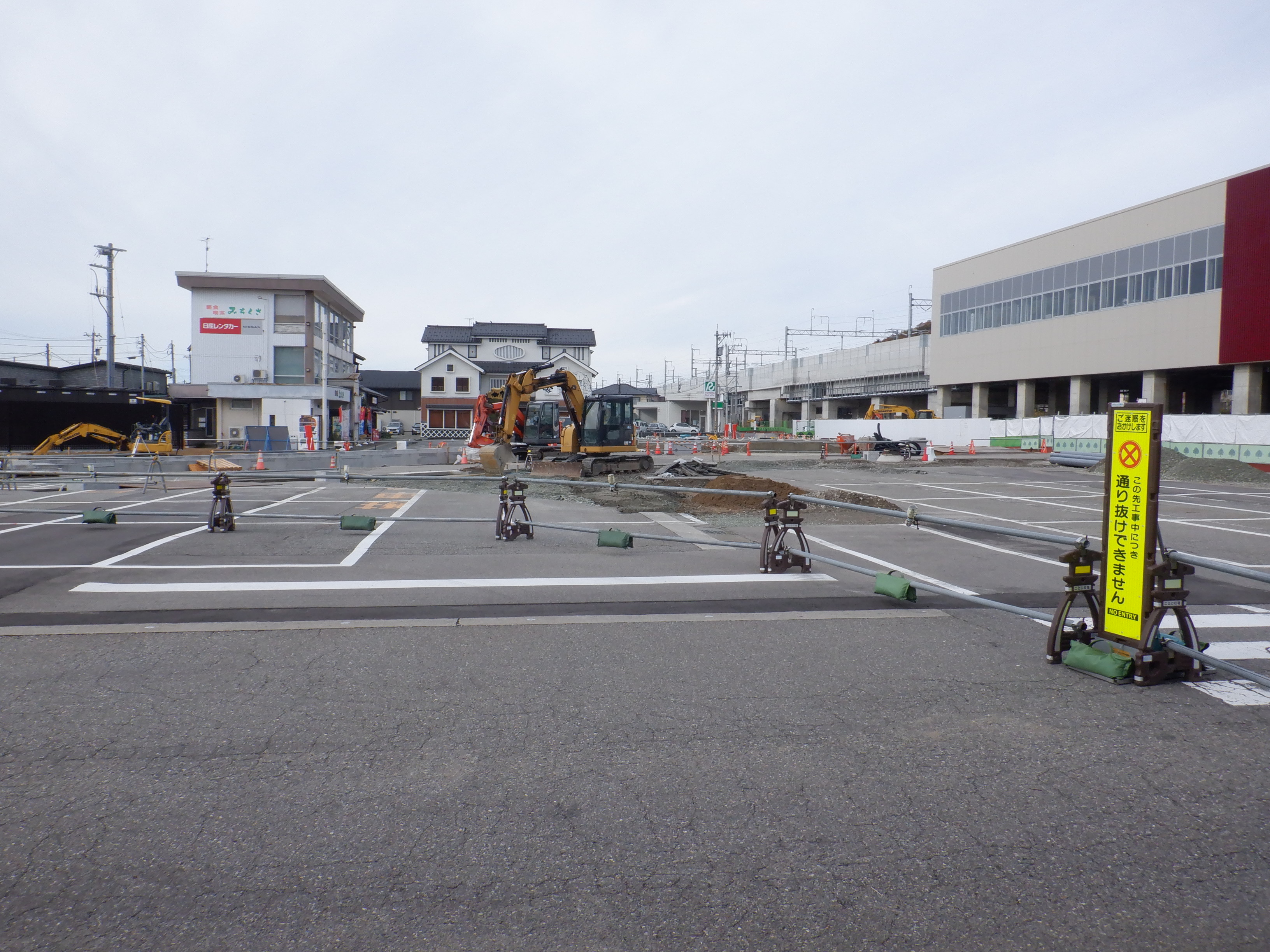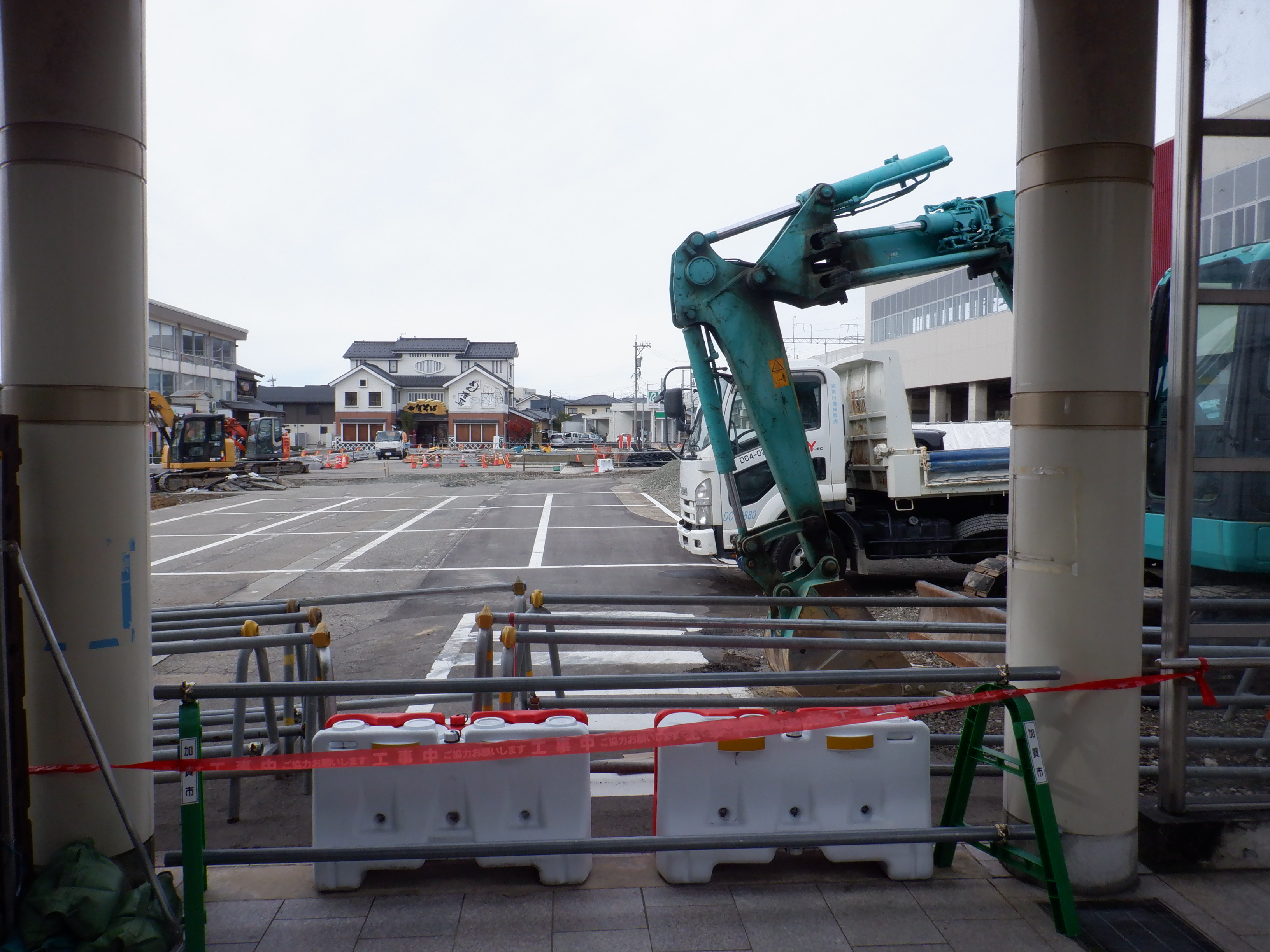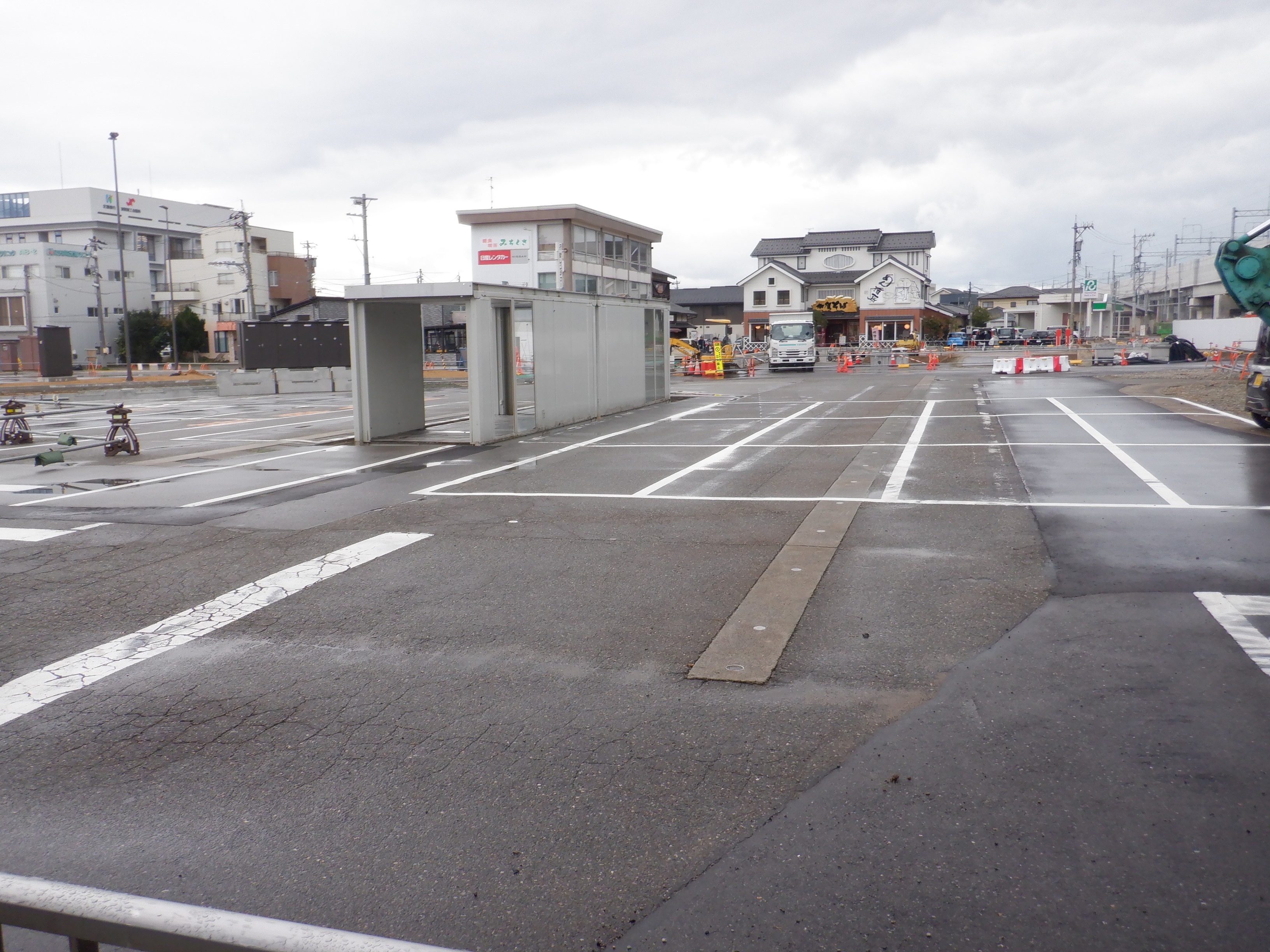 大聖寺駅側。右側にレンタカー屋さん建設中の様子が見えます。
