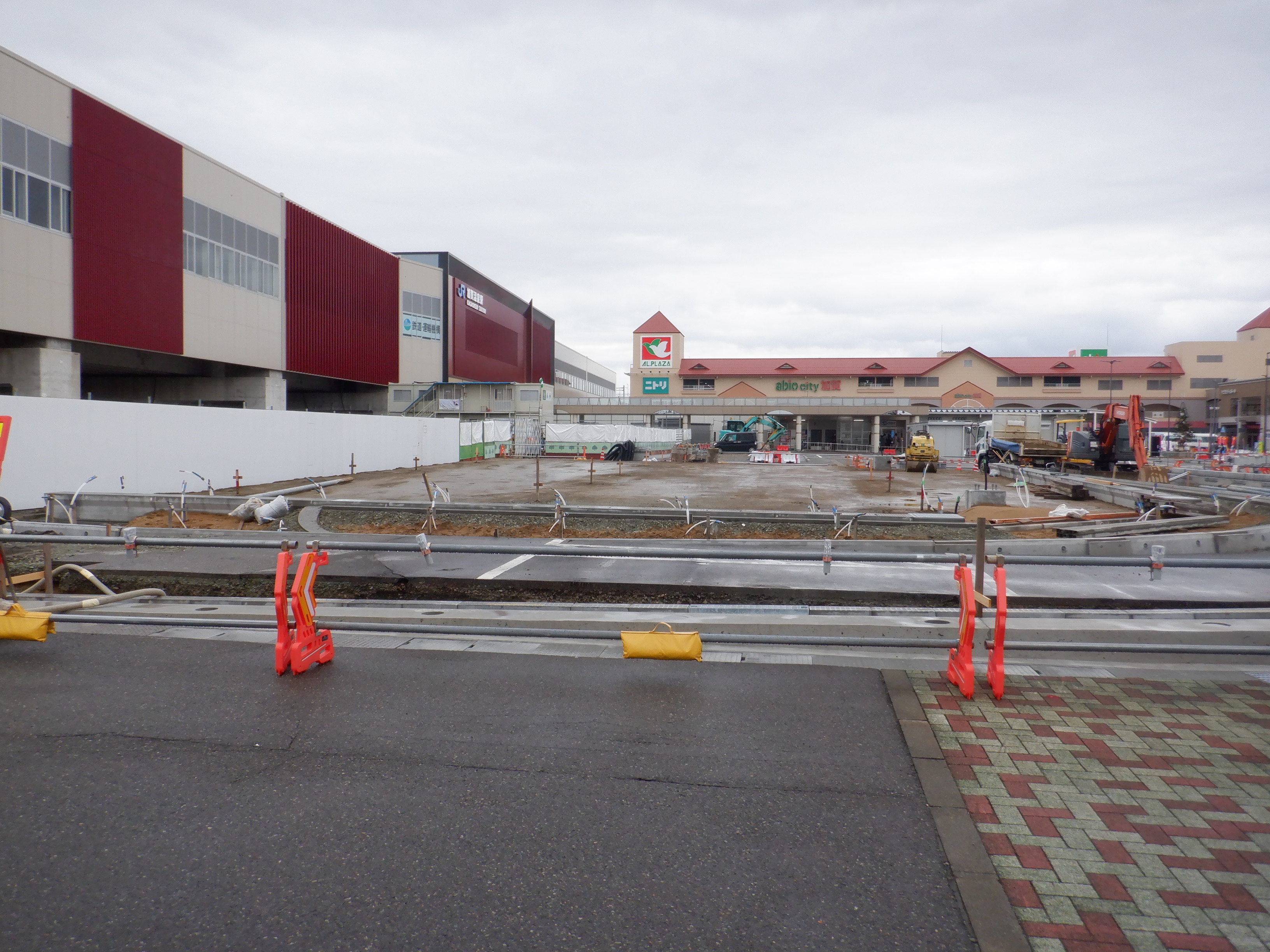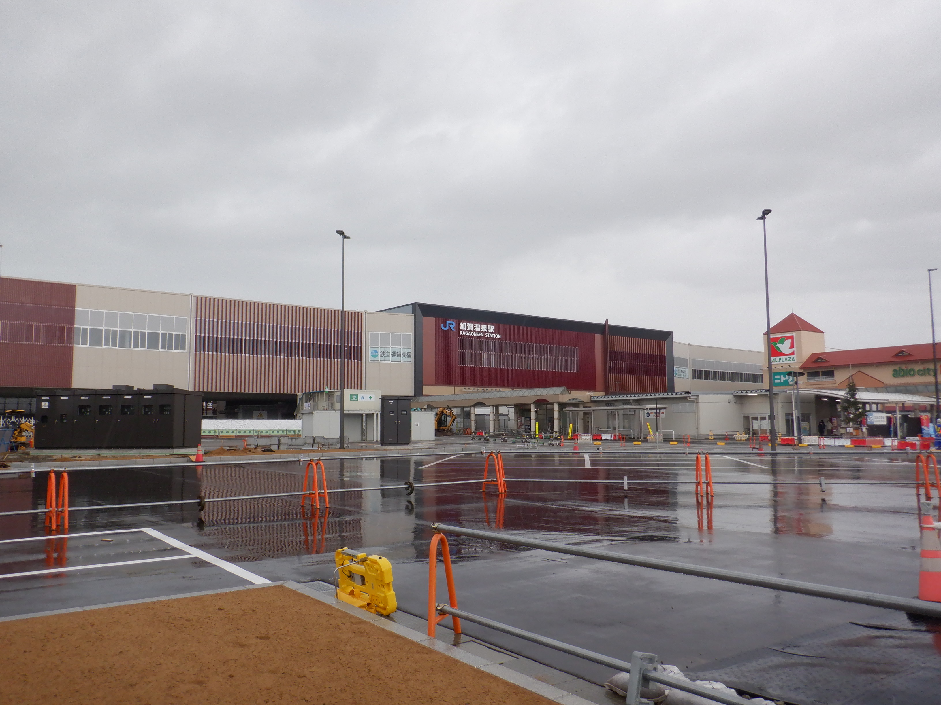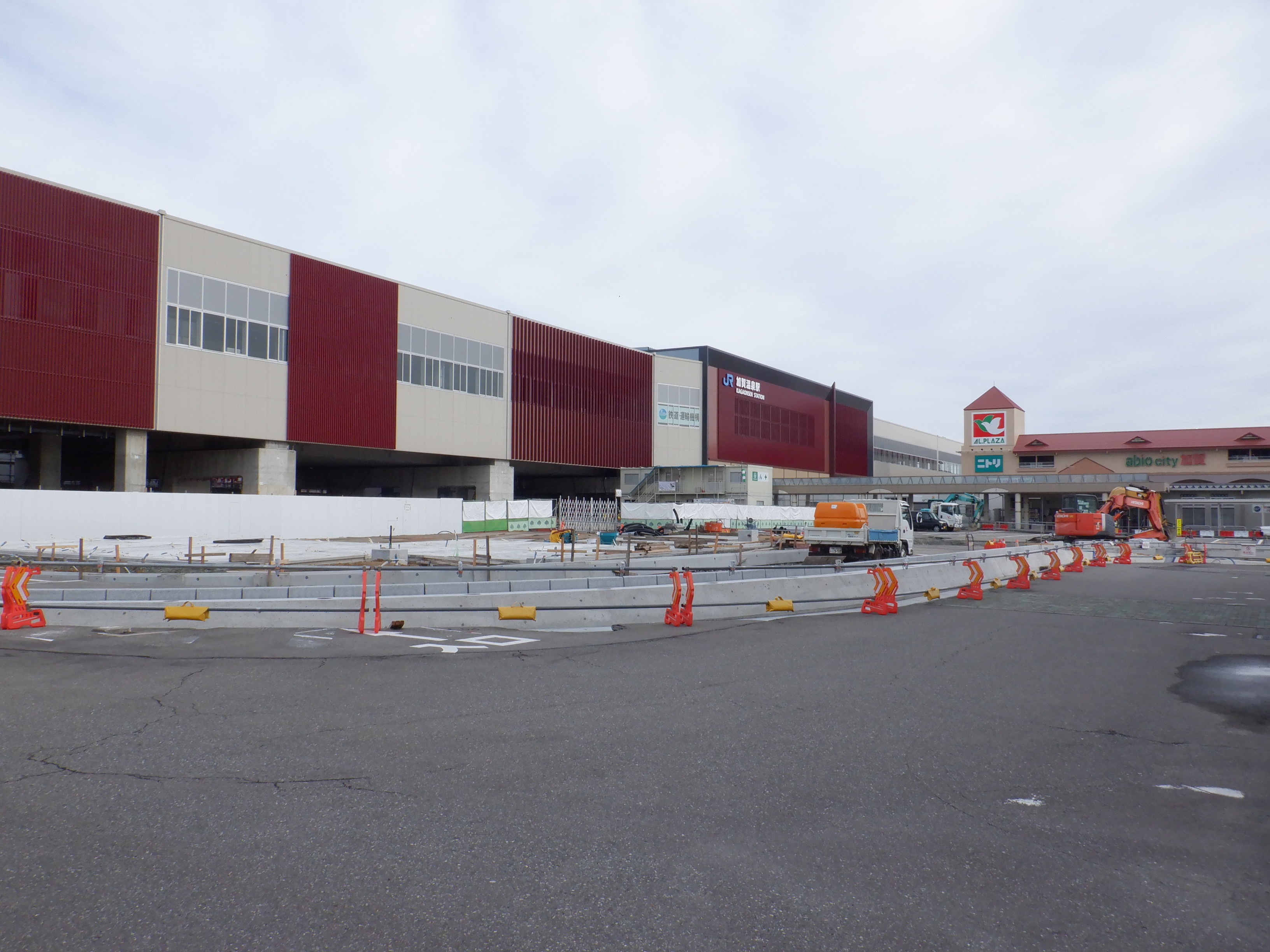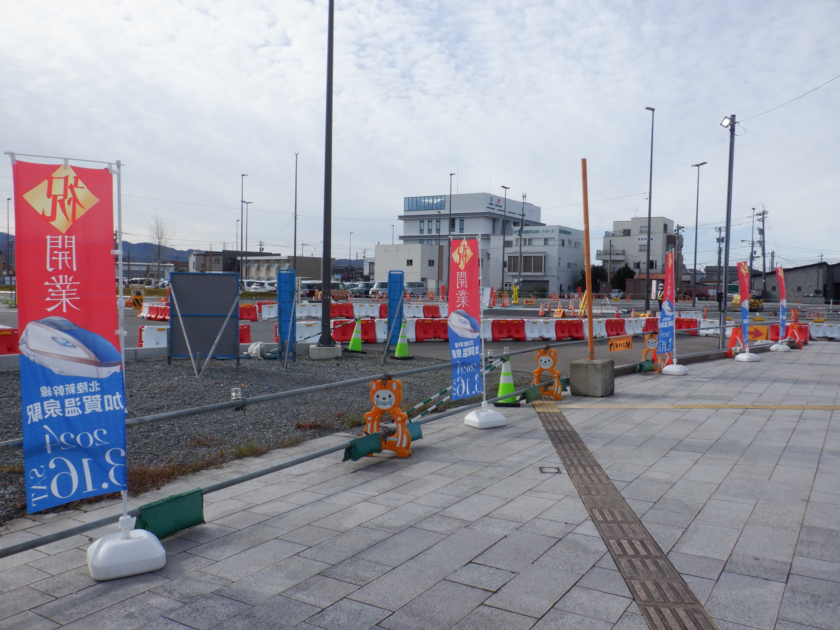 大聖寺駅側。右側にレンタカー屋さん建設中の様子が見えます。